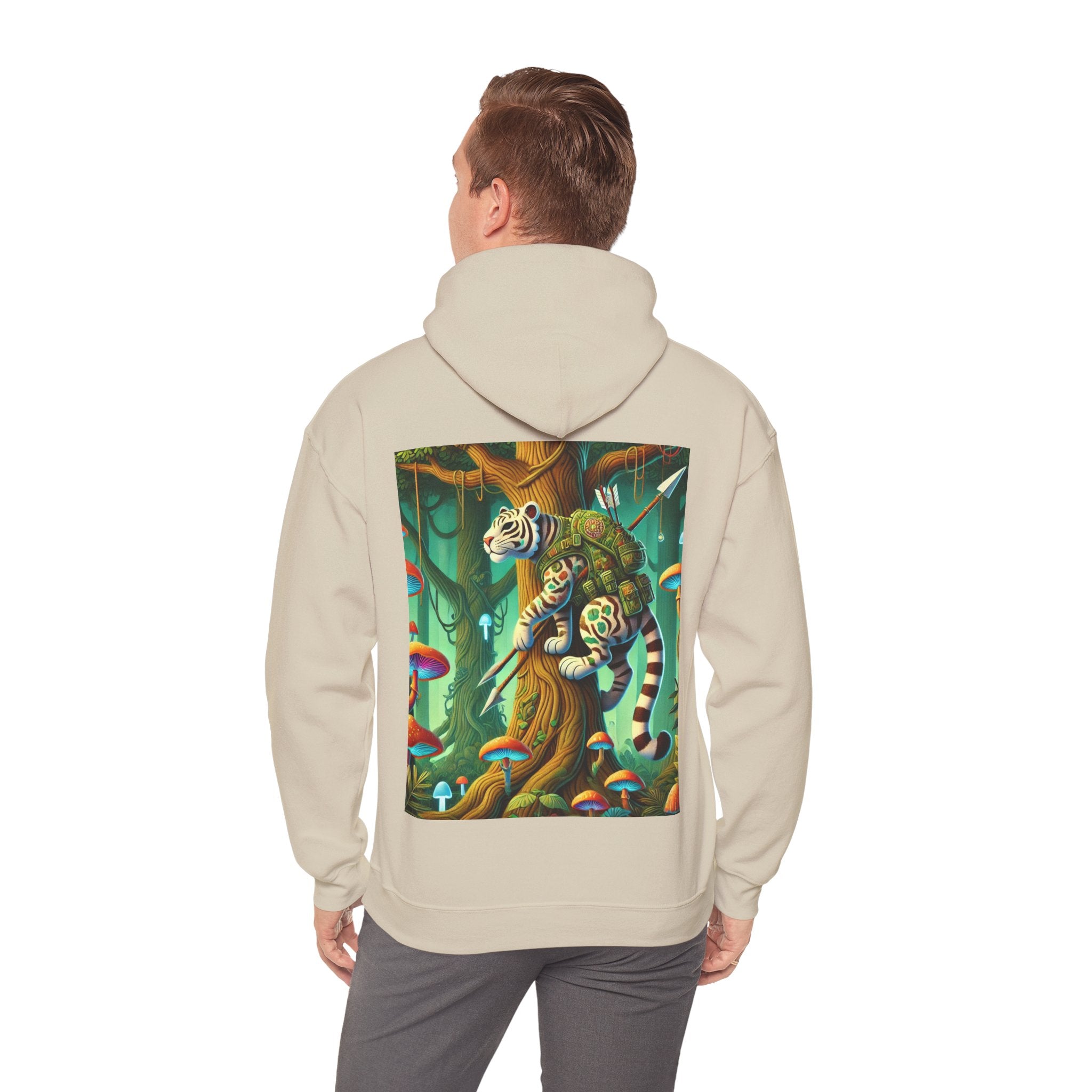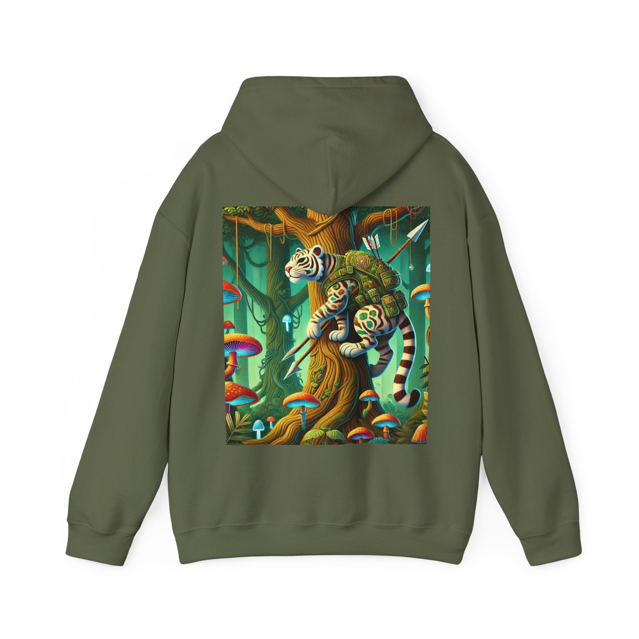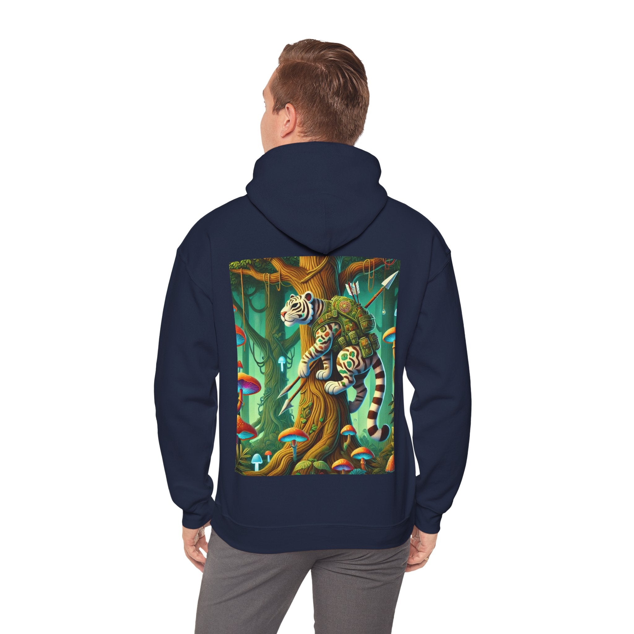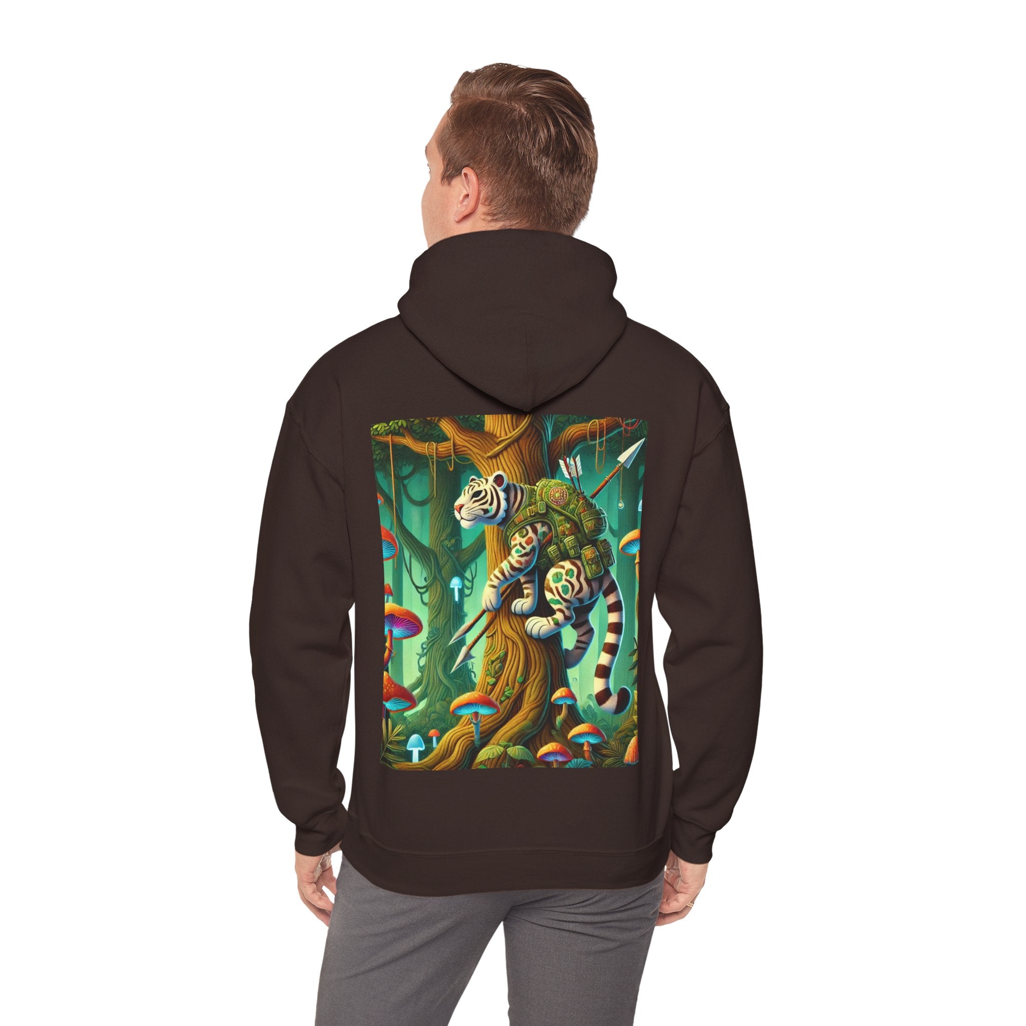 Silent Stripes – Heavy Blend™ Hooded Sweatshirt blends quiet power with the allure of a hidden world deep in the ancient jungle. The artwork follows a solitary tiger moving through an enchanted forest, its stripes merging so seamlessly with the misty, bioluminescent glow that it seems to appear and vanish with every step. Ascending a towering tree, it becomes part guardian, part shadow, part myth—an otherworldly creature whose presence feels both serene and electrifying. The scene captures a moment where nature, magic, and silence hold their breath together.