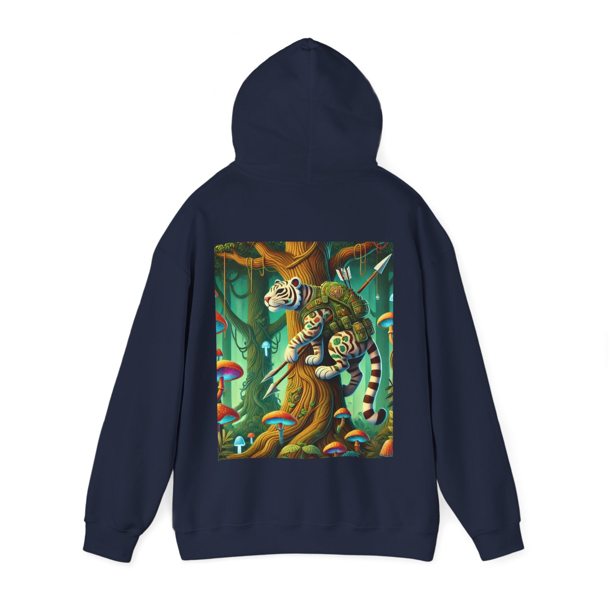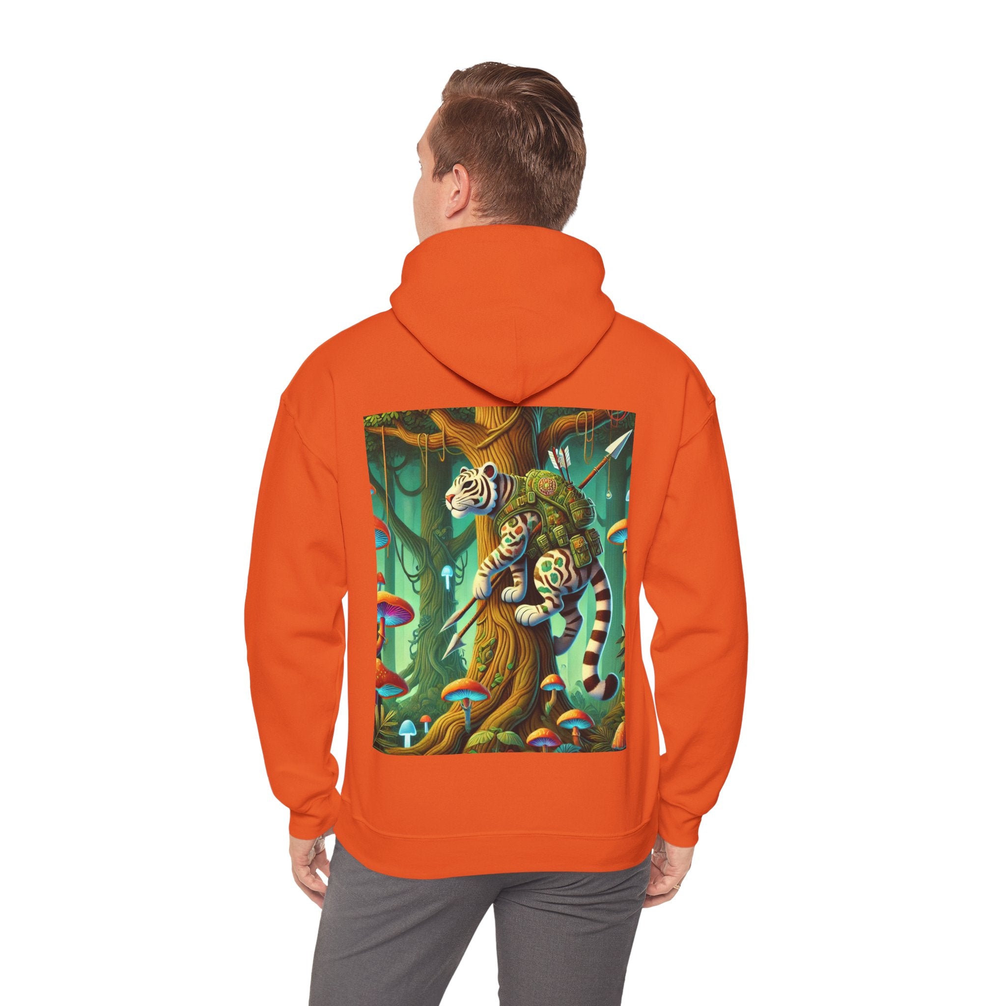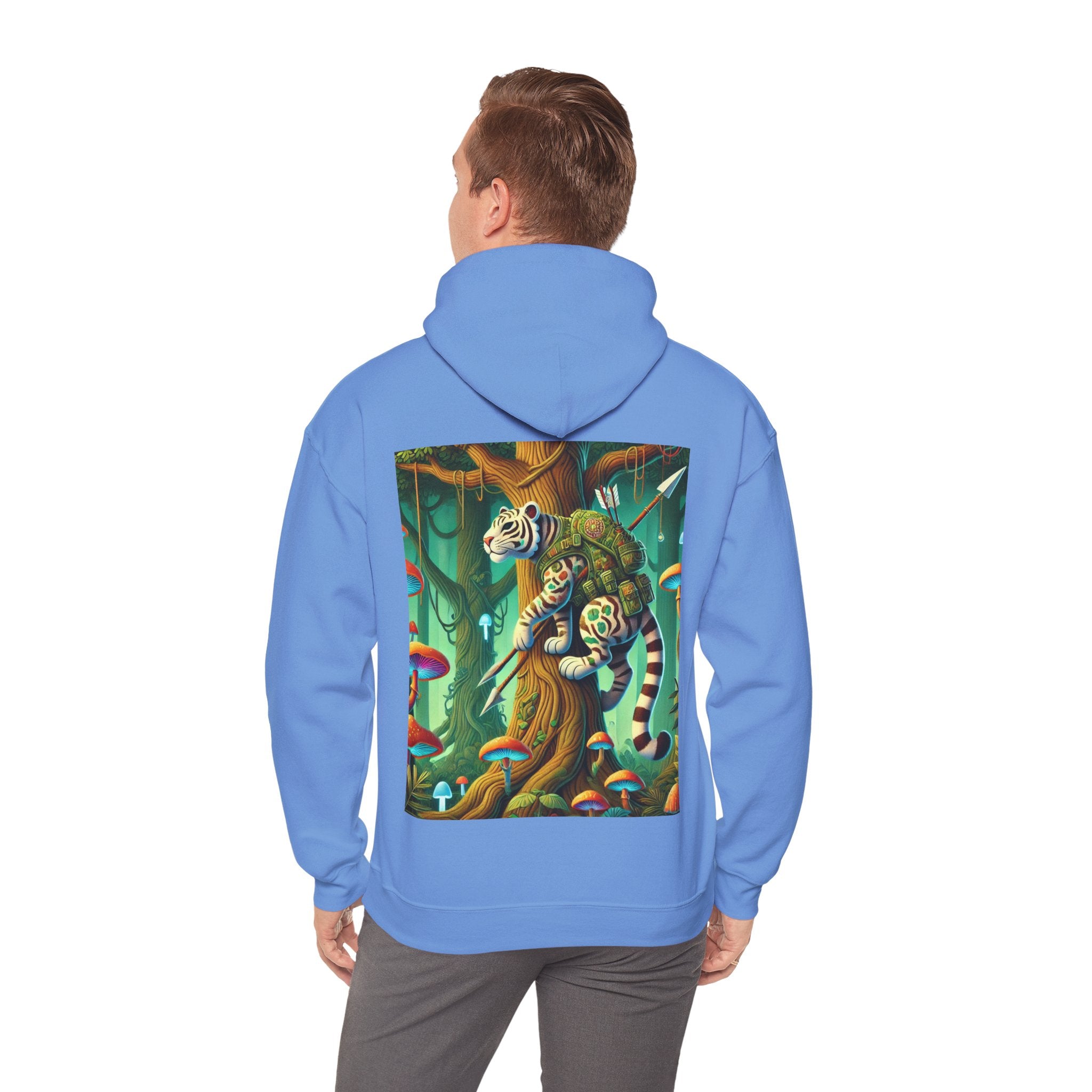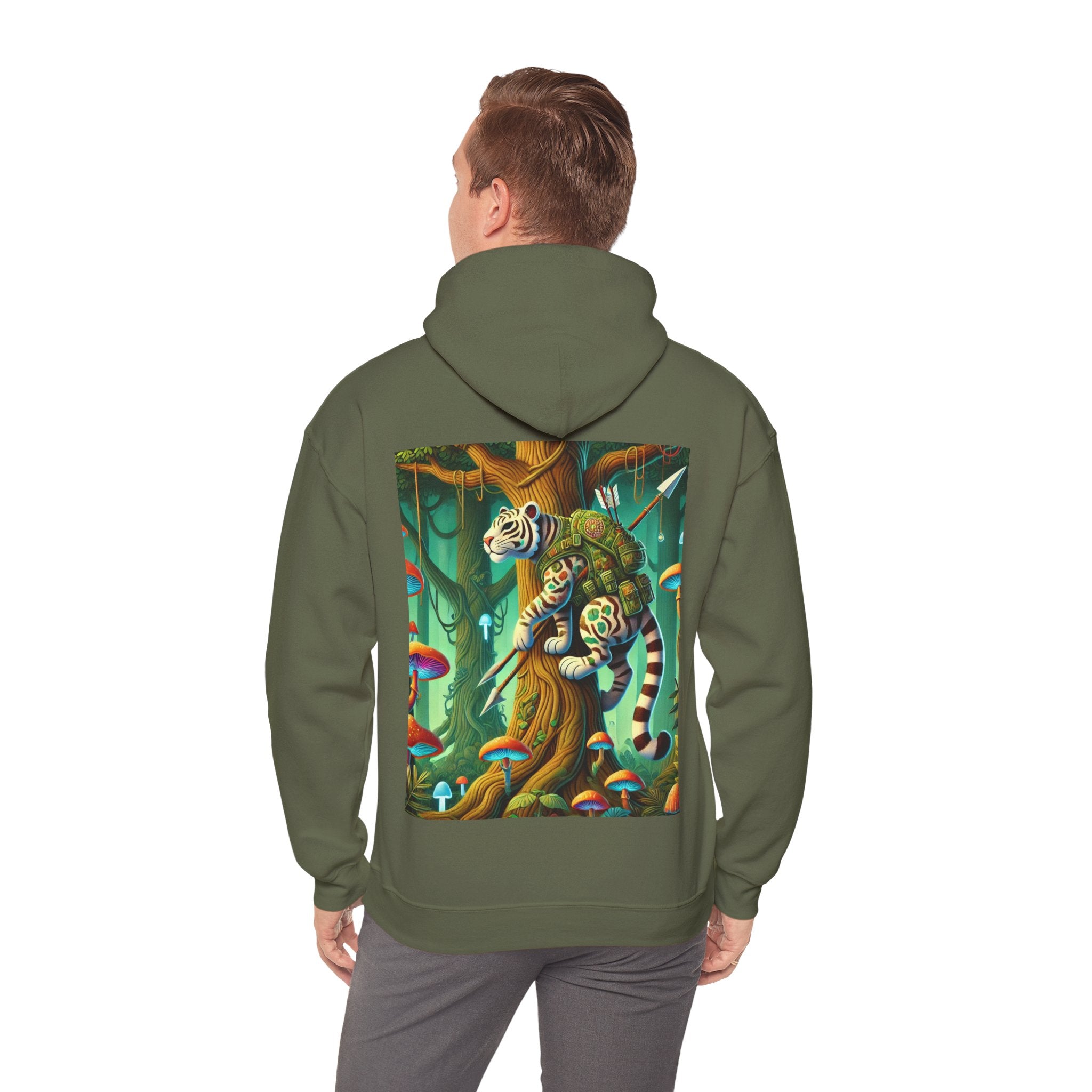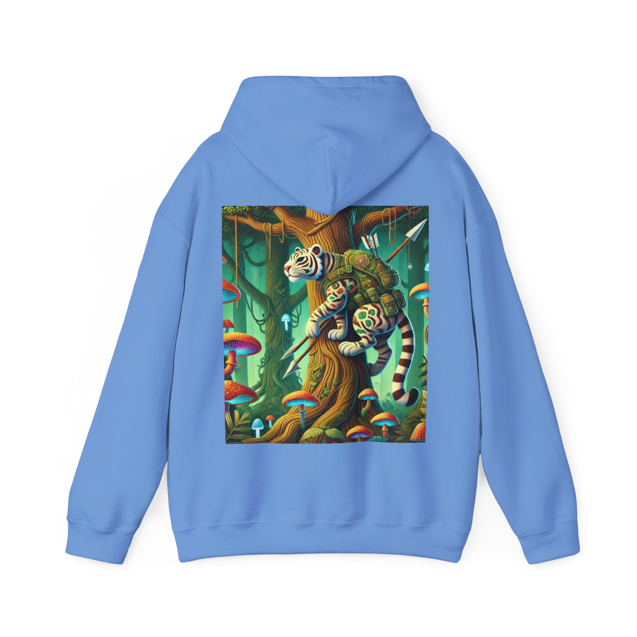 Silent Stripes – Heavy Blend™ Hooded Sweatshirt blends quiet power with the allure of a hidden world deep in the ancient jungle. The artwork follows a solitary tiger moving through an enchanted forest, its stripes merging so seamlessly with the misty, bioluminescent glow that it seems to appear and vanish with every step. Ascending a towering tree, it becomes part guardian, part shadow, part myth—an otherworldly creature whose presence feels both serene and electrifying. The scene captures a moment where nature, magic, and silence hold their breath together.