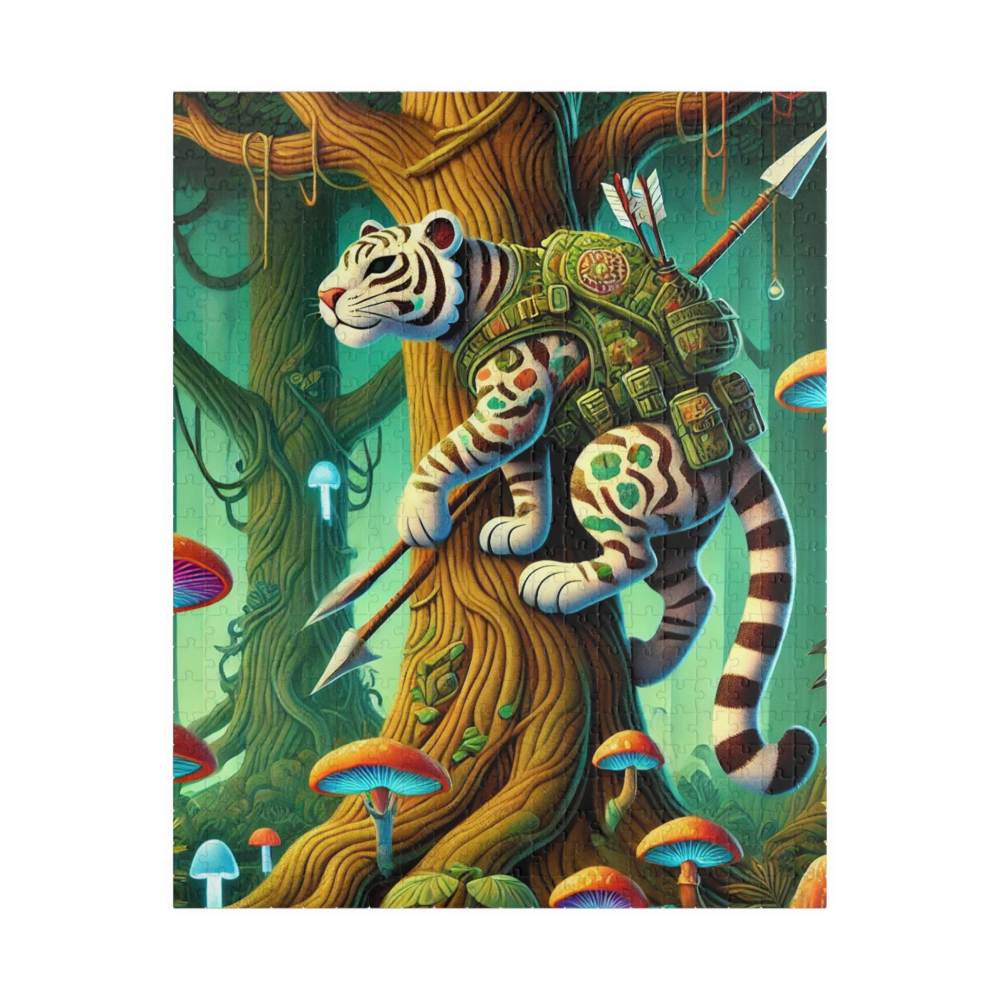 The Silent Stripes artwork captures the quiet intensity of a stealthy tiger scaling the towering trunk of an ancient tree, blending effortlessly into the misty forest around it. Its fur glows faintly in the shifting light filtering through the emerald canopy, creating an almost hypnotic illusion of movement and camouflage. Surrounded by bioluminescent flora and drifting fog, the tiger becomes one with its surroundings—both hunter and ghost. The scene hums with quiet energy, a symphony of stillness and life that reveals the untamed magic of nature.