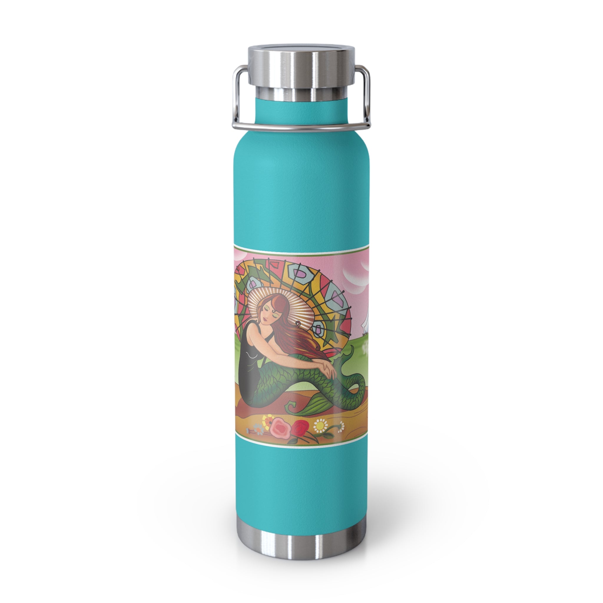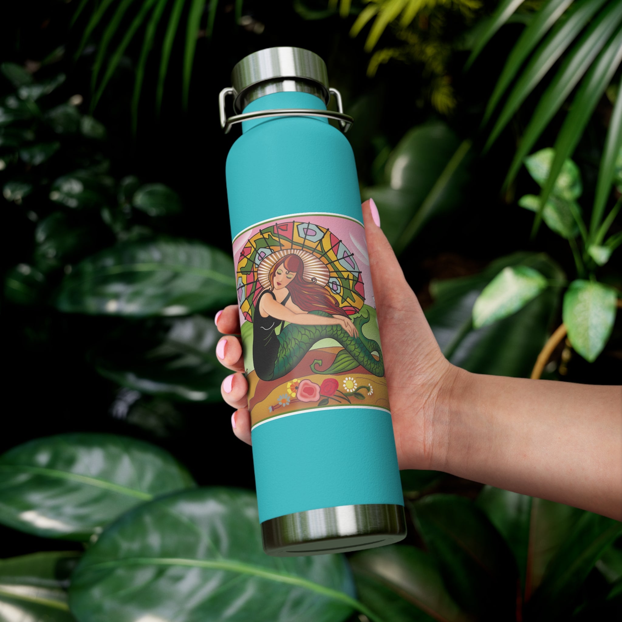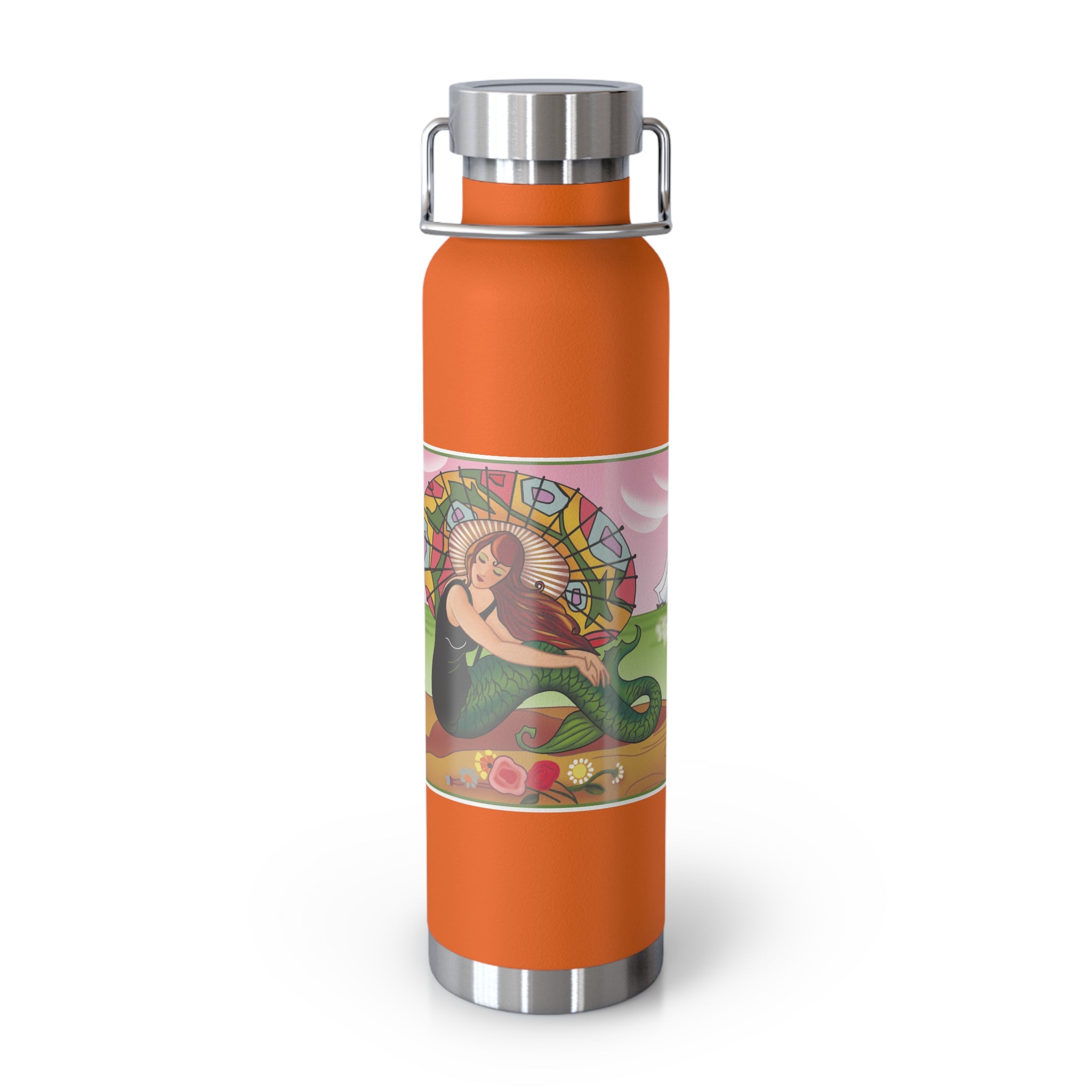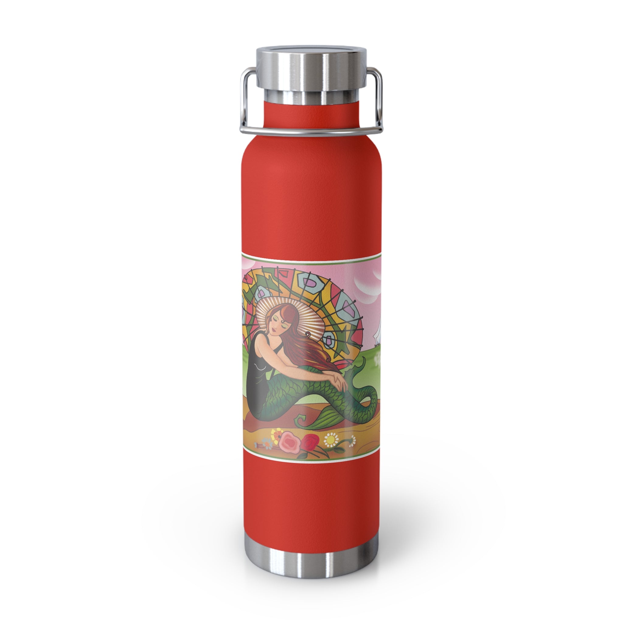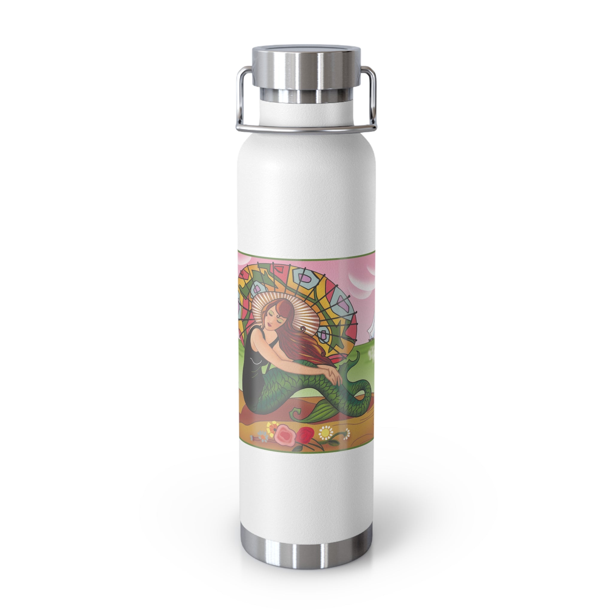 Artwork designed and digitally remastered by Sarasvati Designs. A captivating vintage Art Deco artwork by Carlo Chiostri features a mermaid with fiery red hair, a vibrant green tail, and a colorful patterned parasol, surrounded by delicate flowers and a small cupid.