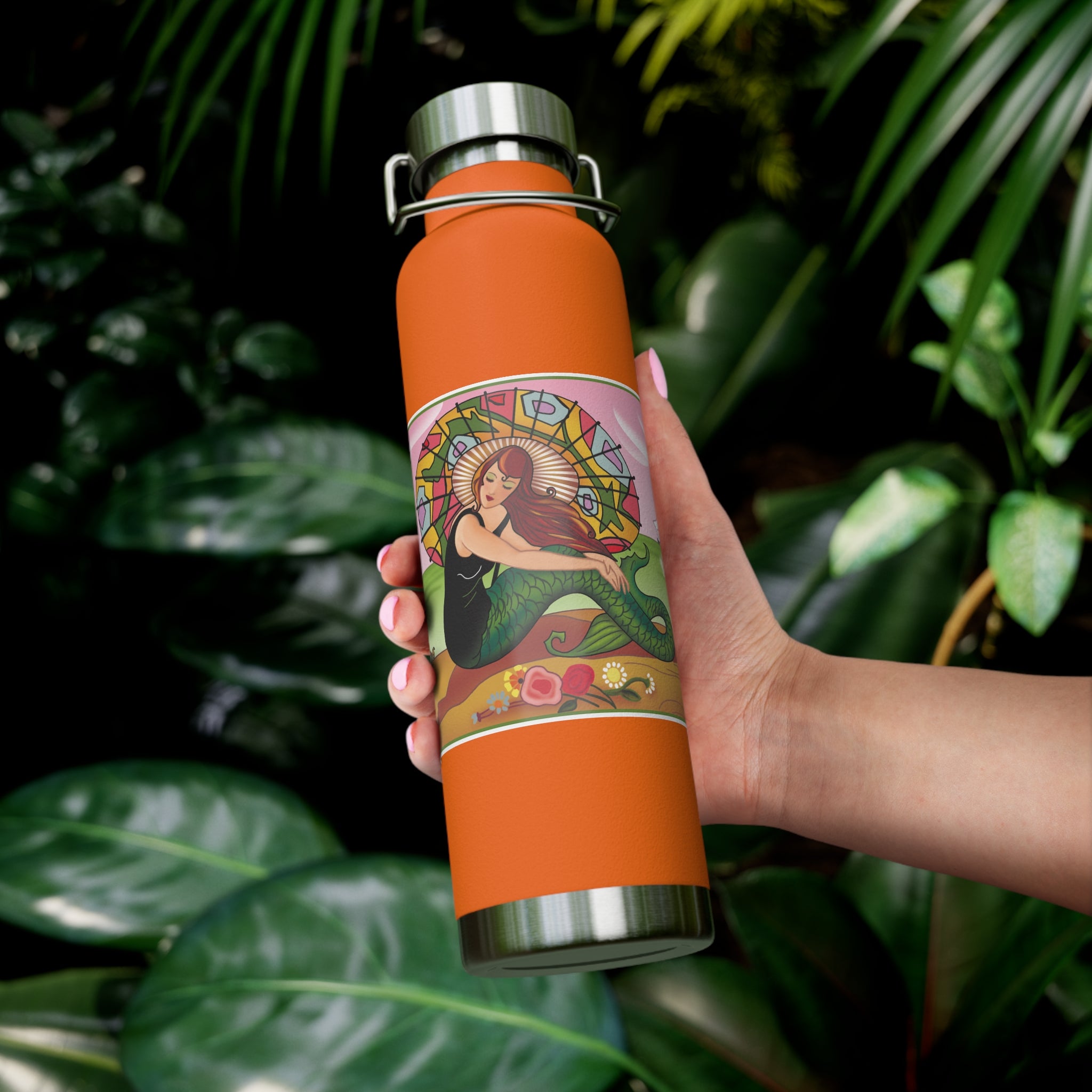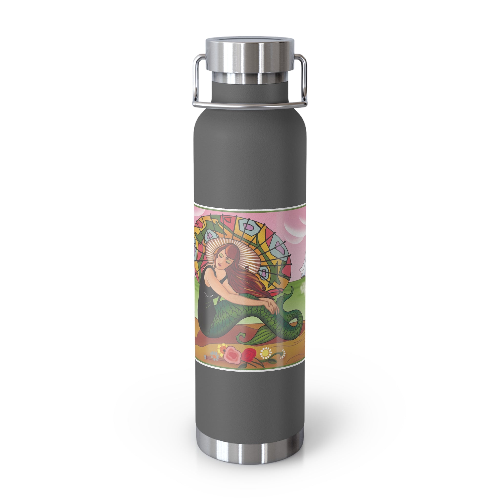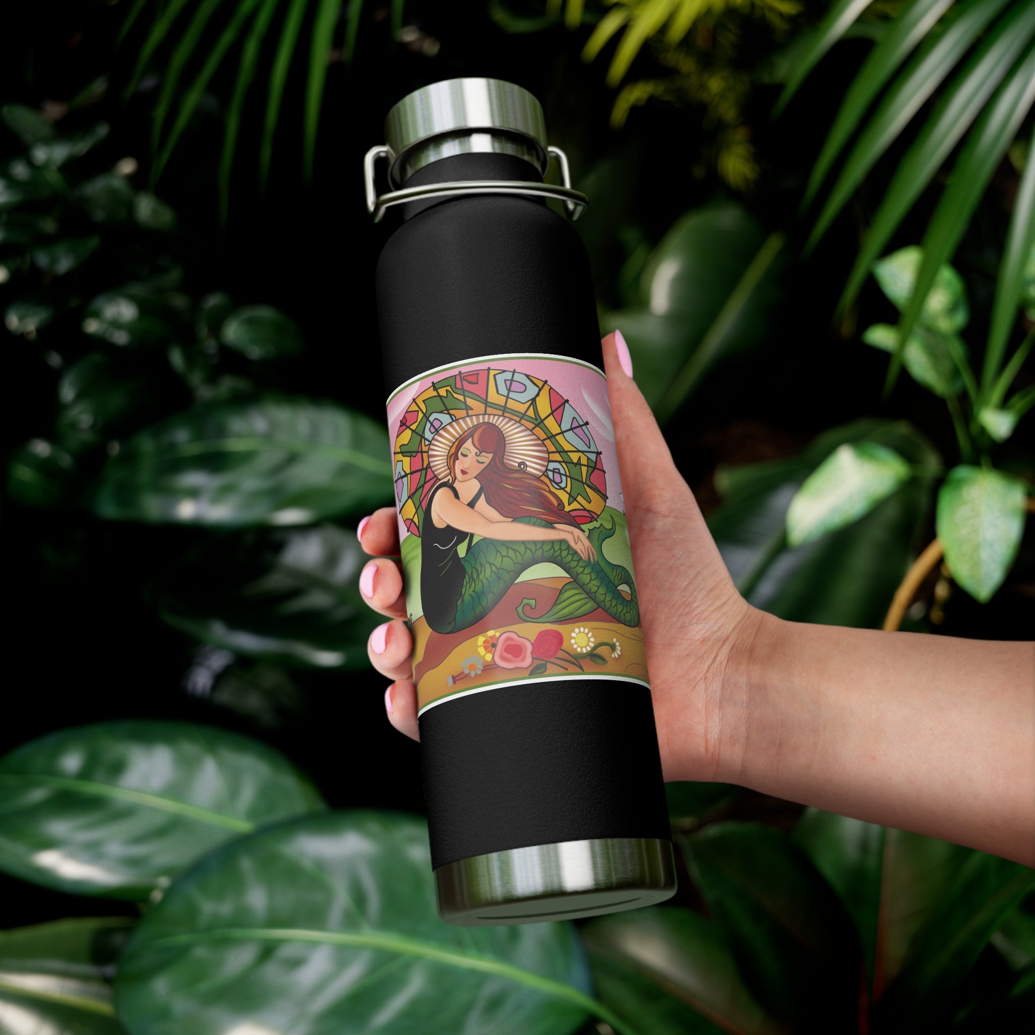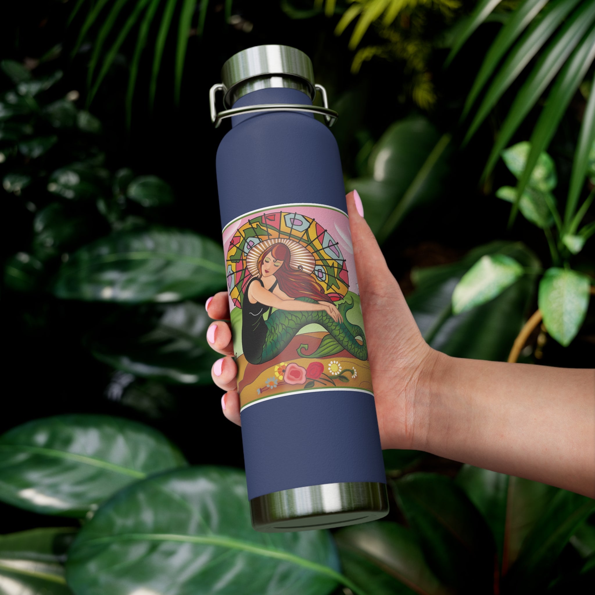 Artwork designed and digitally remastered by Sarasvati Designs. A captivating vintage Art Deco artwork by Carlo Chiostri features a mermaid with fiery red hair, a vibrant green tail, and a colorful patterned parasol, surrounded by delicate flowers and a small cupid.