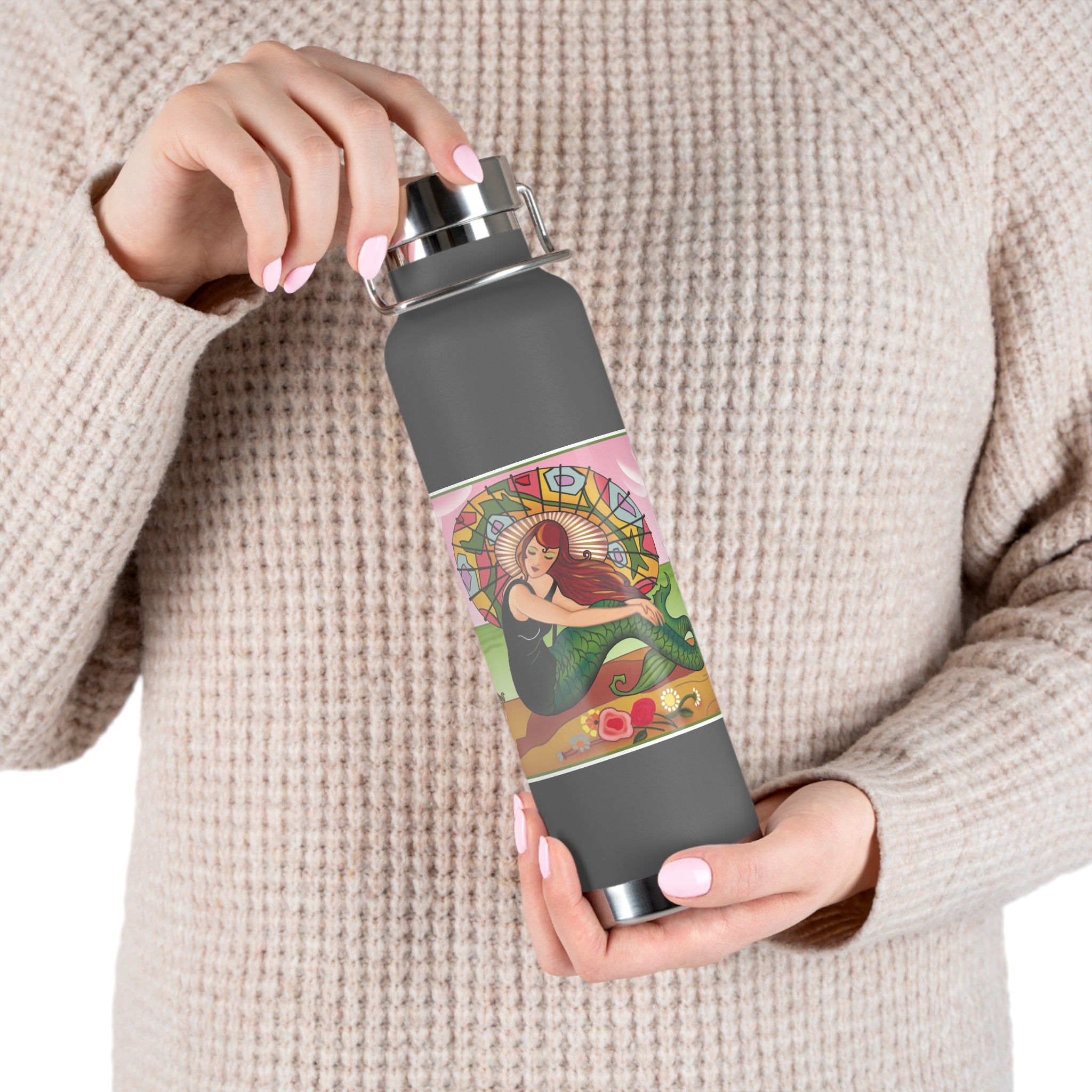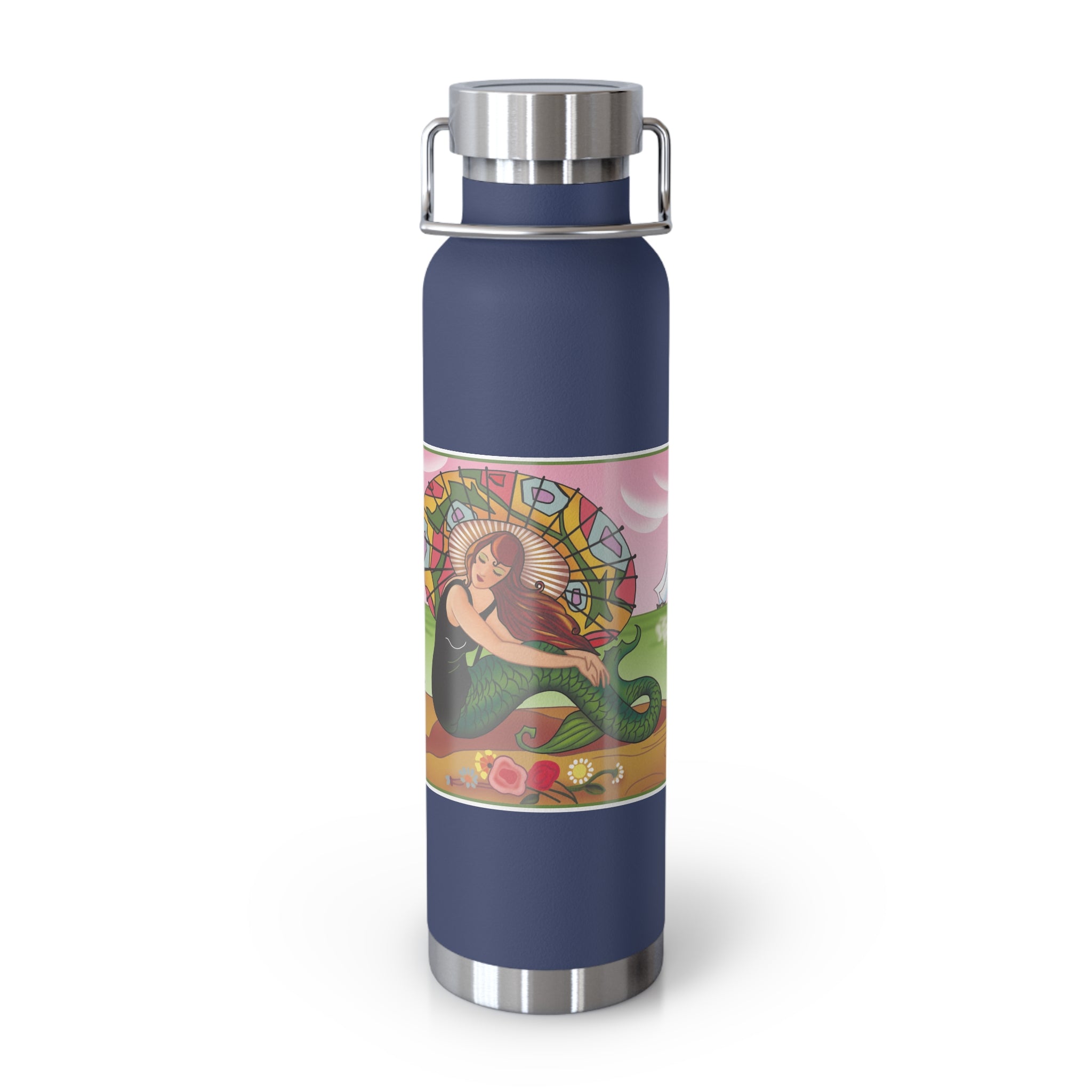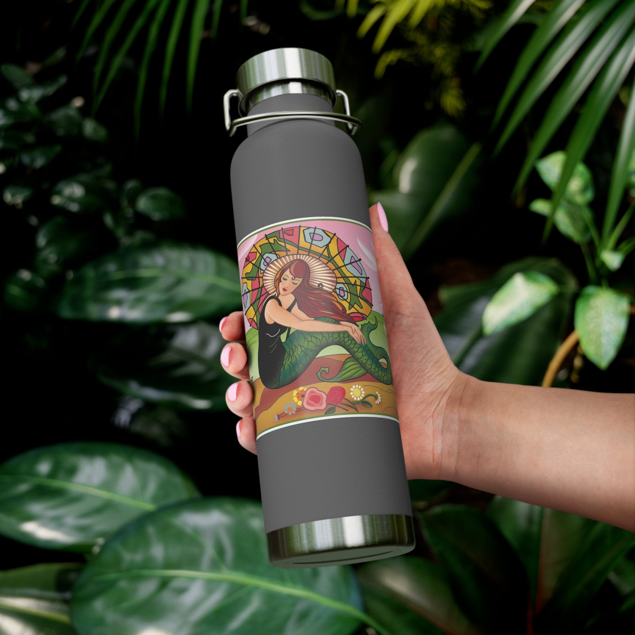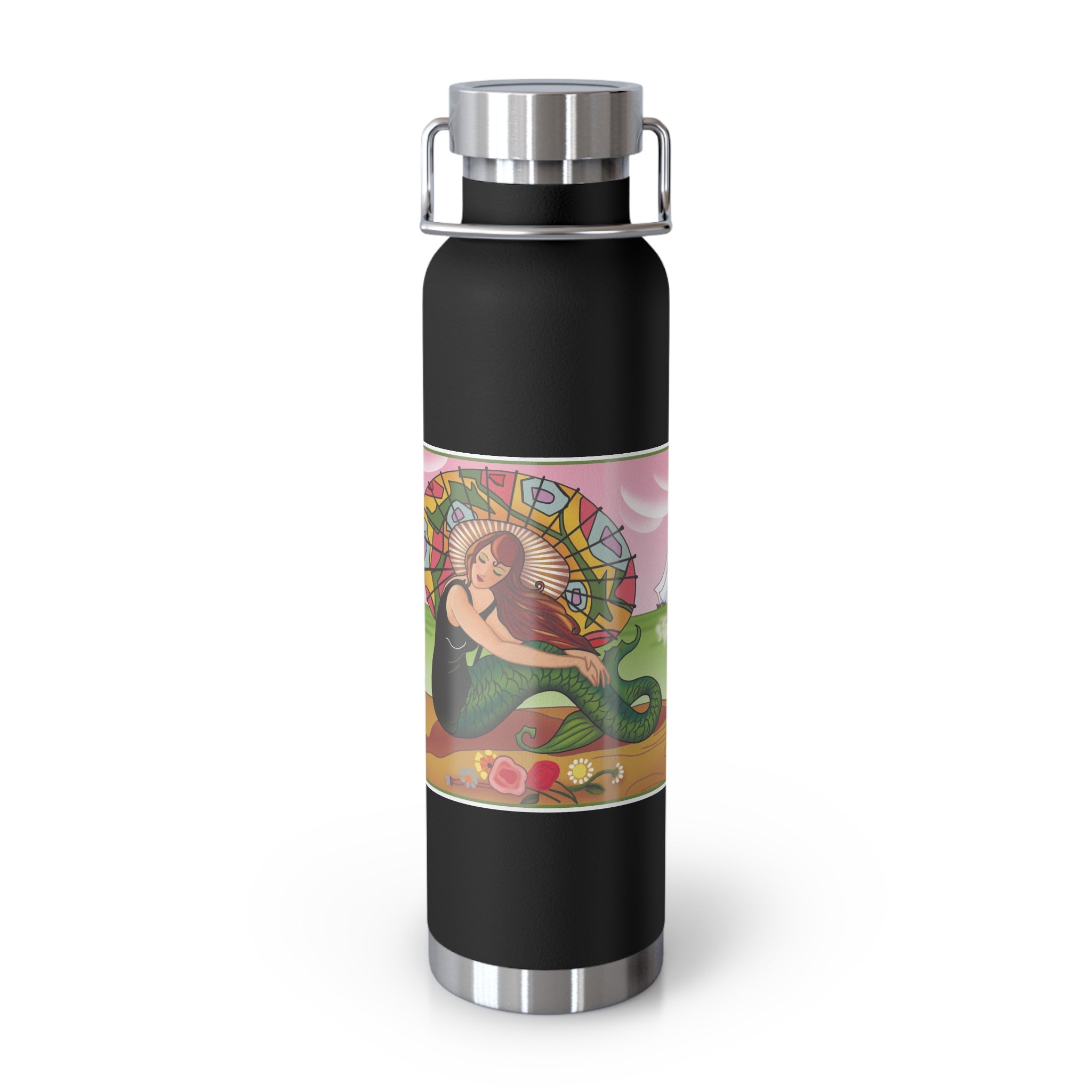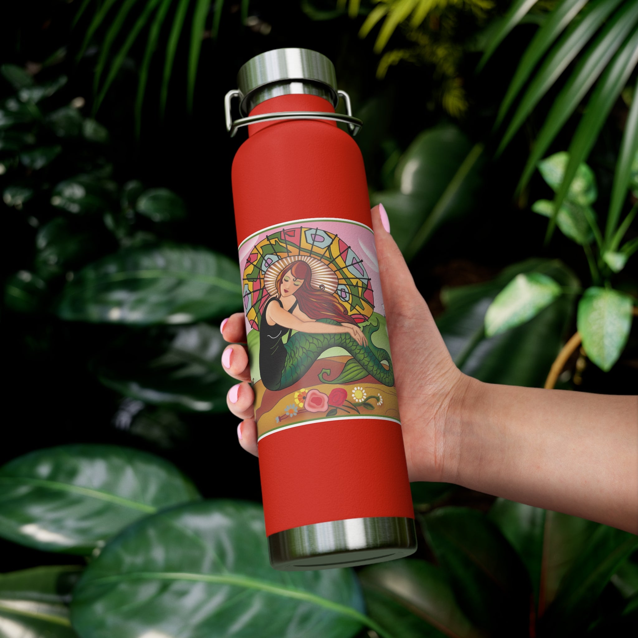 Artwork designed and digitally remastered by Sarasvati Designs. A captivating vintage Art Deco artwork by Carlo Chiostri features a mermaid with fiery red hair, a vibrant green tail, and a colorful patterned parasol, surrounded by delicate flowers and a small cupid.