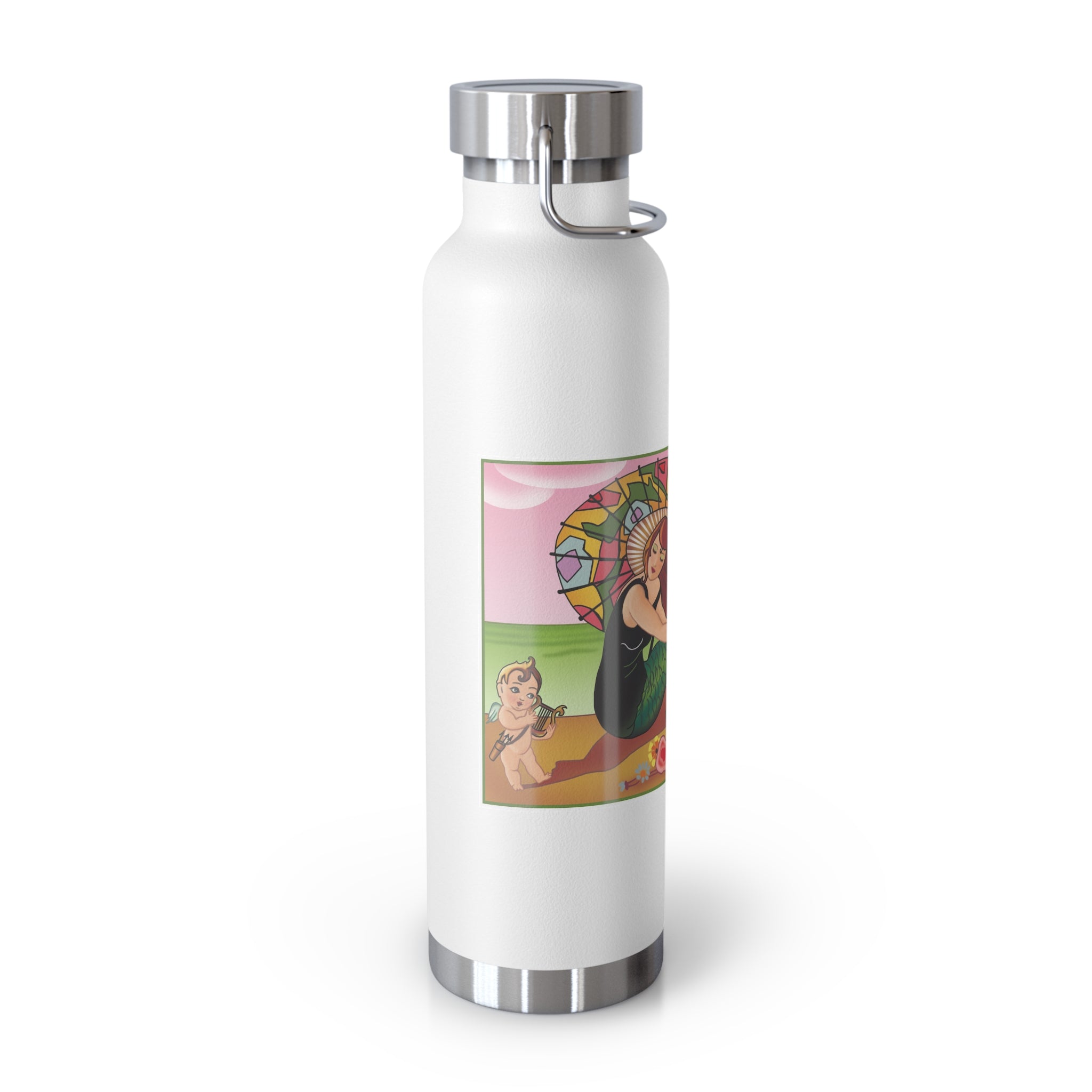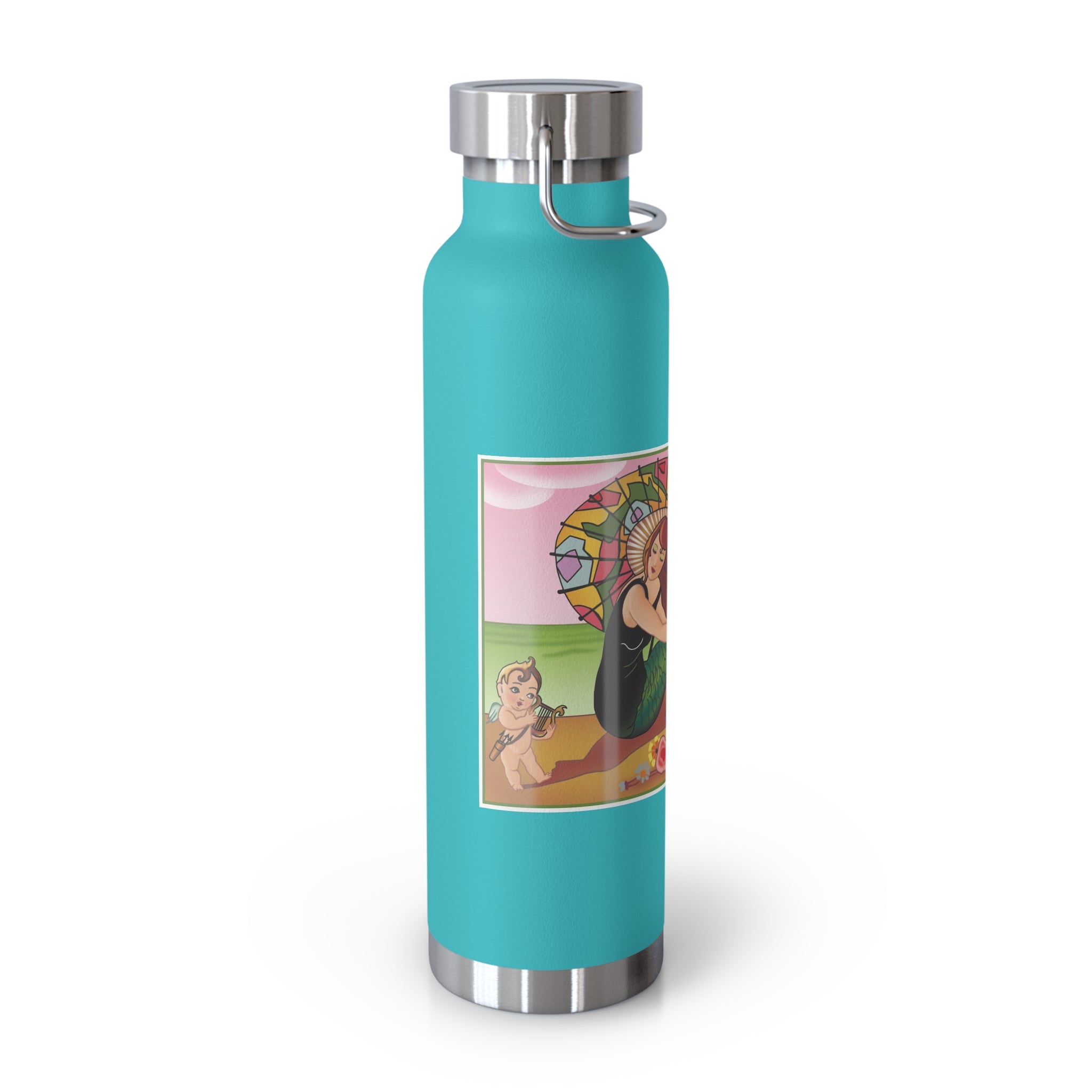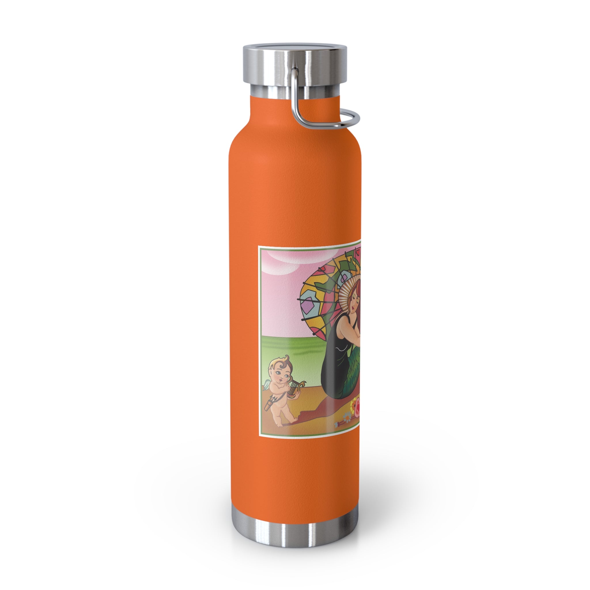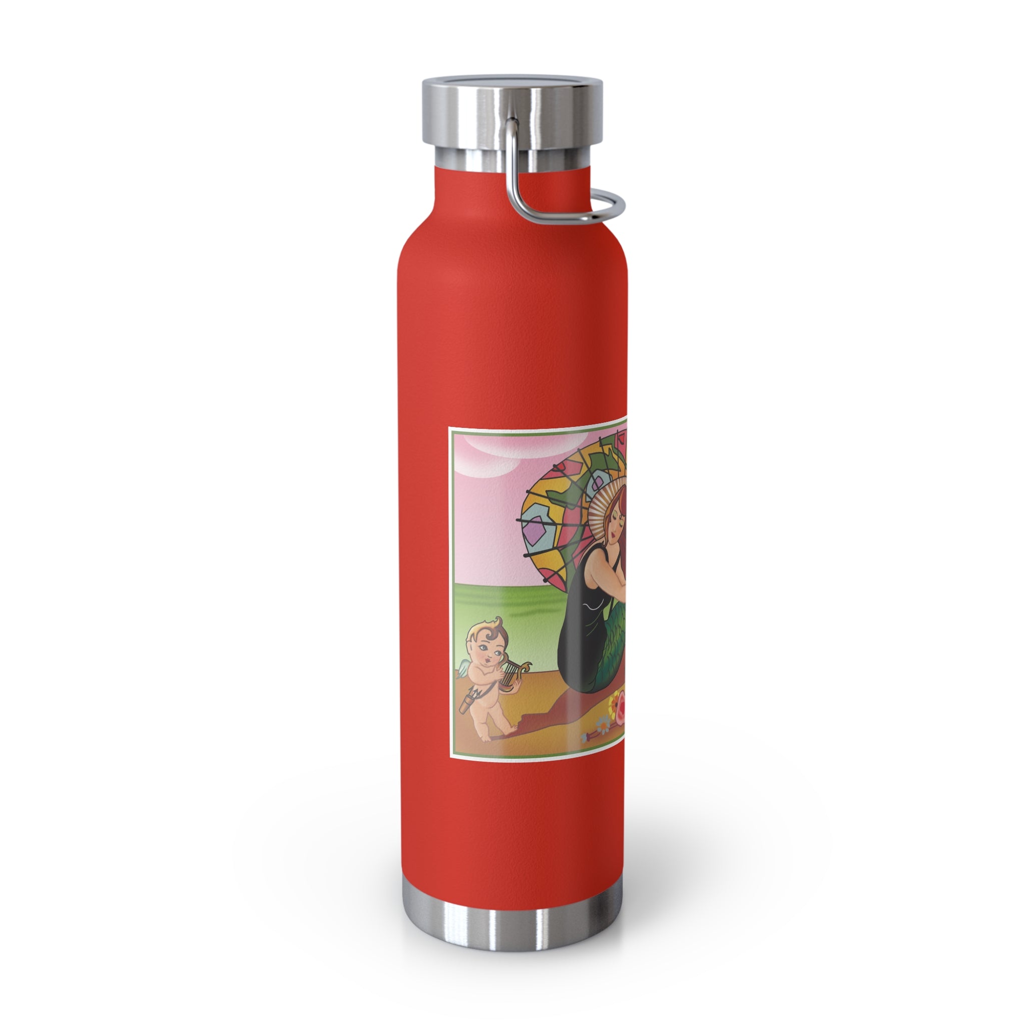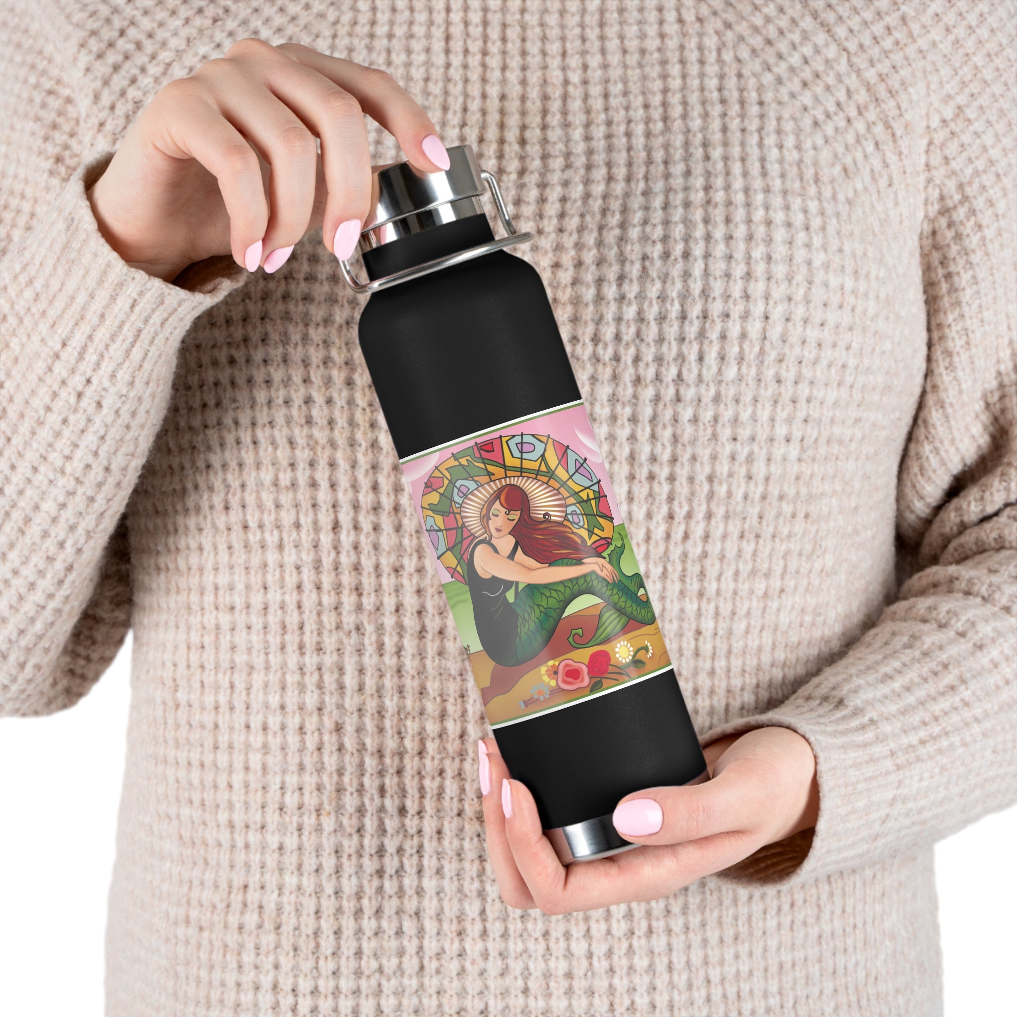 Artwork designed and digitally remastered by Sarasvati Designs. A captivating vintage Art Deco artwork by Carlo Chiostri features a mermaid with fiery red hair, a vibrant green tail, and a colorful patterned parasol, surrounded by delicate flowers and a small cupid.