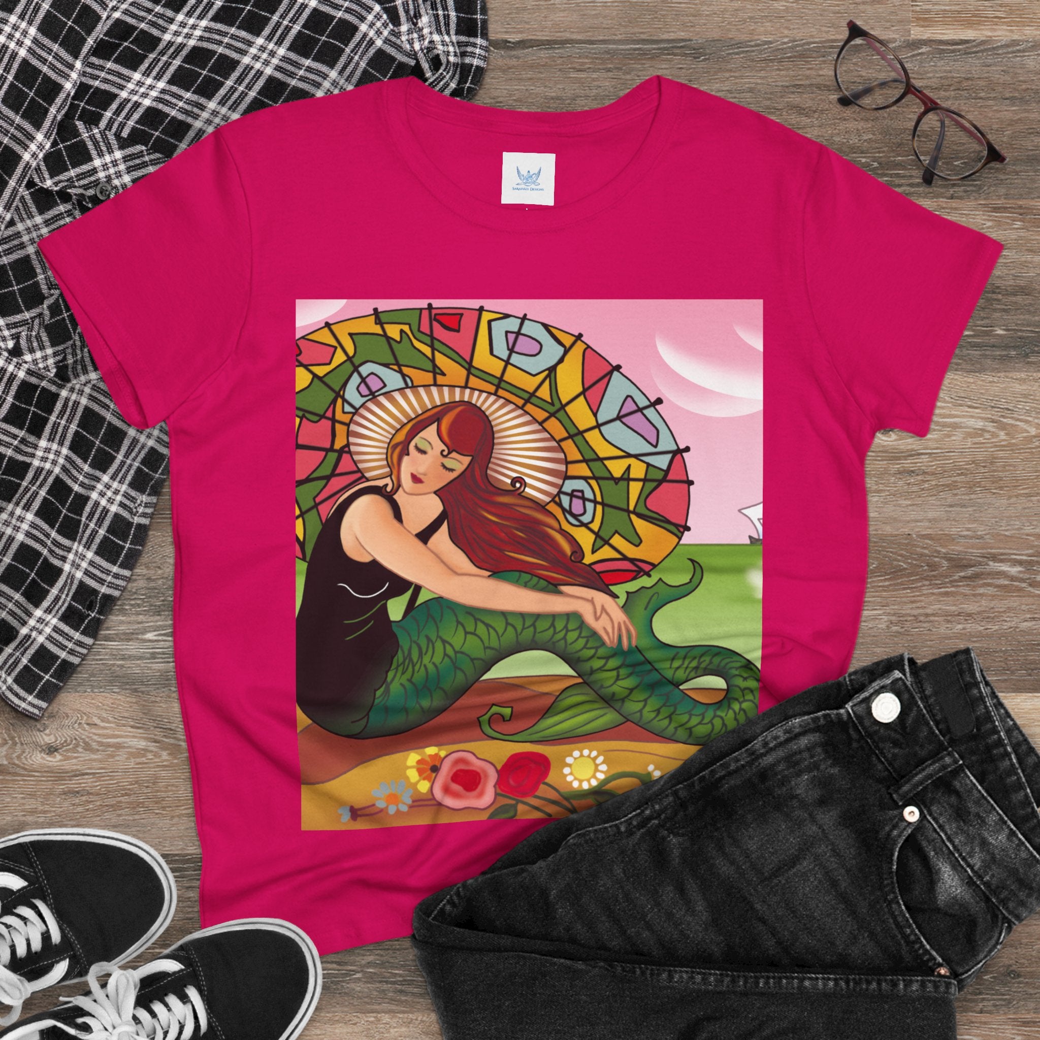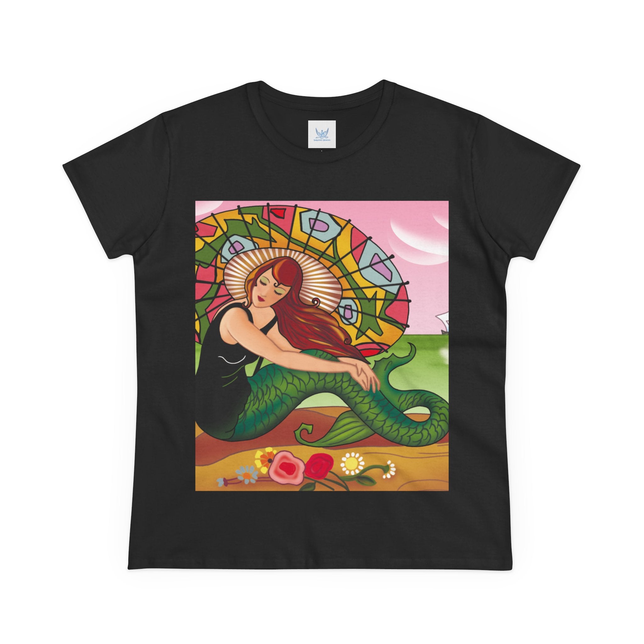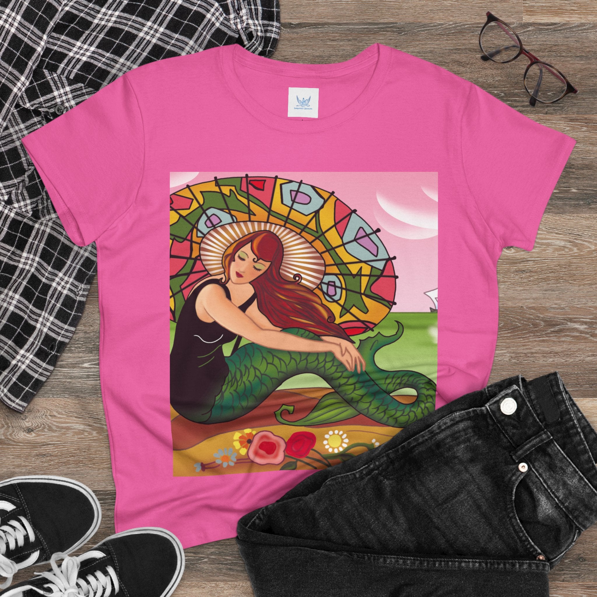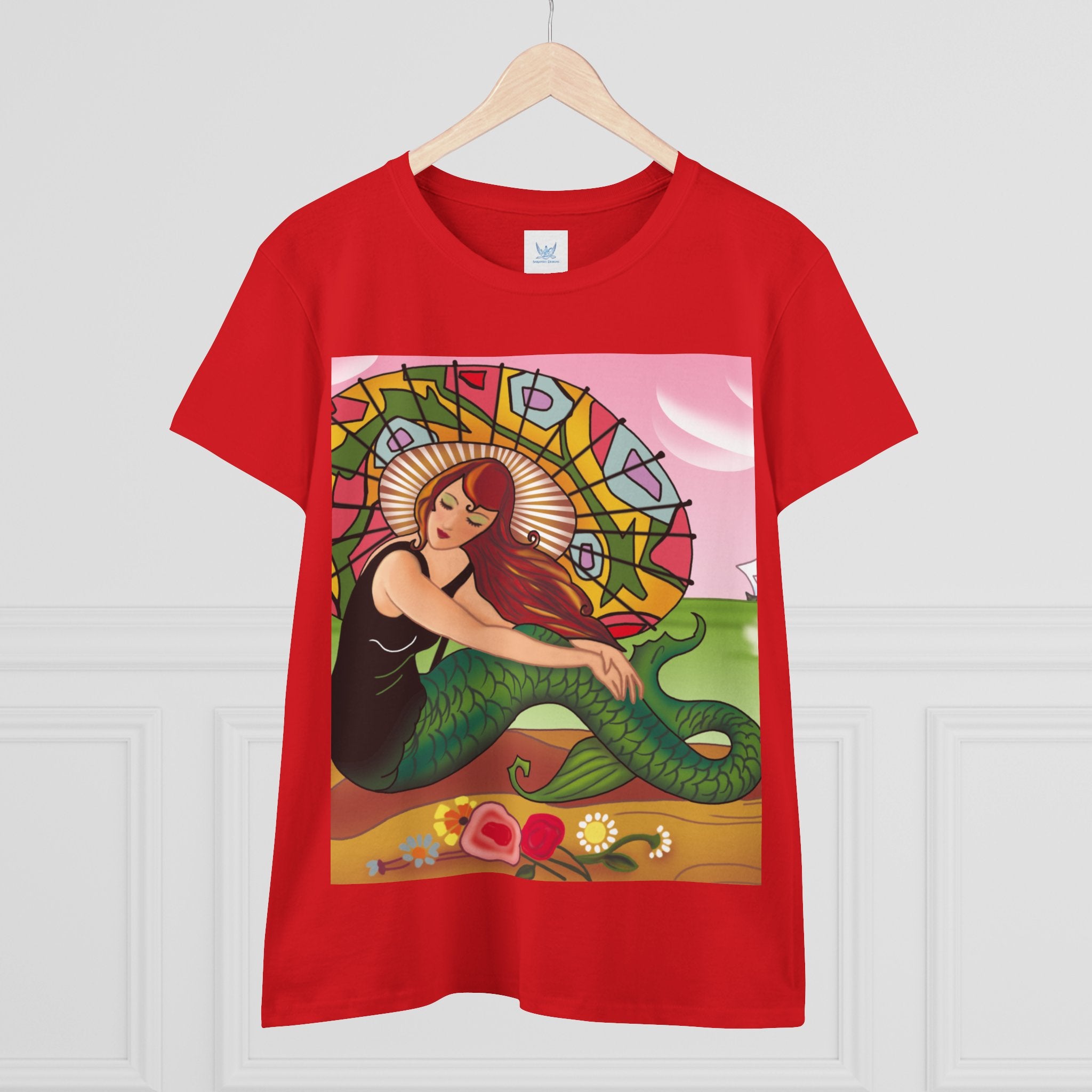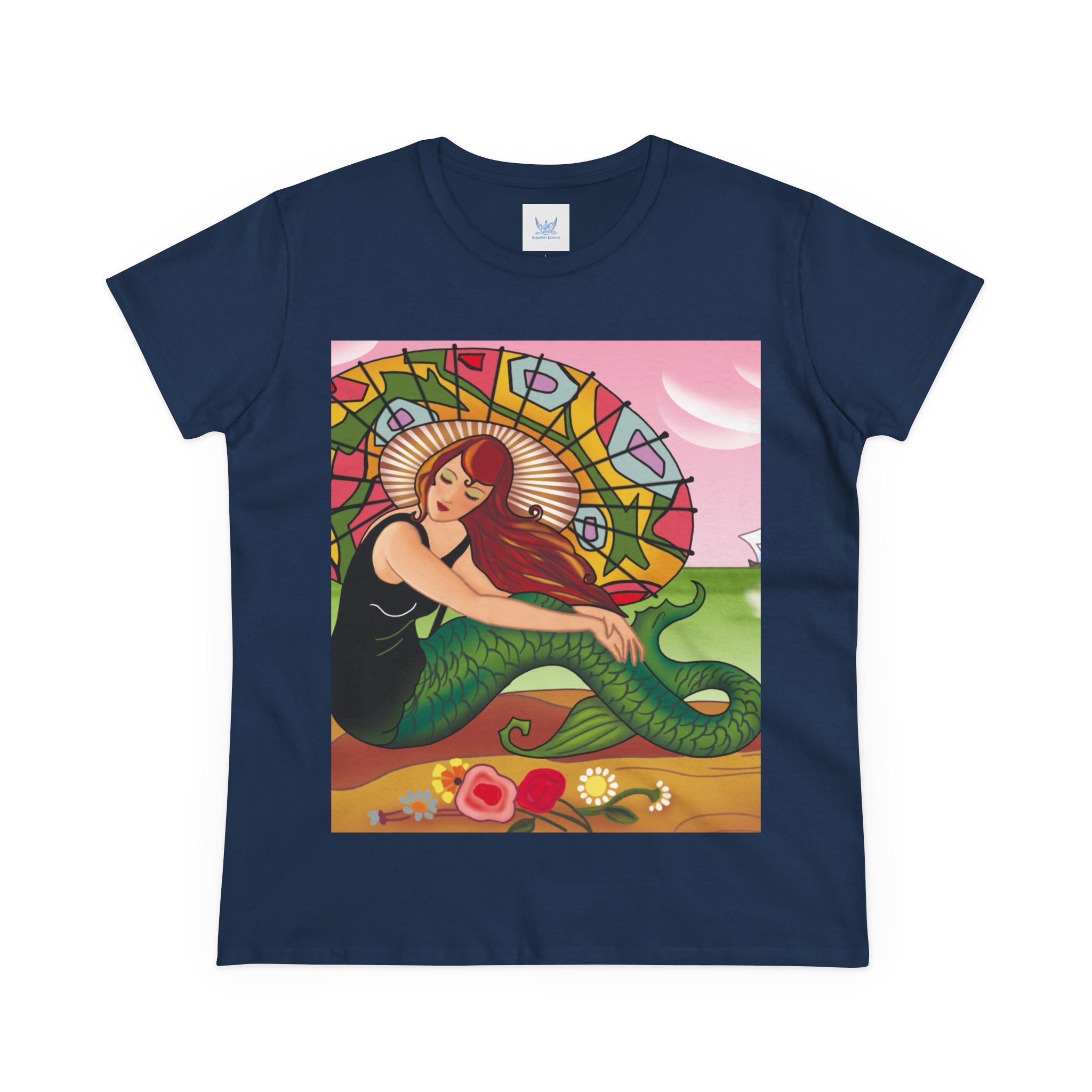 Across the fabric unfolds a captivating Art Deco illustration by Carlo Chiostri, featuring a mermaid with fiery red hair, a vibrant green tail, and a beautifully patterned parasol. Surrounded by delicate flowers, her whimsical elegance and vivid colors create a timeless scene that transforms this tee into a piece of vintage fantasy.