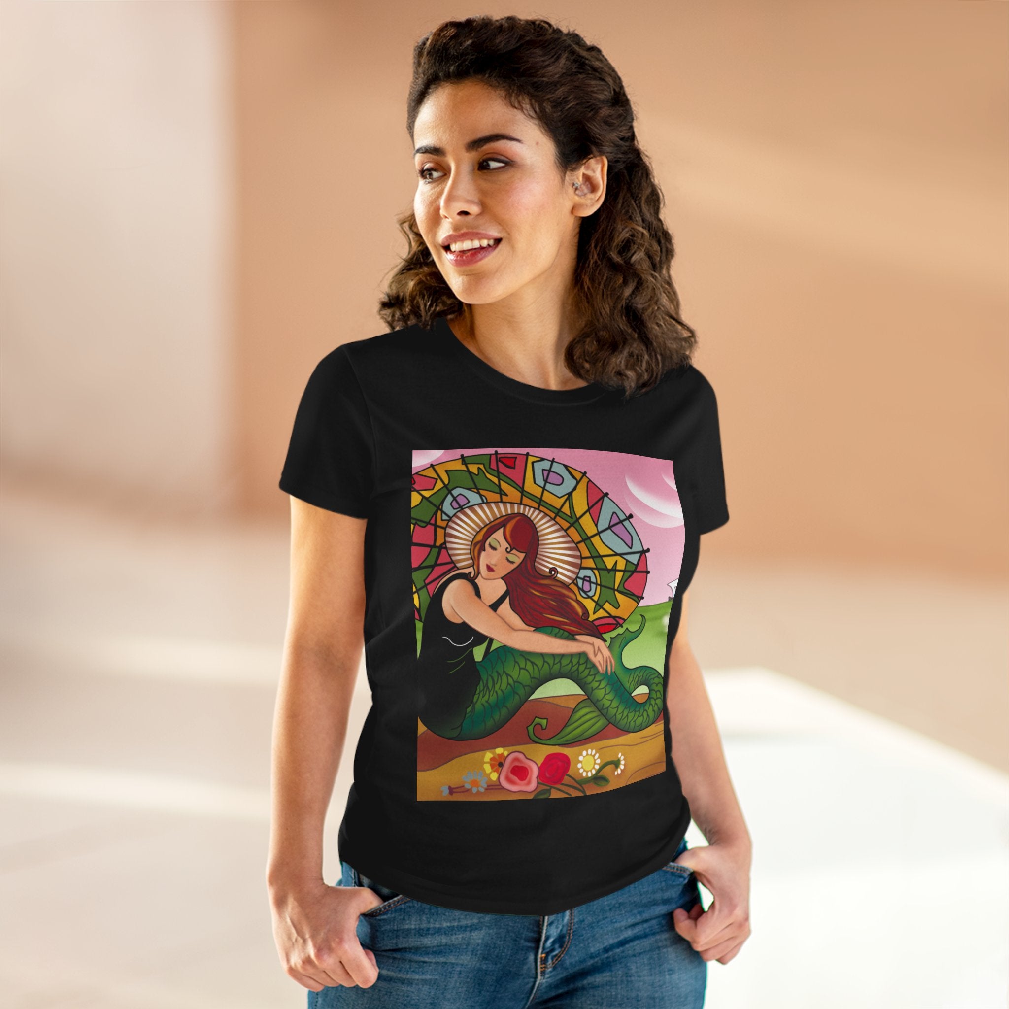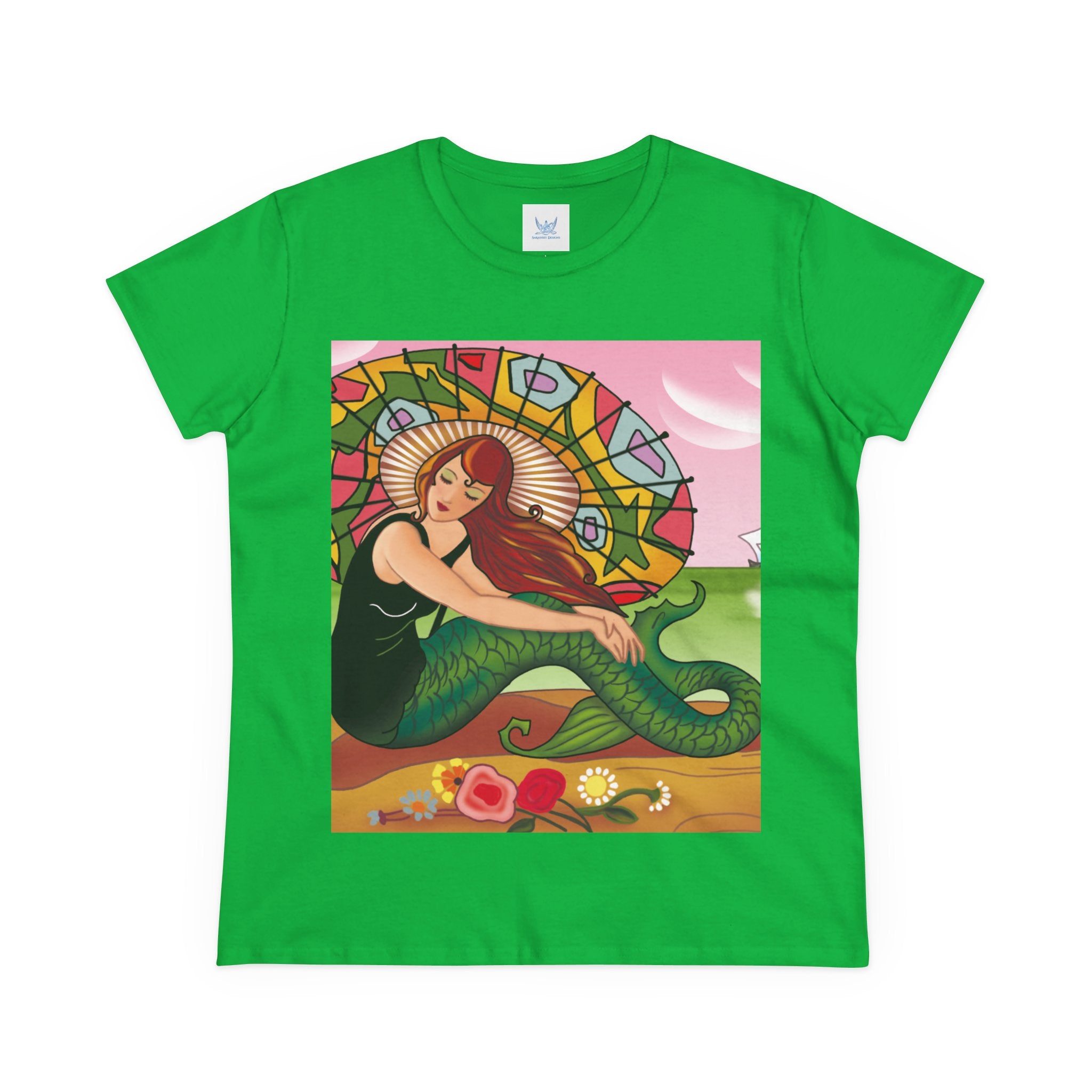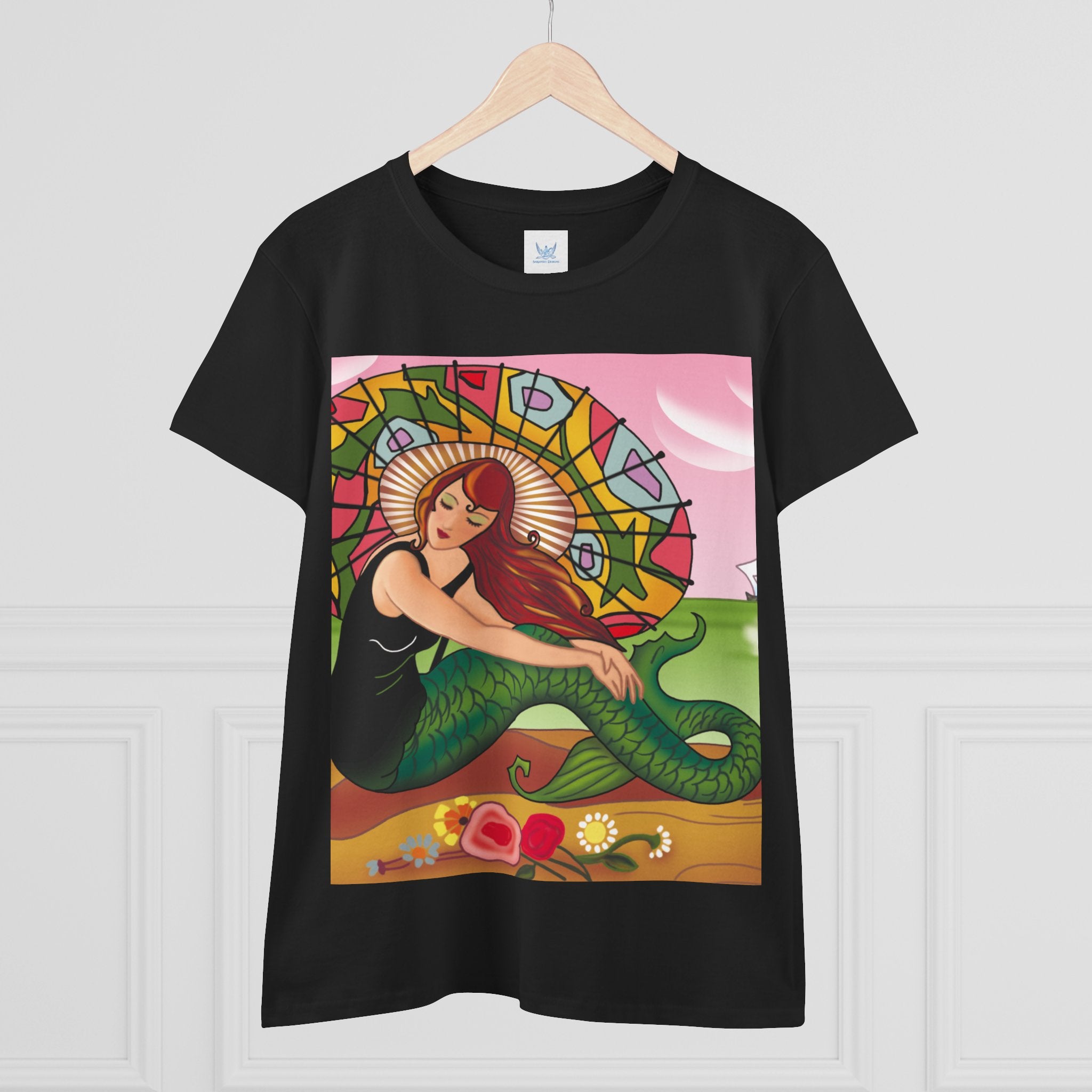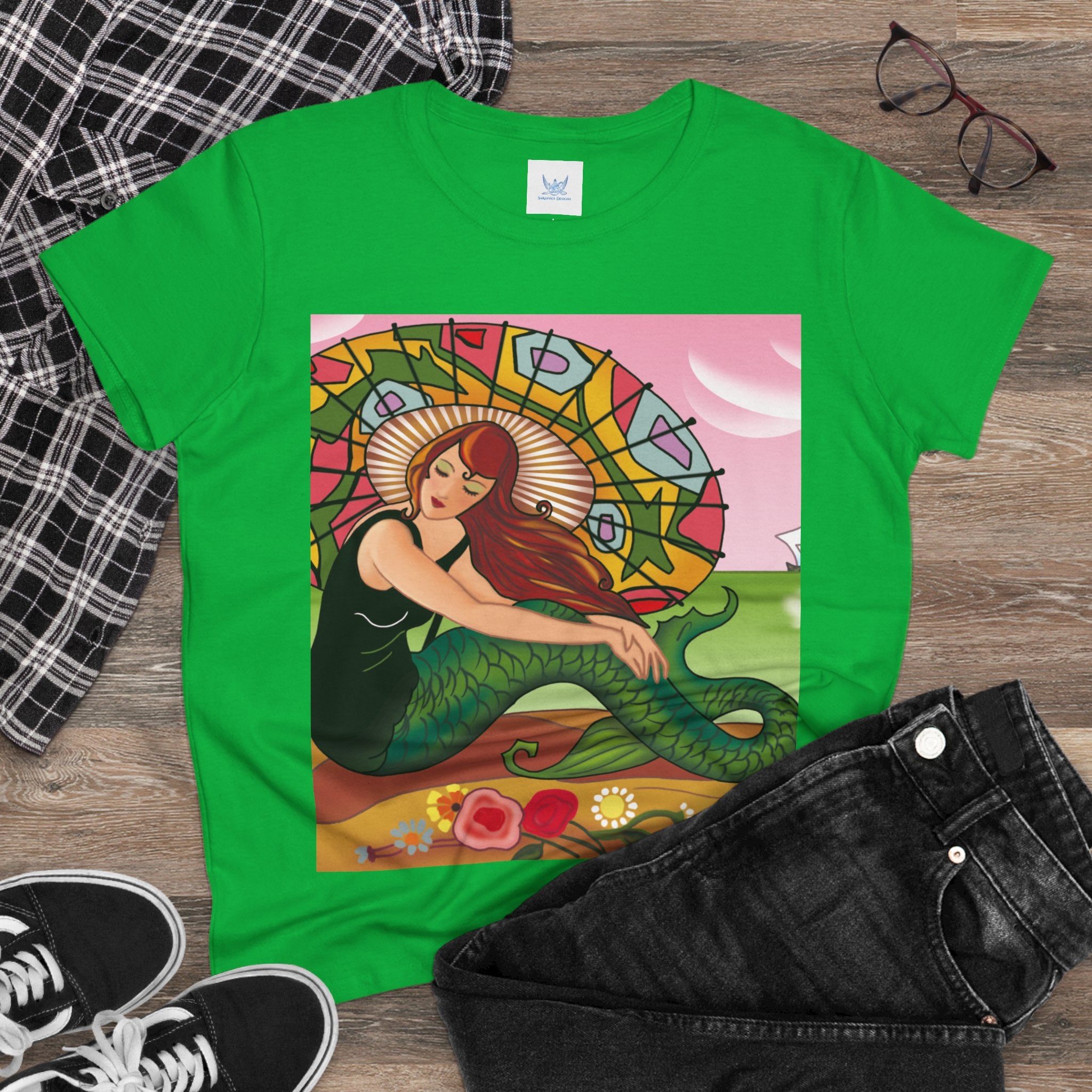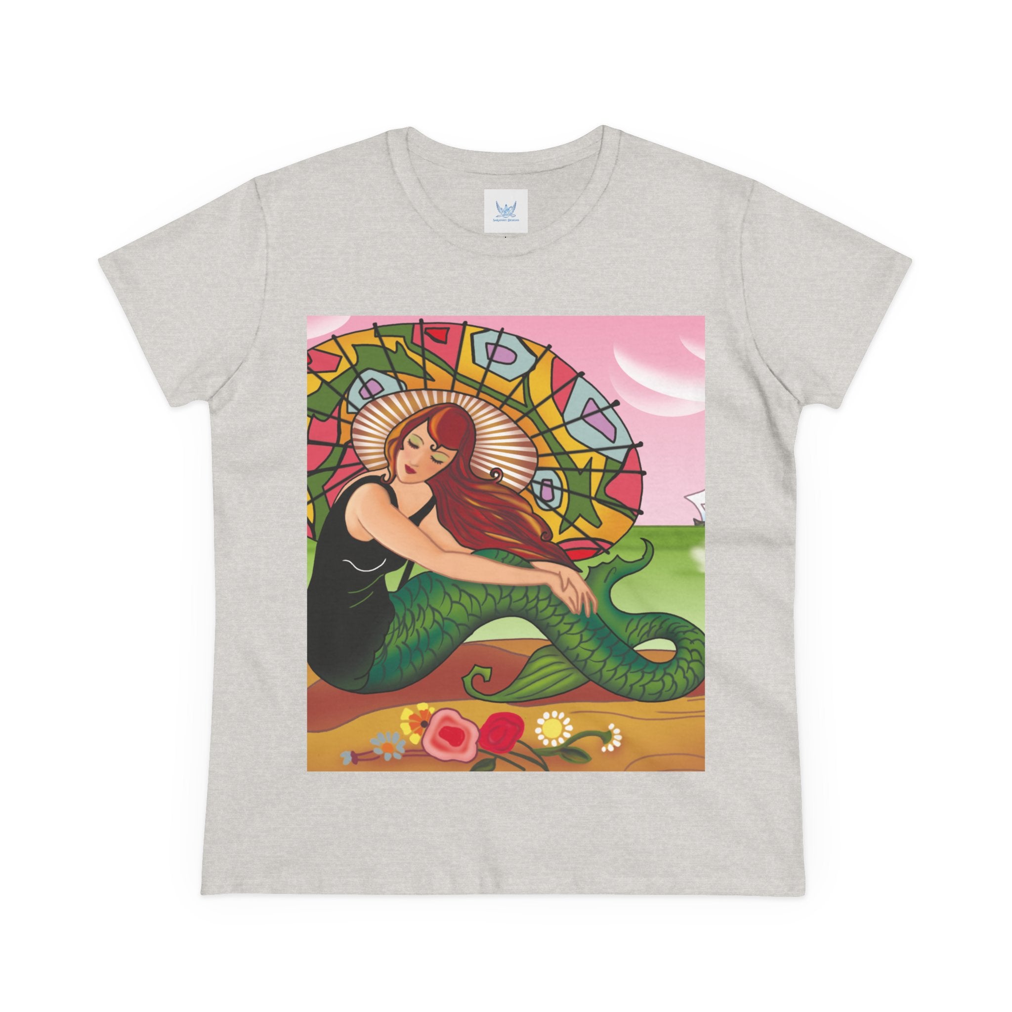 Across the fabric unfolds a captivating Art Deco illustration by Carlo Chiostri, featuring a mermaid with fiery red hair, a vibrant green tail, and a beautifully patterned parasol. Surrounded by delicate flowers, her whimsical elegance and vivid colors create a timeless scene that transforms this tee into a piece of vintage fantasy.