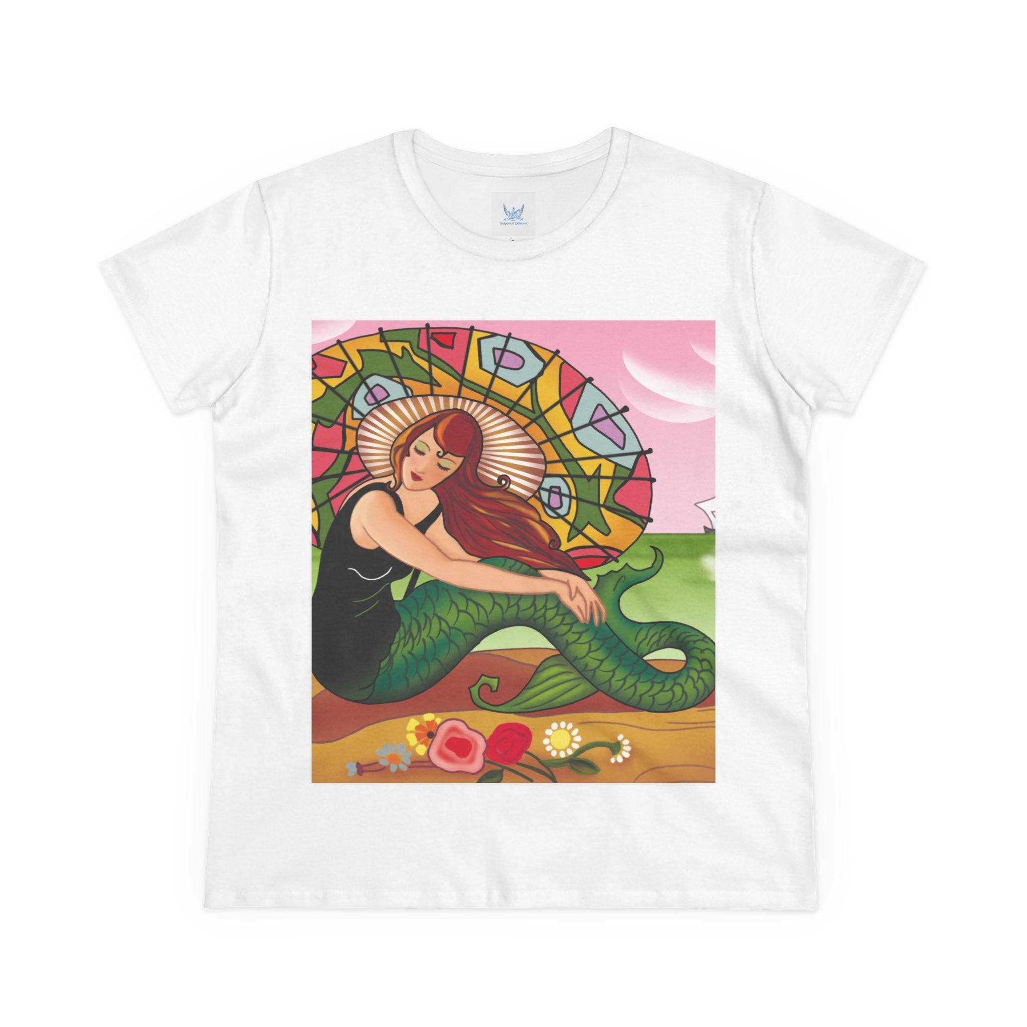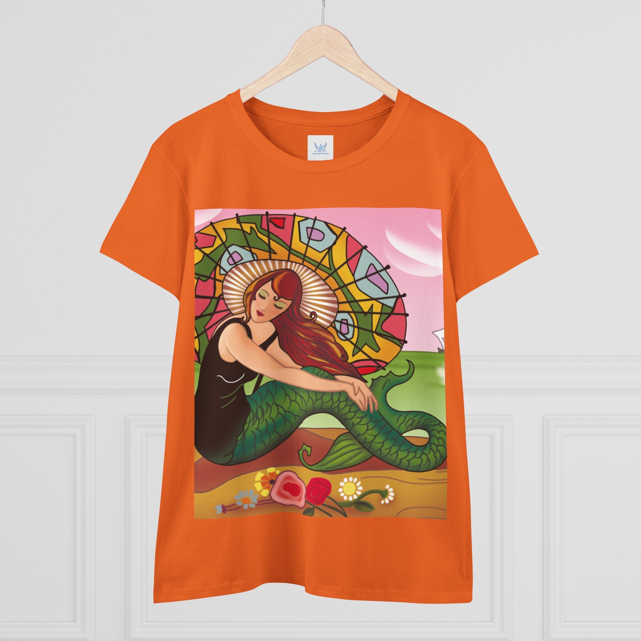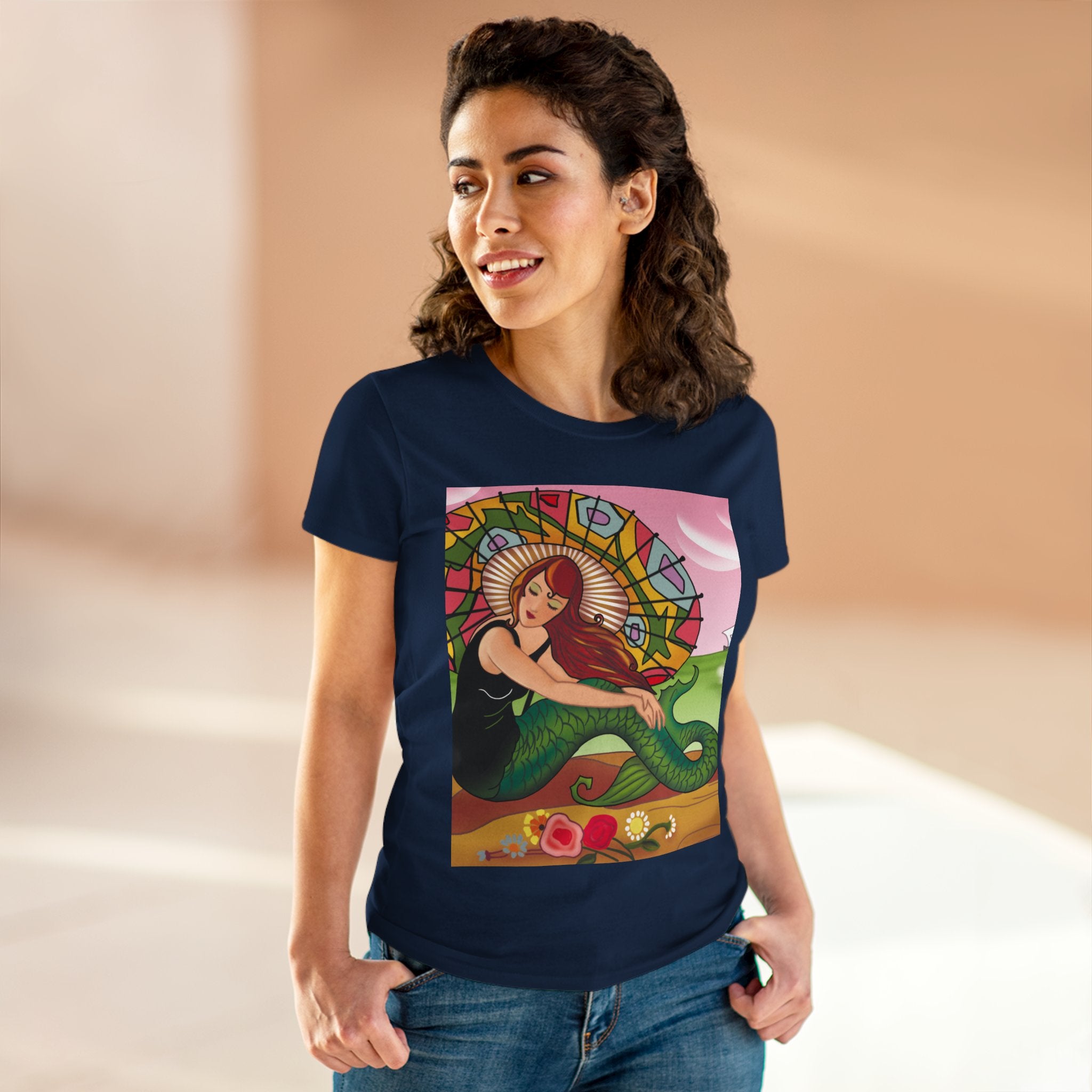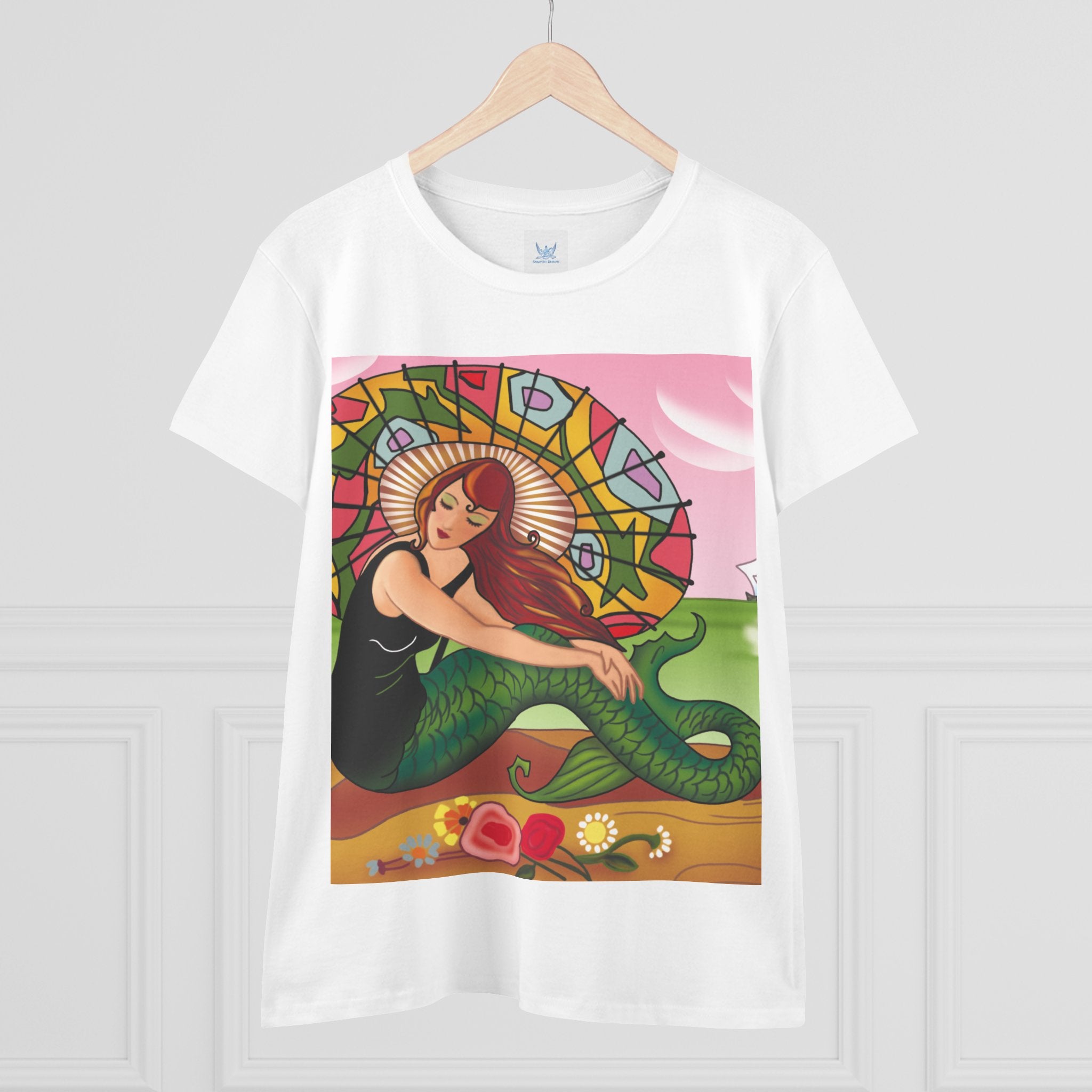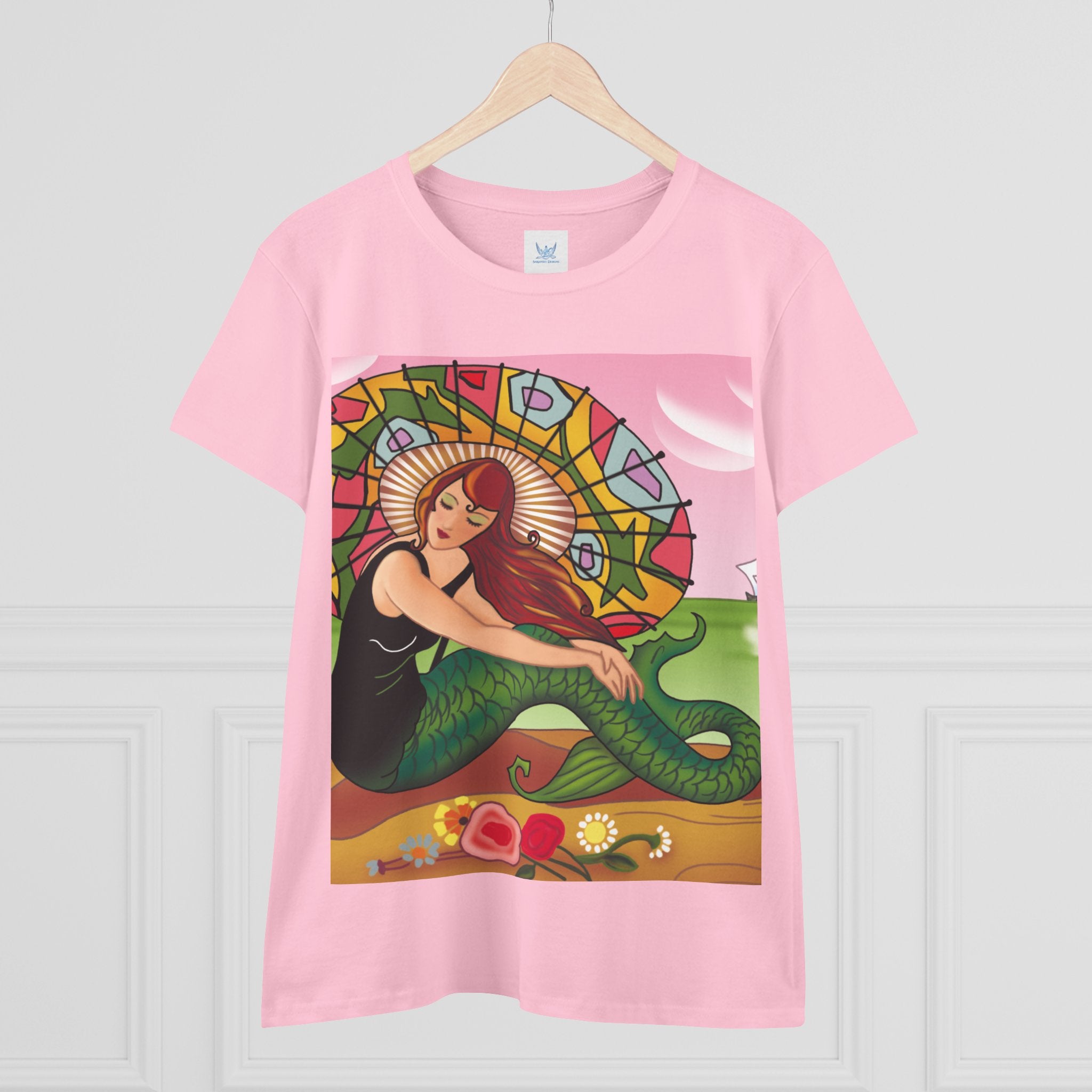Across the fabric unfolds a captivating Art Deco illustration by Carlo Chiostri, featuring a mermaid with fiery red hair, a vibrant green tail, and a beautifully patterned parasol. Surrounded by delicate flowers, her whimsical elegance and vivid colors create a timeless scene that transforms this tee into a piece of vintage fantasy.