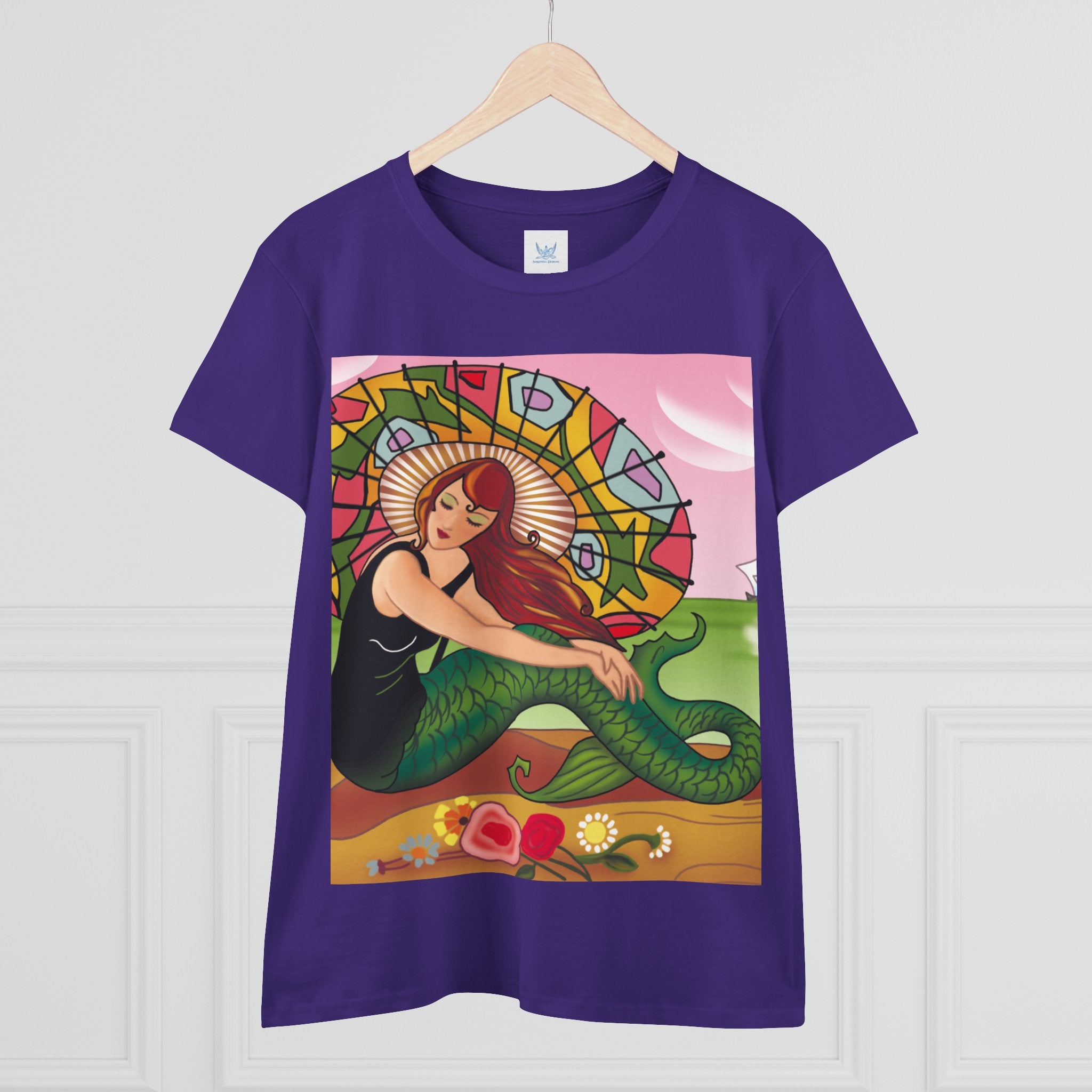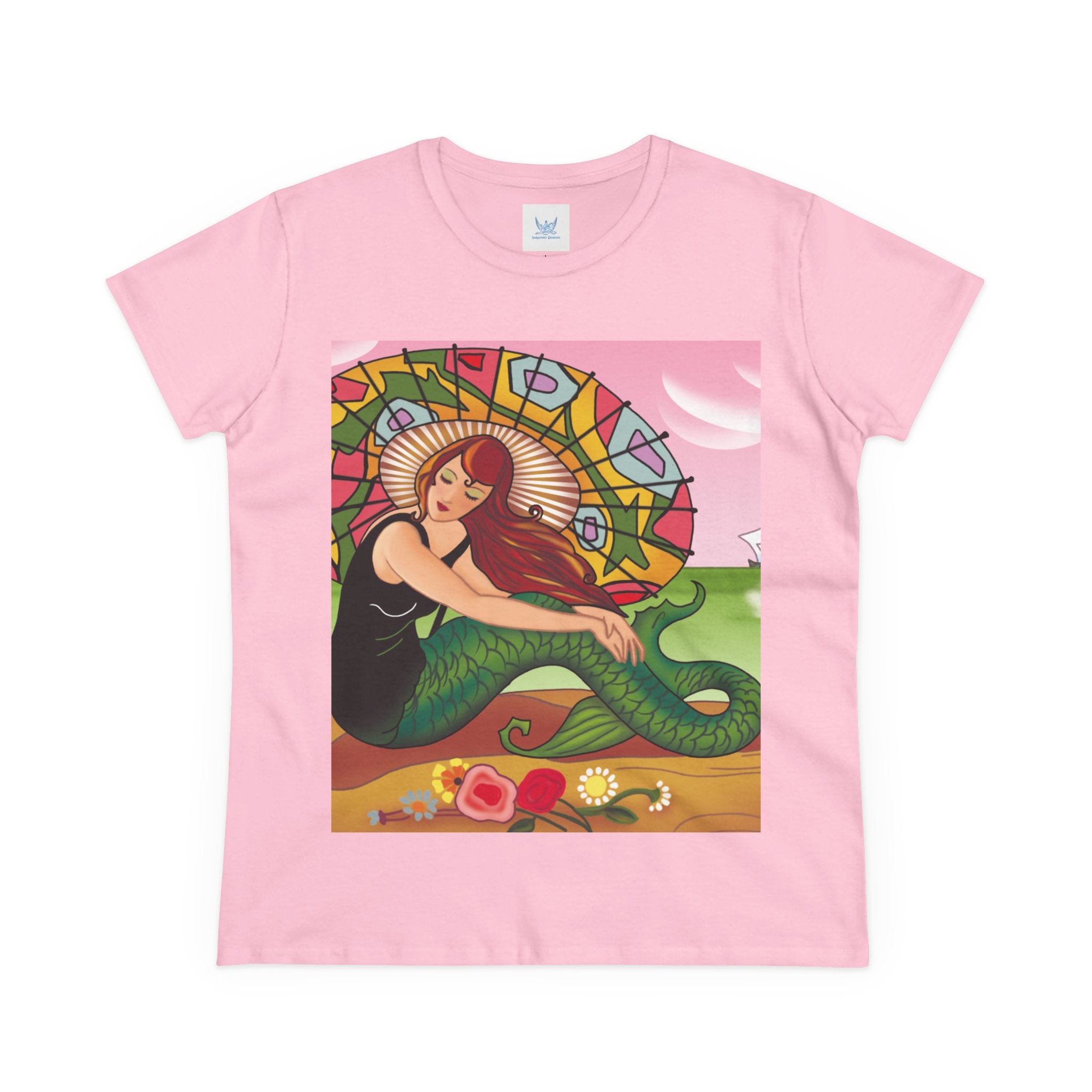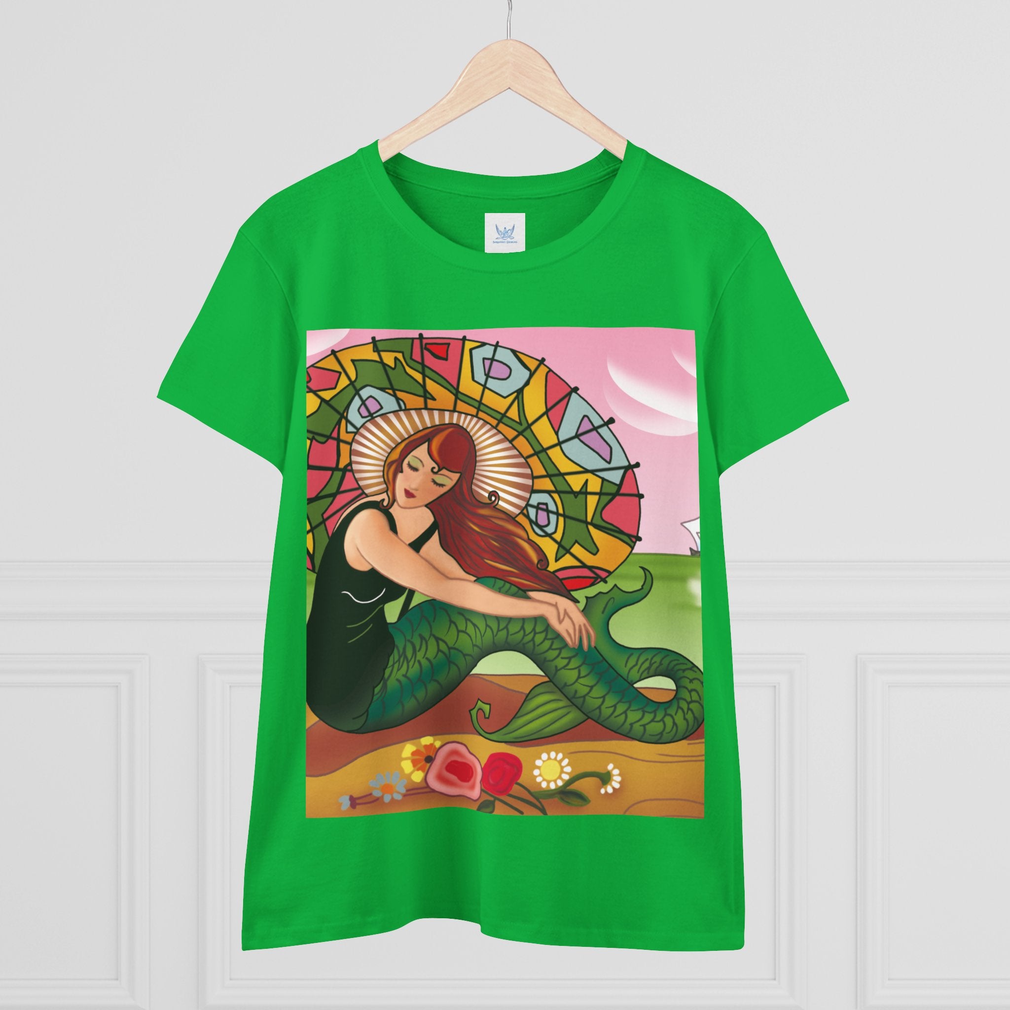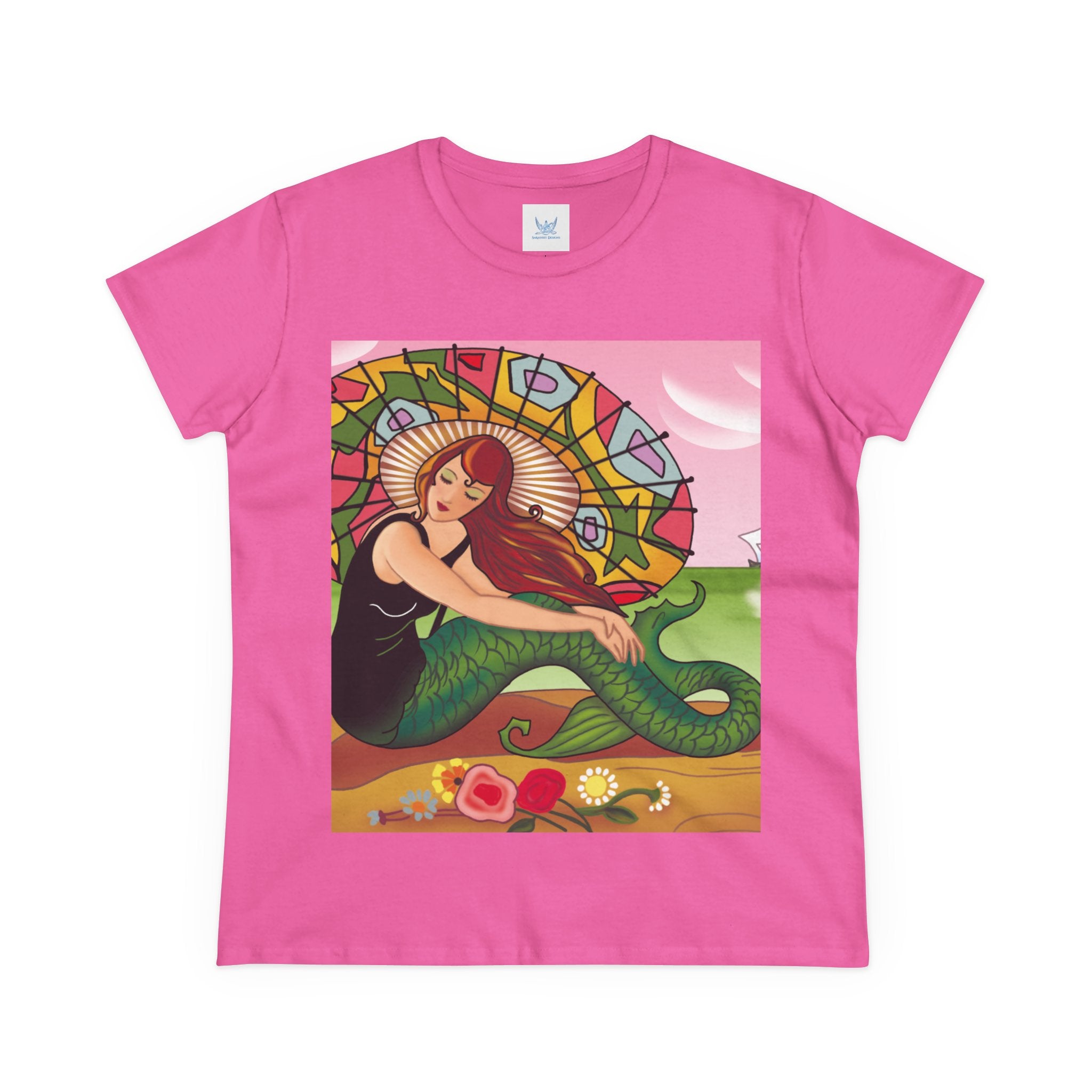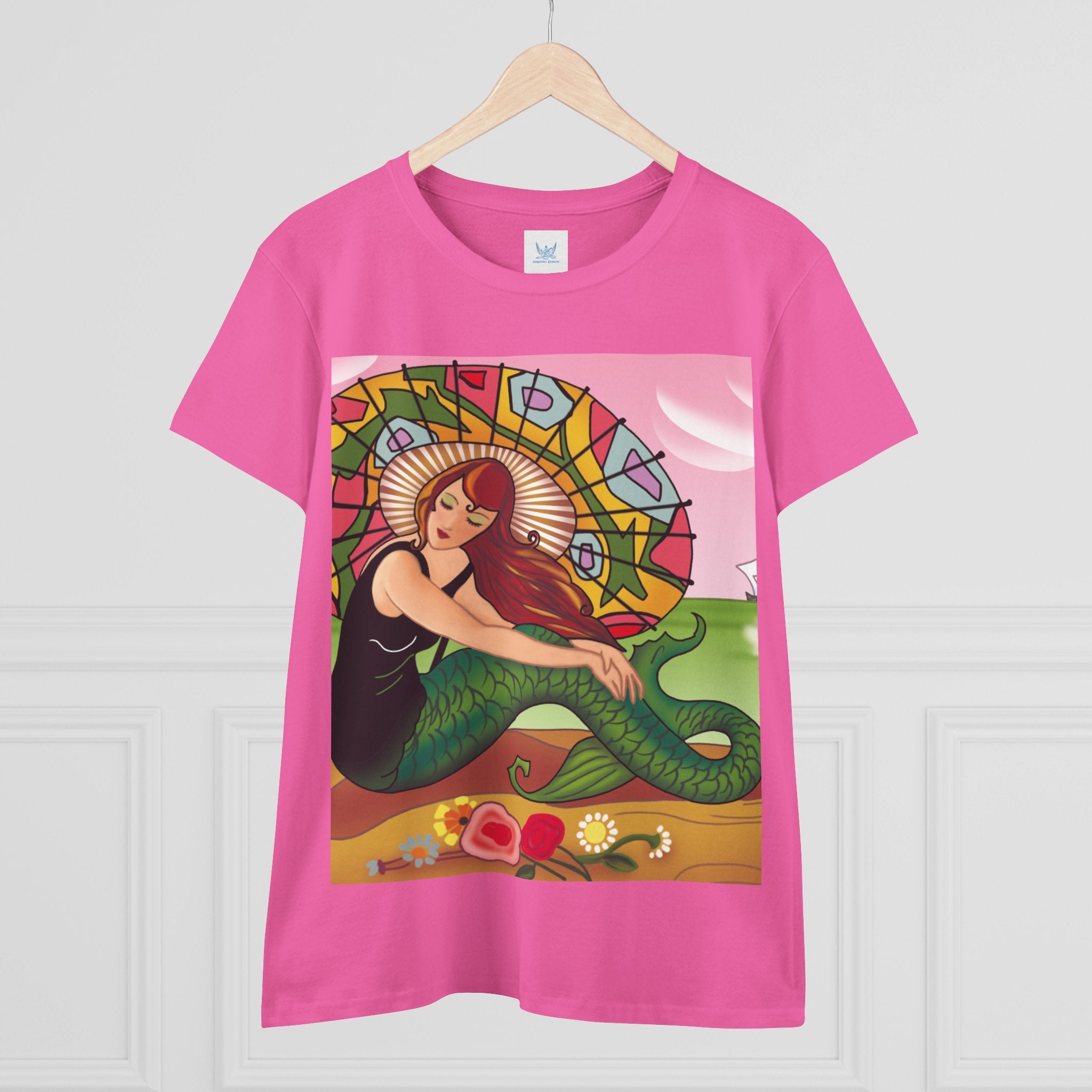 Across the fabric unfolds a captivating Art Deco illustration by Carlo Chiostri, featuring a mermaid with fiery red hair, a vibrant green tail, and a beautifully patterned parasol. Surrounded by delicate flowers, her whimsical elegance and vivid colors create a timeless scene that transforms this tee into a piece of vintage fantasy.