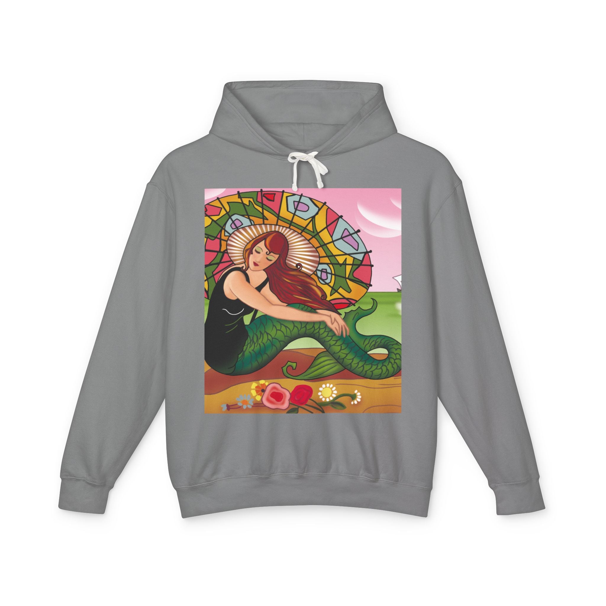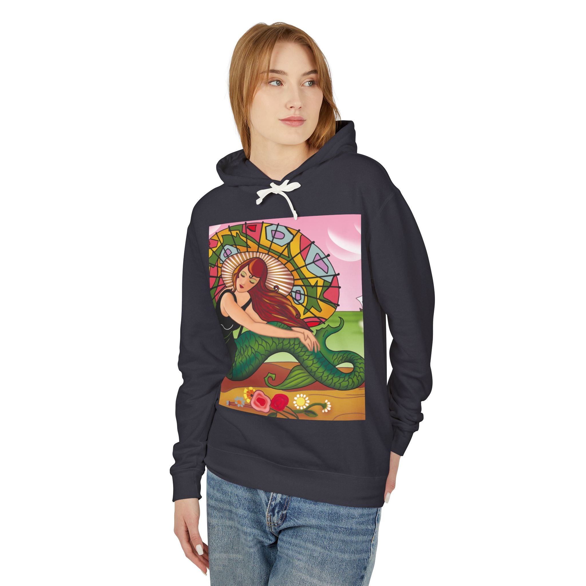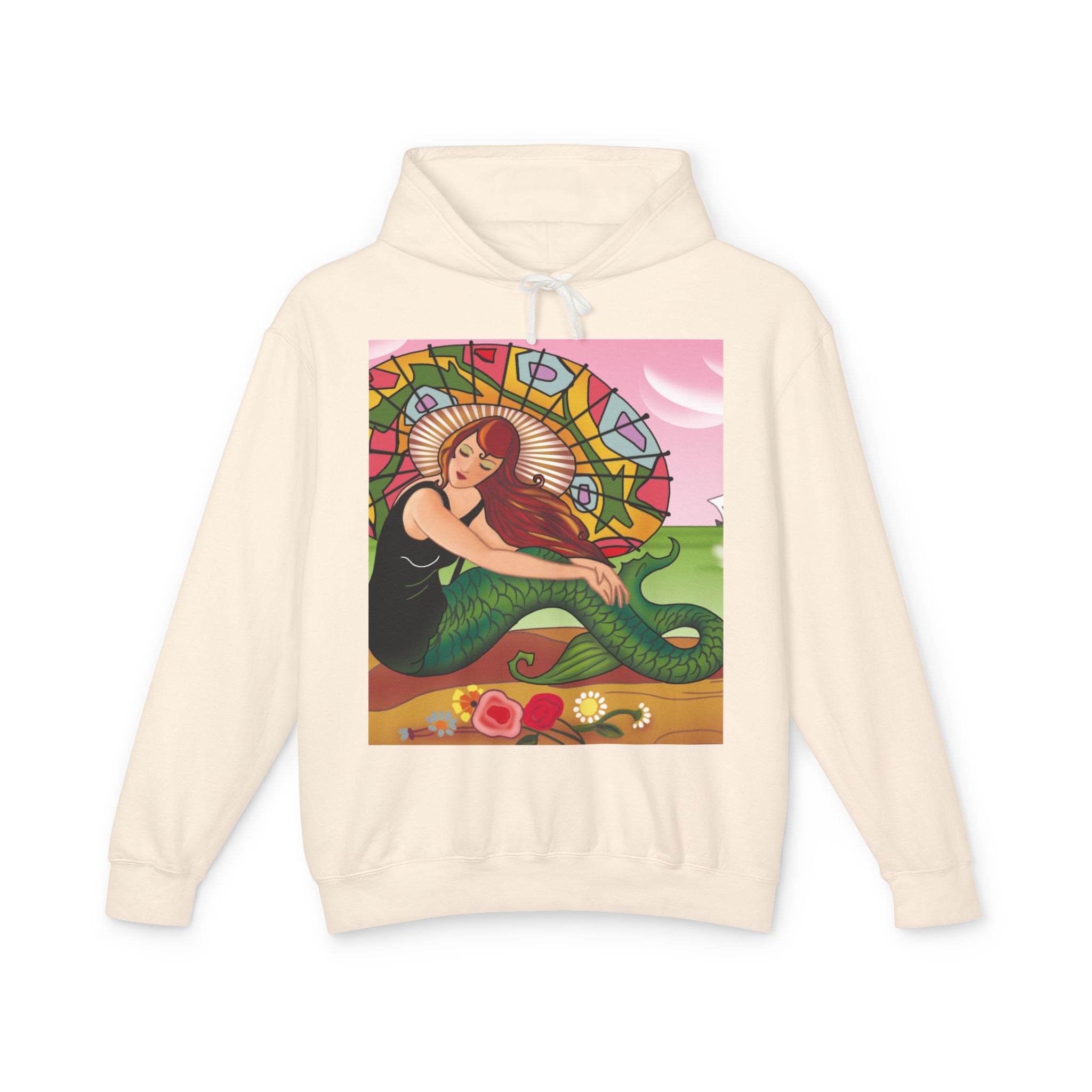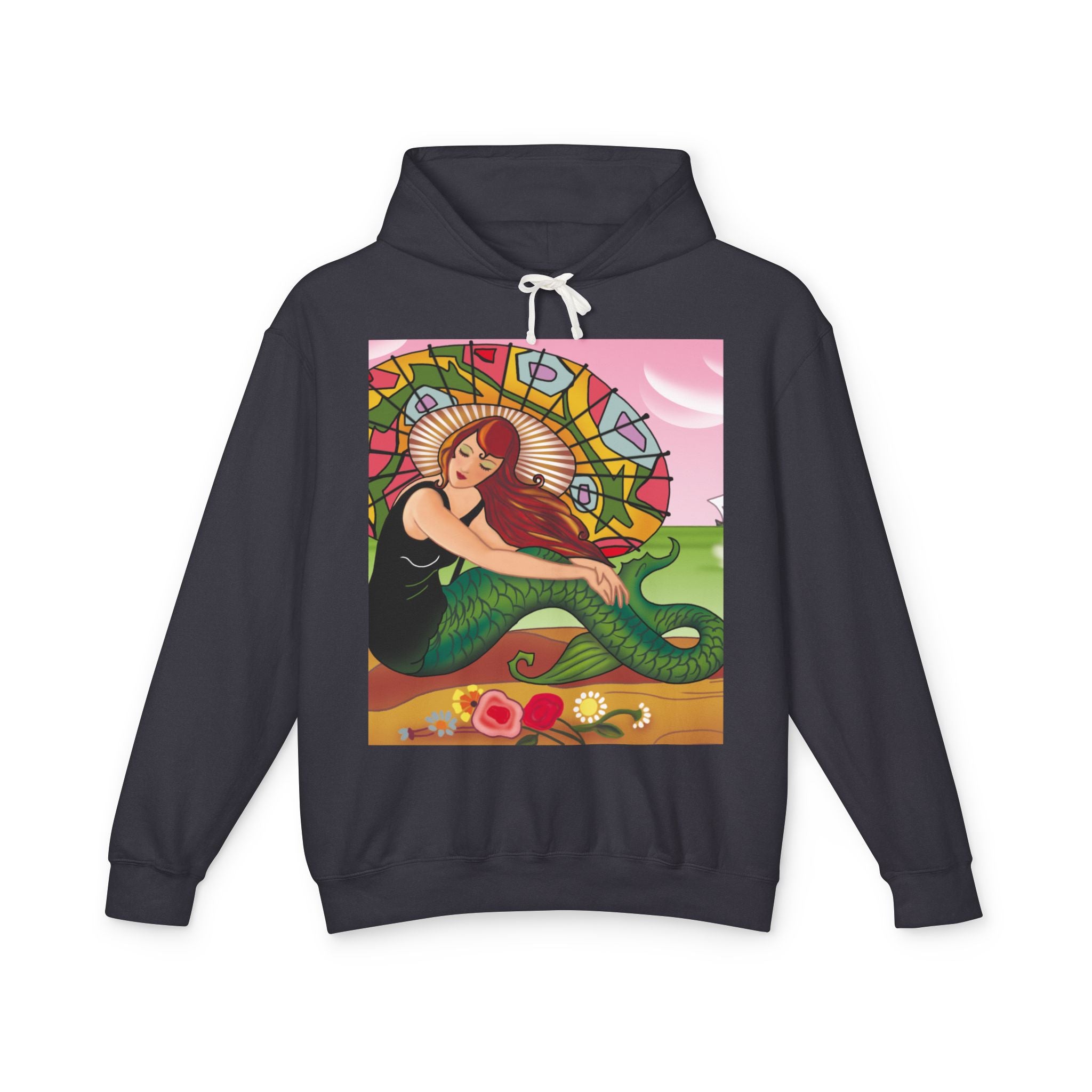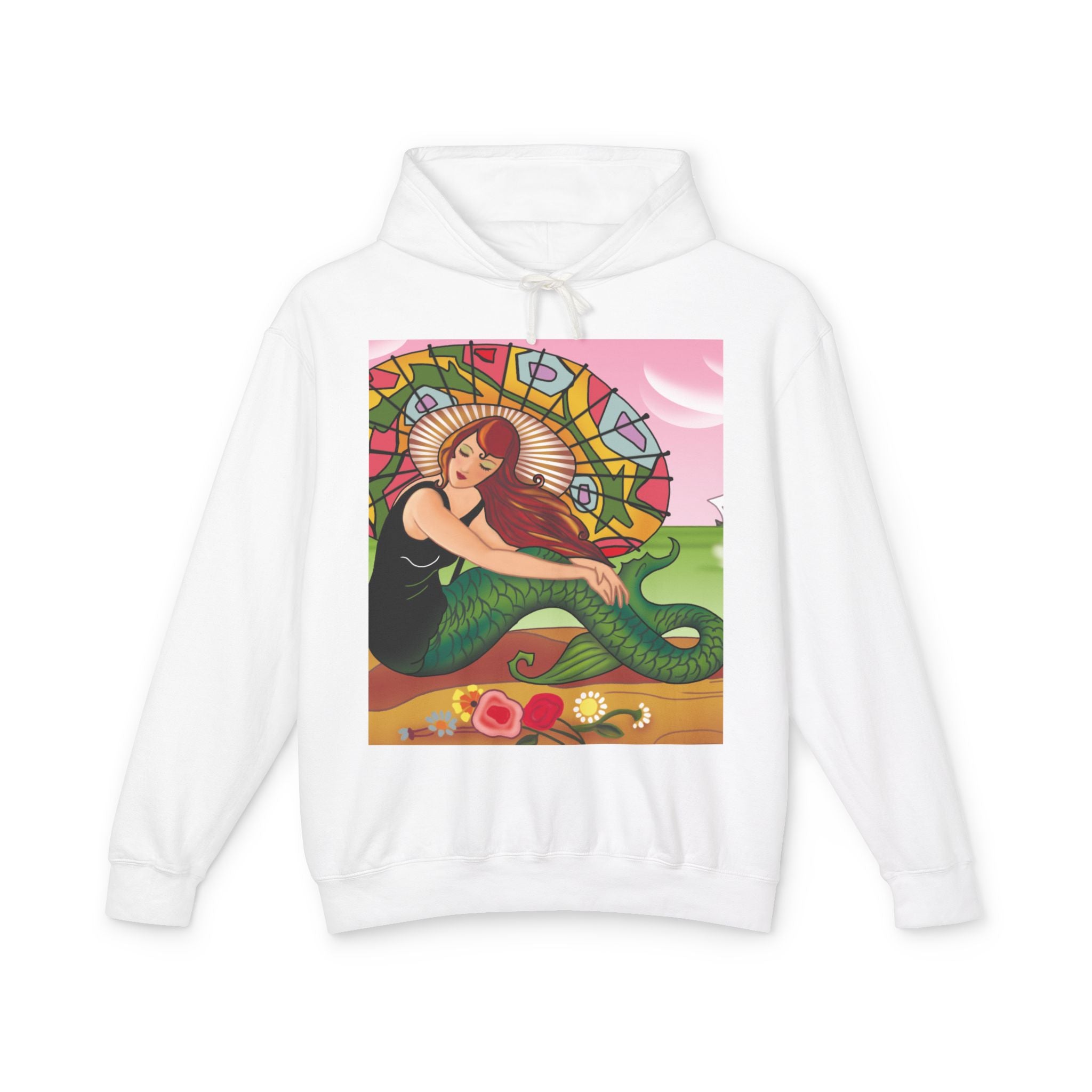 This captivating Carlo Chiostri Art Deco illustration features a beautiful mermaid with cascading fiery red hair, a vibrant green tail, and a colorful patterned parasol. Surrounded by delicate blossoms, she exudes elegance and charm, capturing the timeless allure of early 20th-century decorative art. The composition’s graceful lines and luminous palette transform the hoodie into a wearable celebration of vintage beauty and oceanic fantasy.