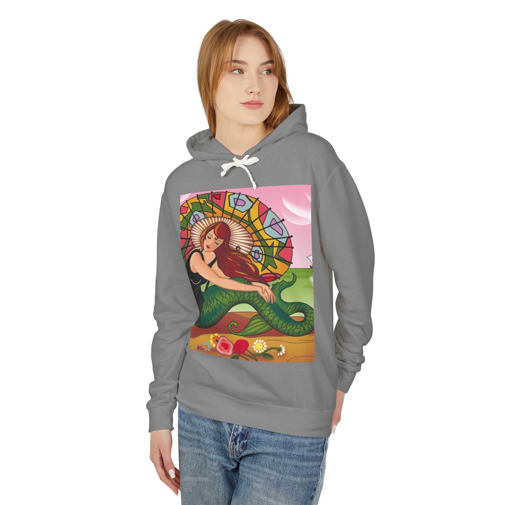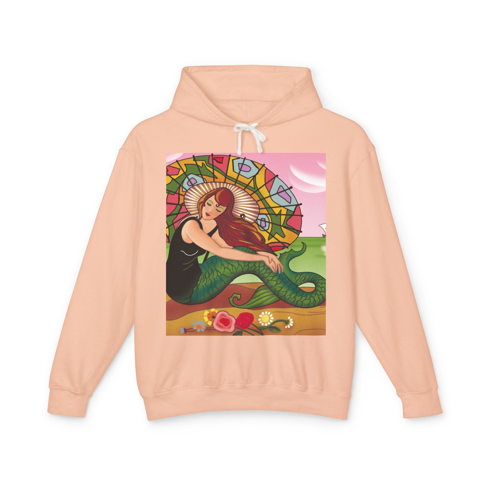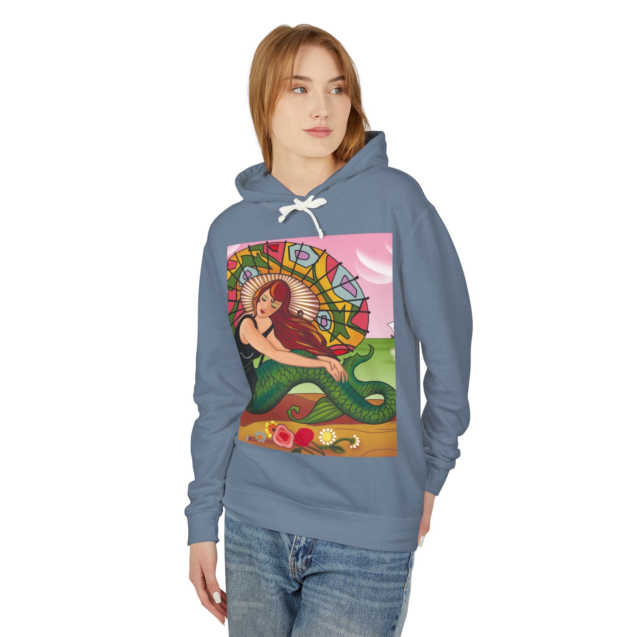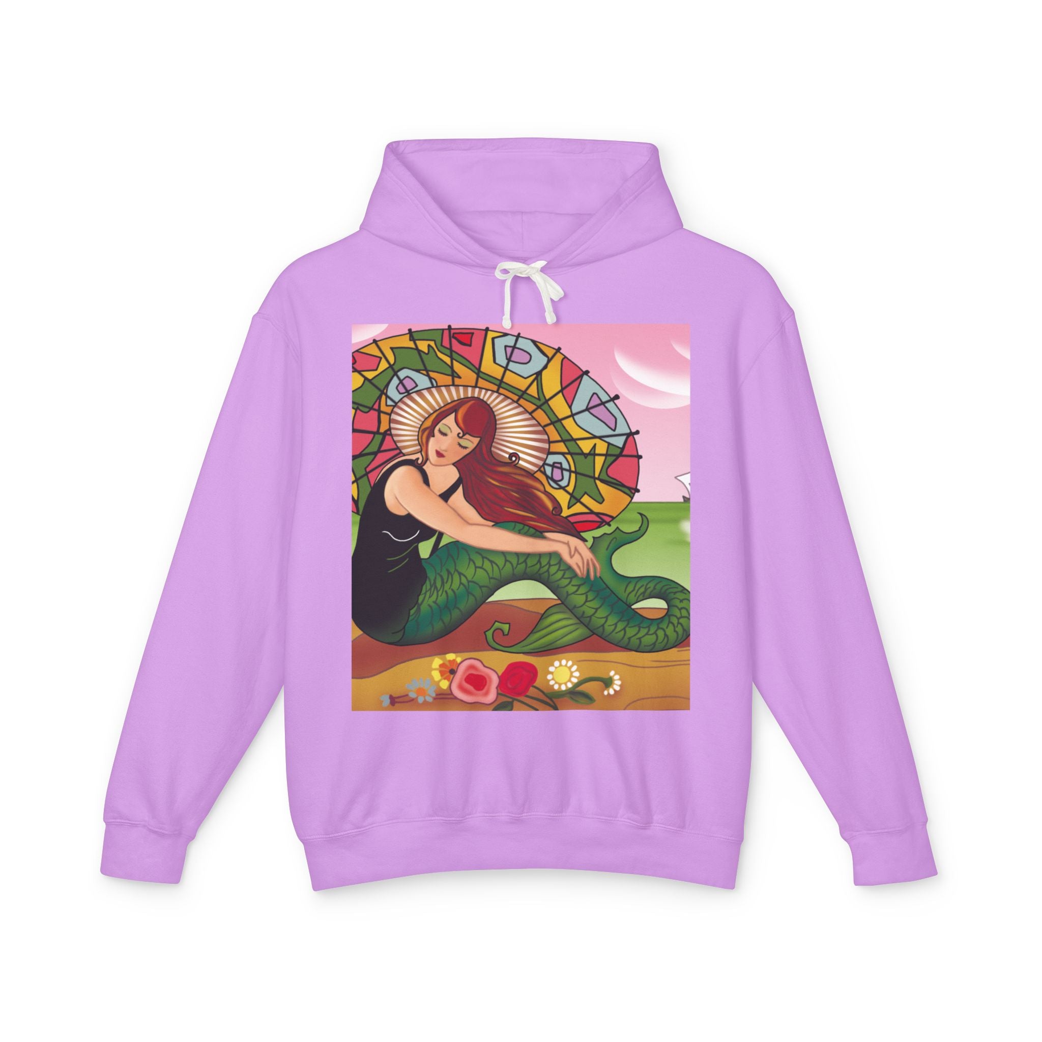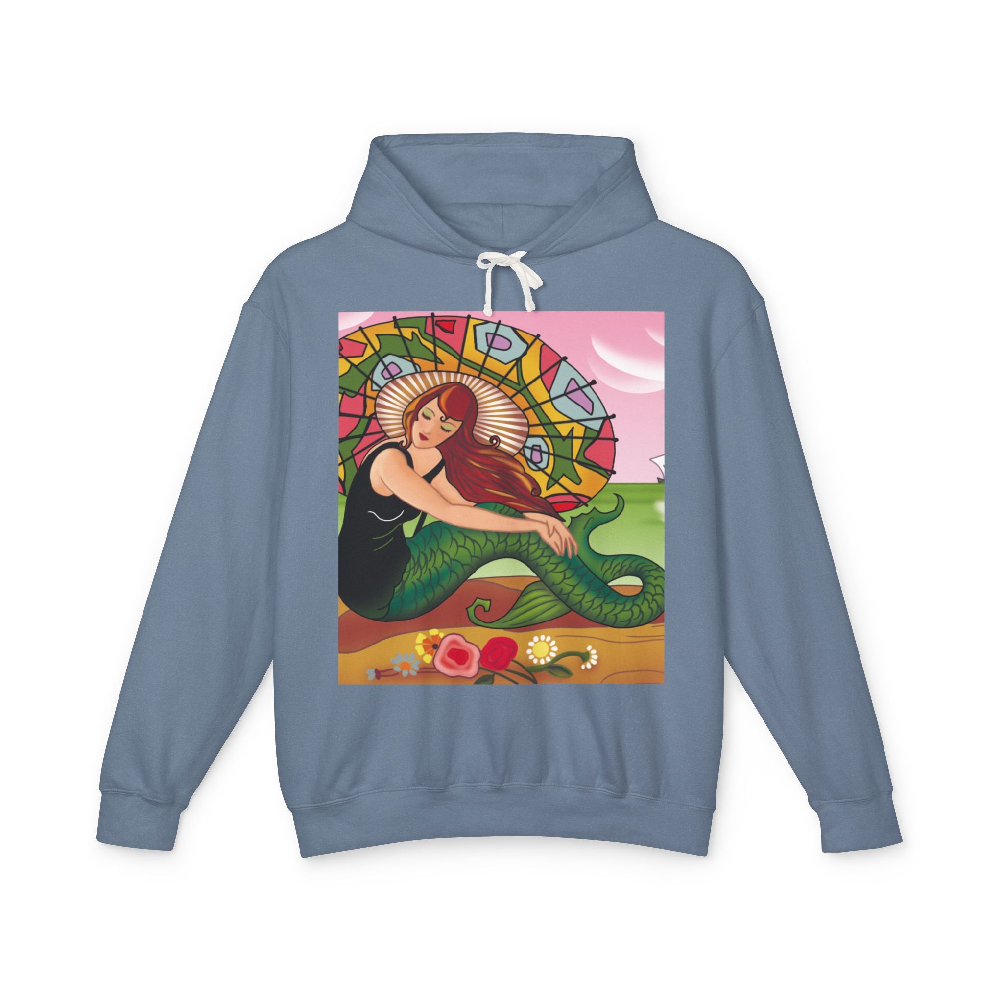 This captivating Carlo Chiostri Art Deco illustration features a beautiful mermaid with cascading fiery red hair, a vibrant green tail, and a colorful patterned parasol. Surrounded by delicate blossoms, she exudes elegance and charm, capturing the timeless allure of early 20th-century decorative art. The composition’s graceful lines and luminous palette transform the hoodie into a wearable celebration of vintage beauty and oceanic fantasy.