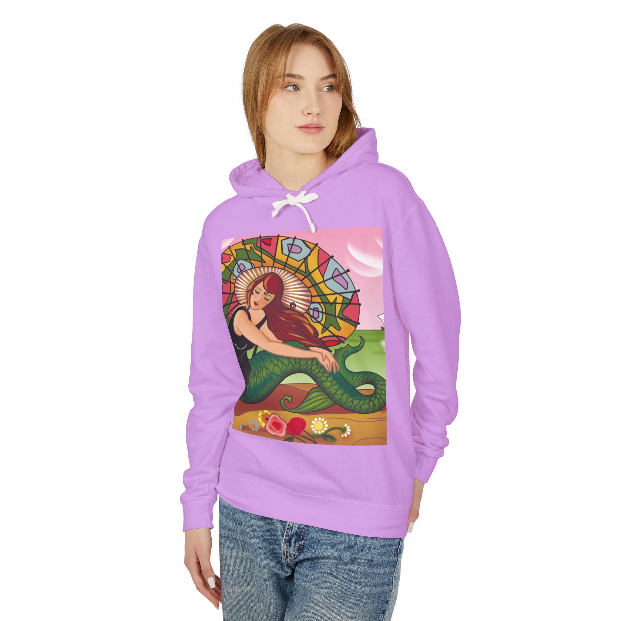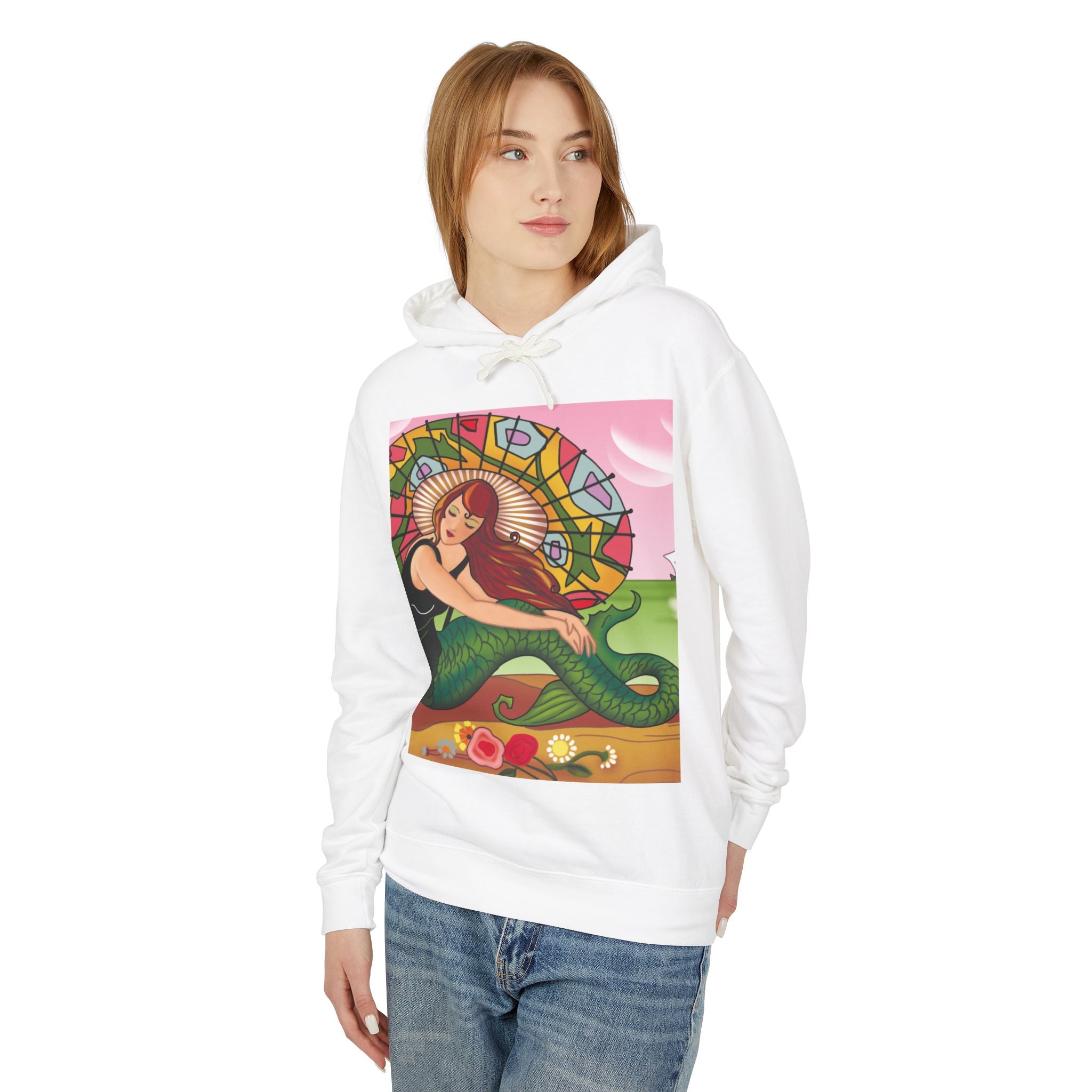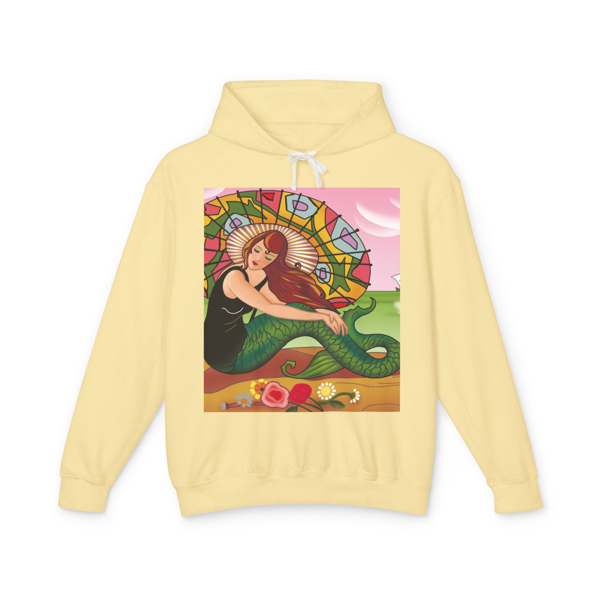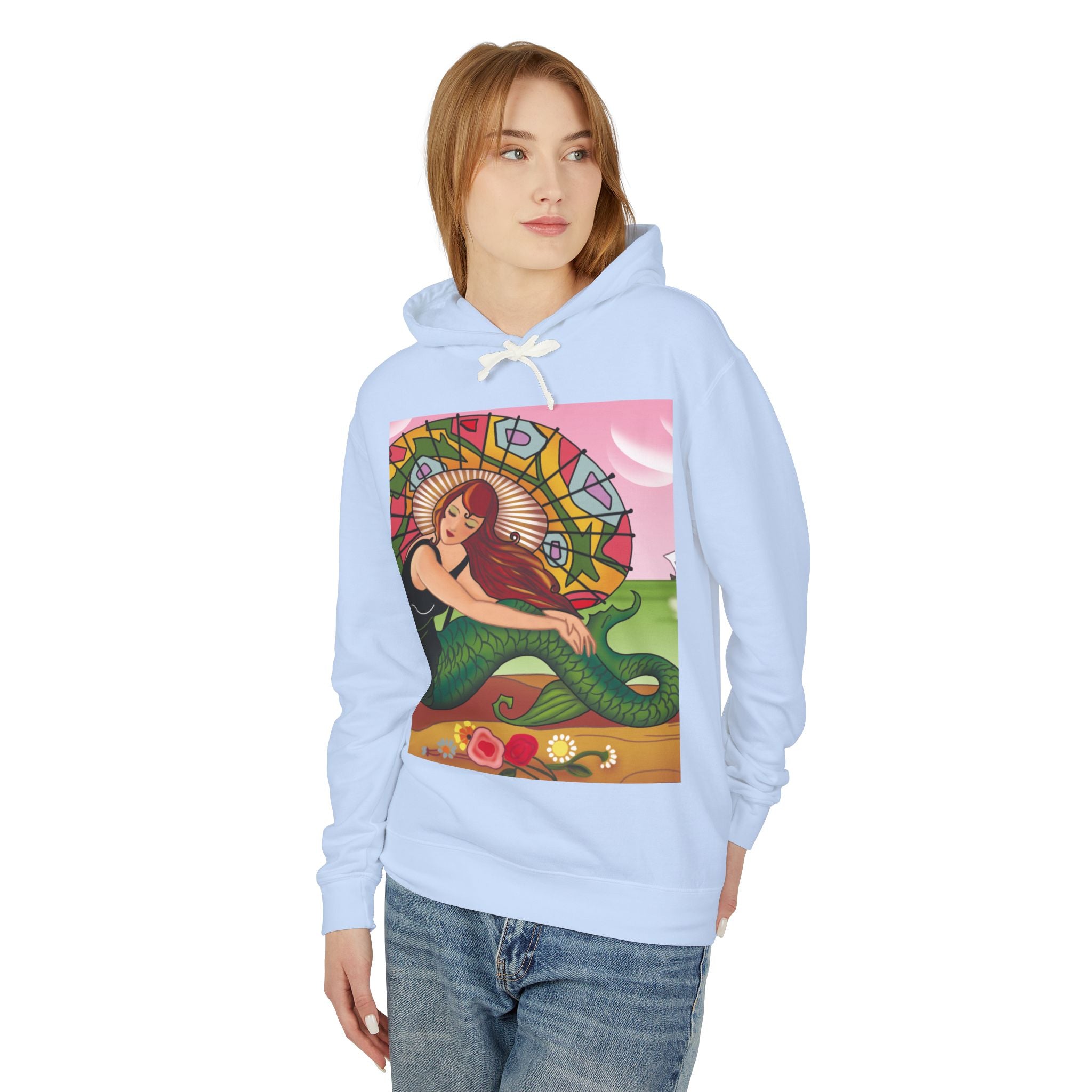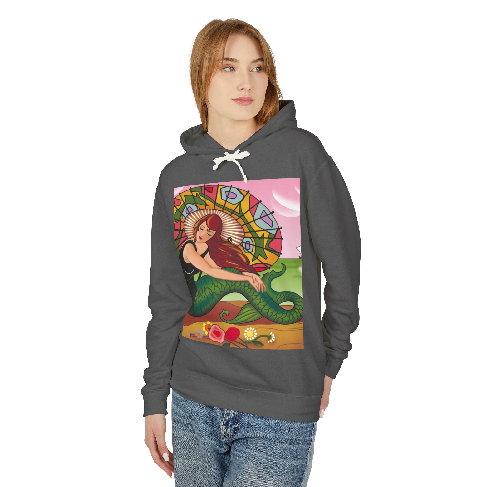 This captivating Carlo Chiostri Art Deco illustration features a beautiful mermaid with cascading fiery red hair, a vibrant green tail, and a colorful patterned parasol. Surrounded by delicate blossoms, she exudes elegance and charm, capturing the timeless allure of early 20th-century decorative art. The composition’s graceful lines and luminous palette transform the hoodie into a wearable celebration of vintage beauty and oceanic fantasy.