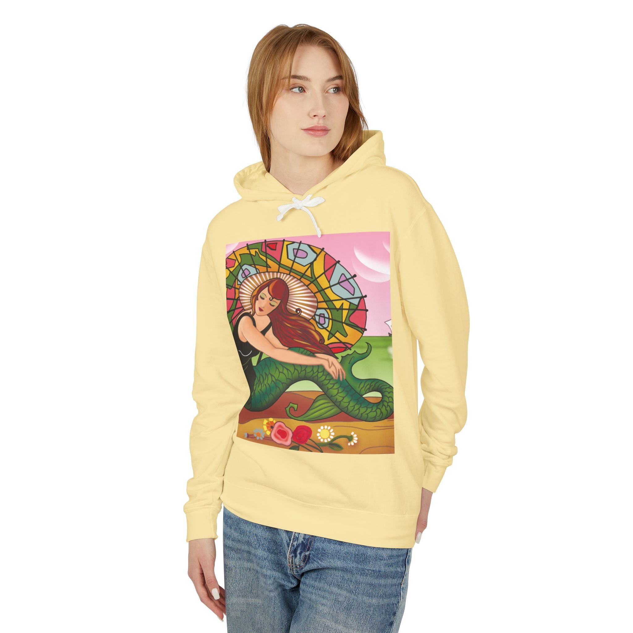 Siren Serenade Hoodie blends luxurious comfort with the enchanting nostalgia of vintage Art Deco illustration. Crafted from 100% ring-spun US cotton for exceptional softness and durability, this relaxed-fit sweatshirt features a jersey-lined hood with a natural colored flatcord (white flatcords for white and ivory variants), rolled forward shoulders for added comfort, and a smooth, modern silhouette. As part of the U.S. Cotton Trust Protocol, it is made using OEKO-TEX certified low-impact dyes and clean pigment dye colors that are salt-free, ensuring an environmentally responsible garment that maintains rich, lasting color.