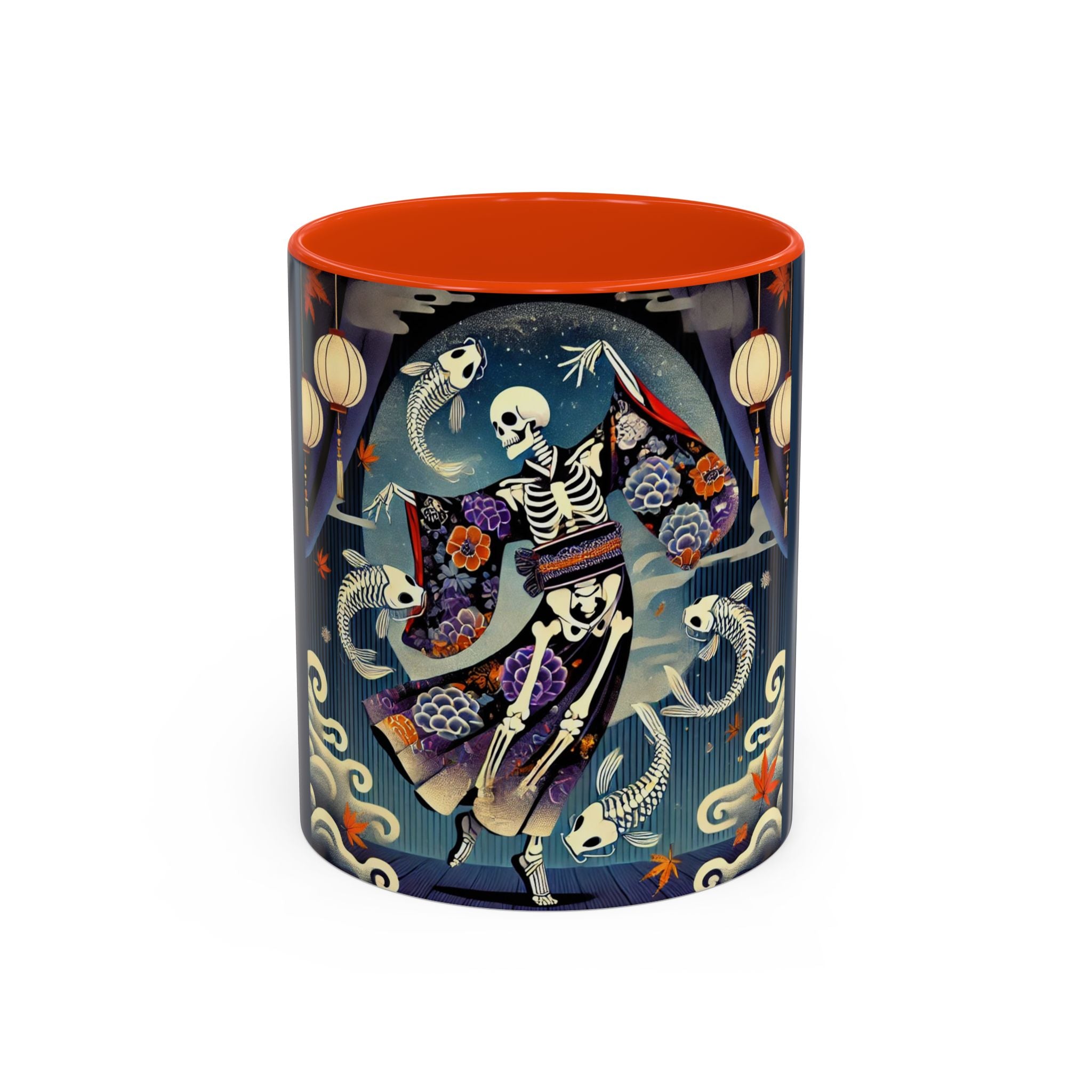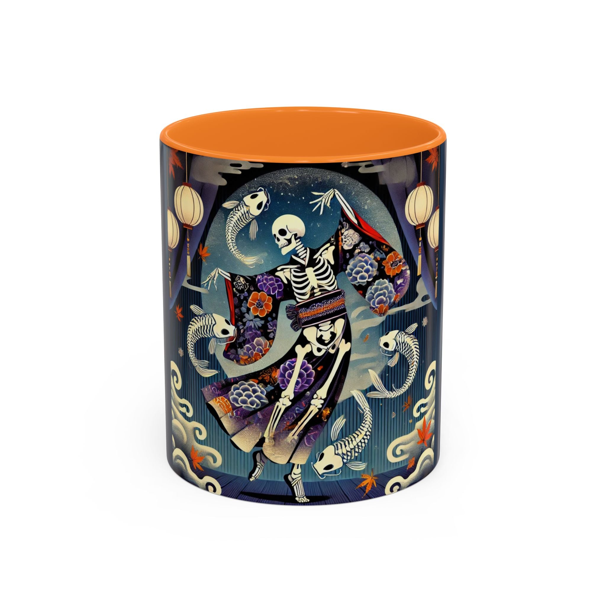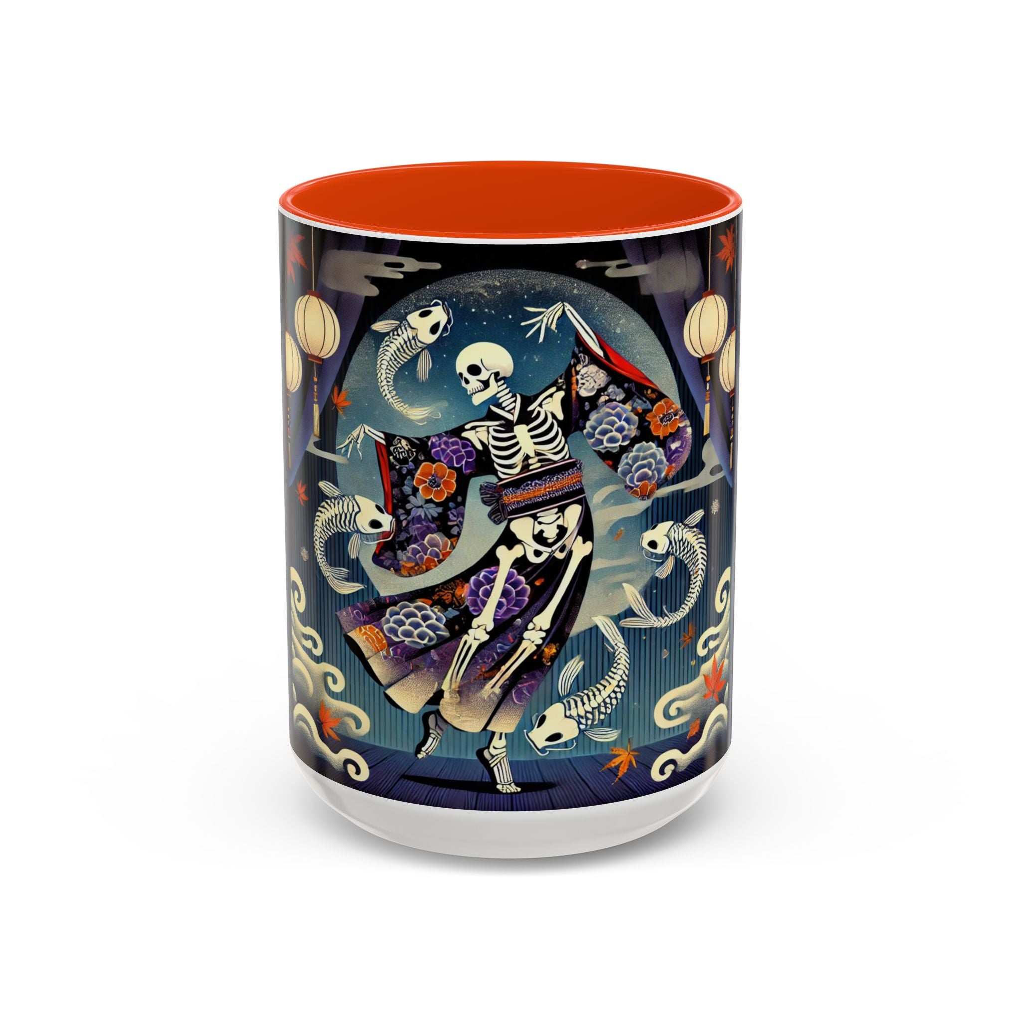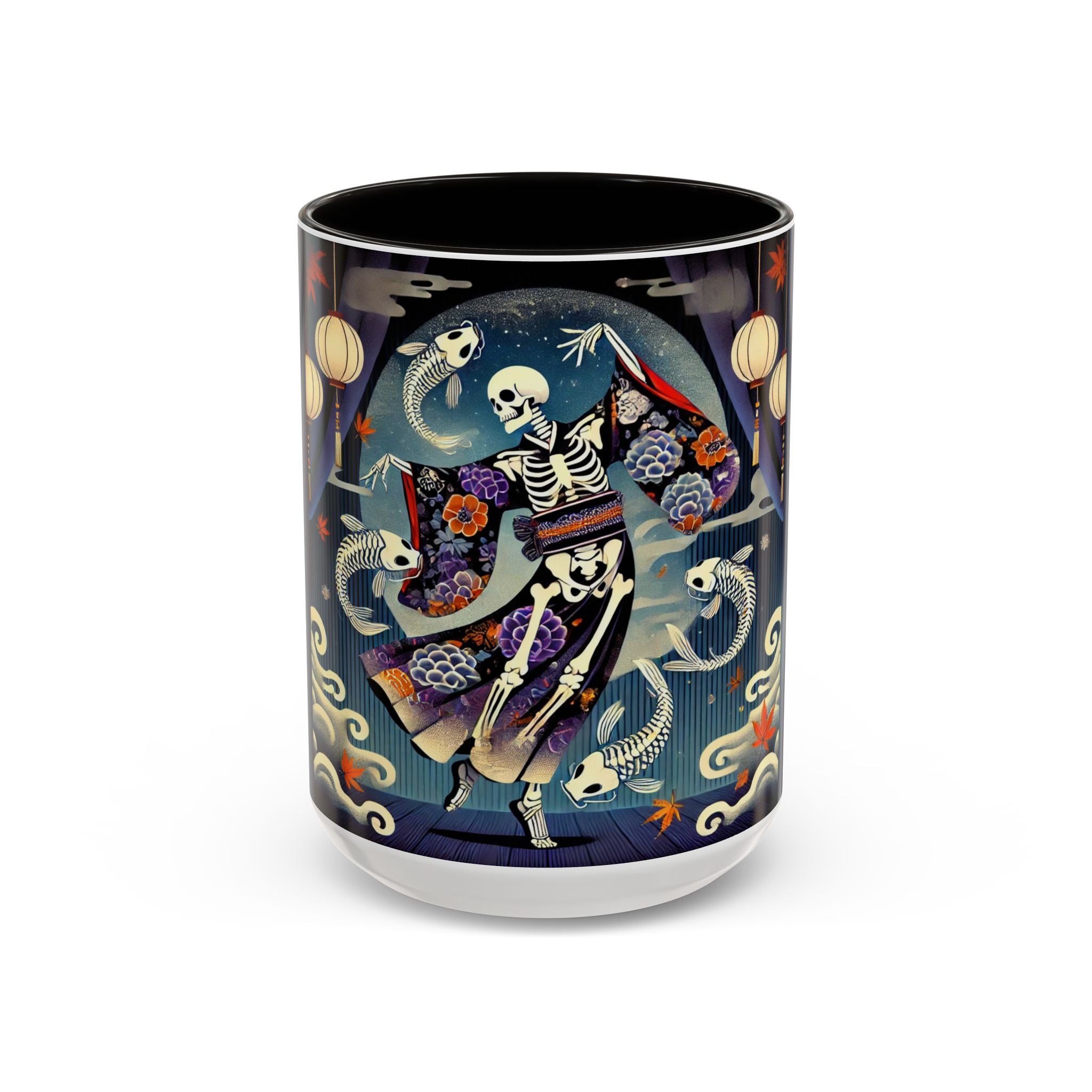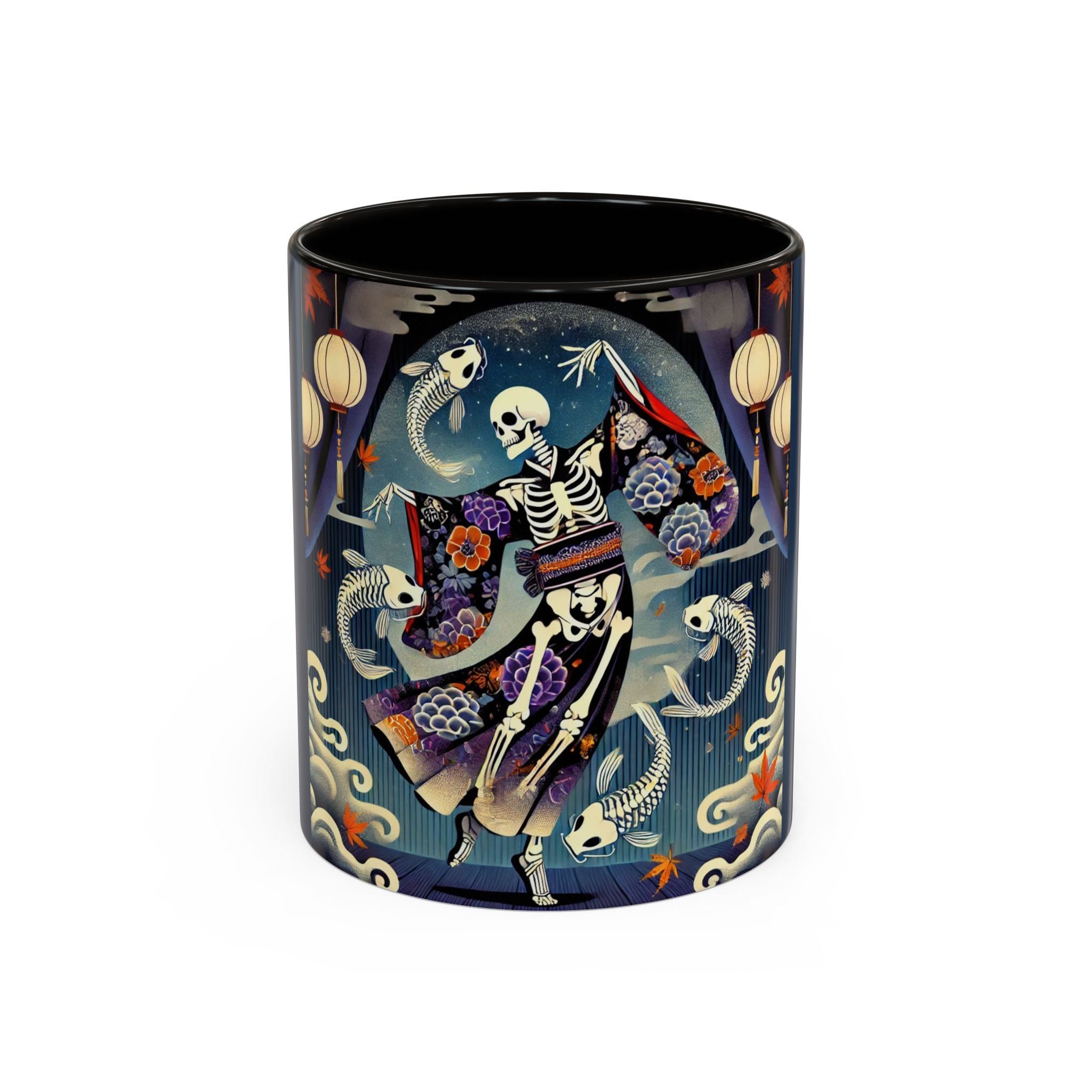 Bring a touch of theatrical Halloween flair to your daily routine with the Skeleton Kabuki Performer Mug. Available in 11oz or 15oz sizes and 12 color options, each mug features a glossy finish, colored handle, and interior that perfectly frames the artwork. The design showcases a Kabuki-inspired skeleton dancer mid-motion, draped in a dramatic skeleton-patterned kimono. Blending the elegance of Japanese theater with spooky seasonal charm, this mug is as durable as it is enchanting—ideal for coffee, tea, or festive gatherings.