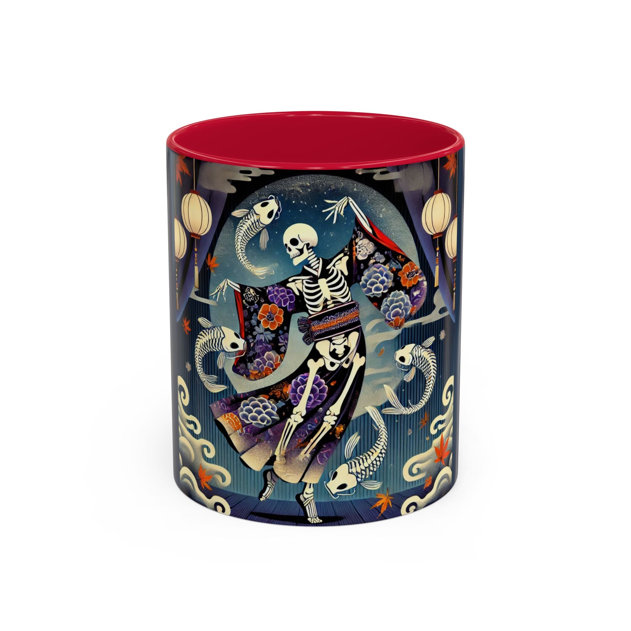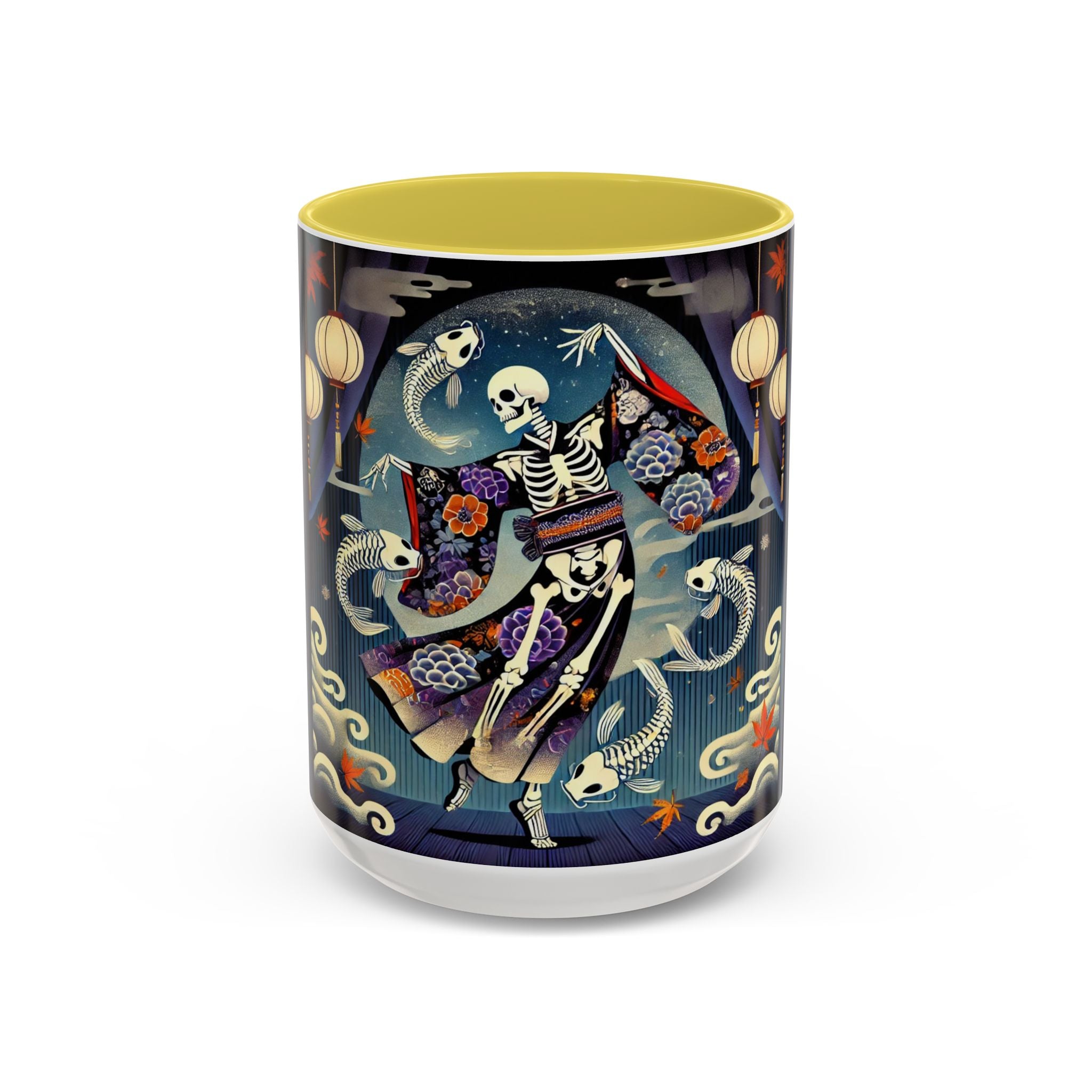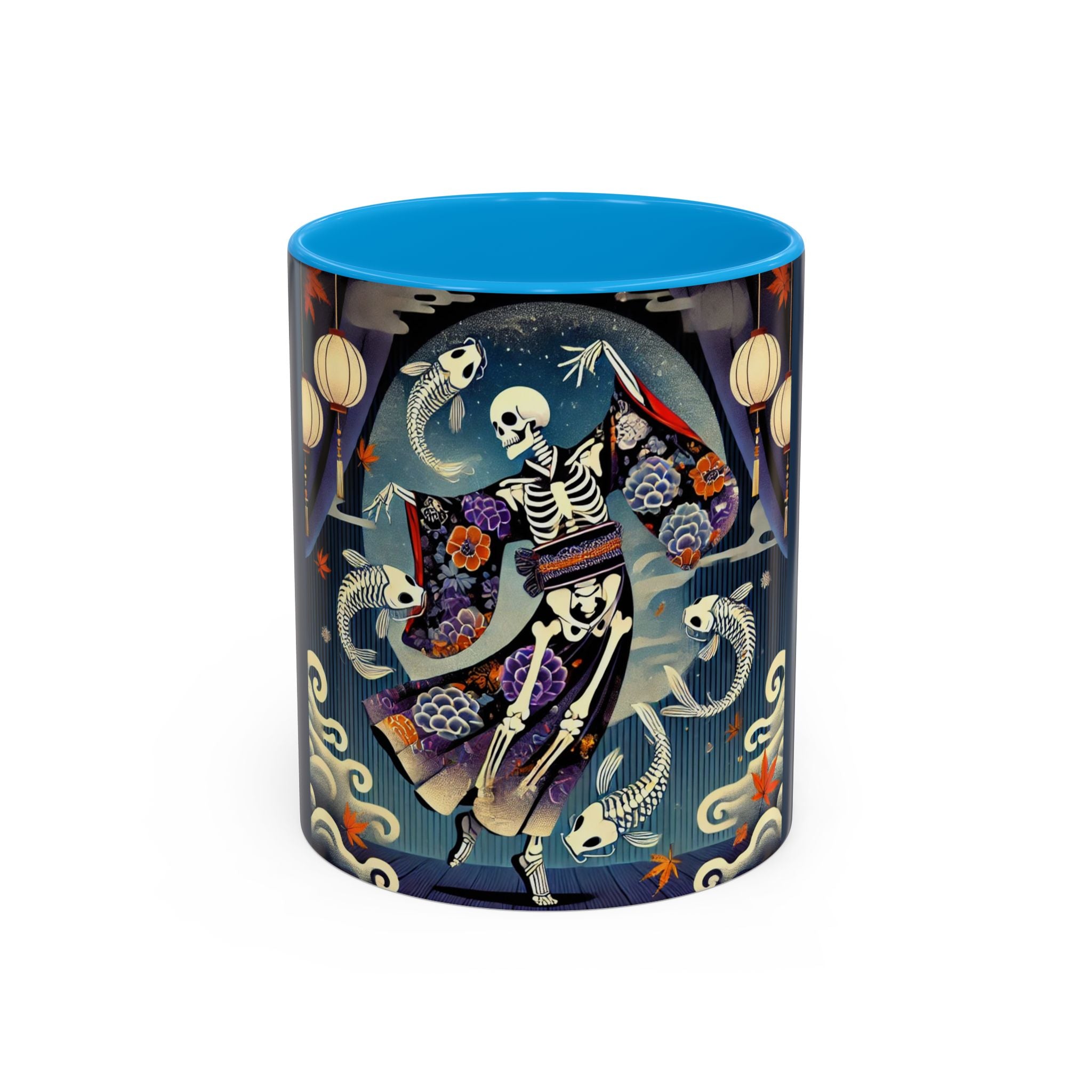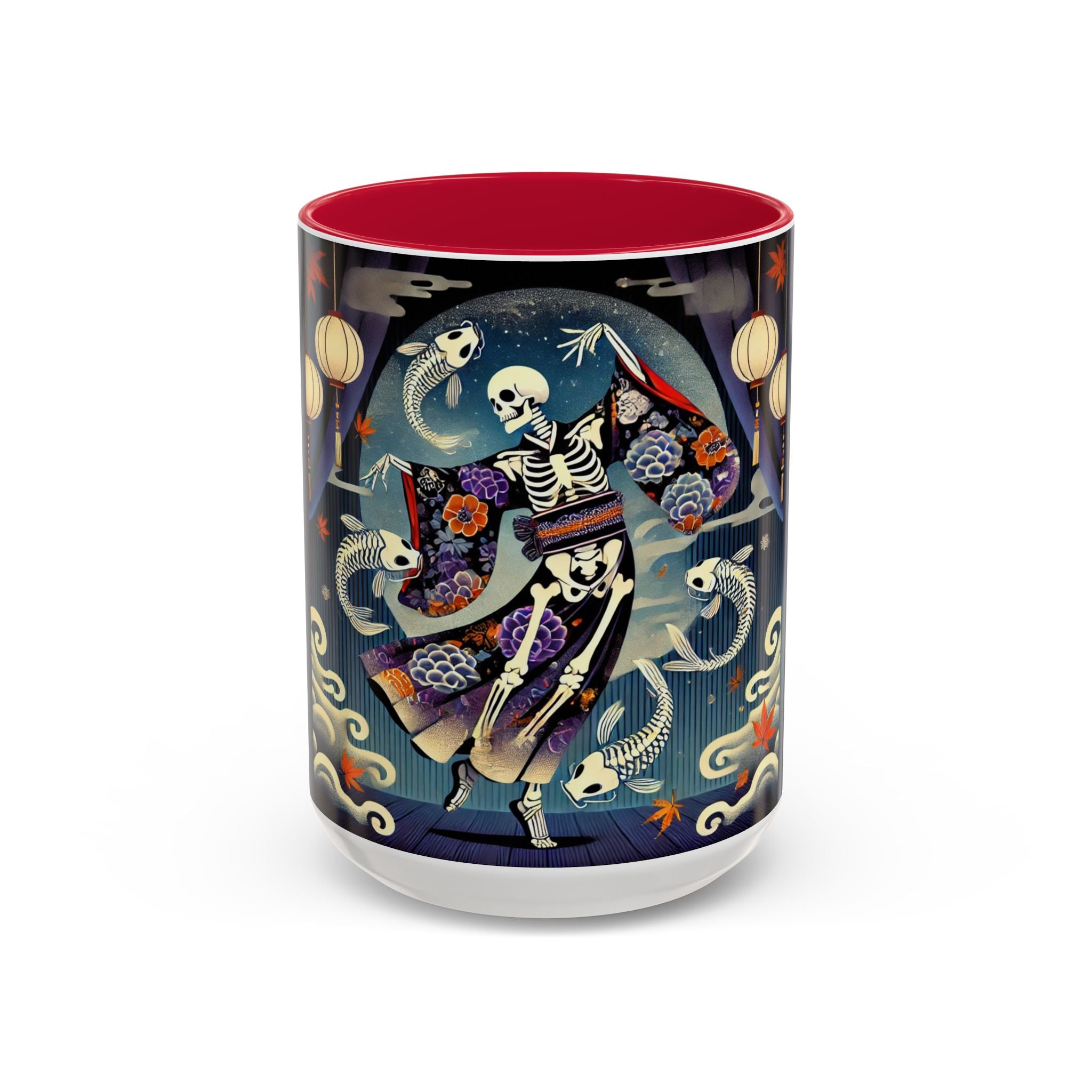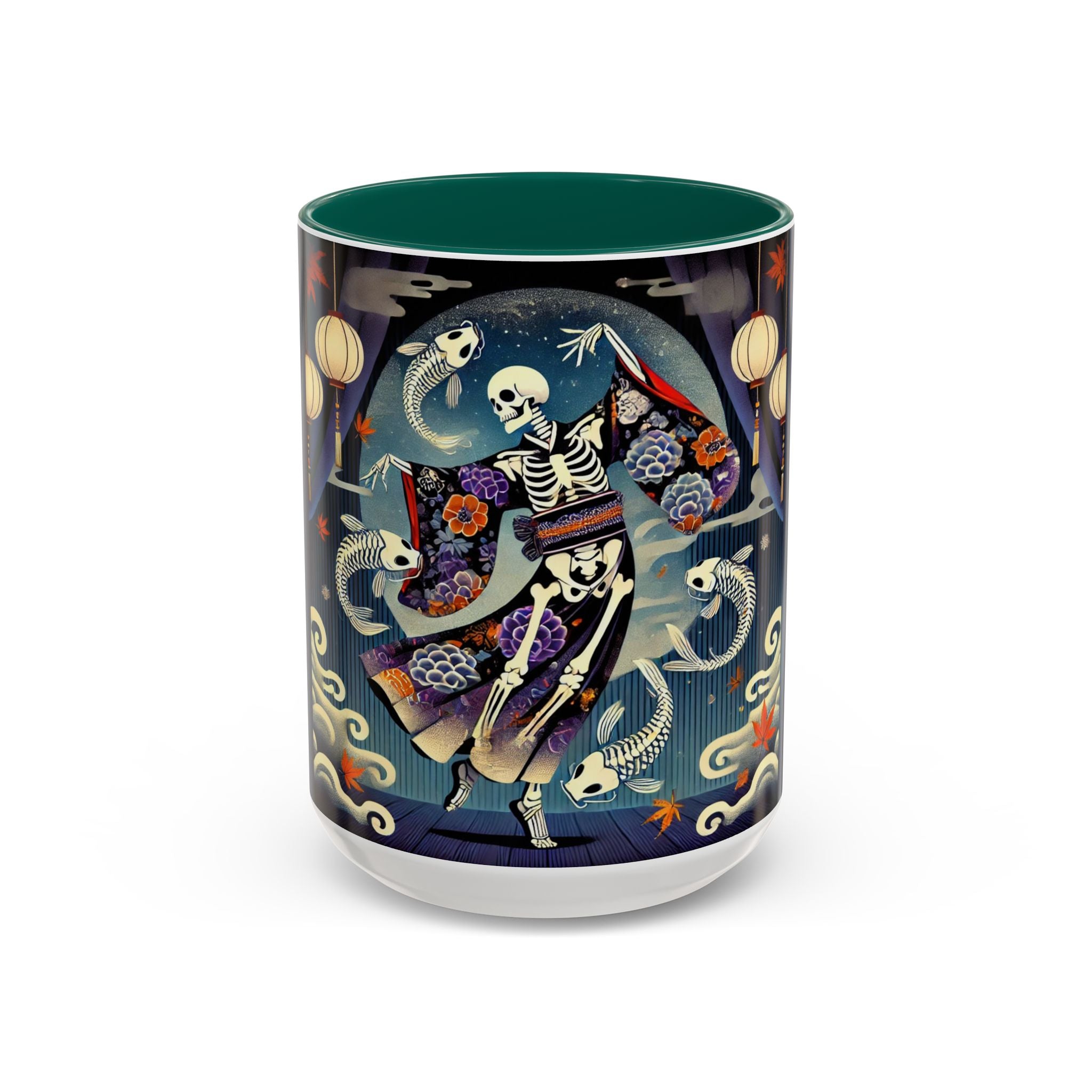 Bring a touch of theatrical Halloween flair to your daily routine with the Skeleton Kabuki Performer Mug. Available in 11oz or 15oz sizes and 12 color options, each mug features a glossy finish, colored handle, and interior that perfectly frames the artwork. The design showcases a Kabuki-inspired skeleton dancer mid-motion, draped in a dramatic skeleton-patterned kimono. Blending the elegance of Japanese theater with spooky seasonal charm, this mug is as durable as it is enchanting—ideal for coffee, tea, or festive gatherings.