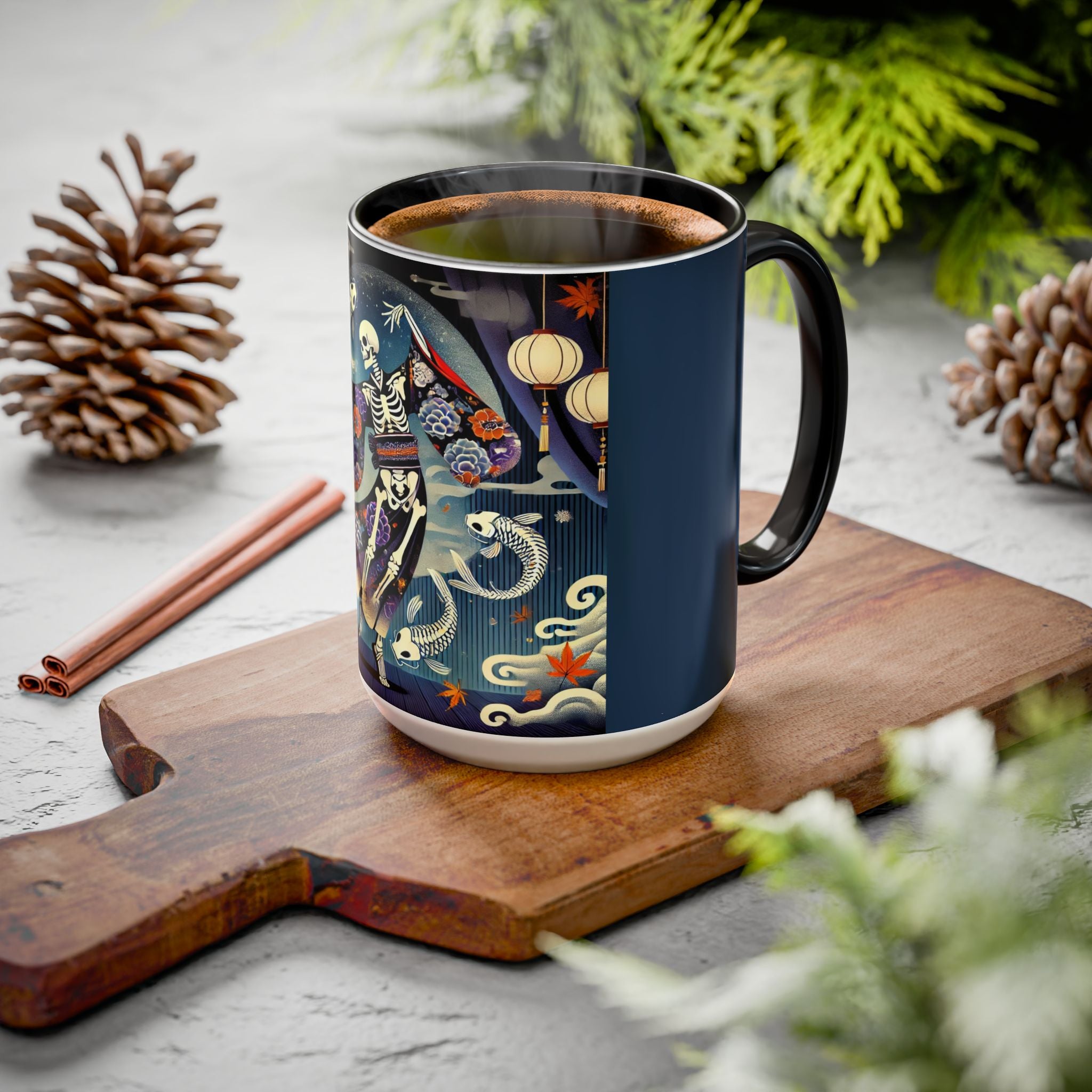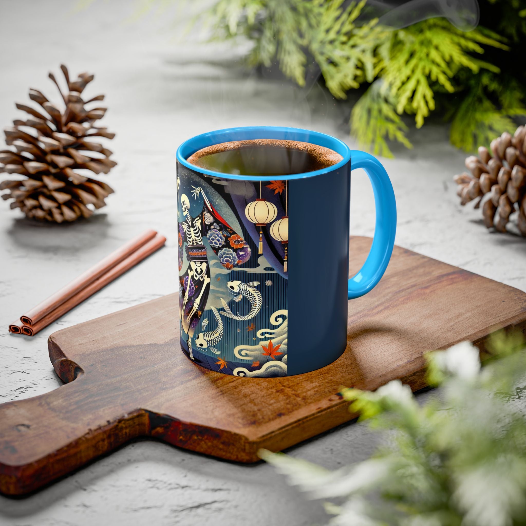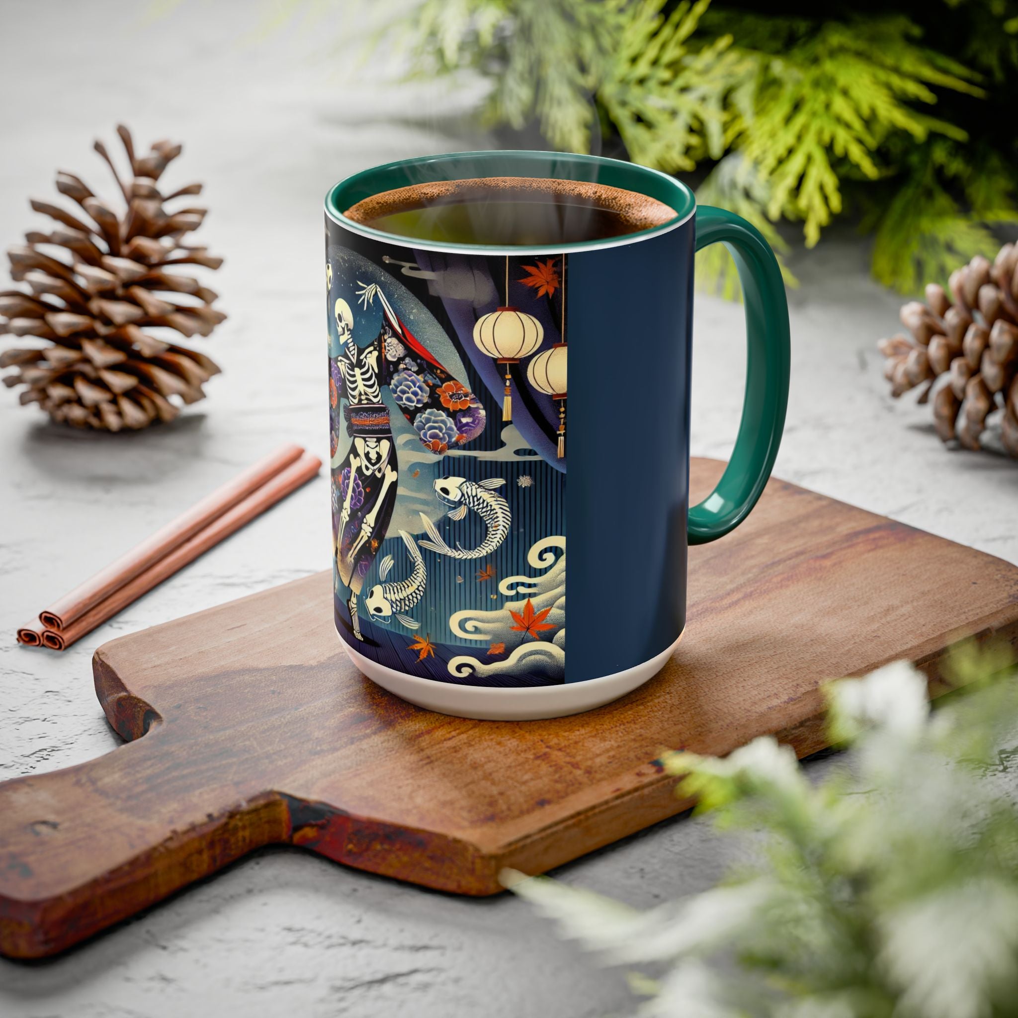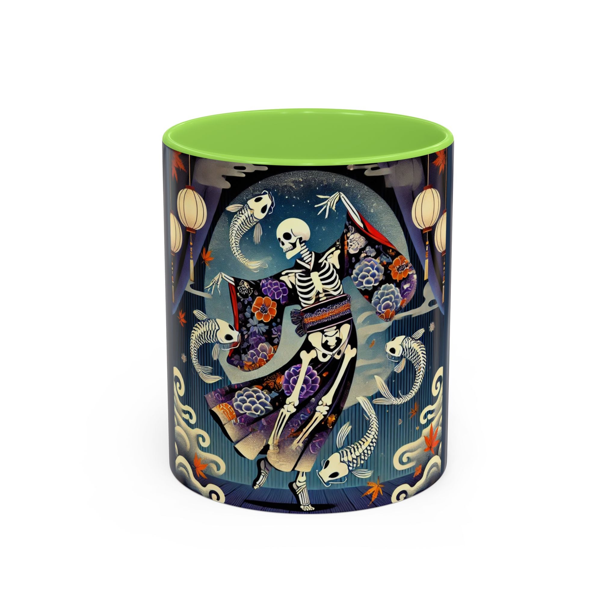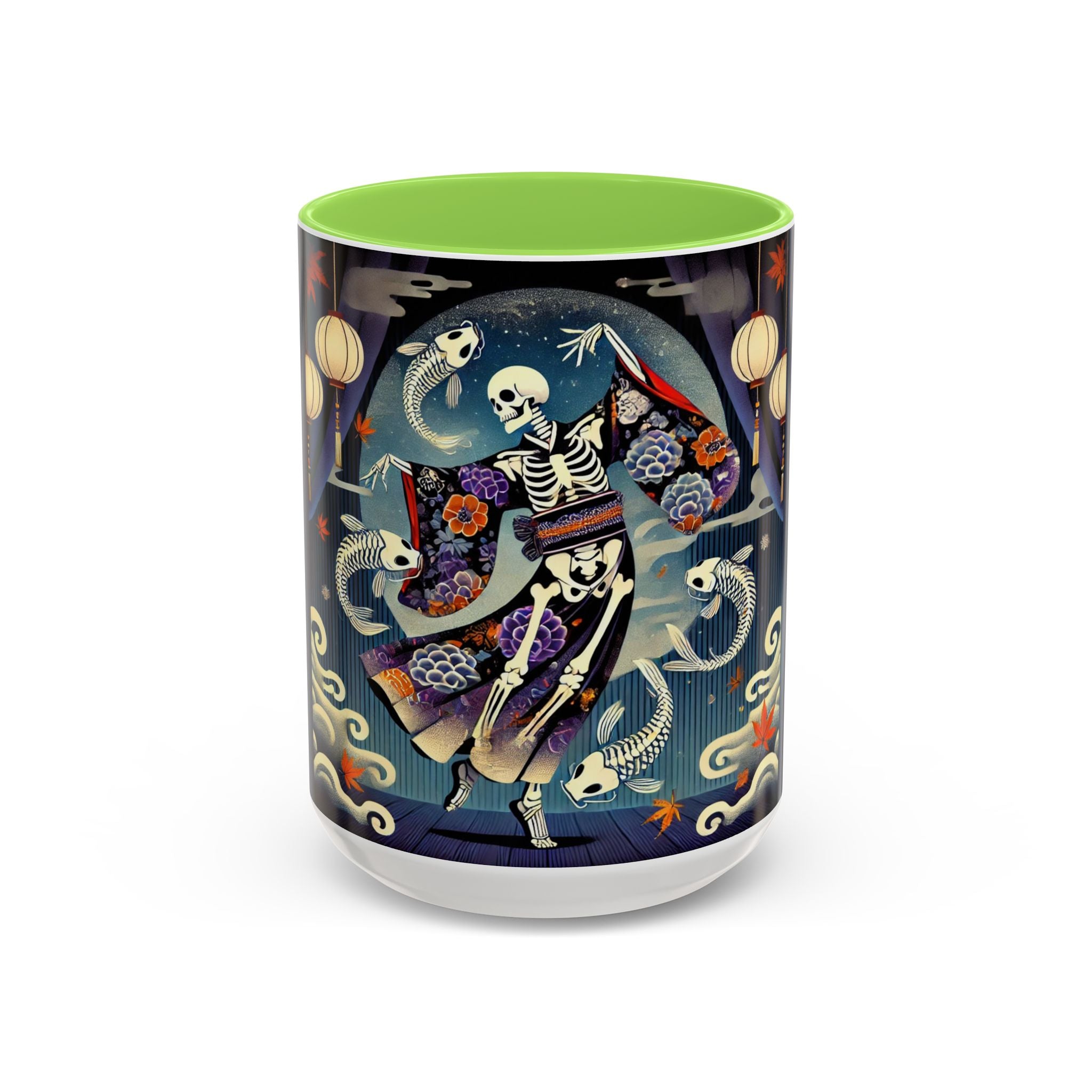 Bring a touch of theatrical Halloween flair to your daily routine with the Skeleton Kabuki Performer Mug. Available in 11oz or 15oz sizes and 12 color options, each mug features a glossy finish, colored handle, and interior that perfectly frames the artwork. The design showcases a Kabuki-inspired skeleton dancer mid-motion, draped in a dramatic skeleton-patterned kimono. Blending the elegance of Japanese theater with spooky seasonal charm, this mug is as durable as it is enchanting—ideal for coffee, tea, or festive gatherings.