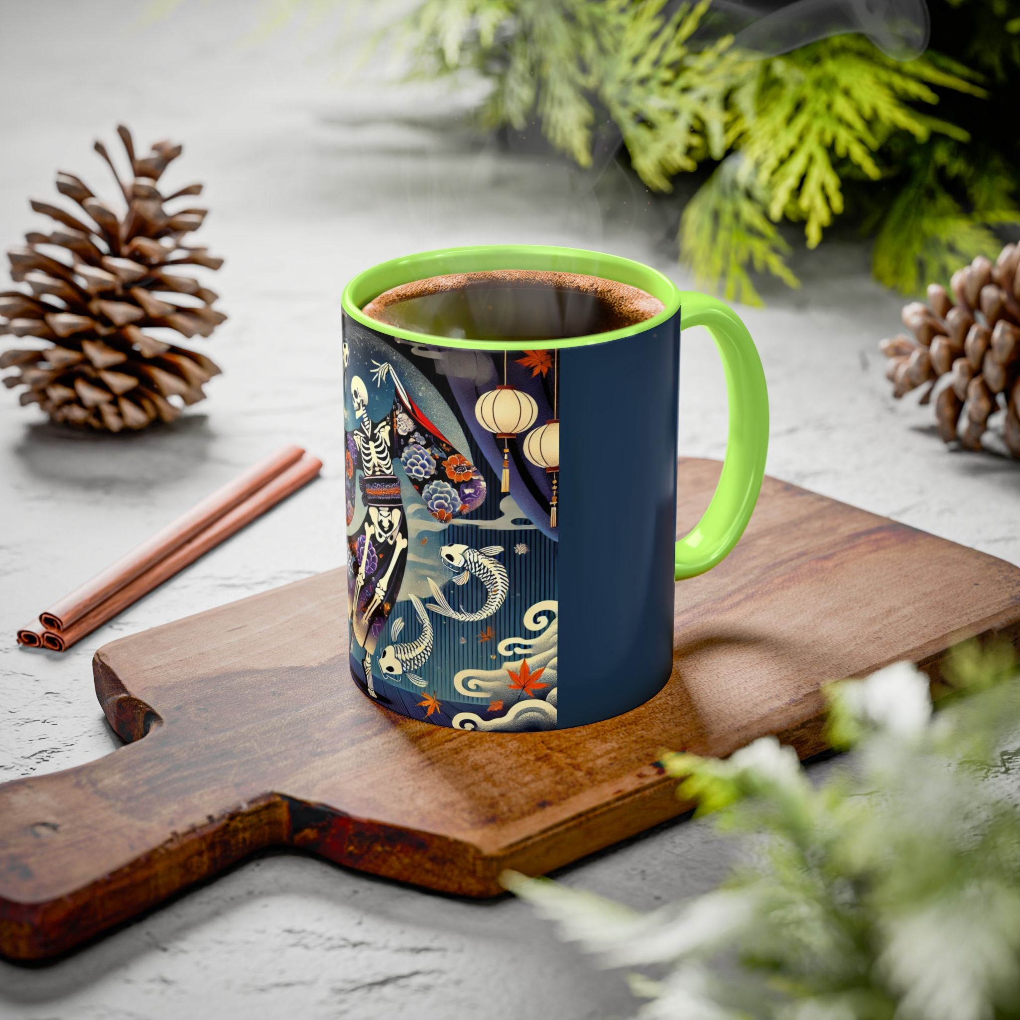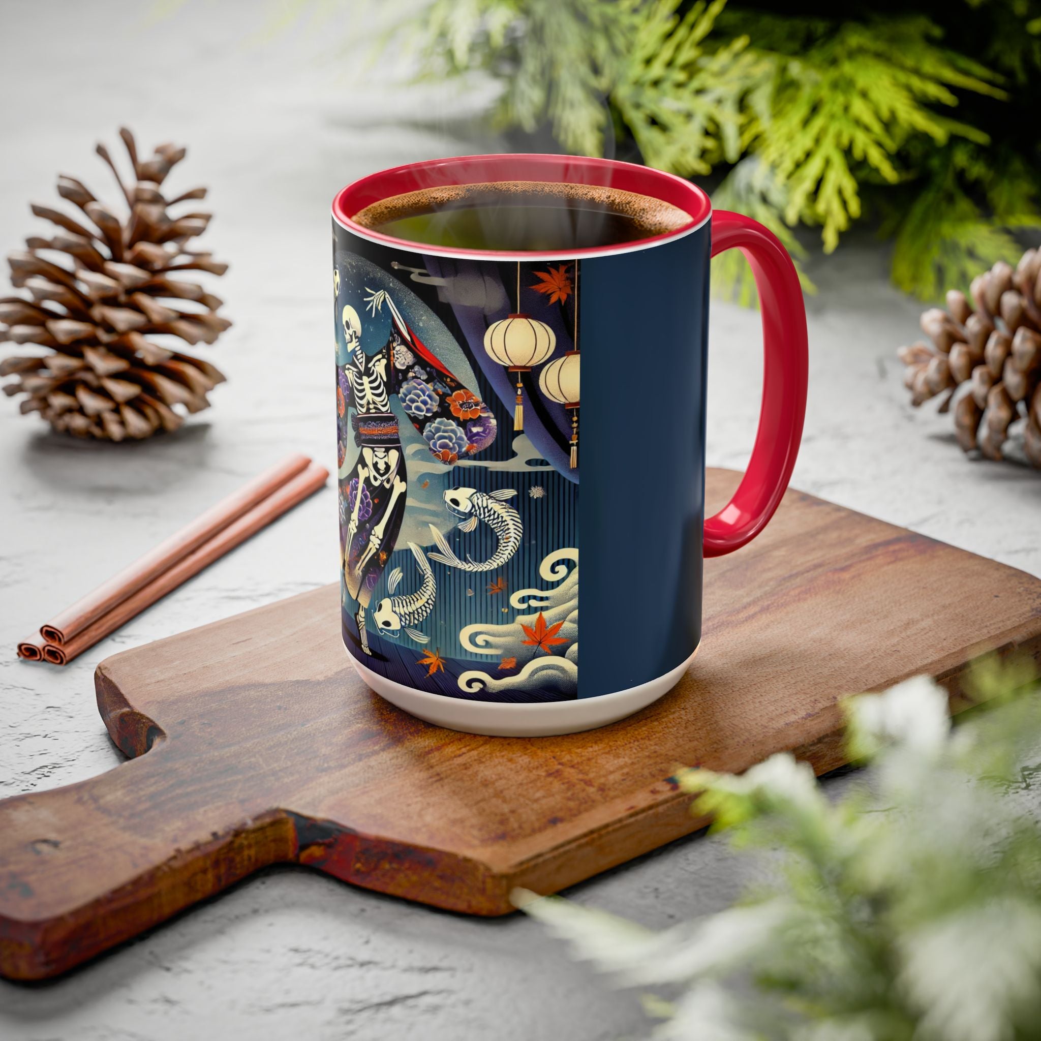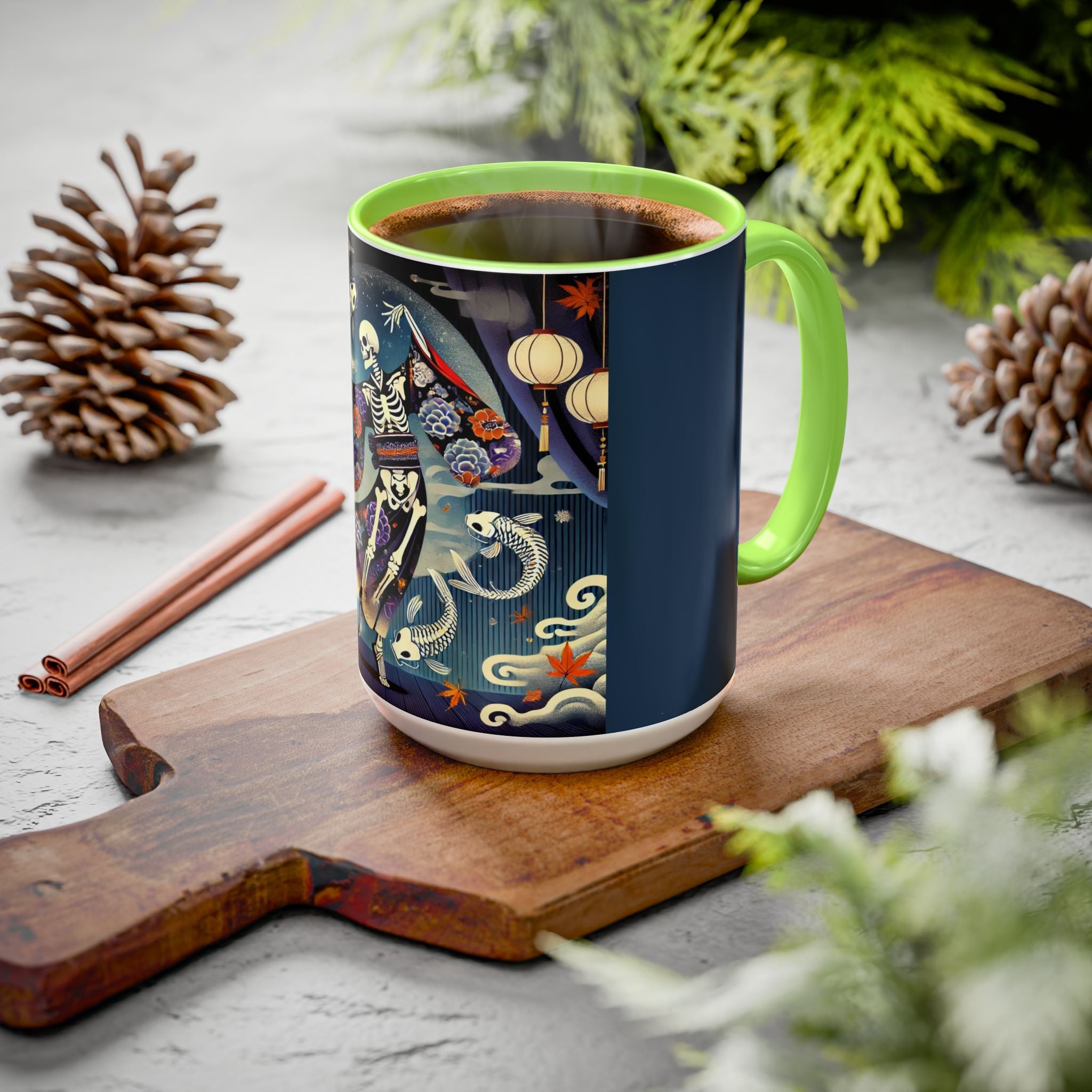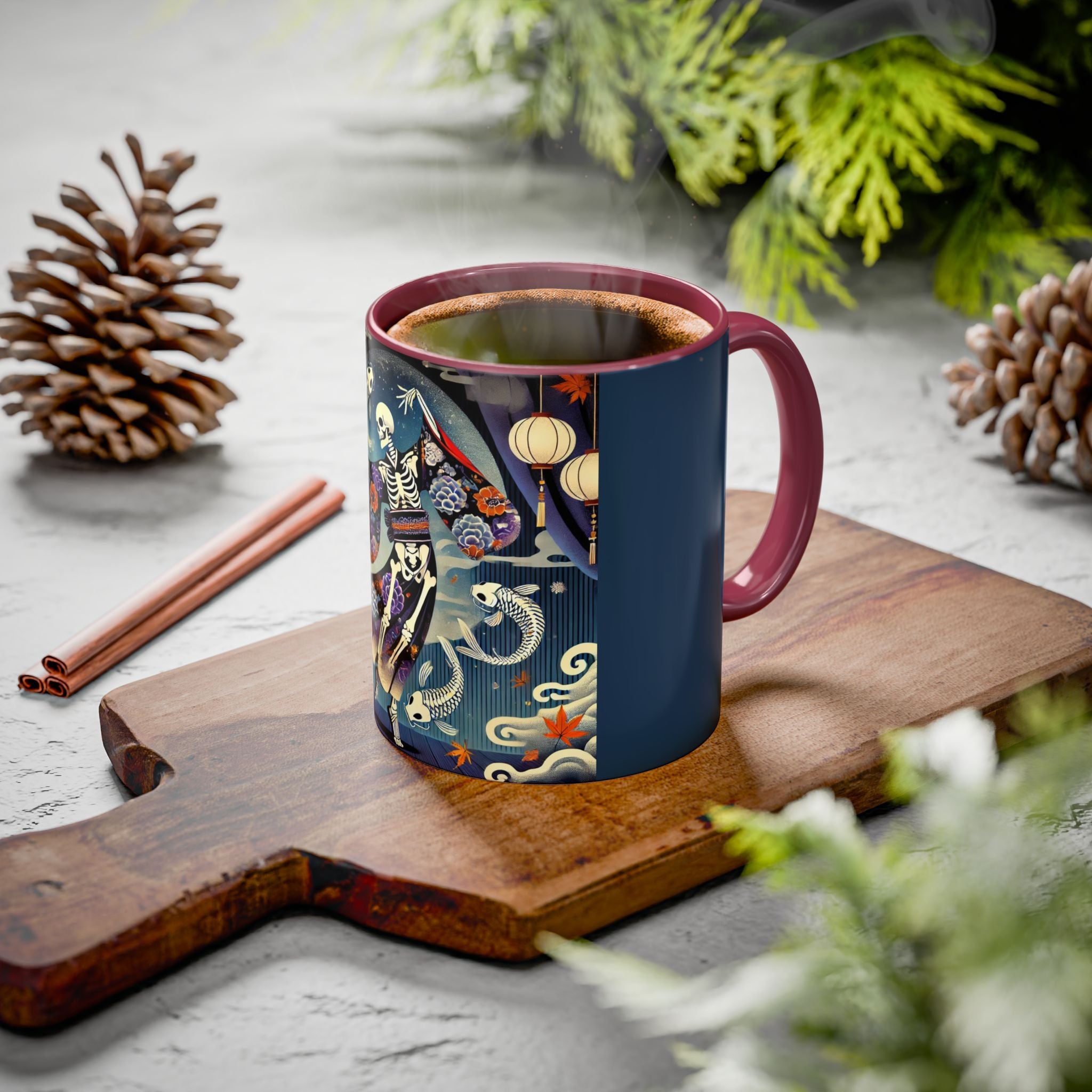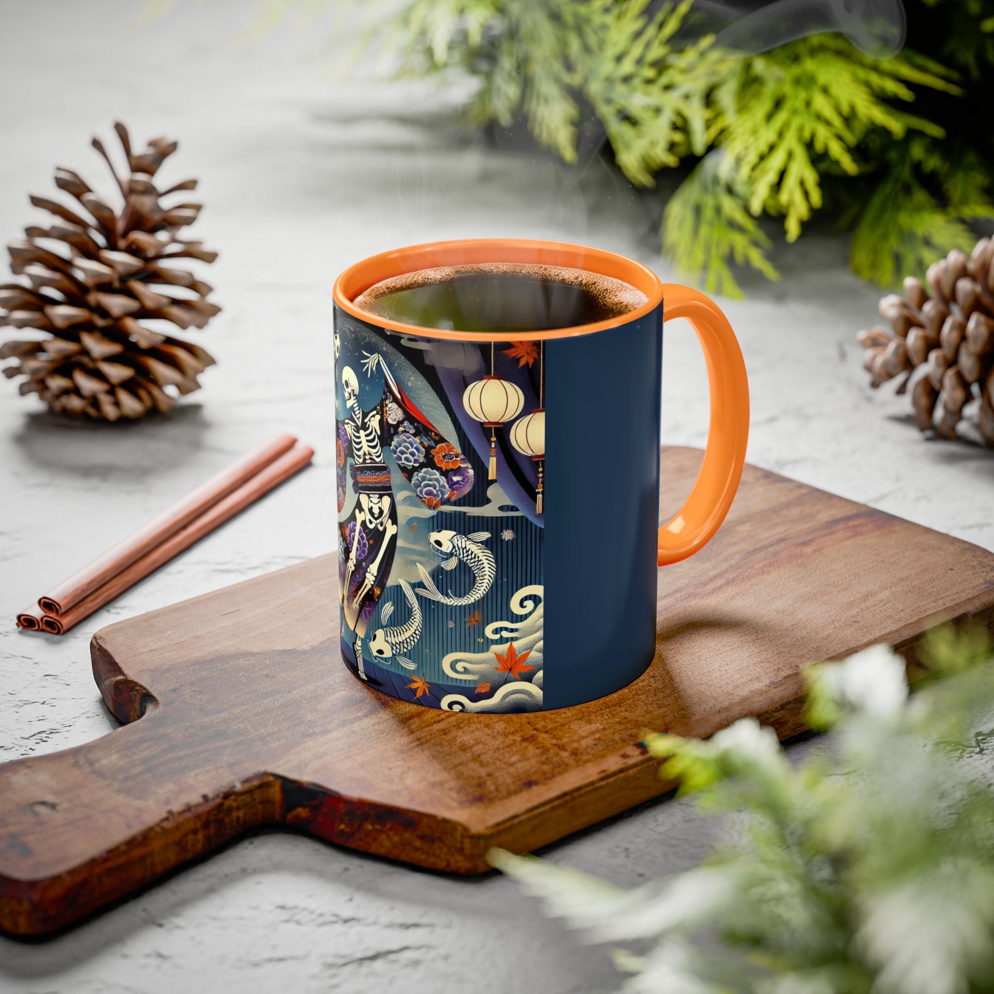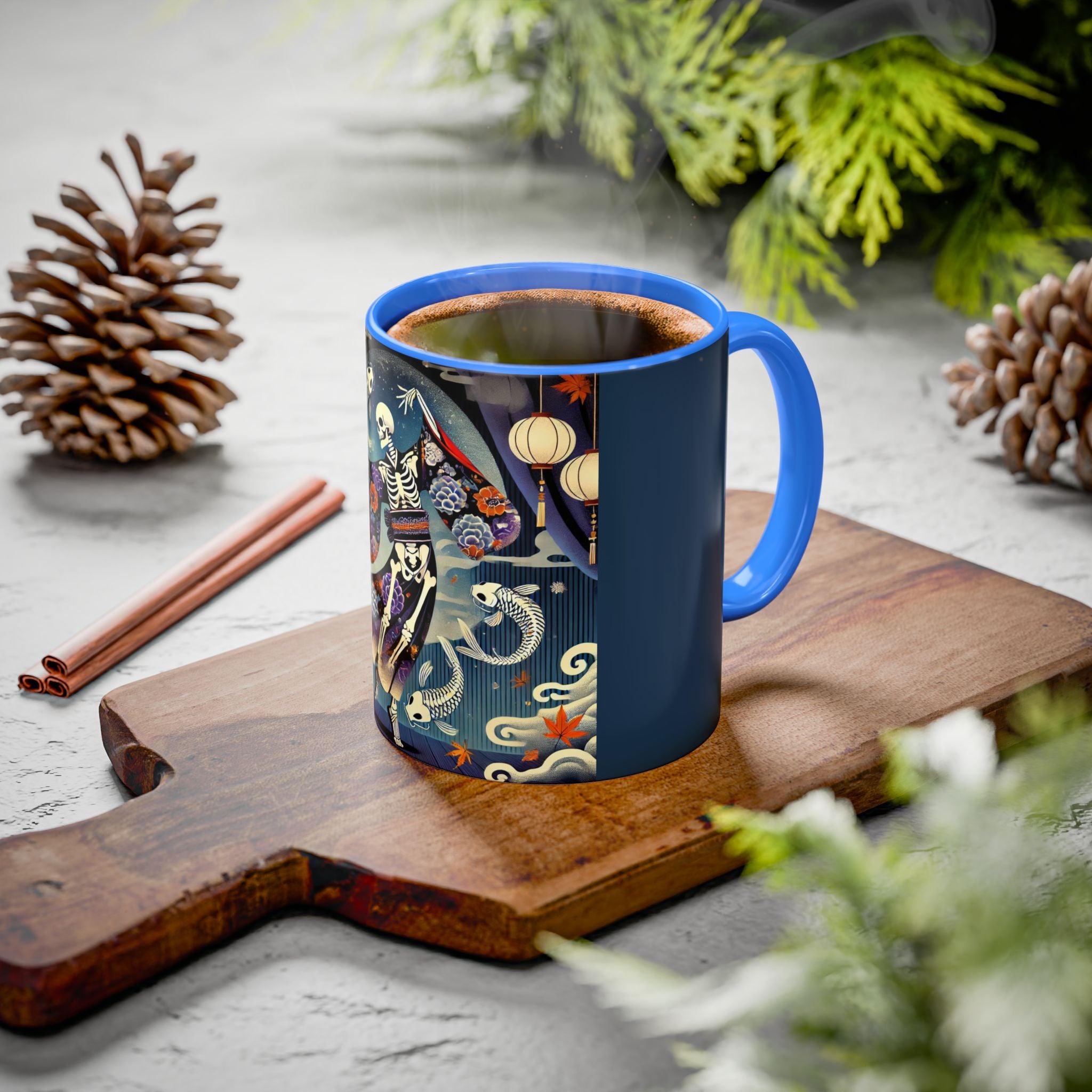 Bring a touch of theatrical Halloween flair to your daily routine with the Skeleton Kabuki Performer Mug. Available in 11oz or 15oz sizes and 12 color options, each mug features a glossy finish, colored handle, and interior that perfectly frames the artwork. The design showcases a Kabuki-inspired skeleton dancer mid-motion, draped in a dramatic skeleton-patterned kimono. Blending the elegance of Japanese theater with spooky seasonal charm, this mug is as durable as it is enchanting—ideal for coffee, tea, or festive gatherings.