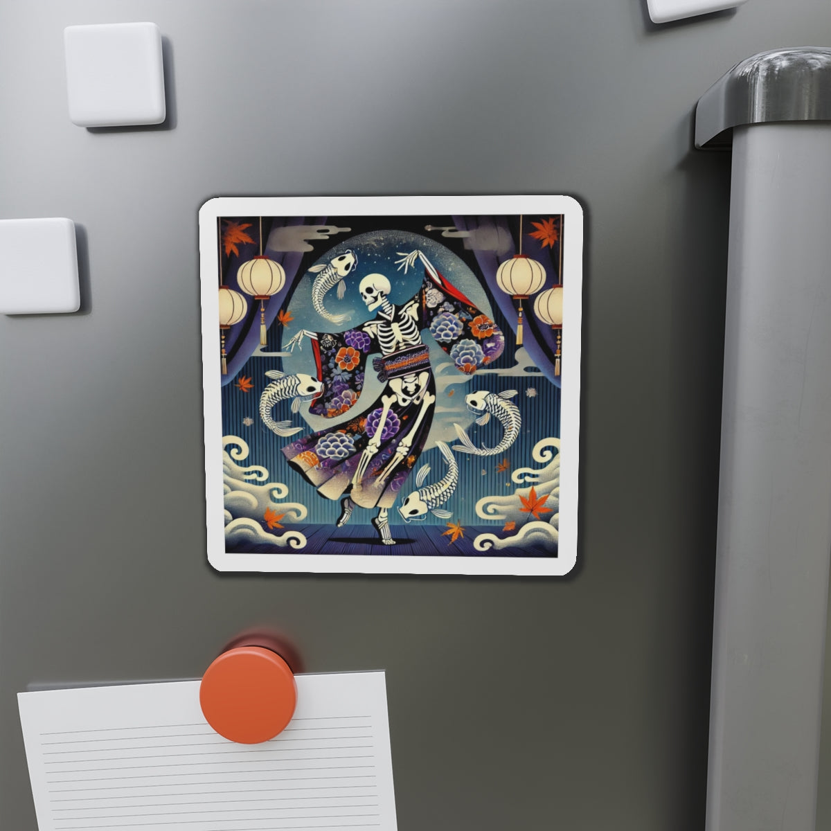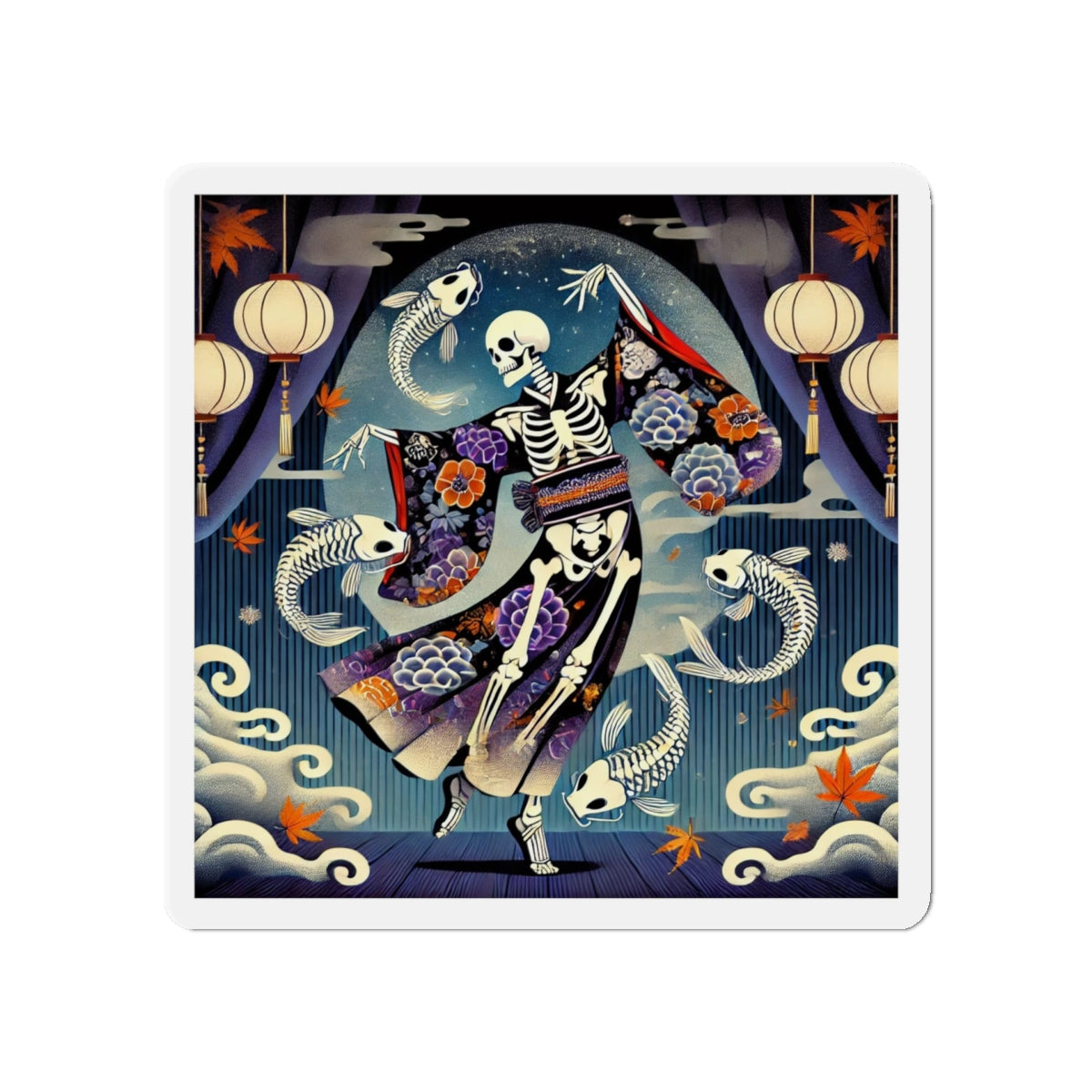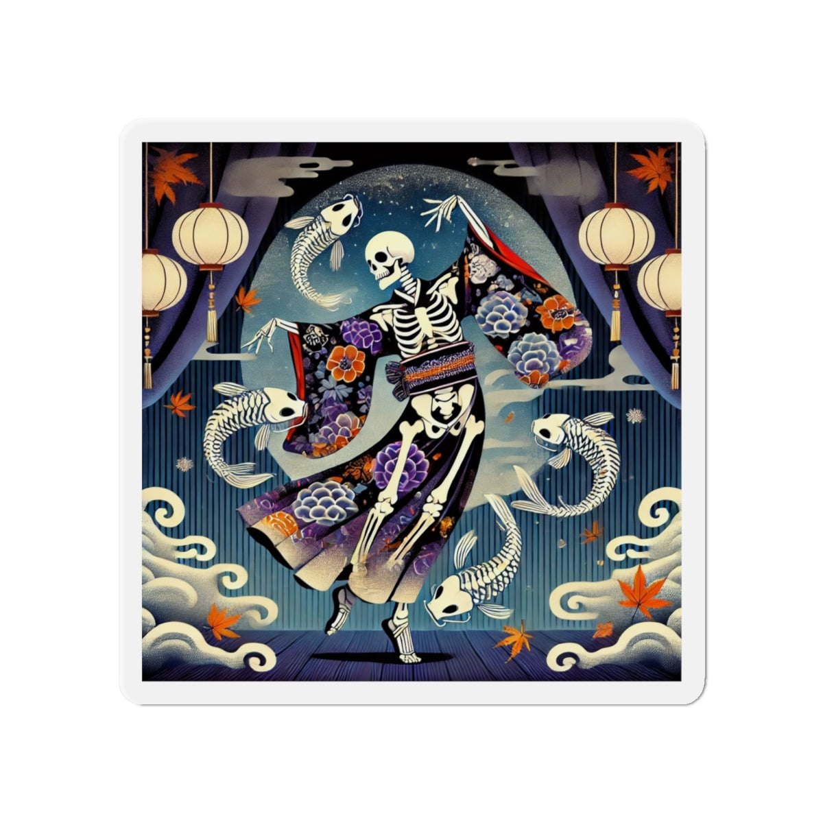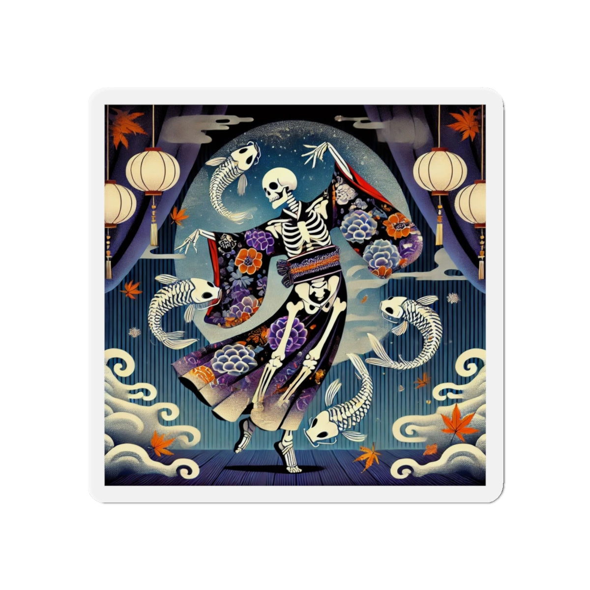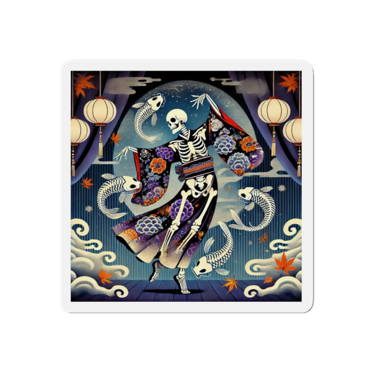 These die-cut vinyl magnets bring bold color and festive flair to any magnetic surface. Featuring a Kabuki-inspired Halloween scene, a skeleton performer dances mid-motion in a dramatic skeleton-patterned kimono, blending the elegance of Japanese theater with the spooky spirit of the season. Flexible, durable, and available in five sizes, they’re perfect for adding a touch of art and imagination to your home, office, or seasonal décor.