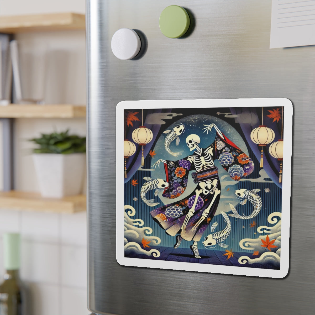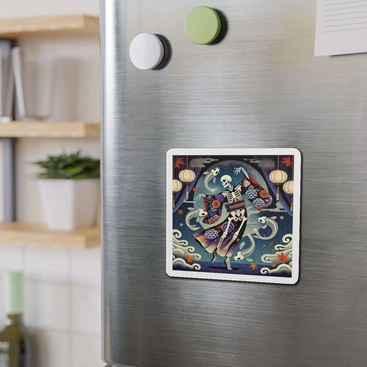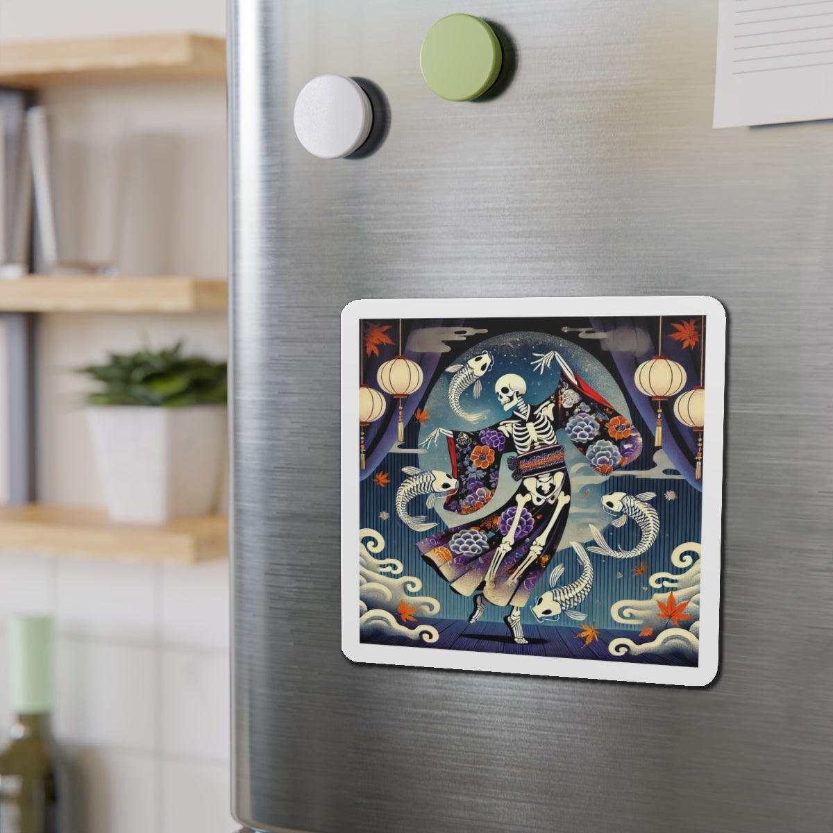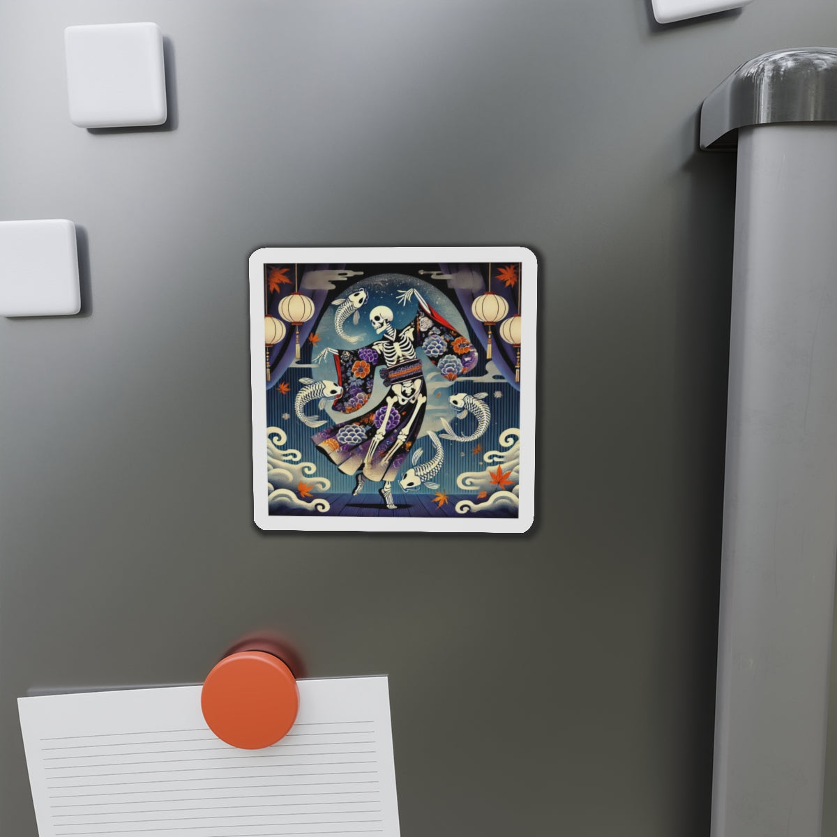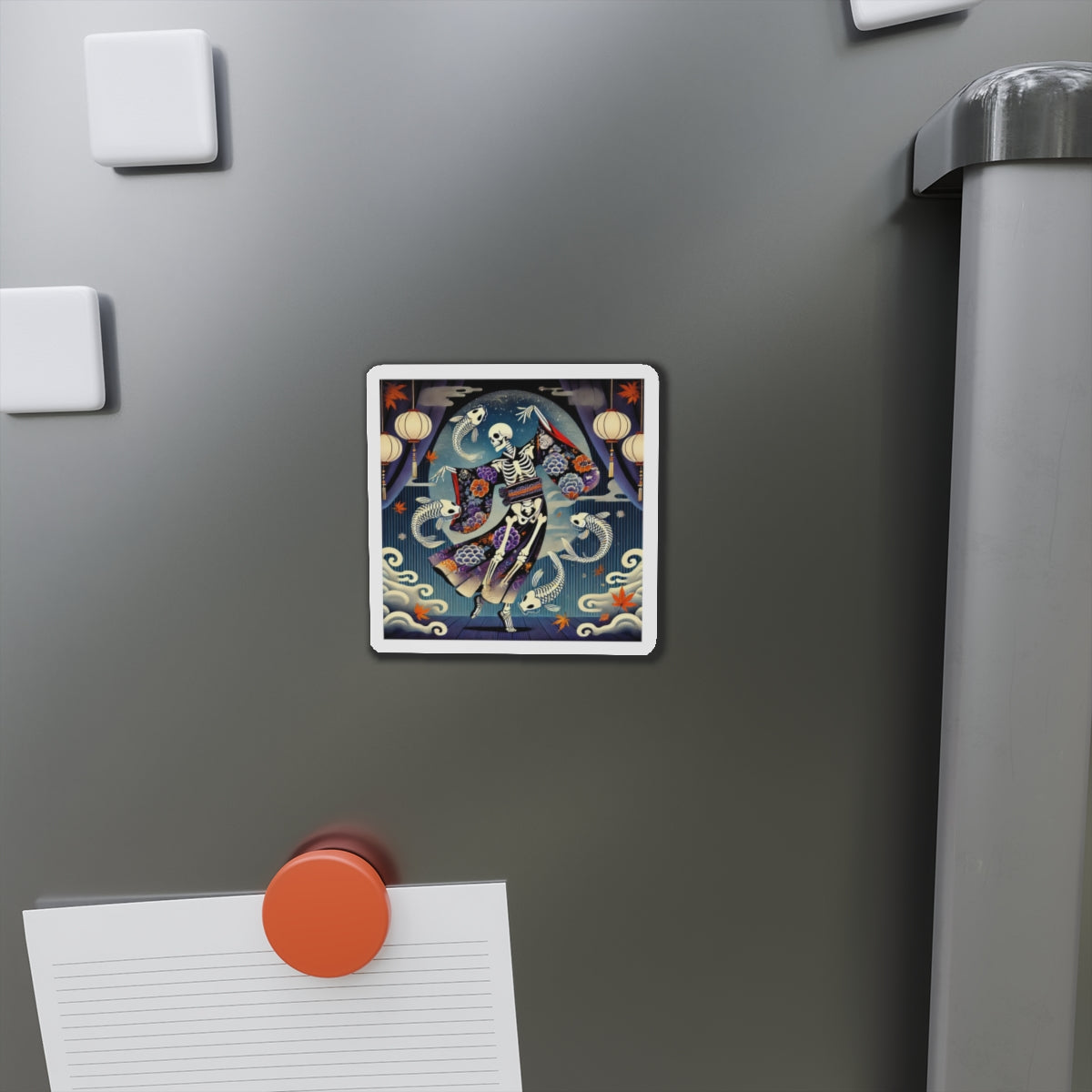 These die-cut vinyl magnets bring bold color and festive flair to any magnetic surface. Featuring a Kabuki-inspired Halloween scene, a skeleton performer dances mid-motion in a dramatic skeleton-patterned kimono, blending the elegance of Japanese theater with the spooky spirit of the season. Flexible, durable, and available in five sizes, they’re perfect for adding a touch of art and imagination to your home, office, or seasonal décor.