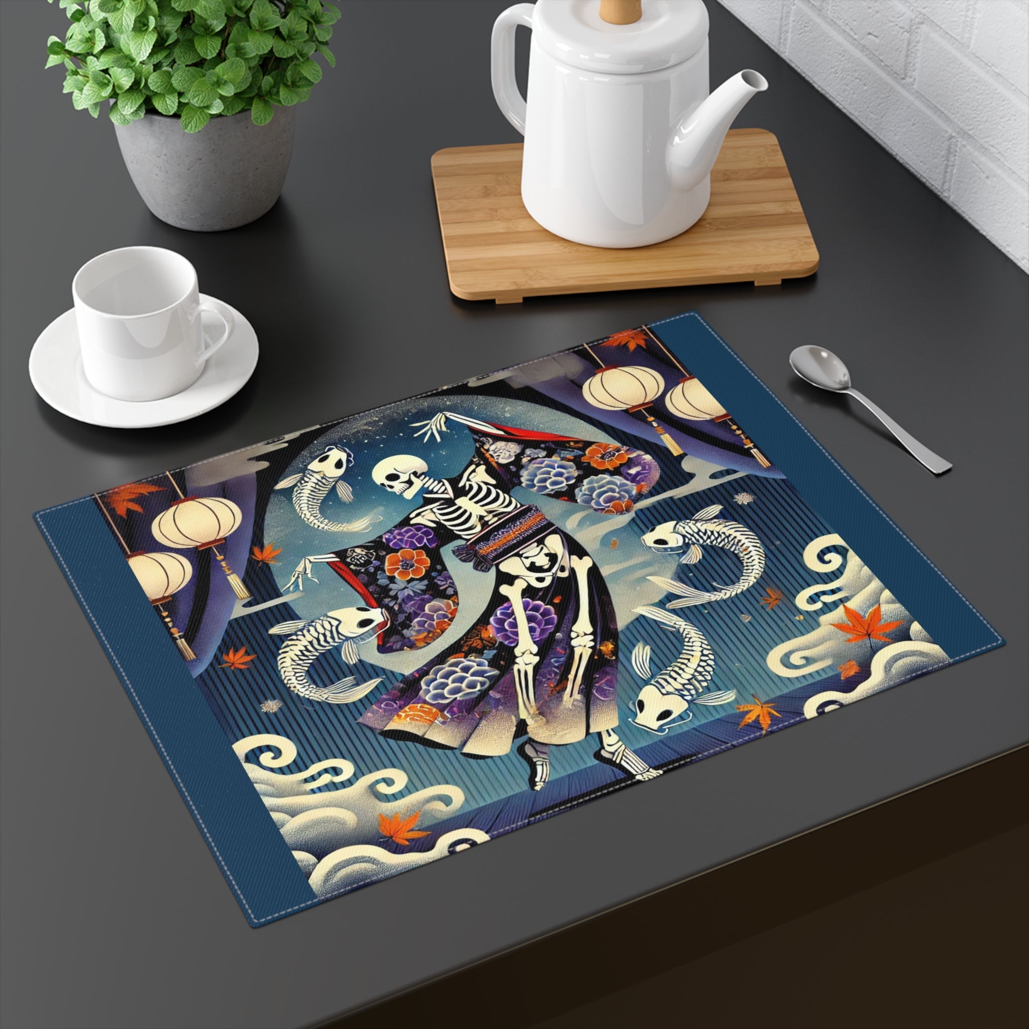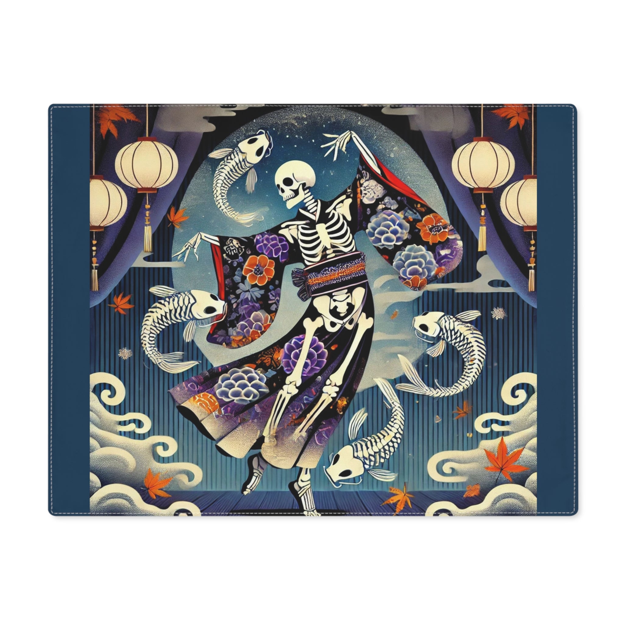 Across its surface, a Kabuki-inspired skeleton performer comes to life, dancing mid-motion in a dramatic skeleton-patterned kimono. The bold imagery blends the elegance of Japanese theater with the eerie charm of Halloween, transforming your table setting into a stage where tradition, artistry, and spooky delight perform together in harmony.