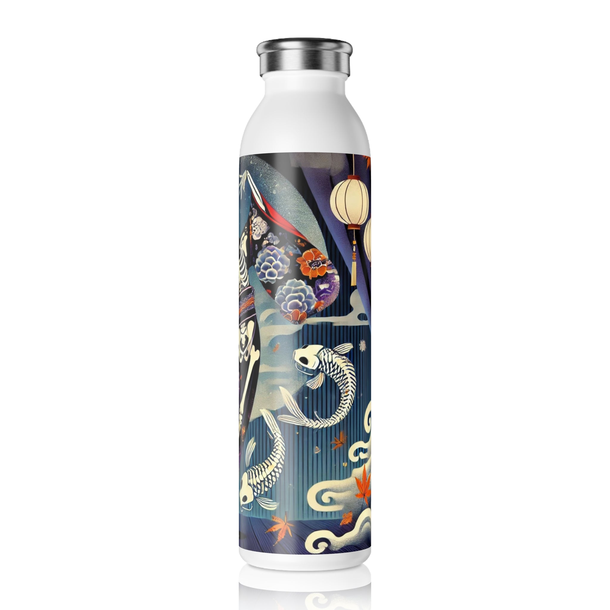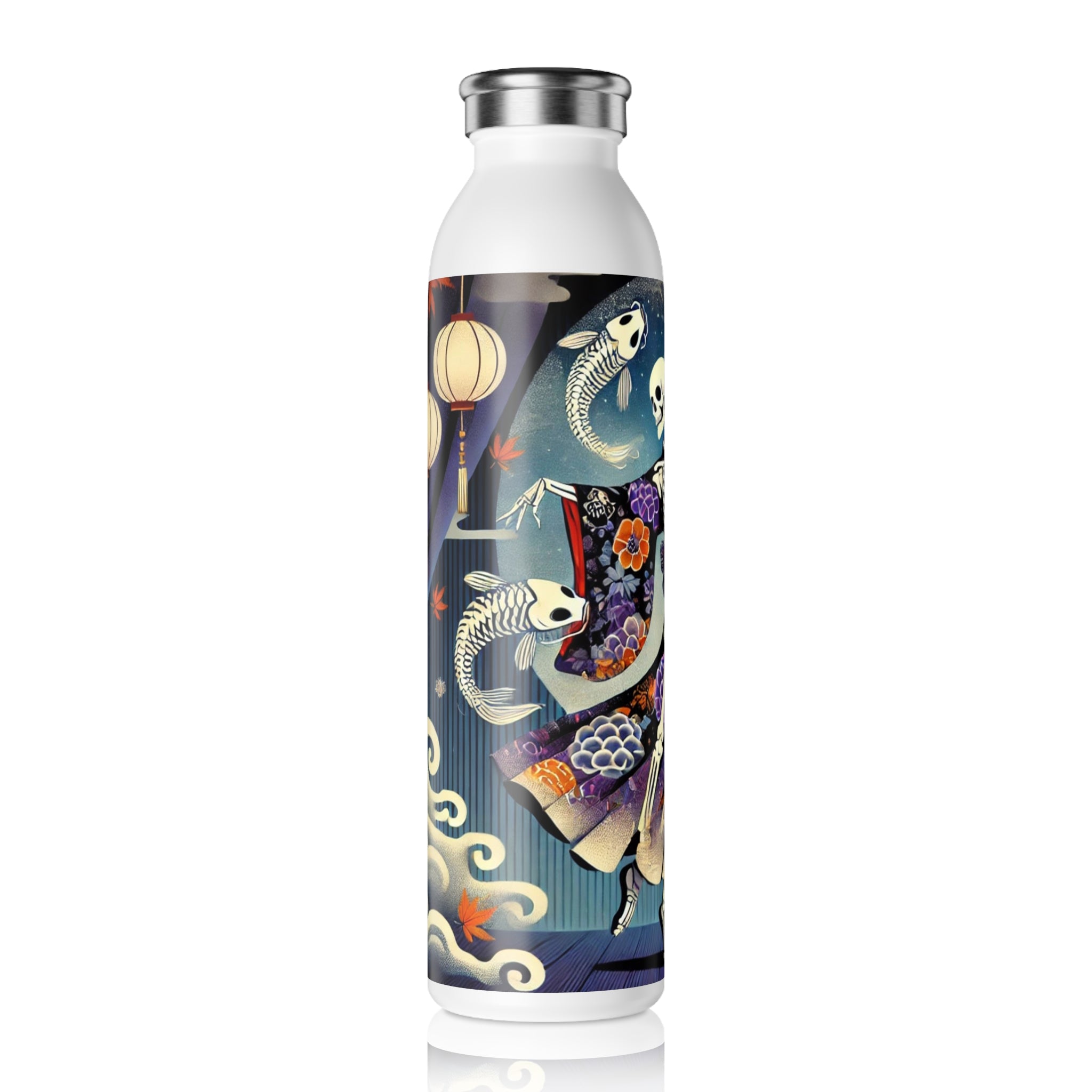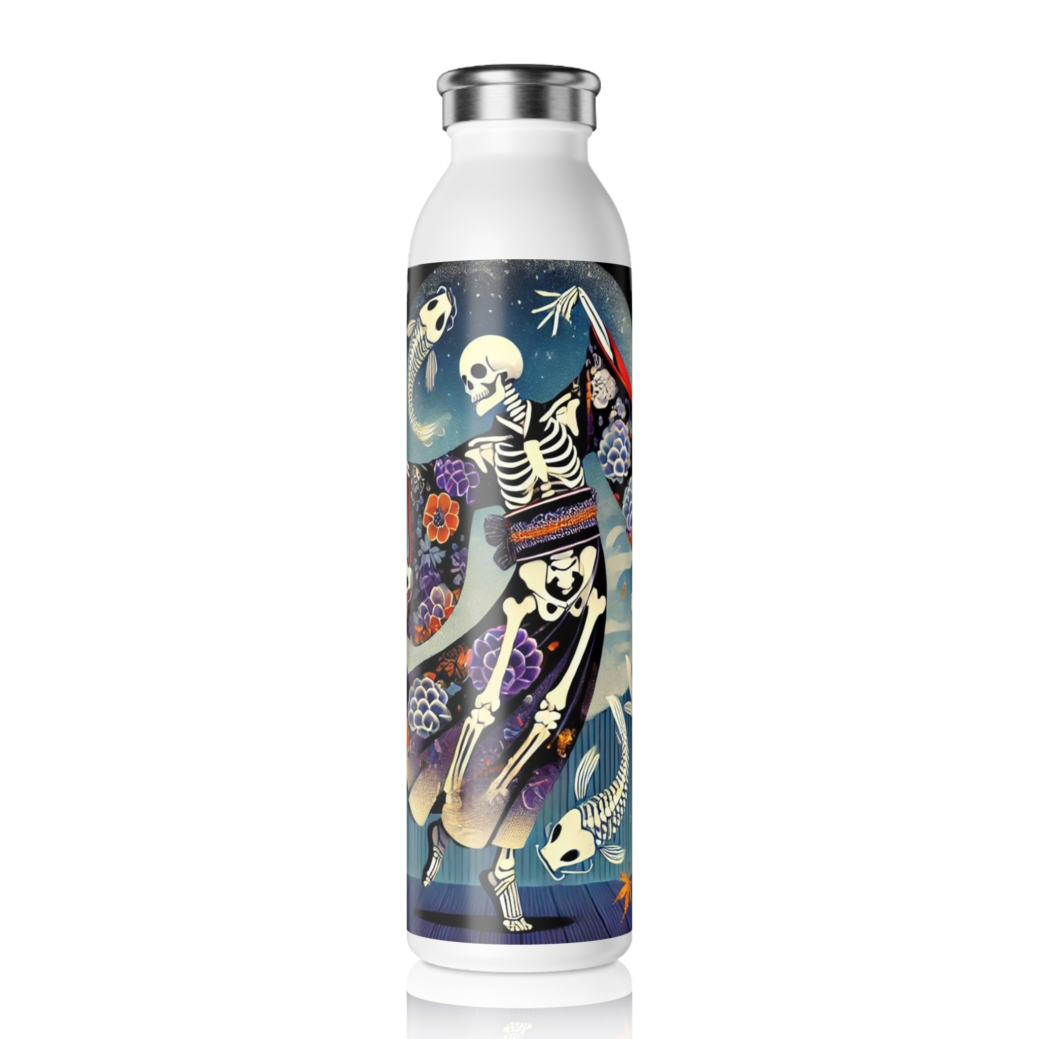 Across its smooth surface, a Kabuki-inspired Halloween scene comes to life. A skeleton performer moves mid-motion in a dramatic skeleton-patterned kimono, each gesture alive with theatrical energy. The composition blends the elegance of Japanese theater with the spooky spirit of the season, capturing both artistry and mystery in one unforgettable design. More than just a water bottle, it becomes a stage where performance and imagination meet, turning a practical essential into a piece of wearable art.