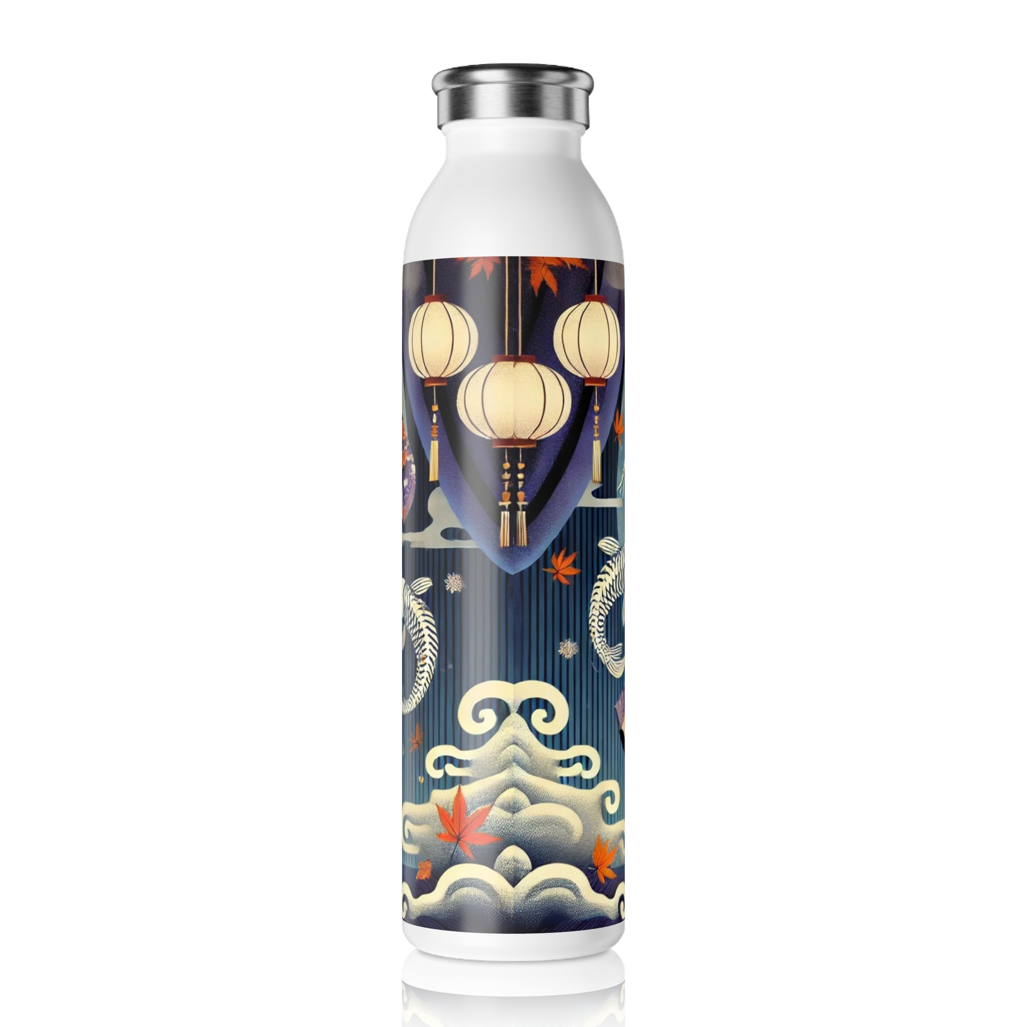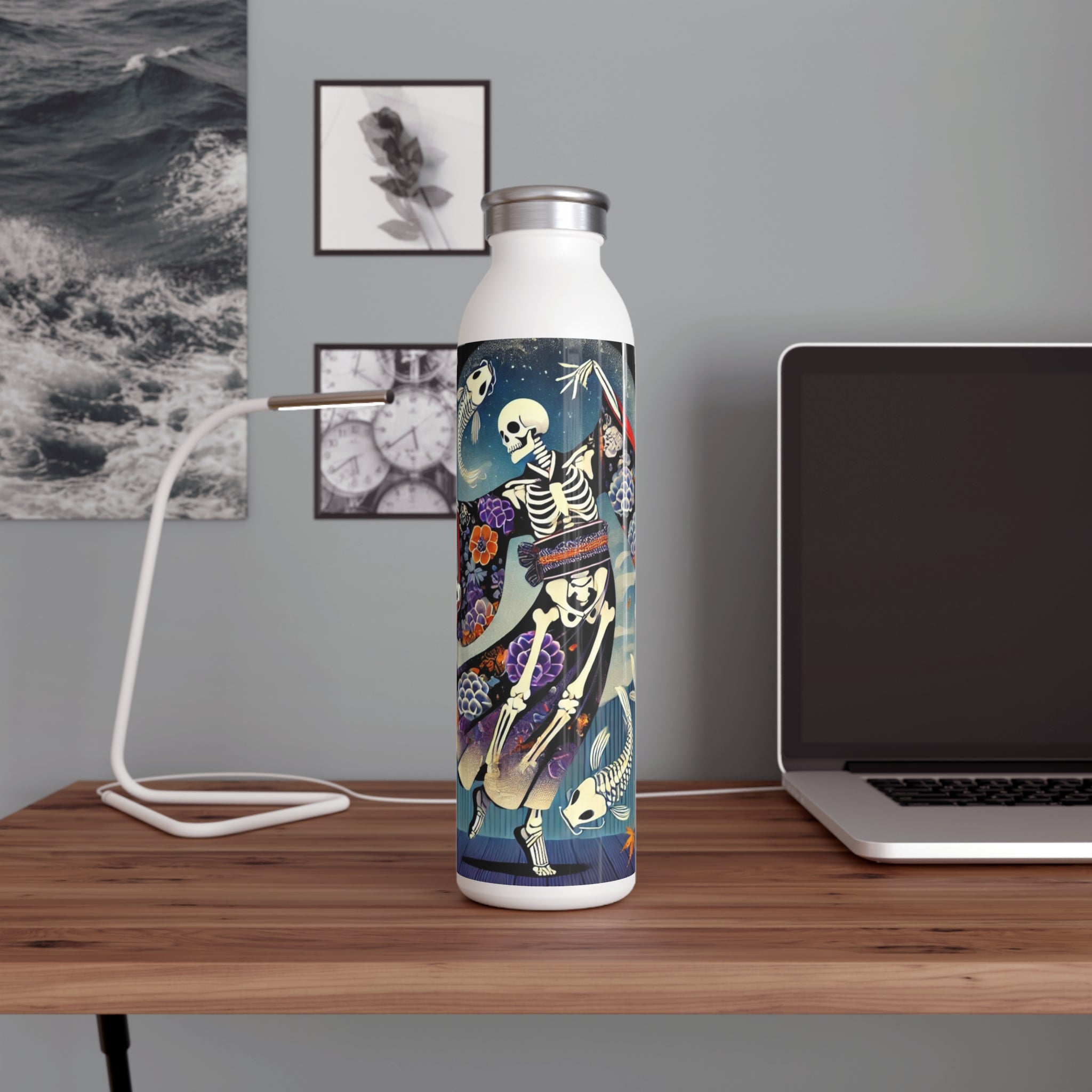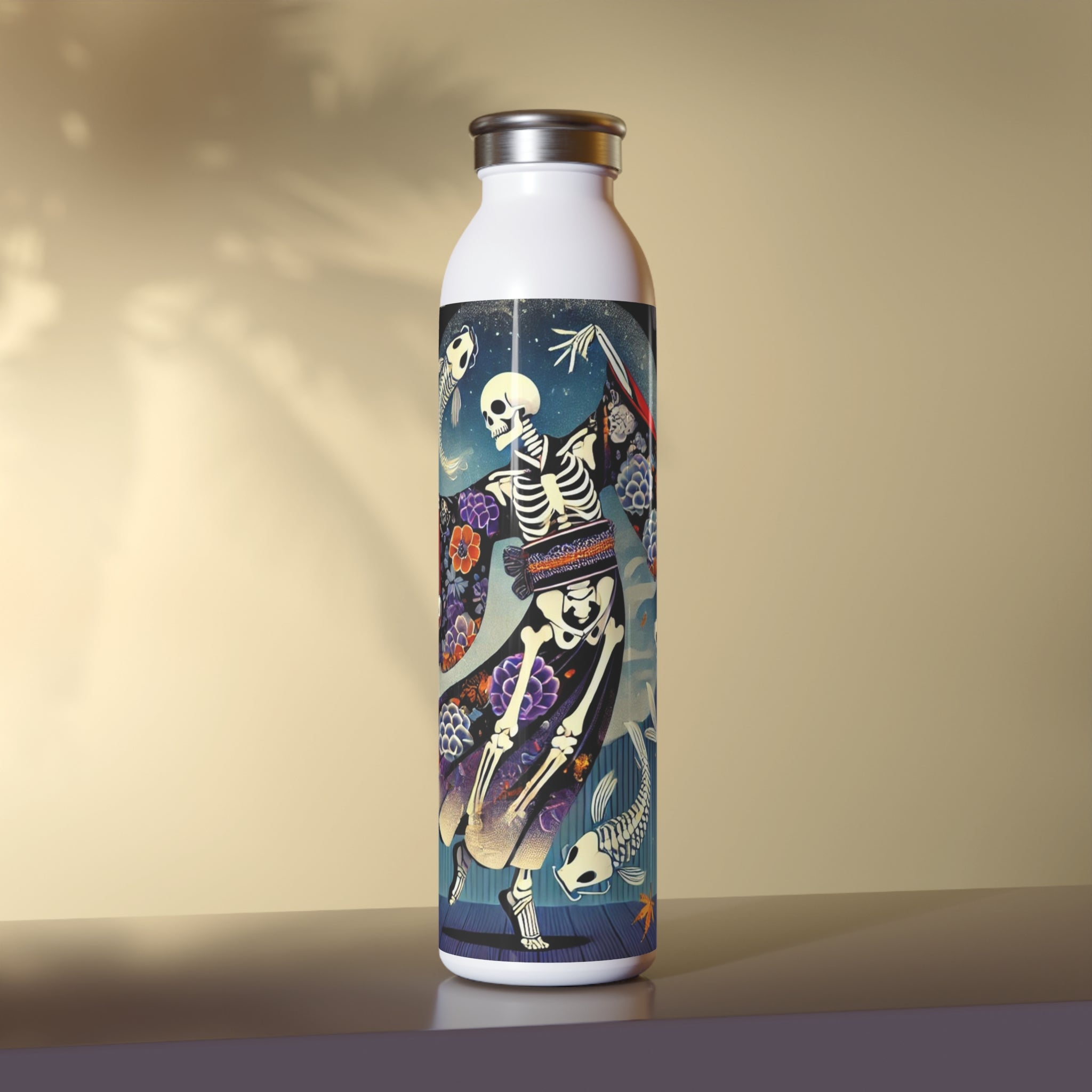 Across its smooth surface, a Kabuki-inspired Halloween scene comes to life. A skeleton performer moves mid-motion in a dramatic skeleton-patterned kimono, each gesture alive with theatrical energy. The composition blends the elegance of Japanese theater with the spooky spirit of the season, capturing both artistry and mystery in one unforgettable design. More than just a water bottle, it becomes a stage where performance and imagination meet, turning a practical essential into a piece of wearable art.