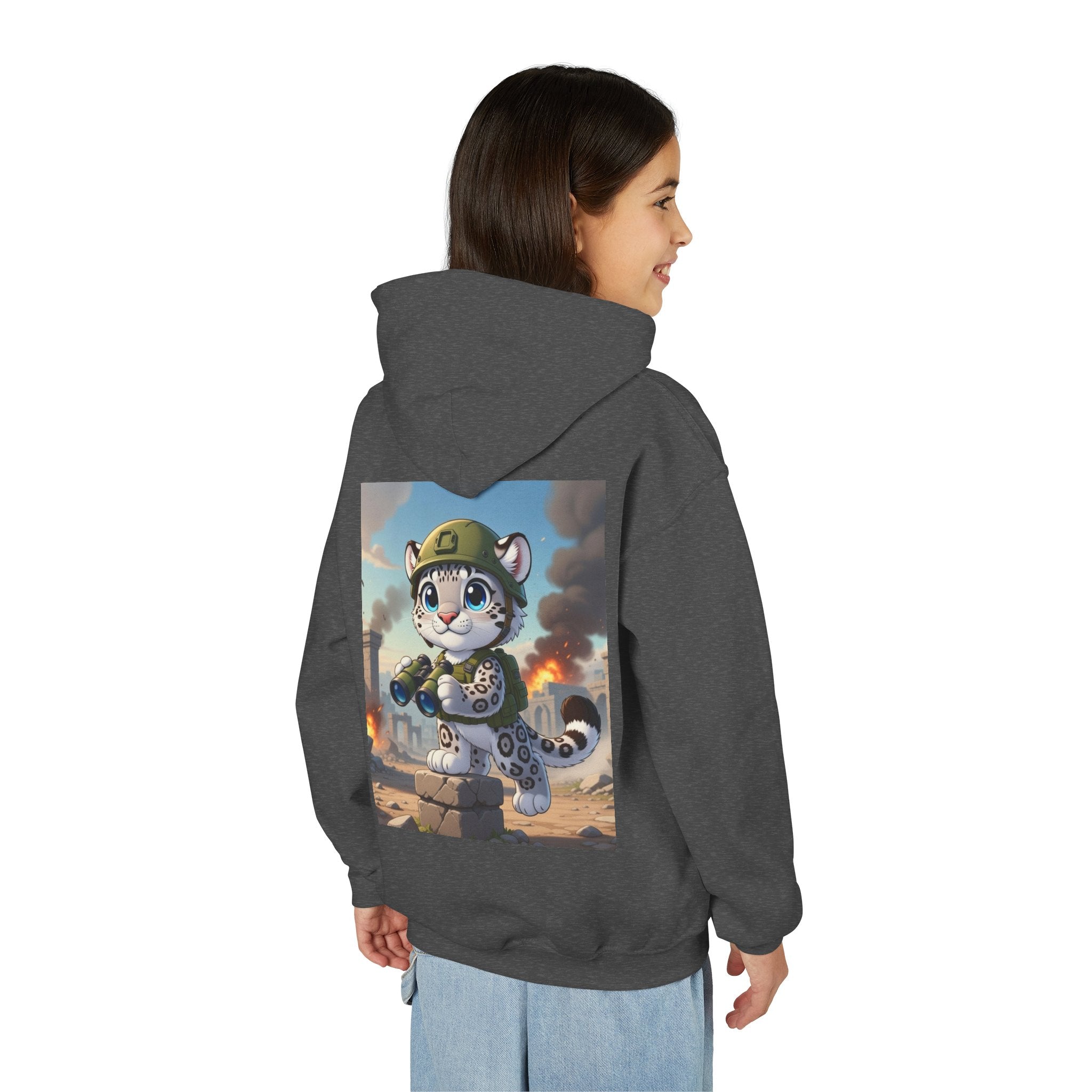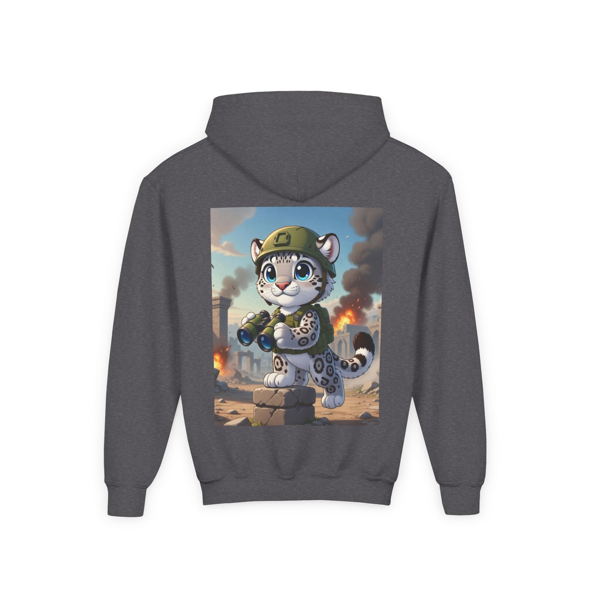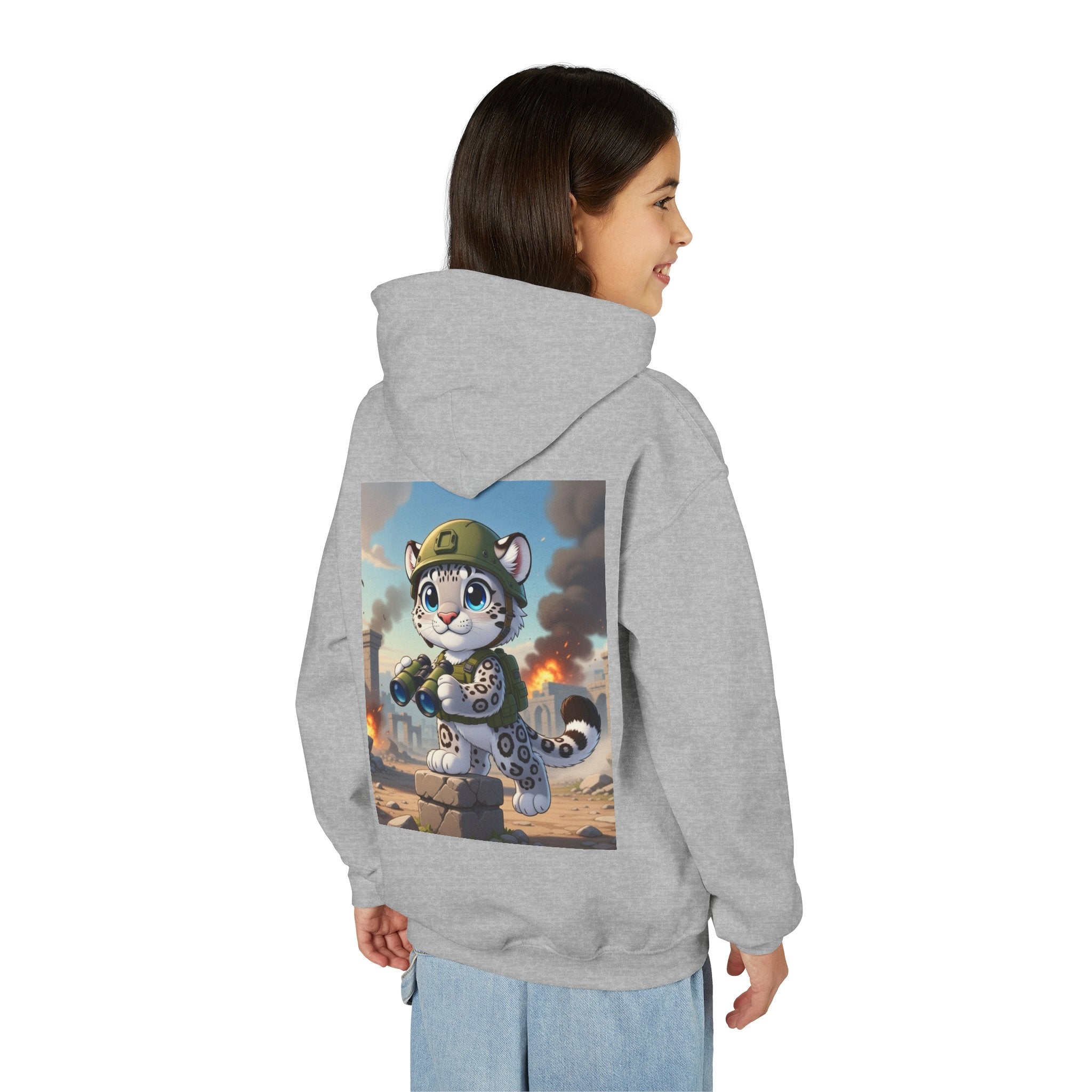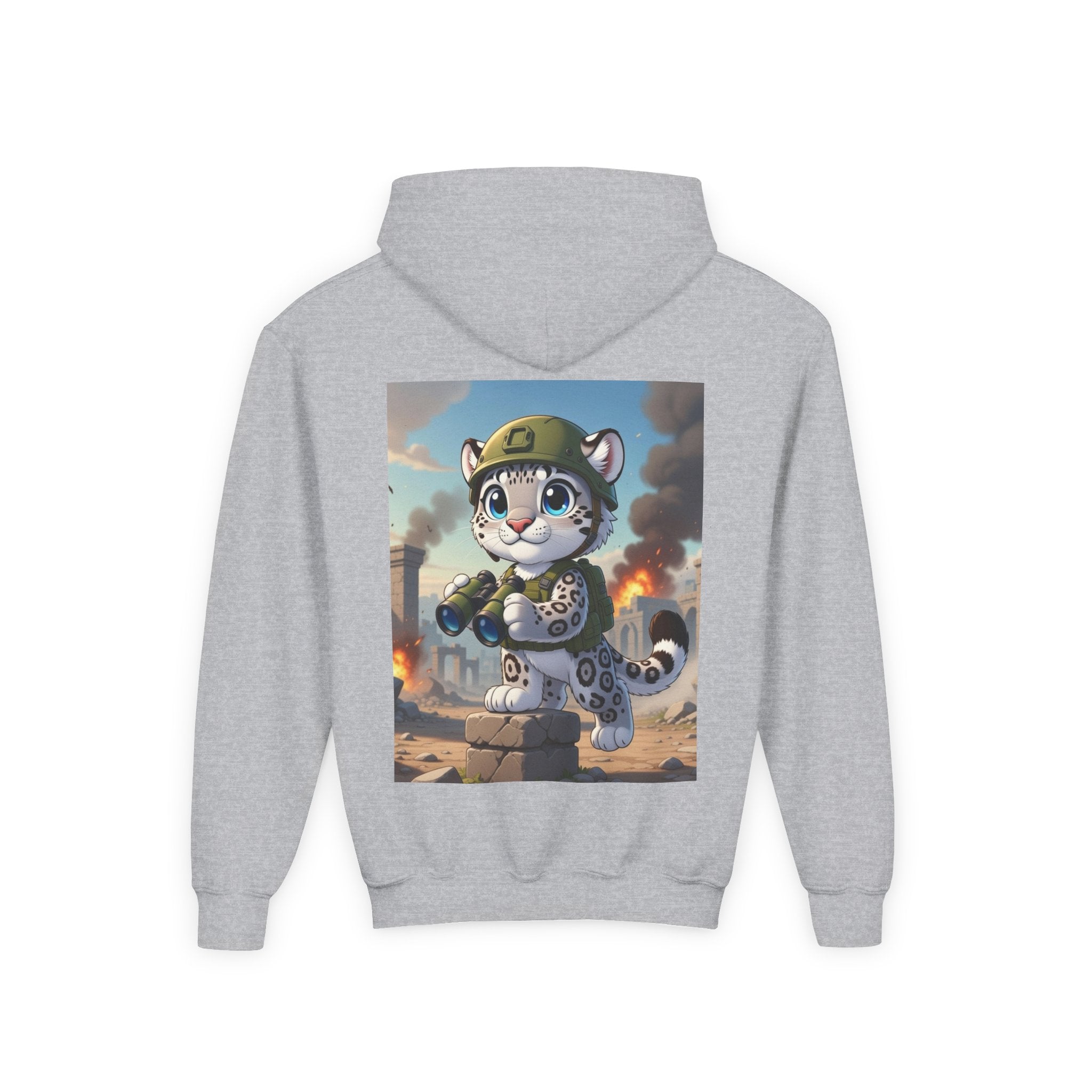 Snow Leopard Lookout Youth Heavy Blend Hooded Sweatshirt brings bold adventure and playful character to a cozy everyday layer. The artwork features a snow leopard standing proudly atop a stone block, holding binoculars and outfitted with a helmet and backpack, ready to scan the horizon. Set against an illustrated backdrop of weathered stone ruins, drifting smoke, and open sky, the scene is rendered in a vivid cartoon-inspired style with strong color contrast and crisp detail that captures curiosity, courage, and a spirit of exploration.