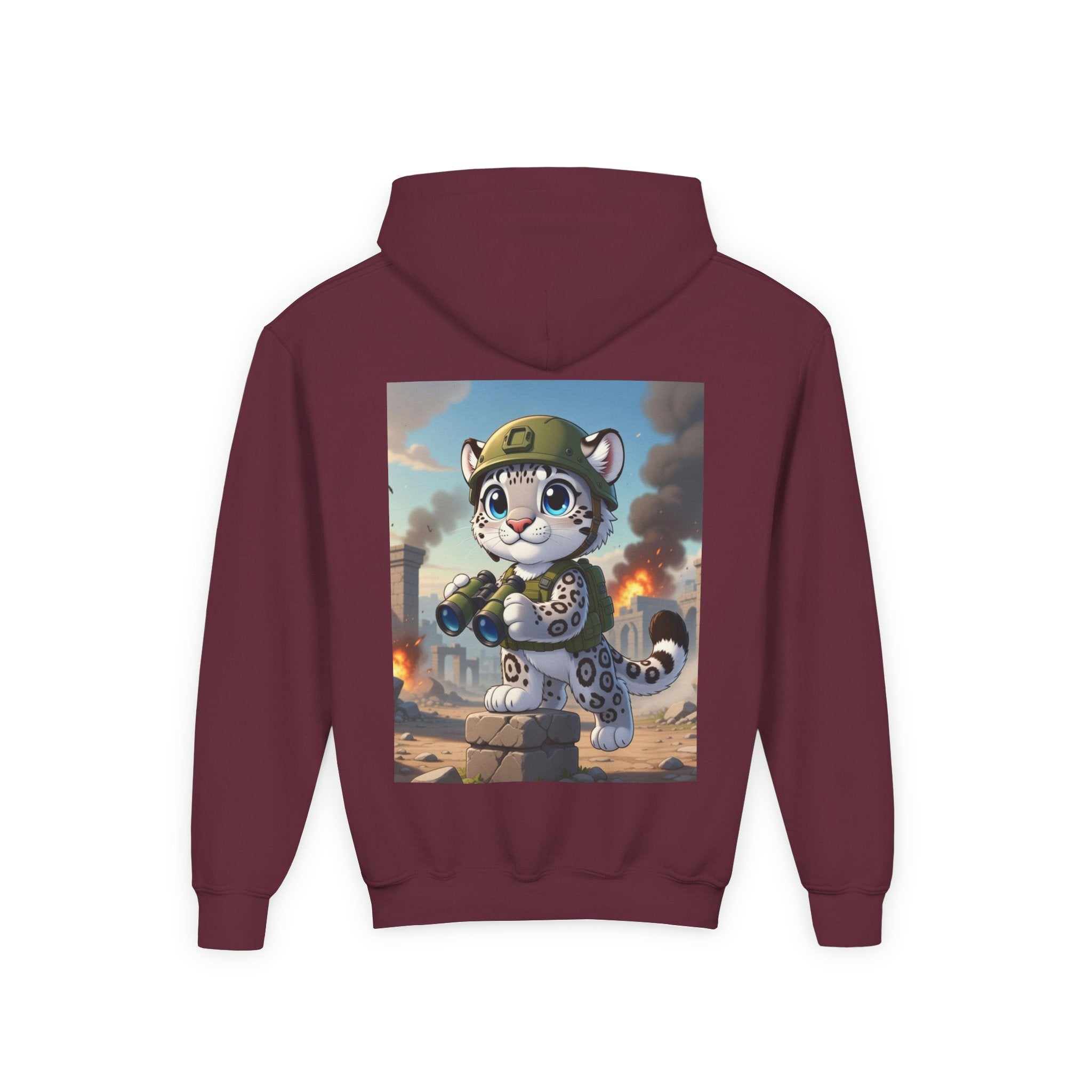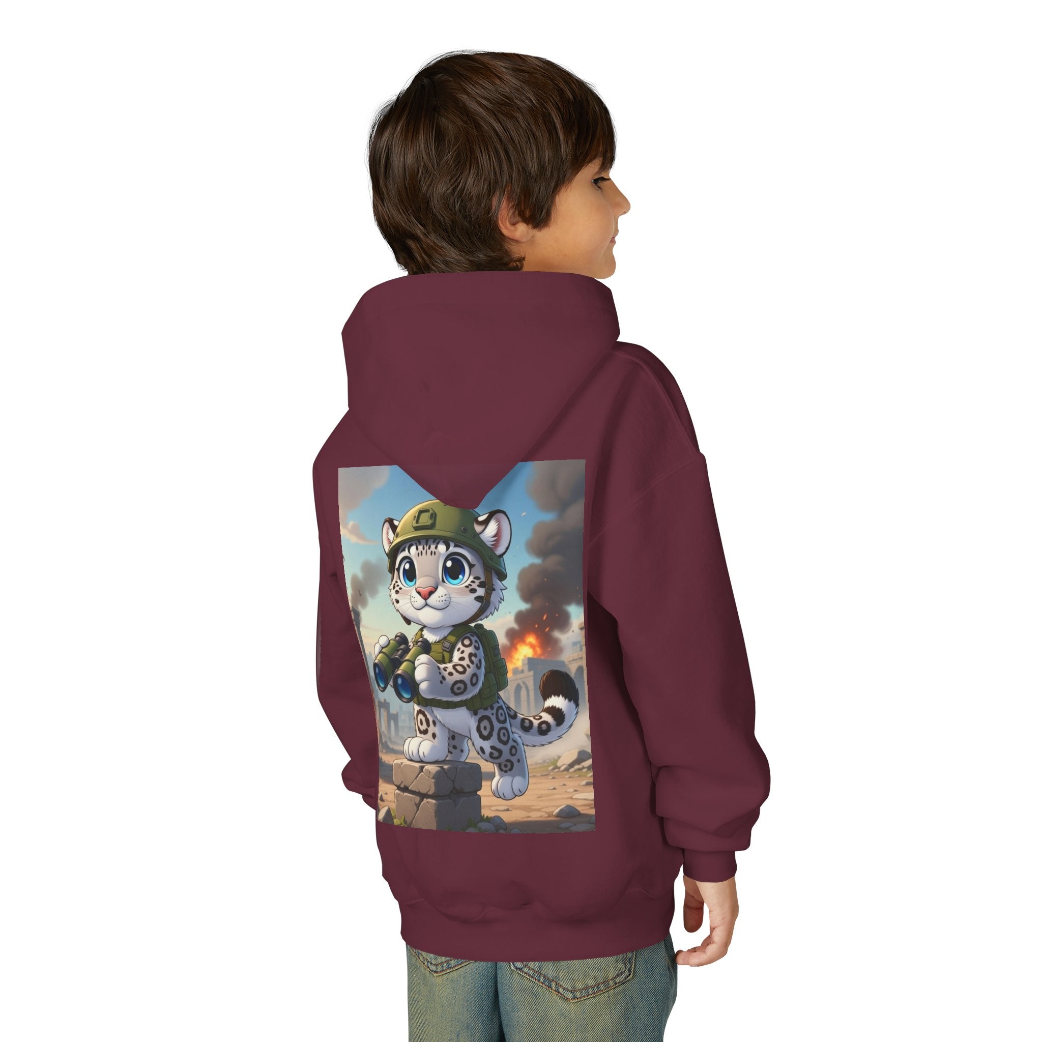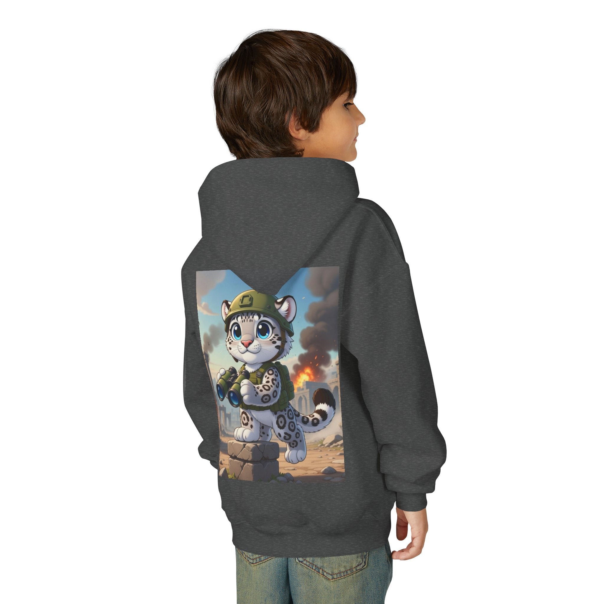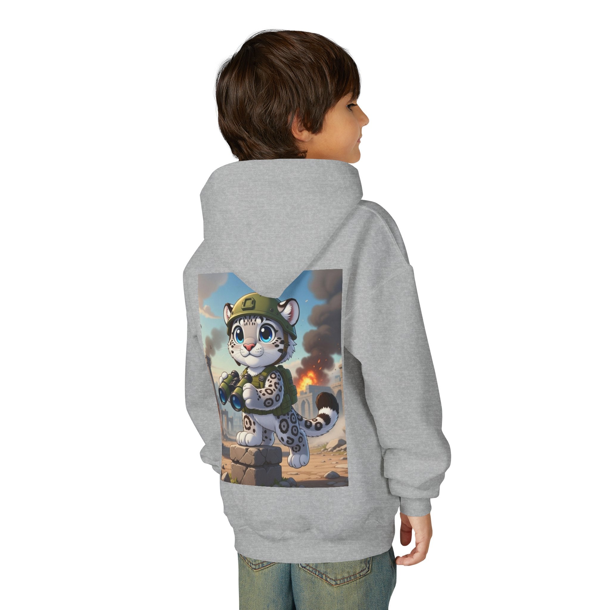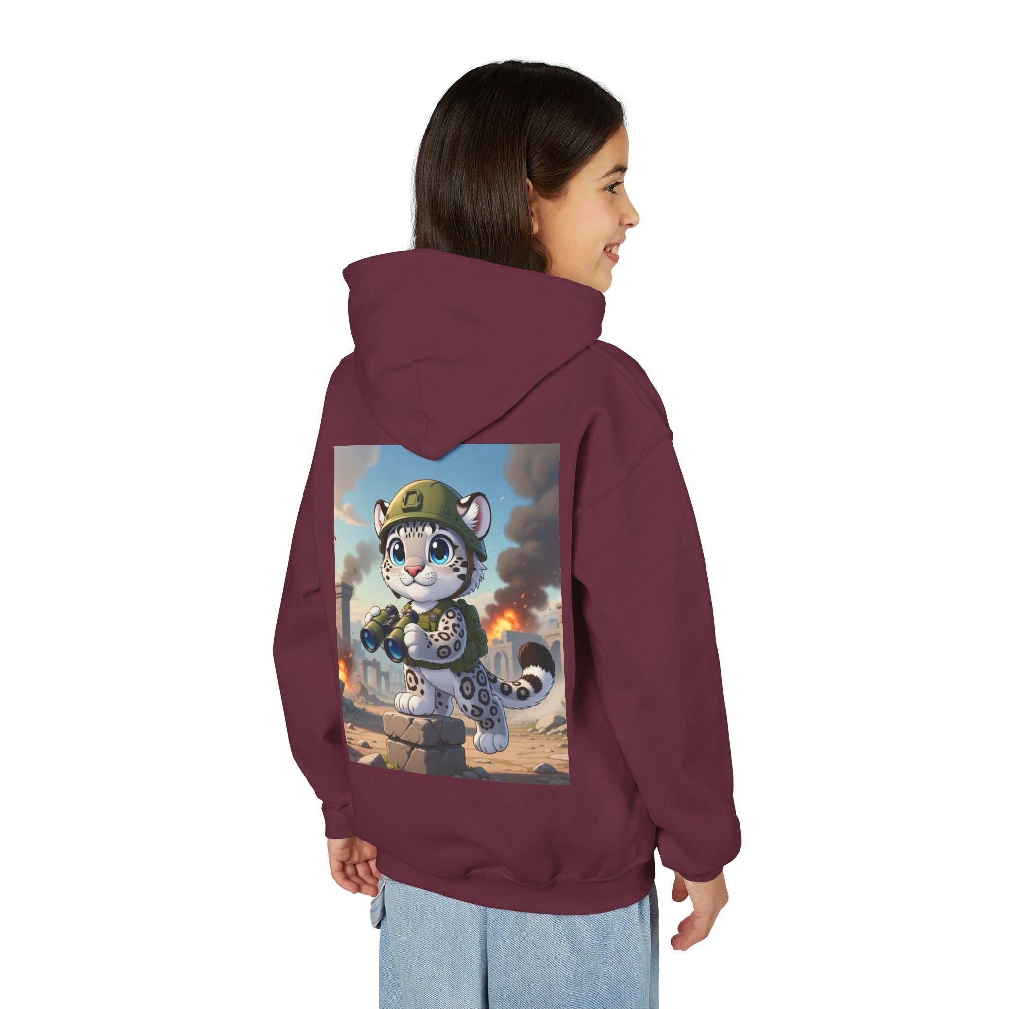 Snow Leopard Lookout Youth Heavy Blend Hooded Sweatshirt brings bold adventure and playful character to a cozy everyday layer. The artwork features a snow leopard standing proudly atop a stone block, holding binoculars and outfitted with a helmet and backpack, ready to scan the horizon. Set against an illustrated backdrop of weathered stone ruins, drifting smoke, and open sky, the scene is rendered in a vivid cartoon-inspired style with strong color contrast and crisp detail that captures curiosity, courage, and a spirit of exploration.