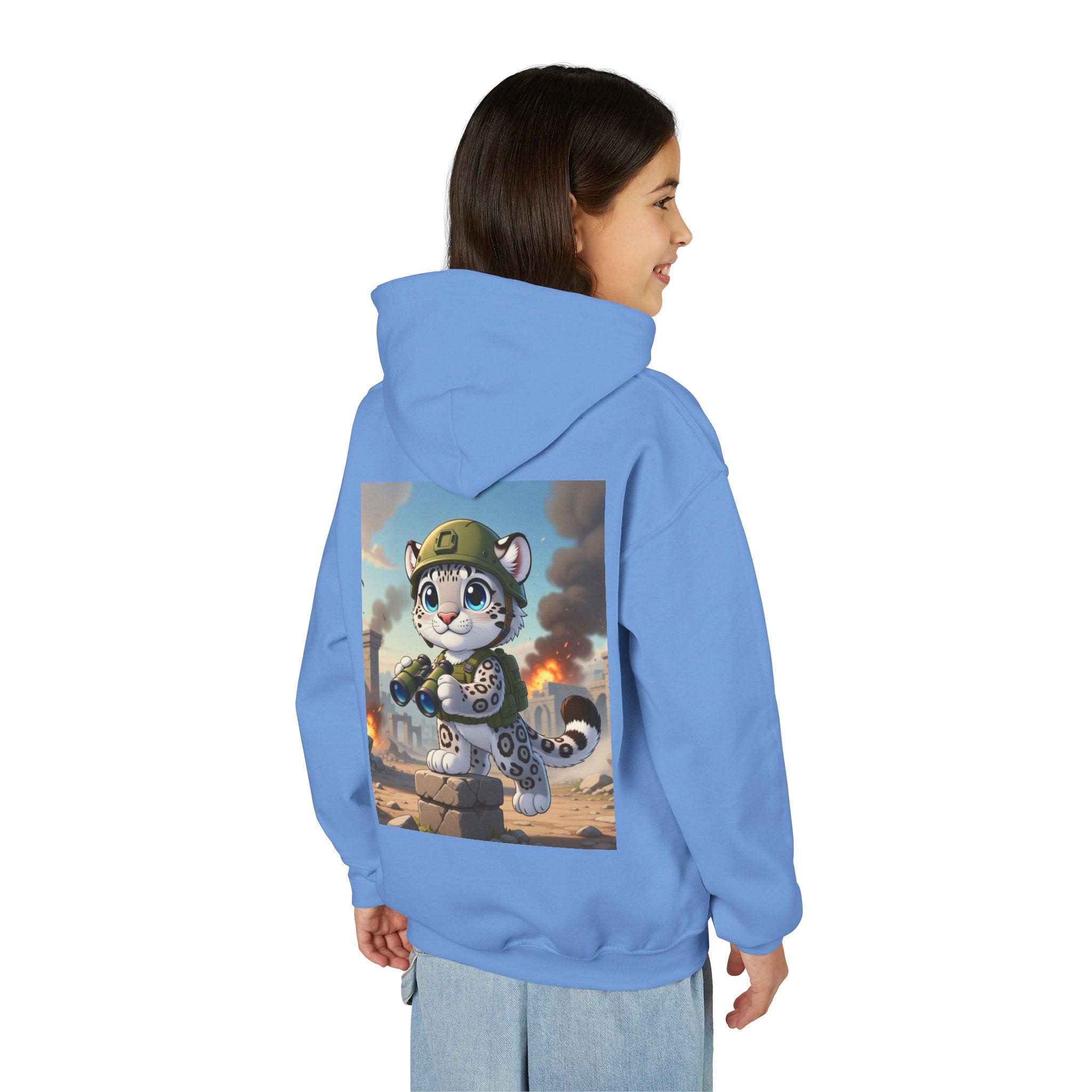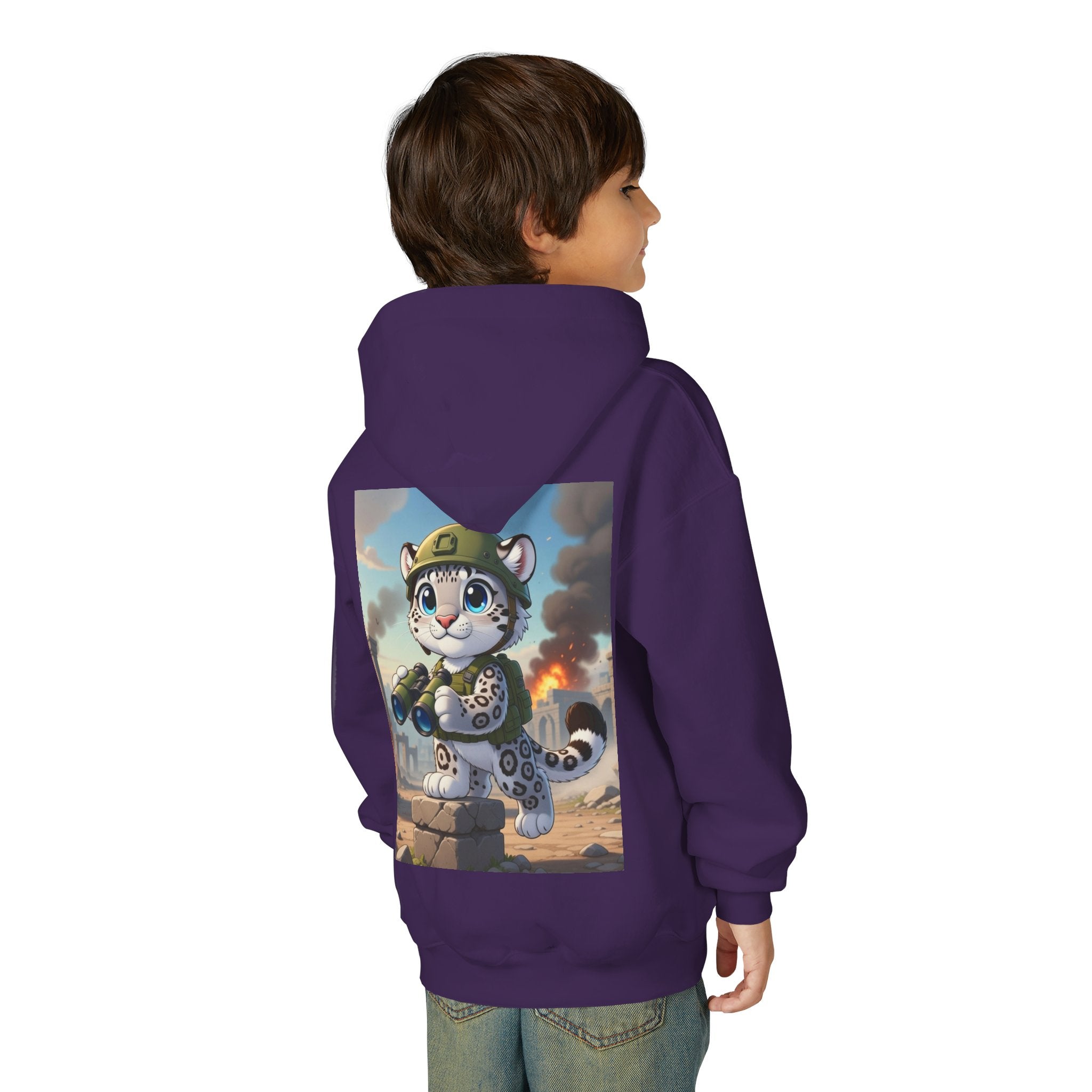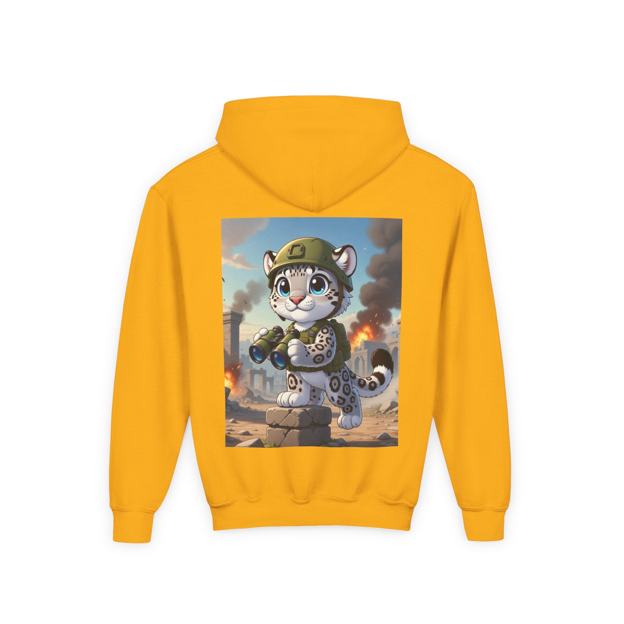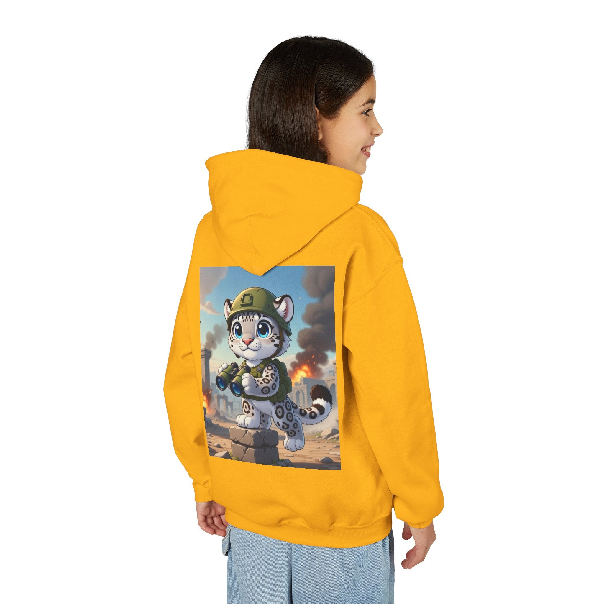 Snow Leopard Lookout Youth Heavy Blend Hooded Sweatshirt brings bold adventure and playful character to a cozy everyday layer. The artwork features a snow leopard standing proudly atop a stone block, holding binoculars and outfitted with a helmet and backpack, ready to scan the horizon. Set against an illustrated backdrop of weathered stone ruins, drifting smoke, and open sky, the scene is rendered in a vivid cartoon-inspired style with strong color contrast and crisp detail that captures curiosity, courage, and a spirit of exploration.