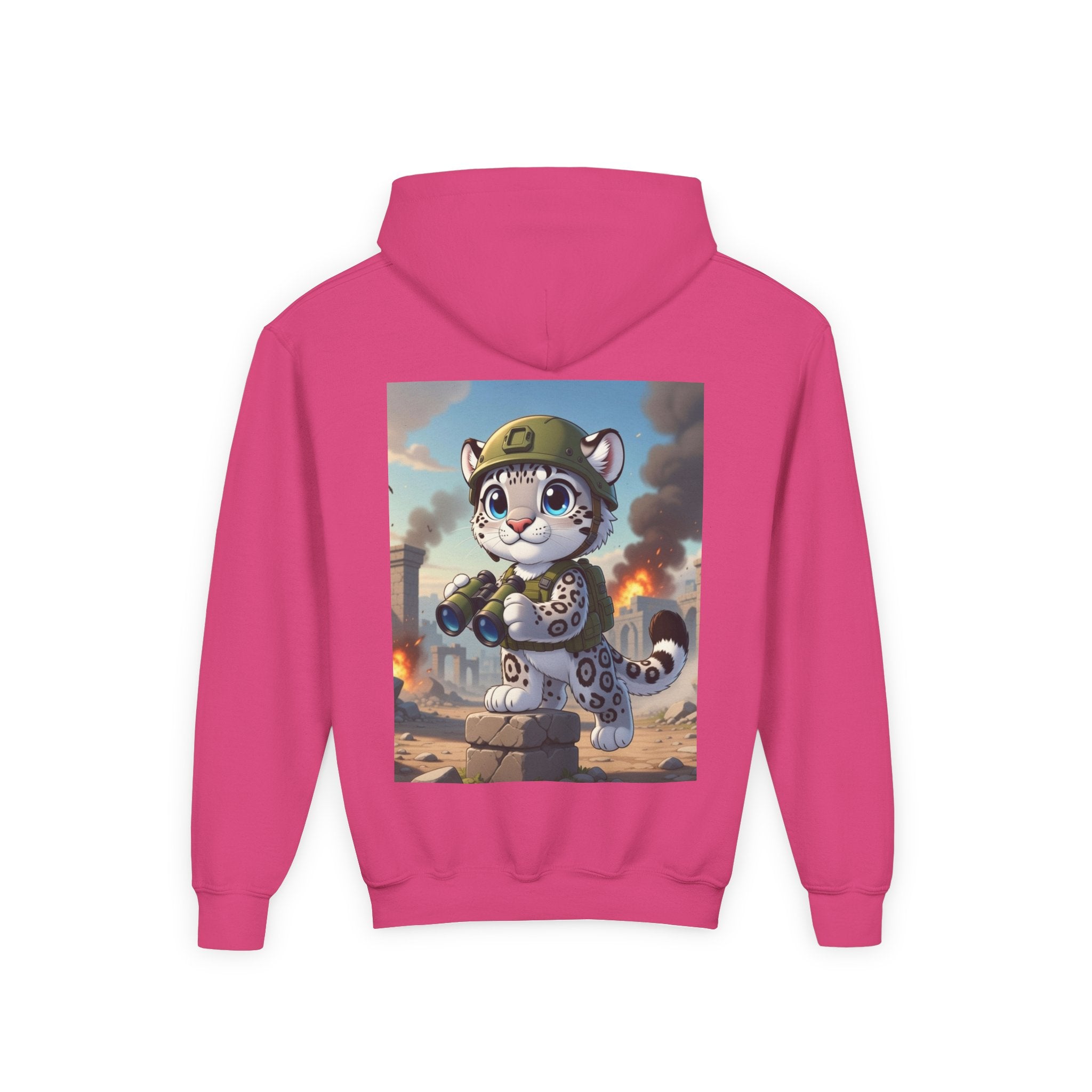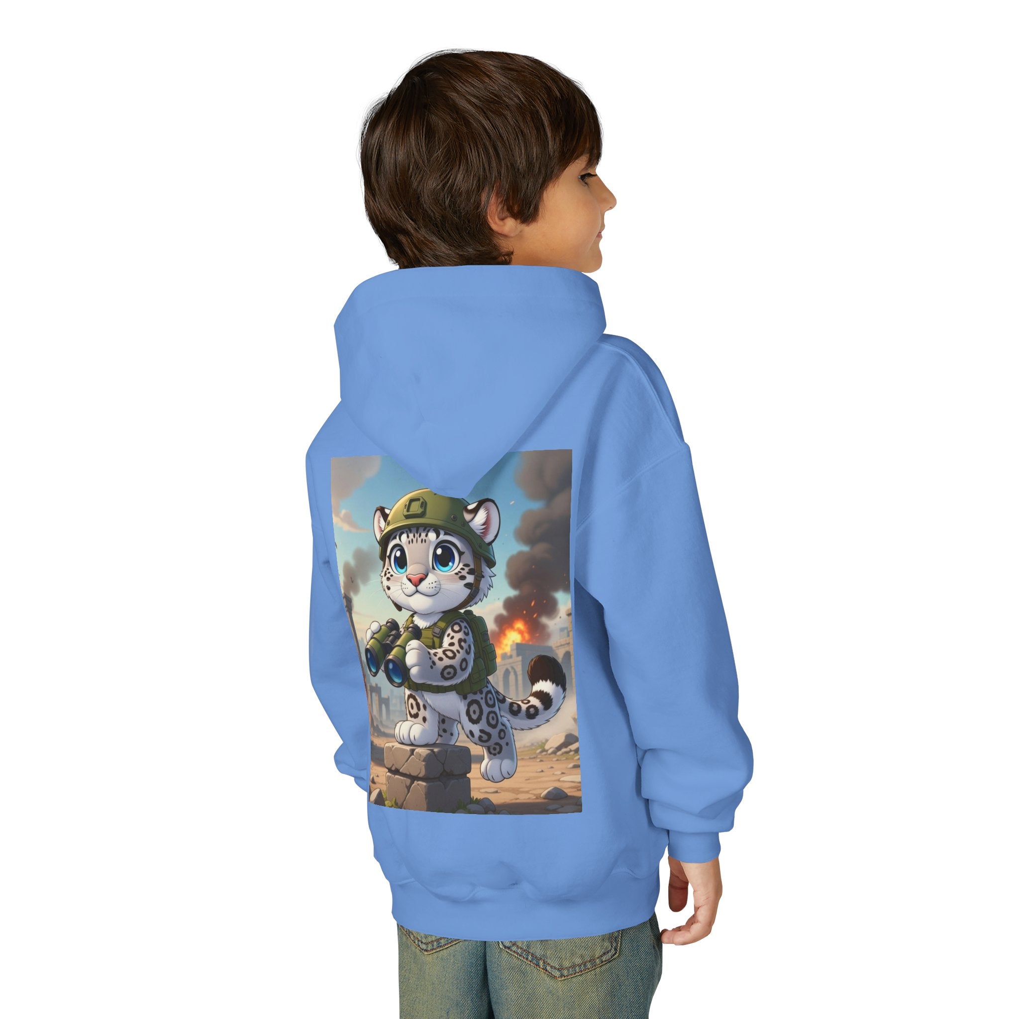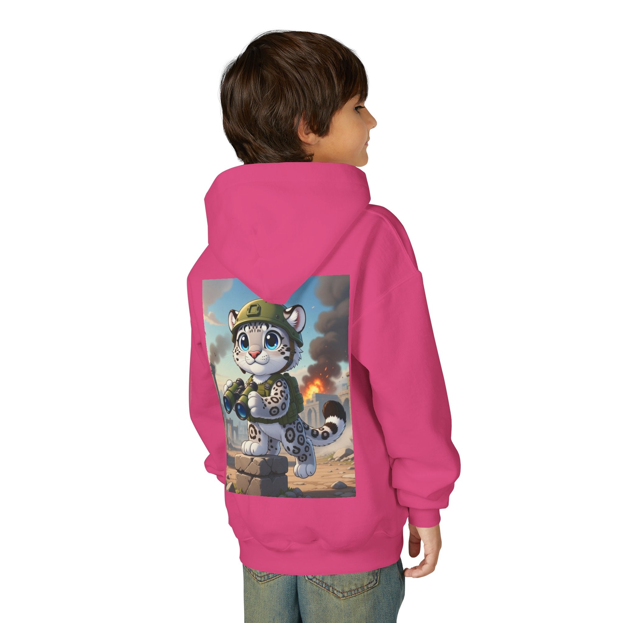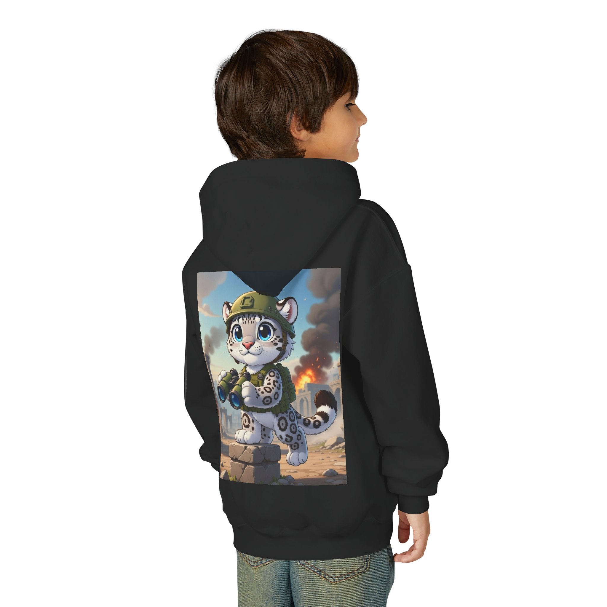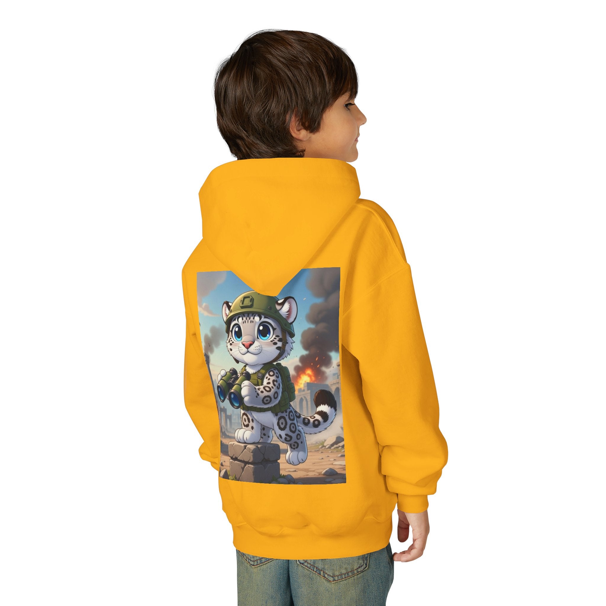 Snow Leopard Lookout Youth Heavy Blend Hooded Sweatshirt brings bold adventure and playful character to a cozy everyday layer. The artwork features a snow leopard standing proudly atop a stone block, holding binoculars and outfitted with a helmet and backpack, ready to scan the horizon. Set against an illustrated backdrop of weathered stone ruins, drifting smoke, and open sky, the scene is rendered in a vivid cartoon-inspired style with strong color contrast and crisp detail that captures curiosity, courage, and a spirit of exploration.