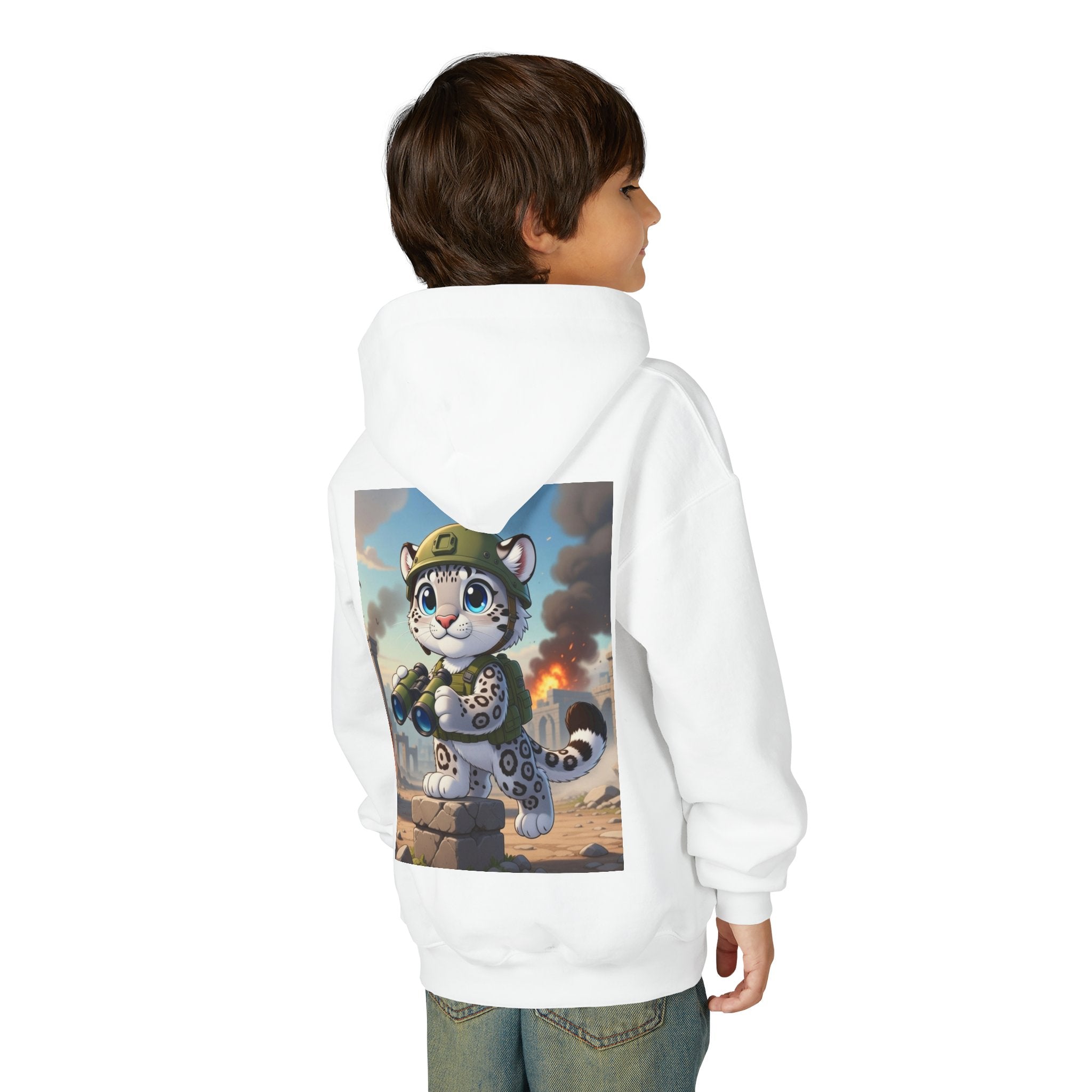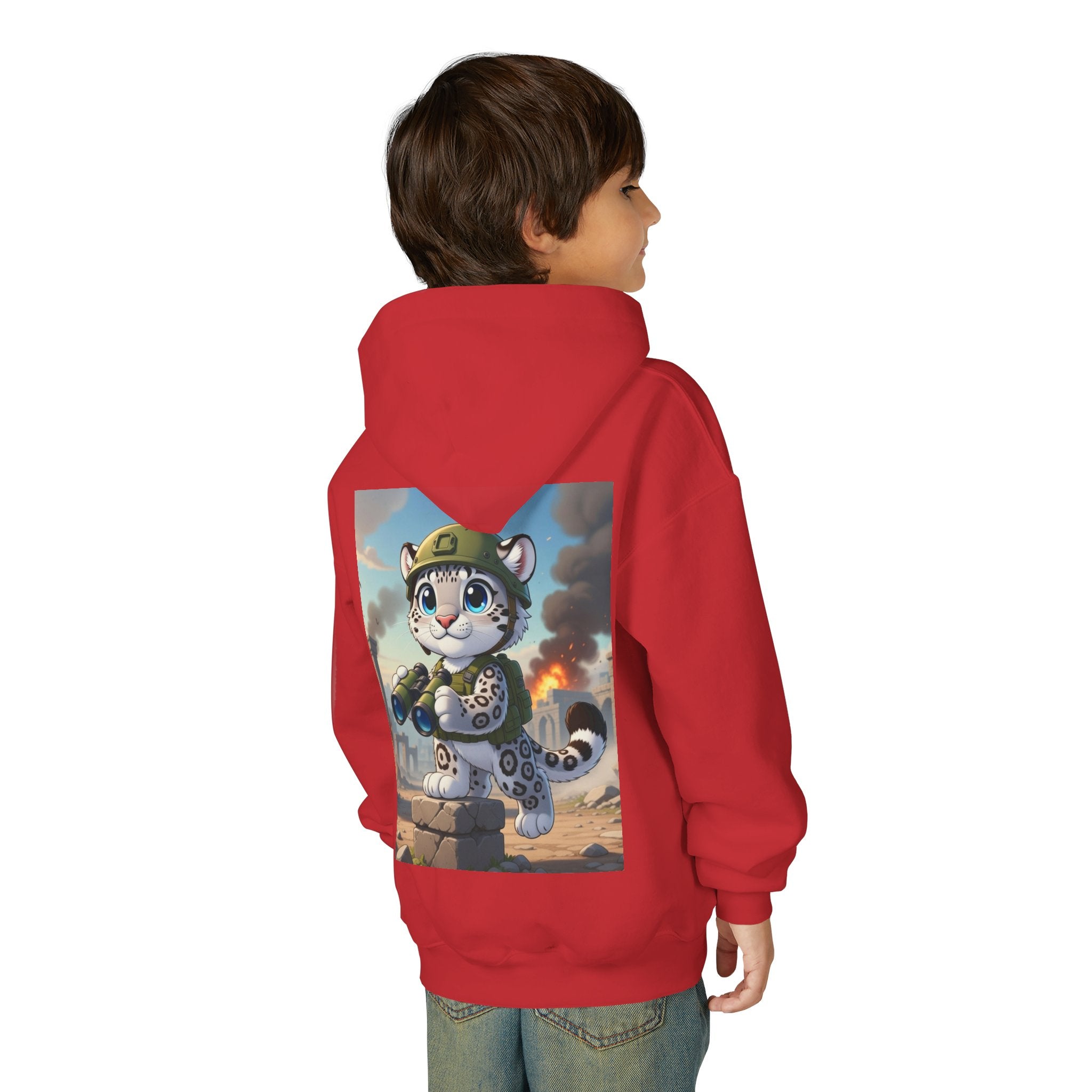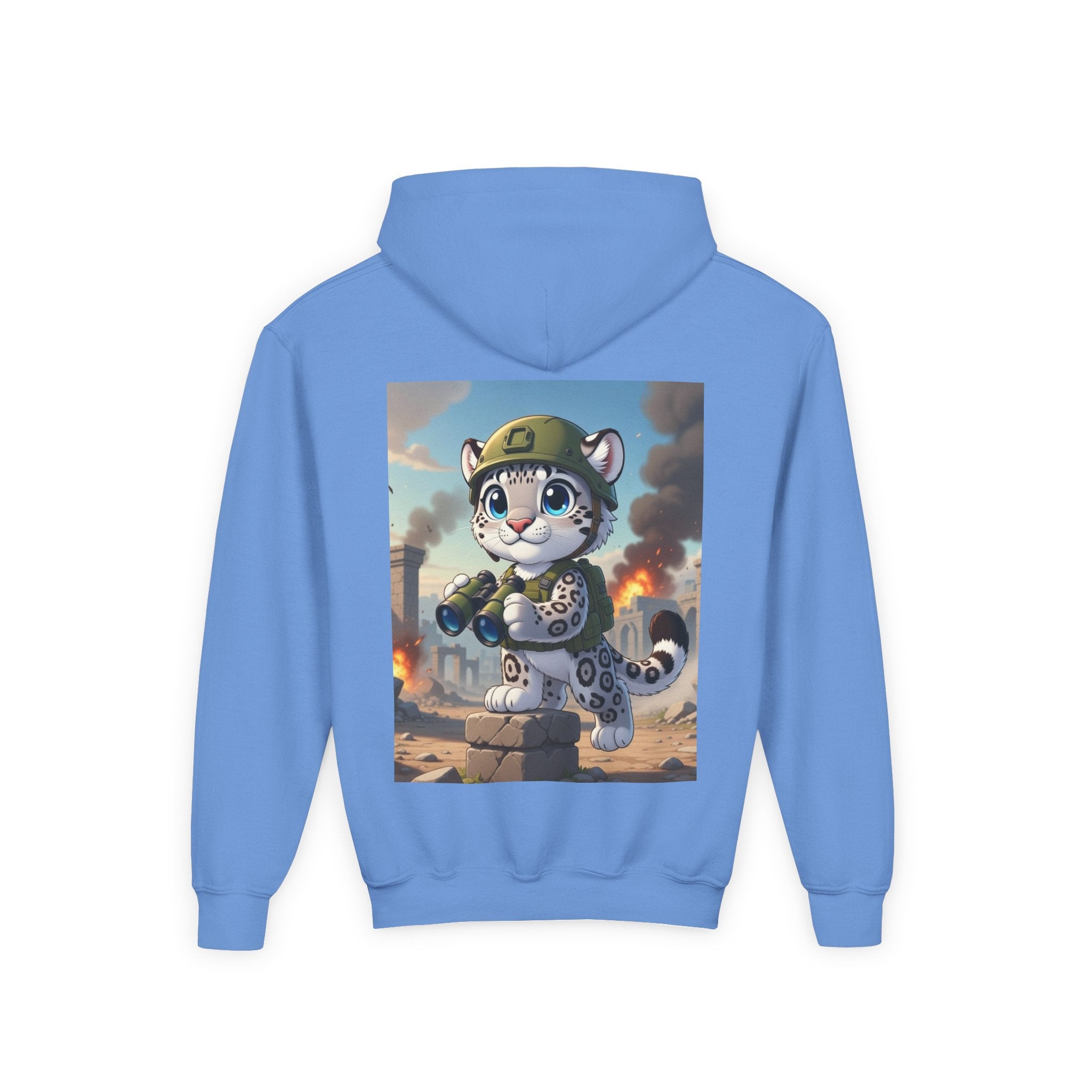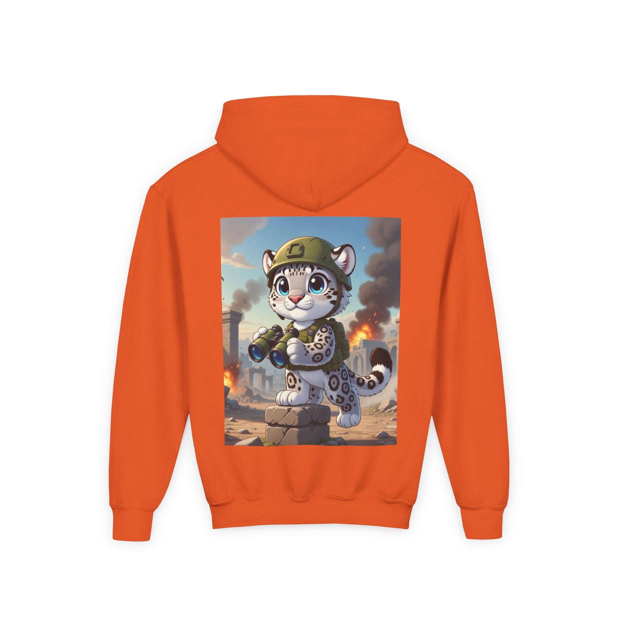 Snow Leopard Lookout Youth Heavy Blend Hooded Sweatshirt brings bold adventure and playful character to a cozy everyday layer. The artwork features a snow leopard standing proudly atop a stone block, holding binoculars and outfitted with a helmet and backpack, ready to scan the horizon. Set against an illustrated backdrop of weathered stone ruins, drifting smoke, and open sky, the scene is rendered in a vivid cartoon-inspired style with strong color contrast and crisp detail that captures curiosity, courage, and a spirit of exploration.