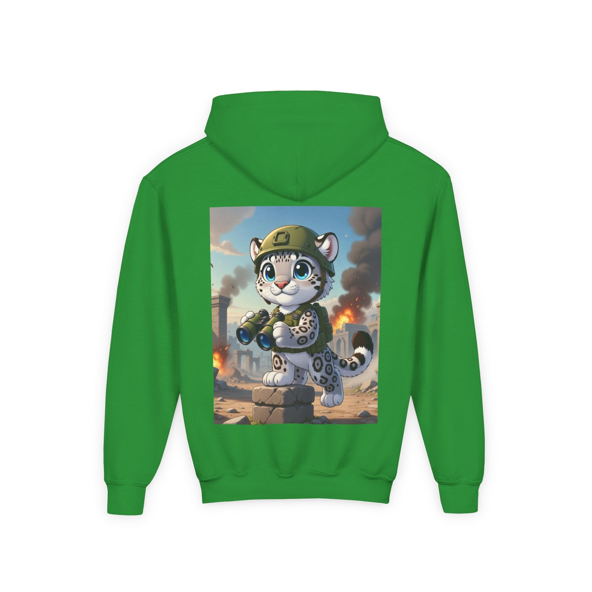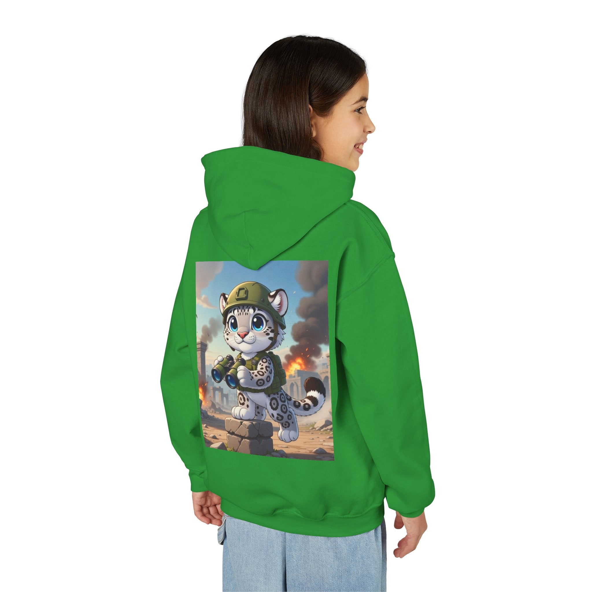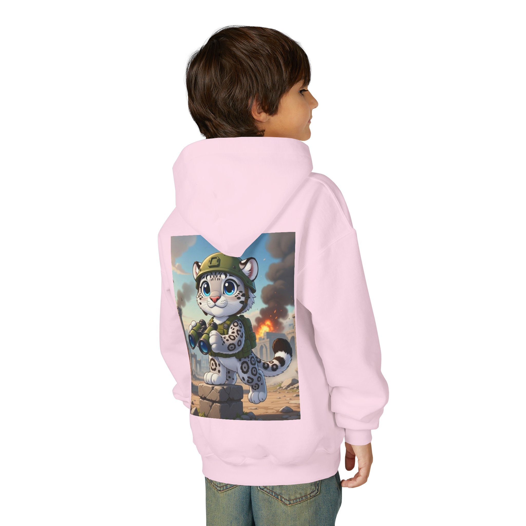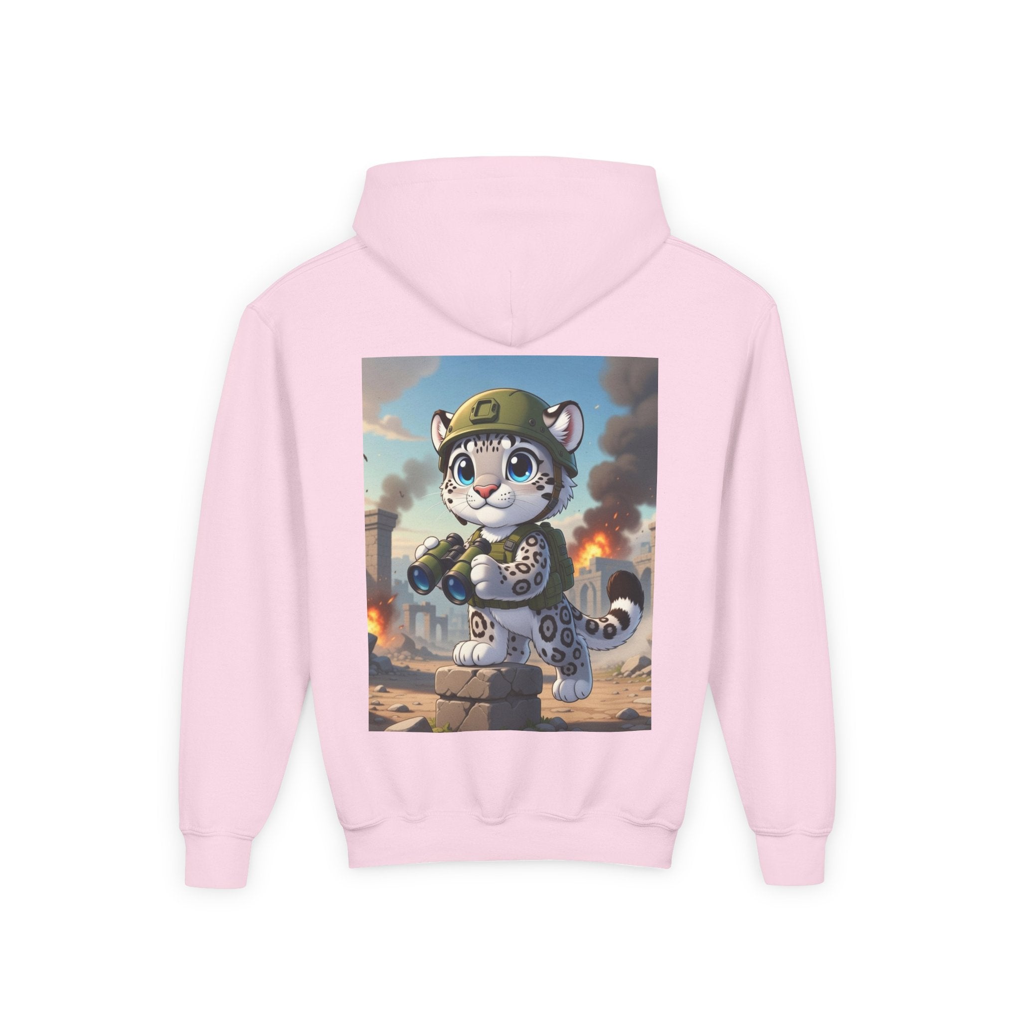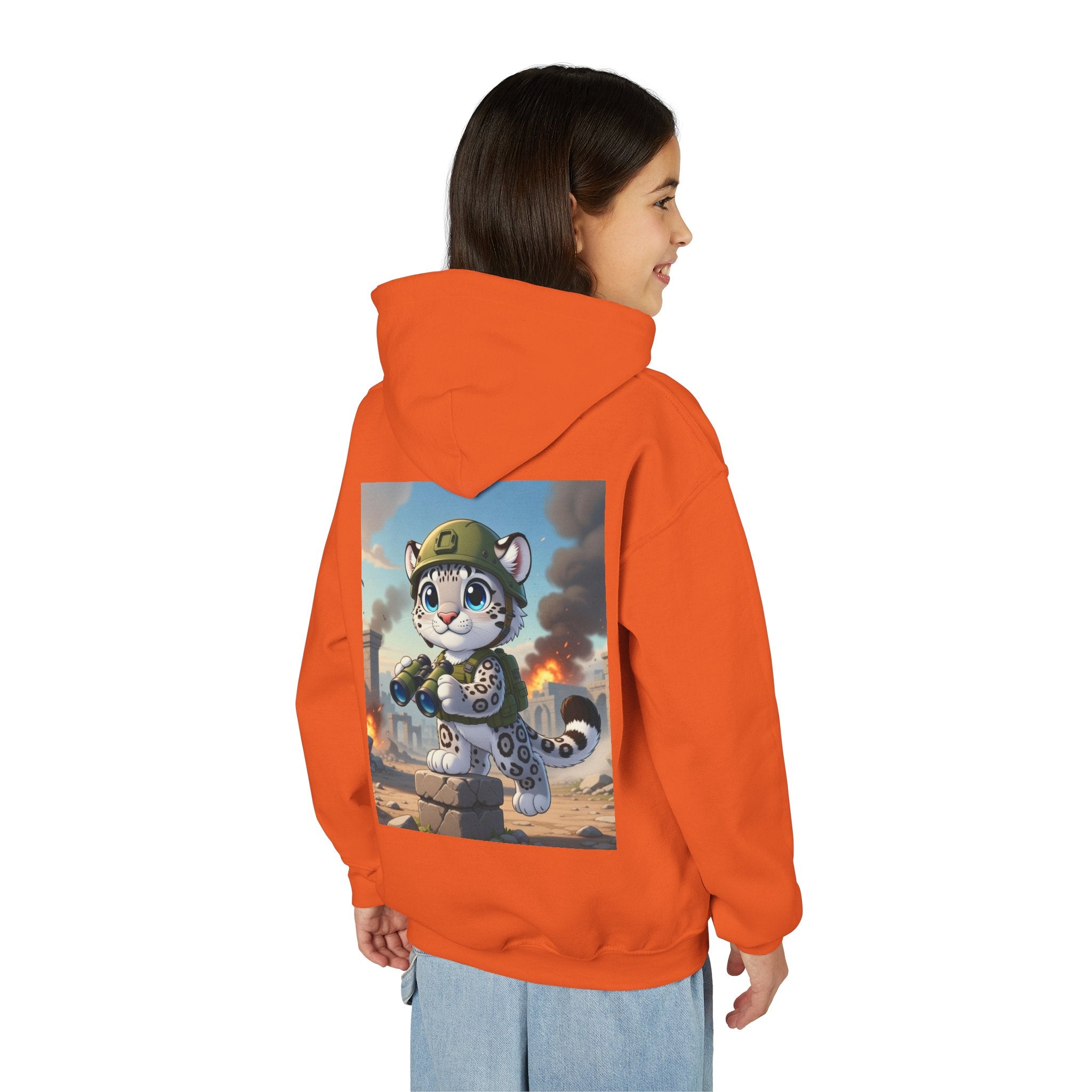 Snow Leopard Lookout Youth Heavy Blend Hooded Sweatshirt brings bold adventure and playful character to a cozy everyday layer. The artwork features a snow leopard standing proudly atop a stone block, holding binoculars and outfitted with a helmet and backpack, ready to scan the horizon. Set against an illustrated backdrop of weathered stone ruins, drifting smoke, and open sky, the scene is rendered in a vivid cartoon-inspired style with strong color contrast and crisp detail that captures curiosity, courage, and a spirit of exploration.