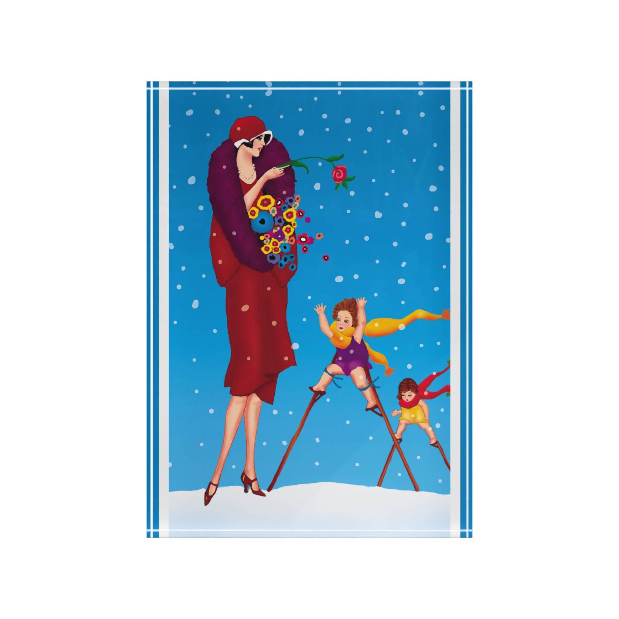 The design features a glamorous woman in a crimson dress and cloche hat, draped in a purple fur stole and pearls. She holds a rose and blossoms against a snowy blue sky, while two children in colorful scarves play on stilts nearby. Snow drifts softly, blending couture sophistication with playful winter charm.