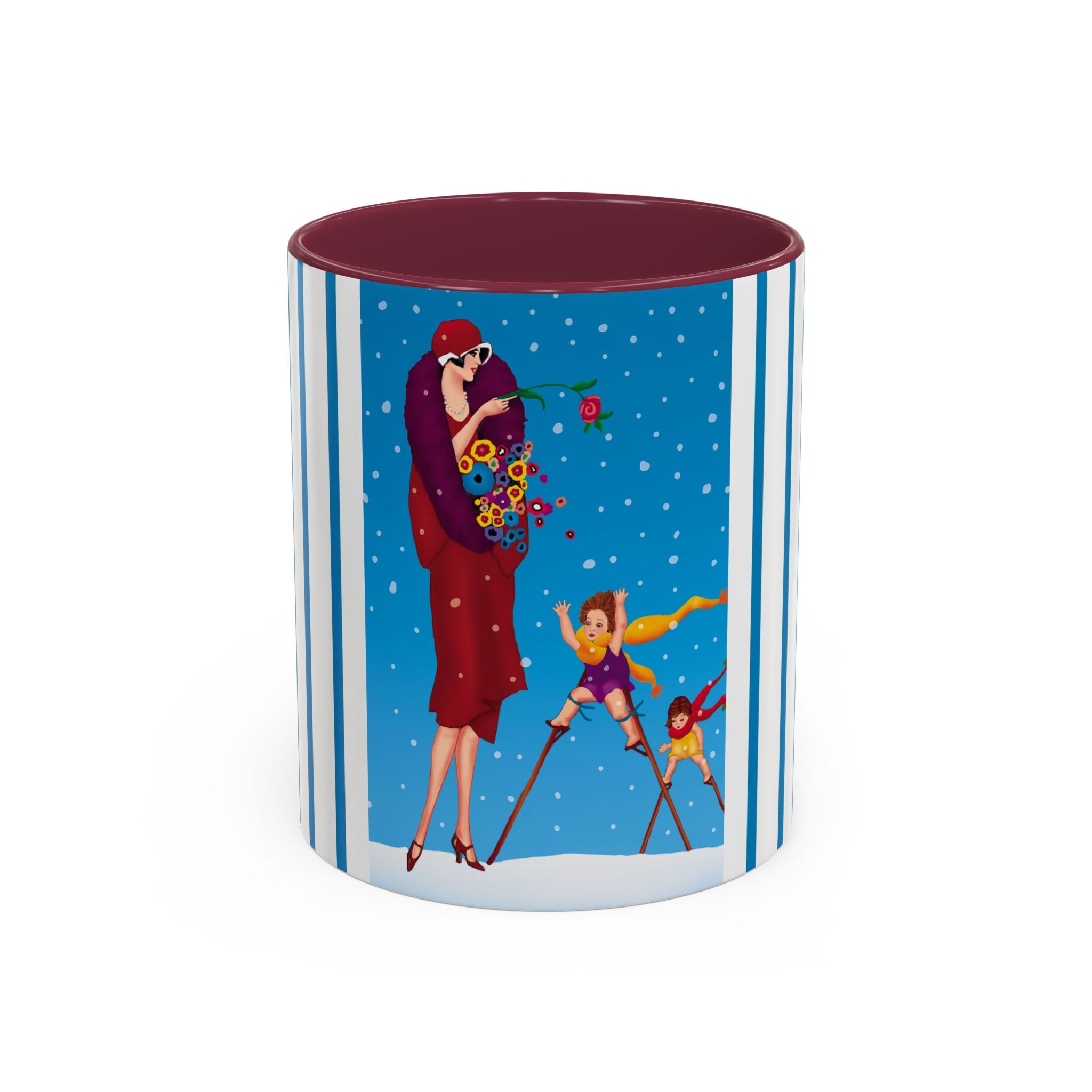 The design captures a glamorous woman in a crimson dress and cloche hat, draped in a purple fur stole and pearls. She holds a rose and a burst of blossoms, their vivid hues set against a snowy blue sky. Nearby, two playful children in bright scarves balance on stilts, their energy adding charm to the scene.