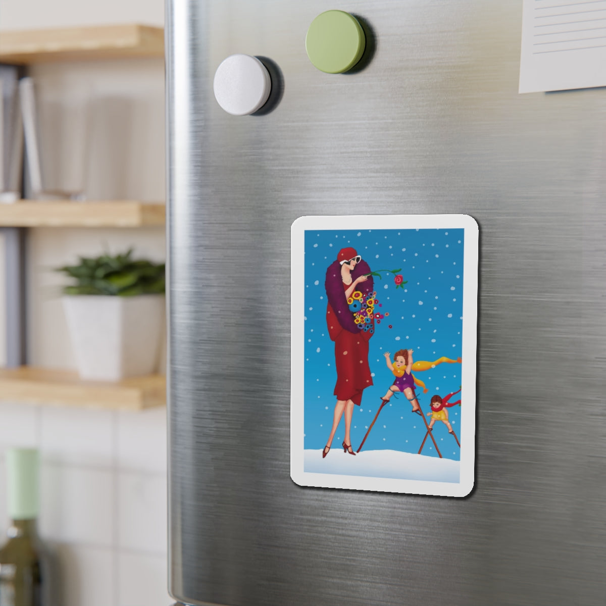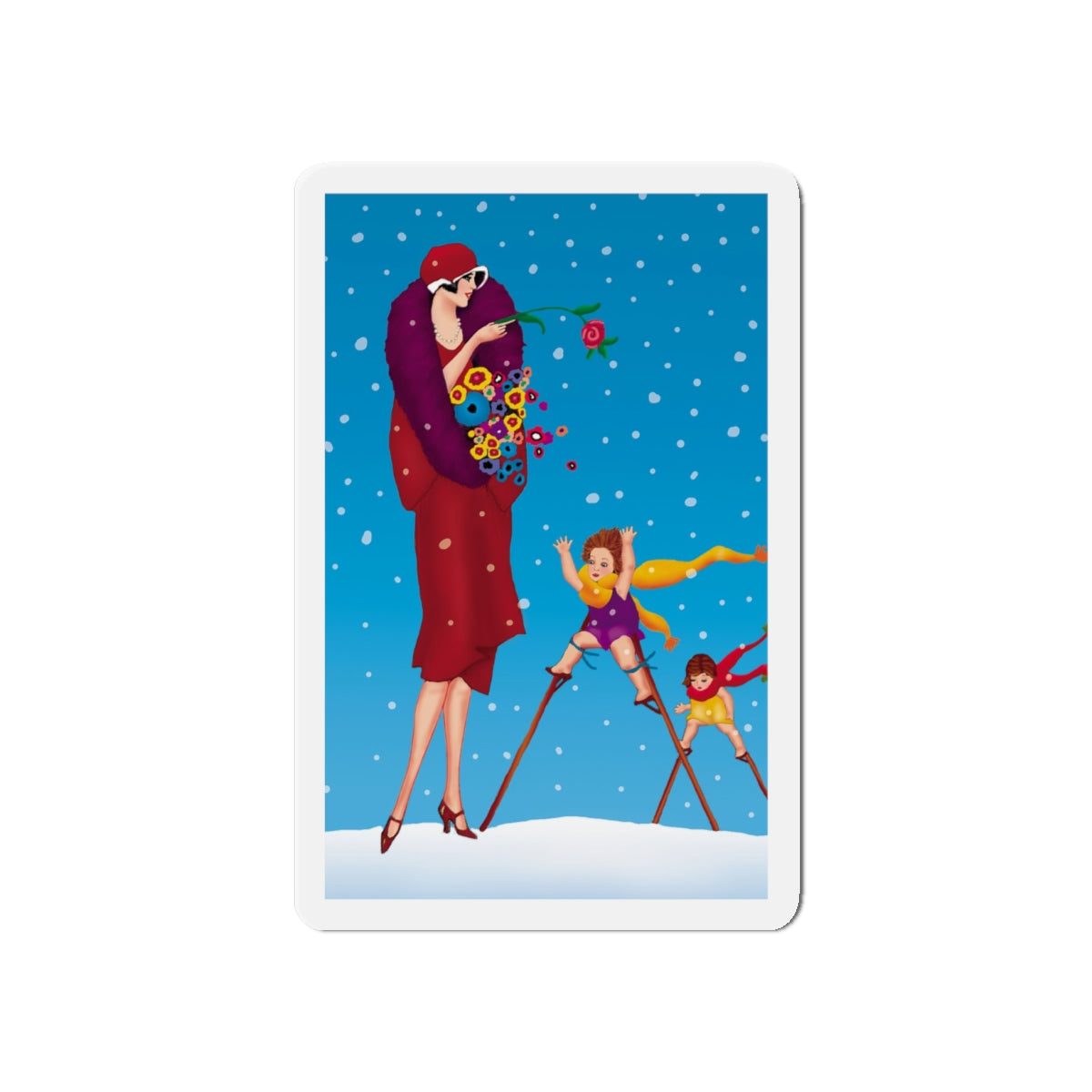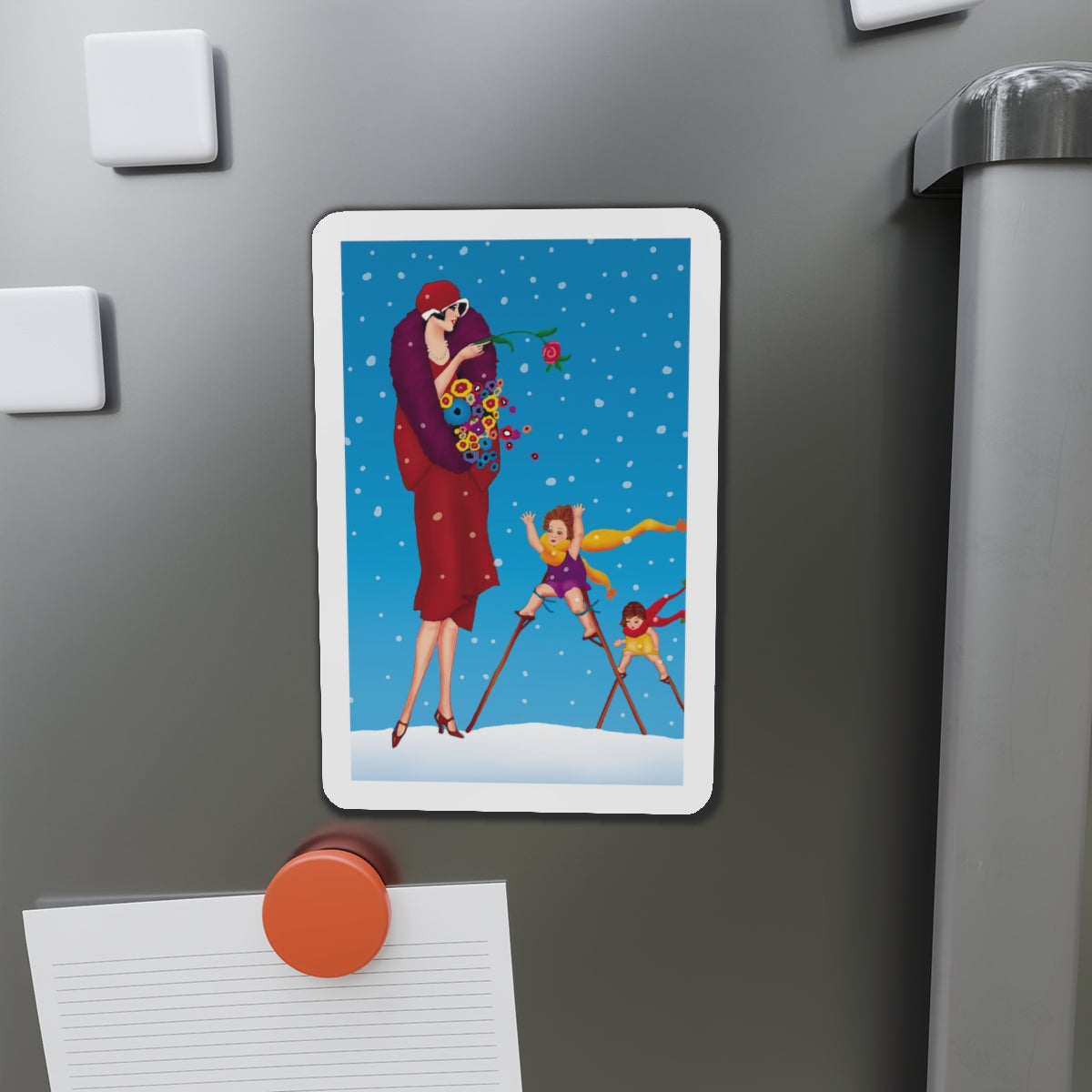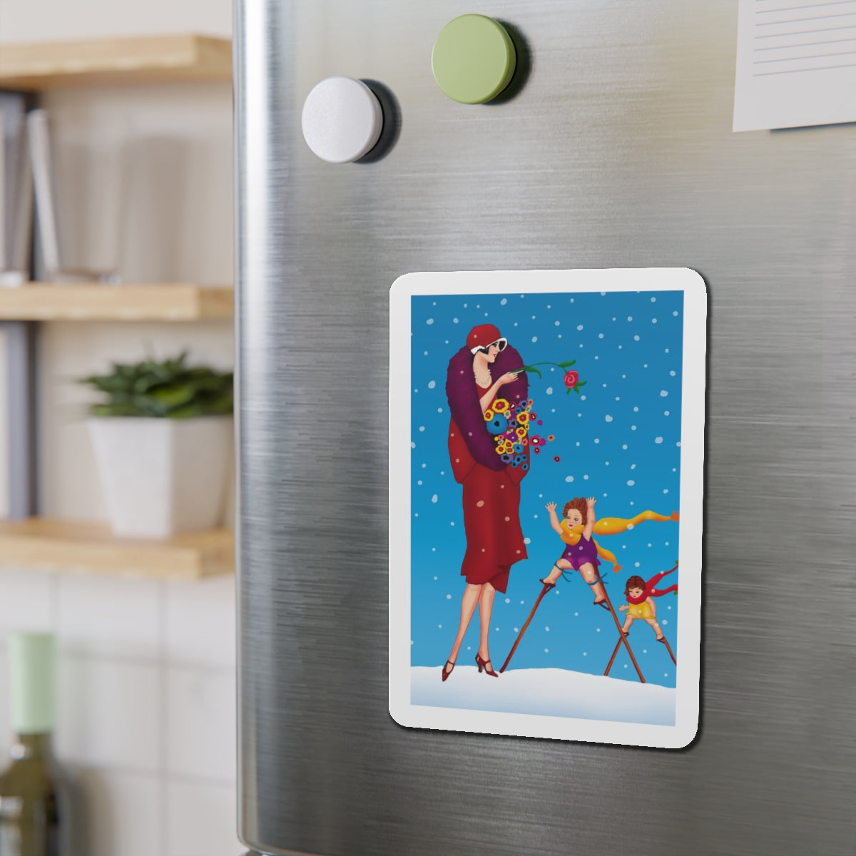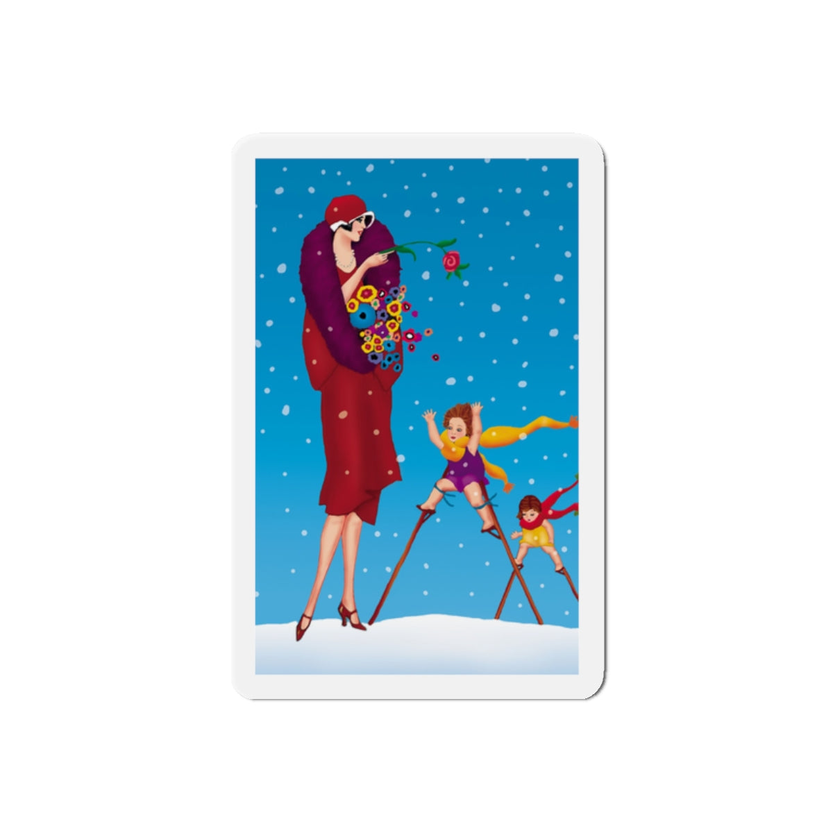 The artwork features a glamorous woman in a crimson dress and cloche hat, wrapped in a purple fur stole and pearls. She extends a rose and blossoms against a snowy sky, while two children in colorful scarves play on stilts nearby. Snow drifts softly, blending couture sophistication with playful winter charm.