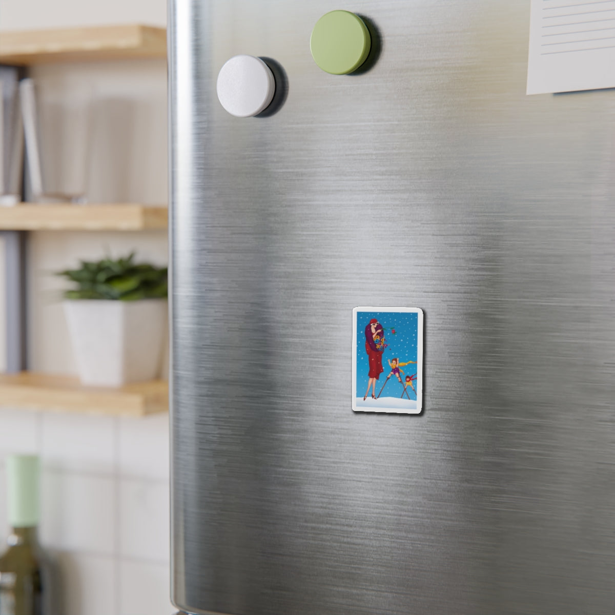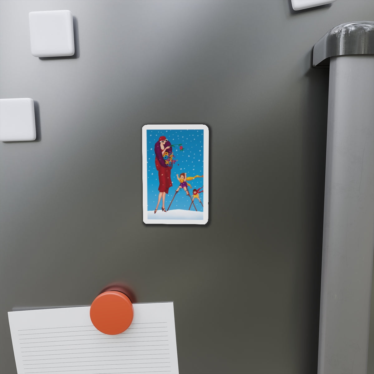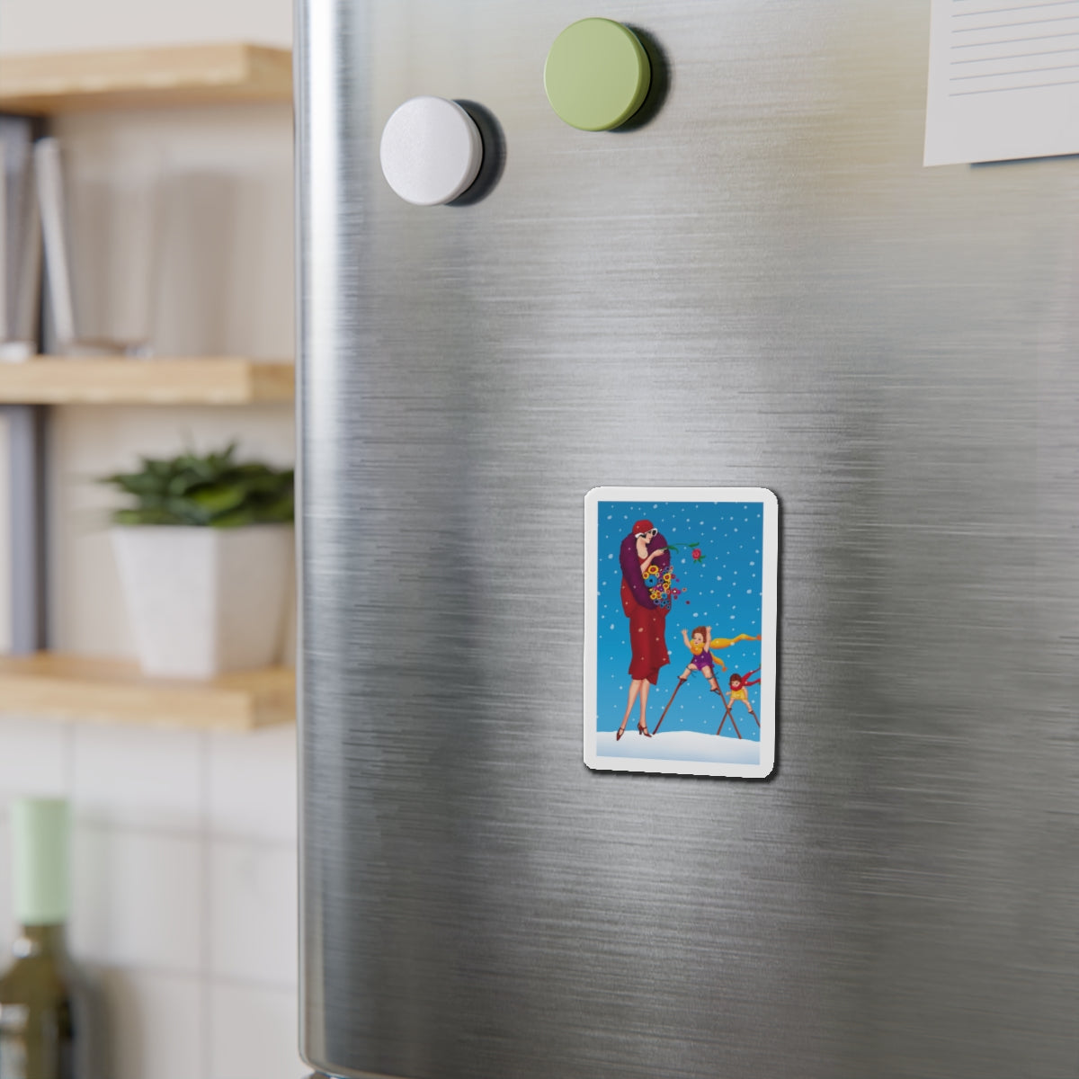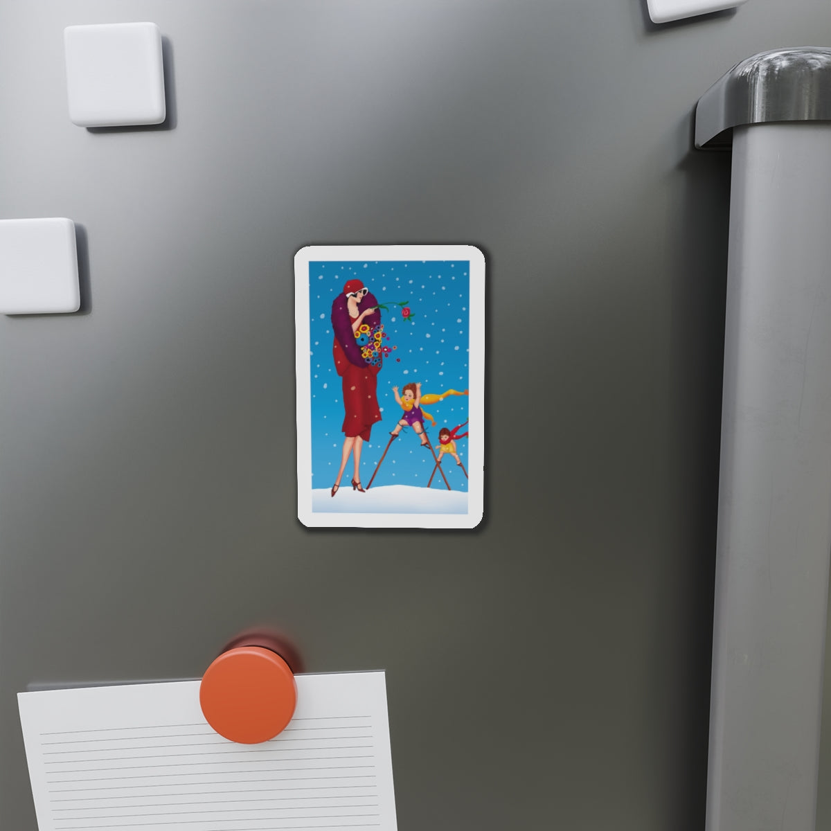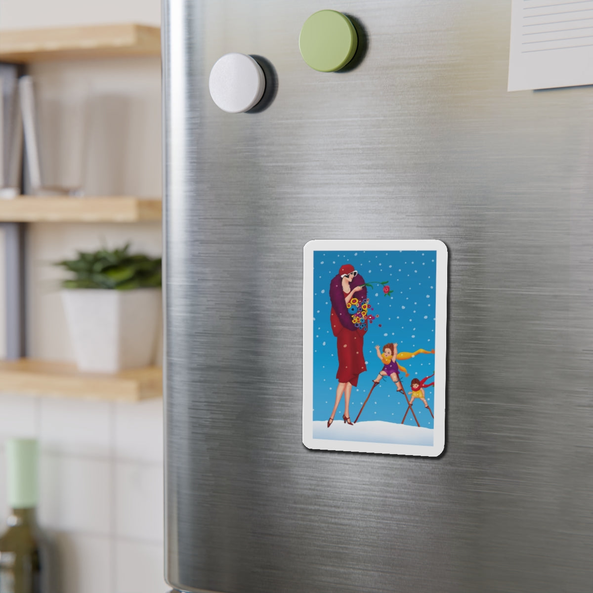 The artwork features a glamorous woman in a crimson dress and cloche hat, wrapped in a purple fur stole and pearls. She extends a rose and blossoms against a snowy sky, while two children in colorful scarves play on stilts nearby. Snow drifts softly, blending couture sophistication with playful winter charm.