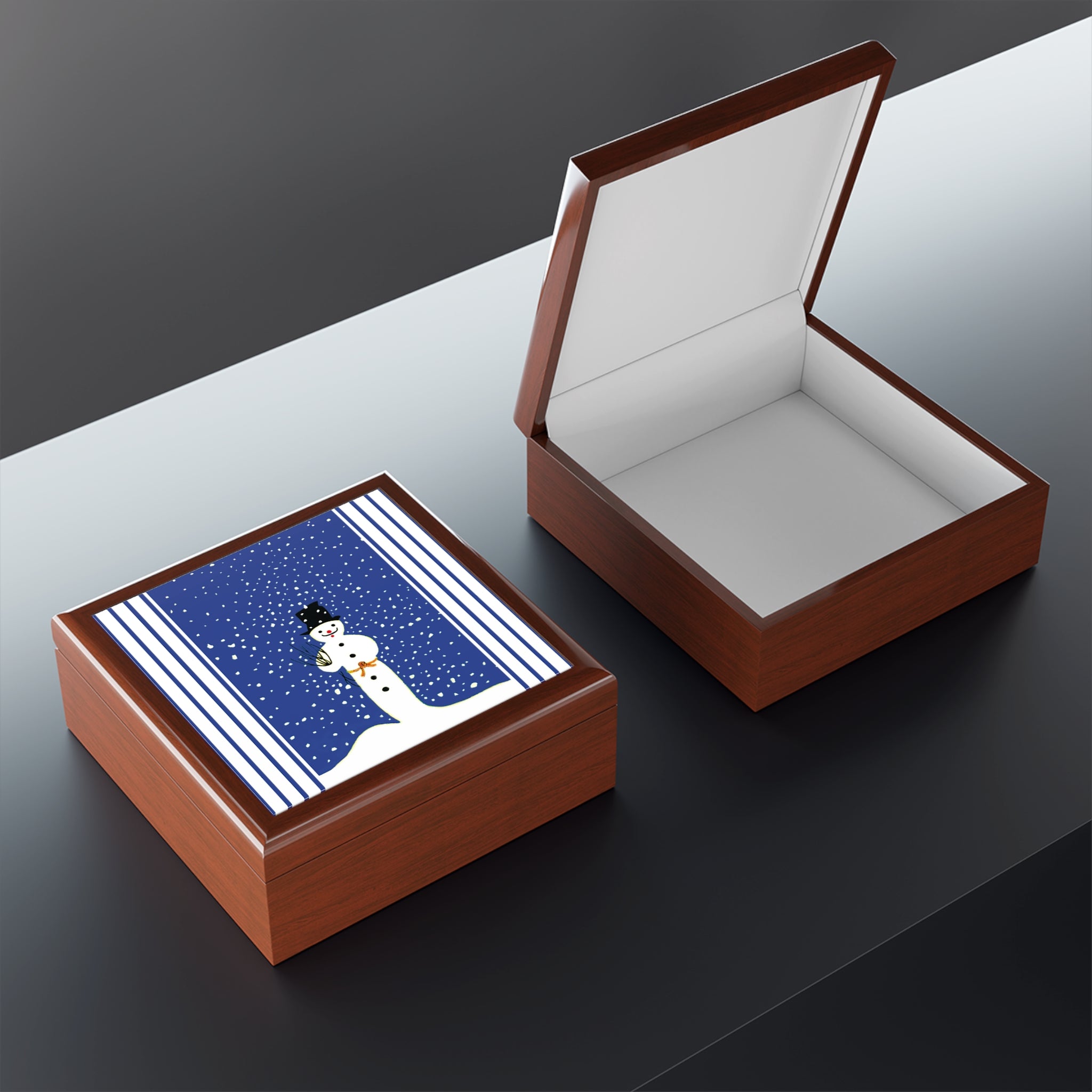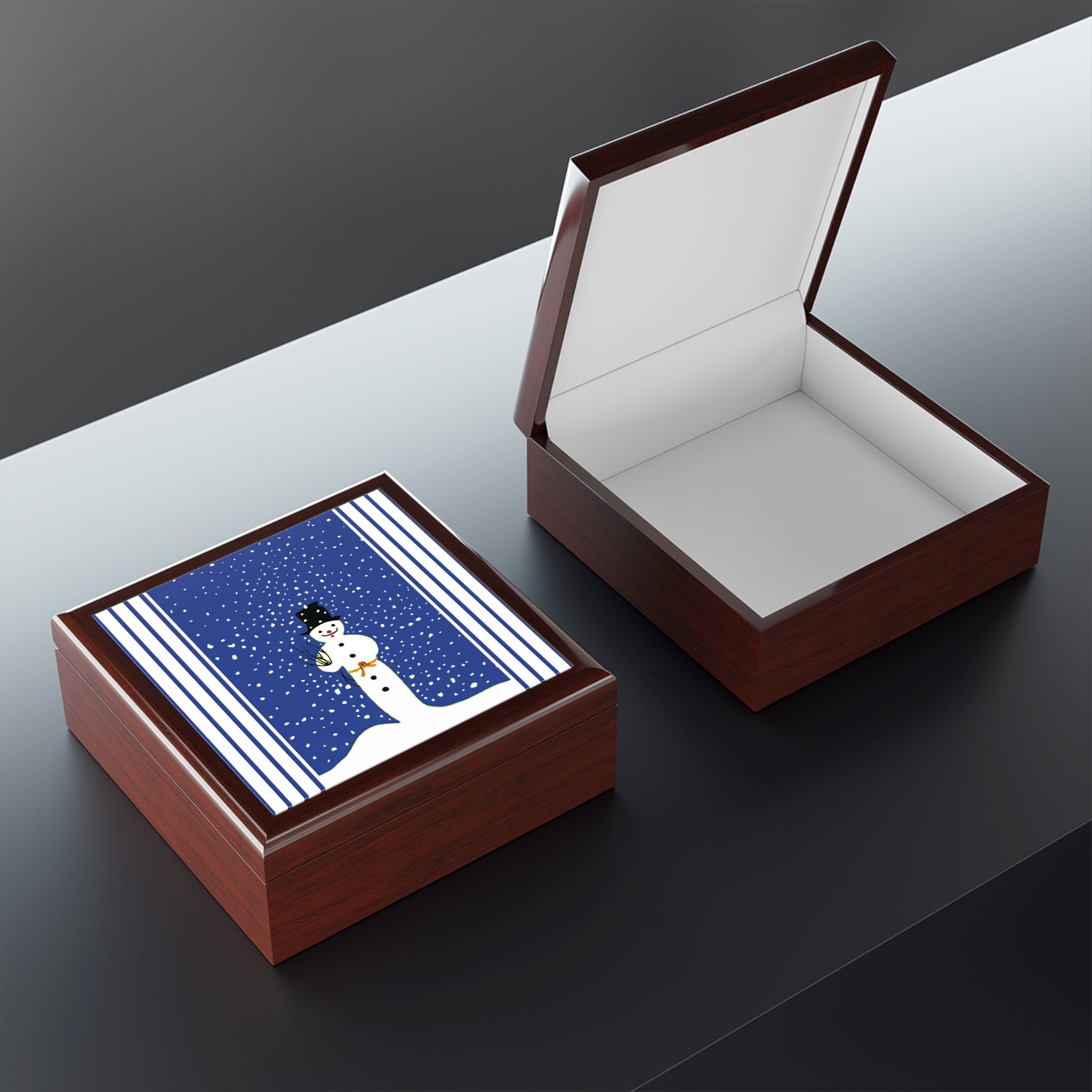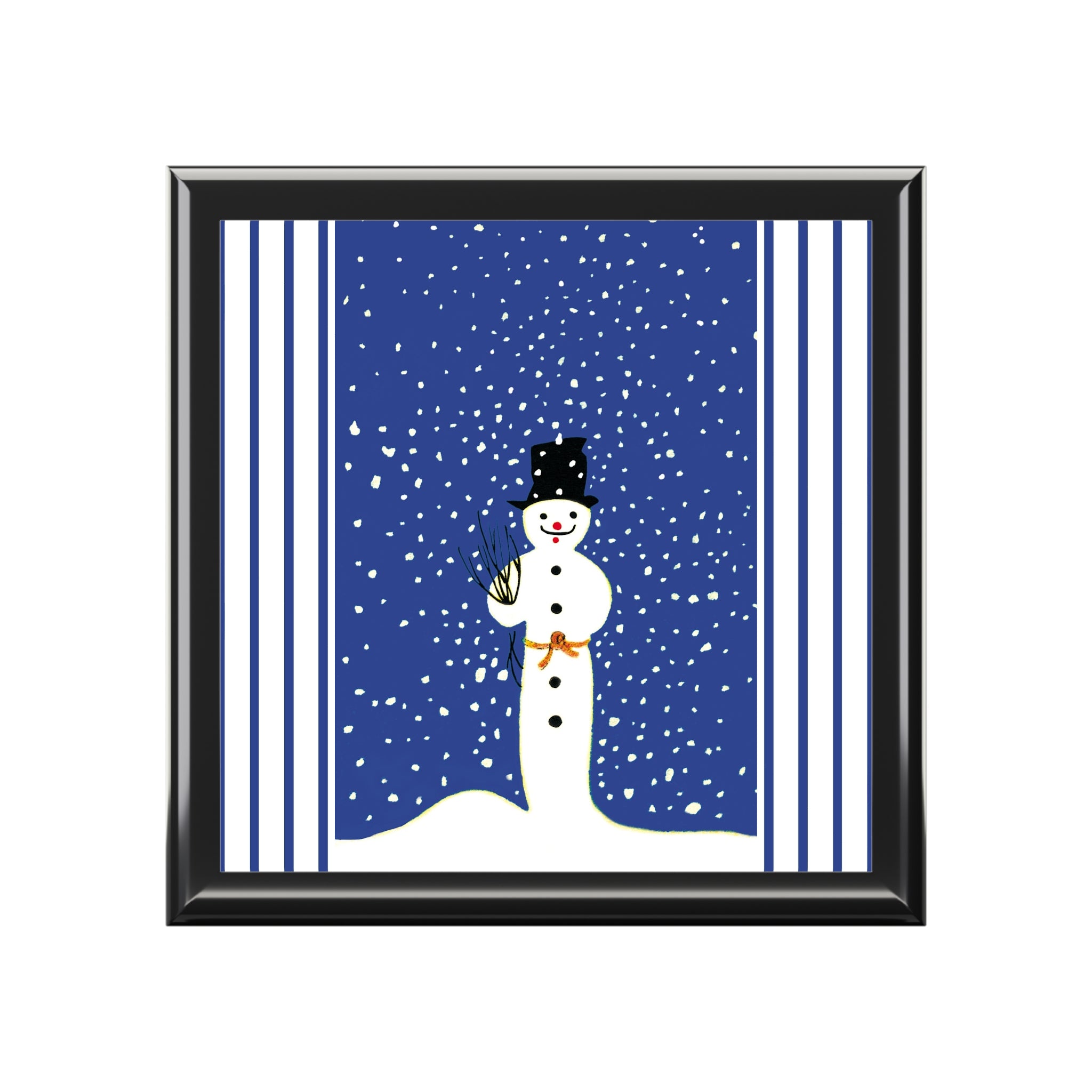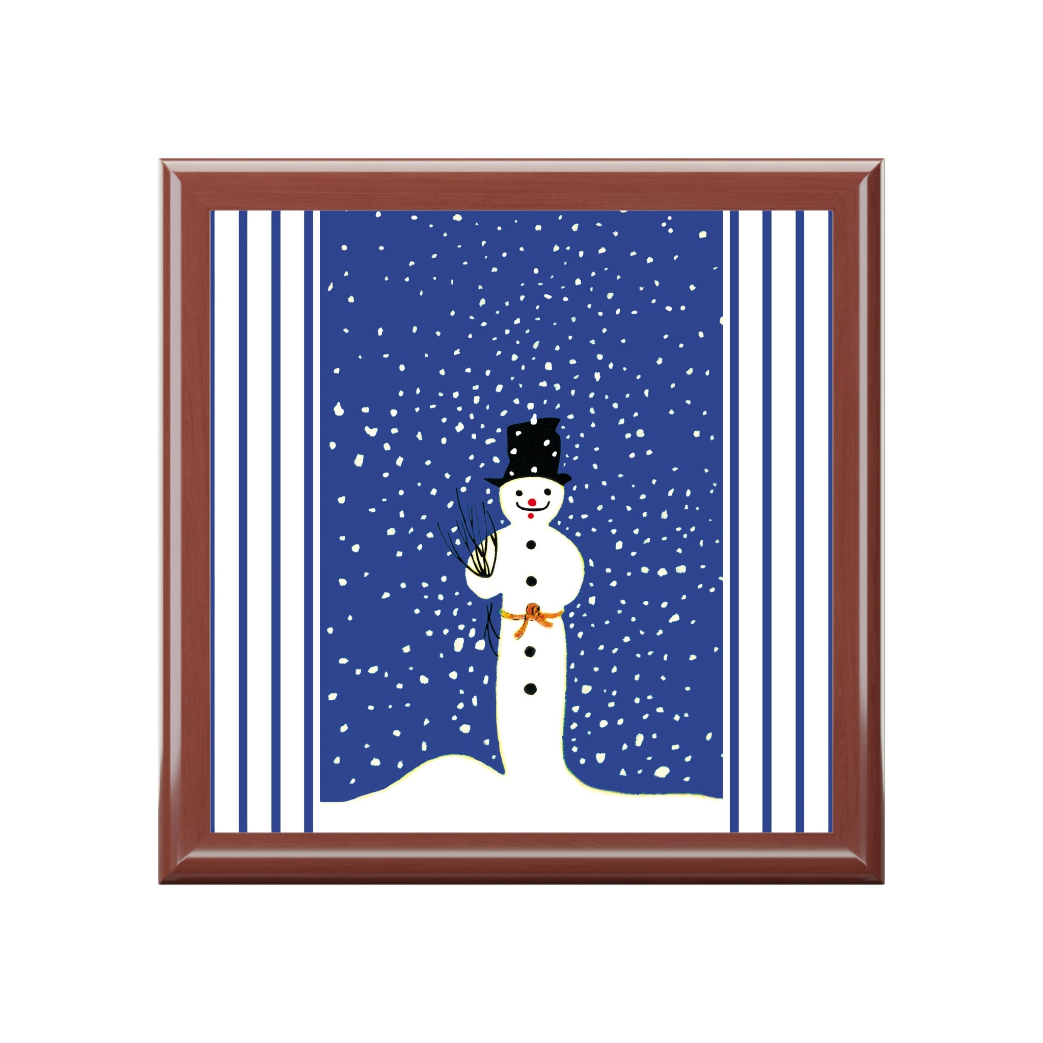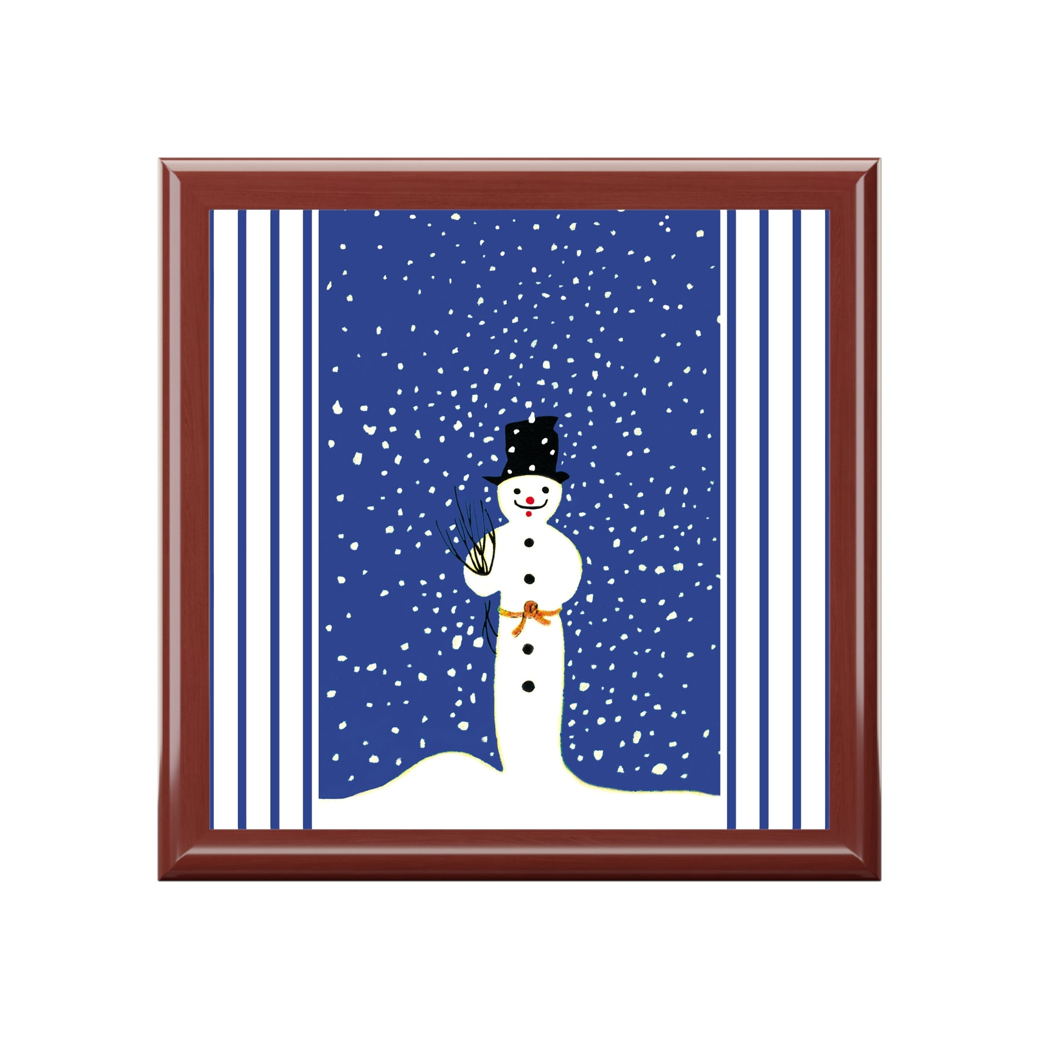 On the lid, the Snowman in Falling Snow artwork brings classic winter charm. A cheerful snowman in a black top hat, carrot nose, and bright red smile stands beneath a cobalt-blue sky as snowflakes drift around him. A rustic twig bundle rests in his arm, tied with an orange ribbon for a playful touch.