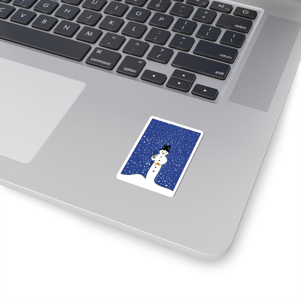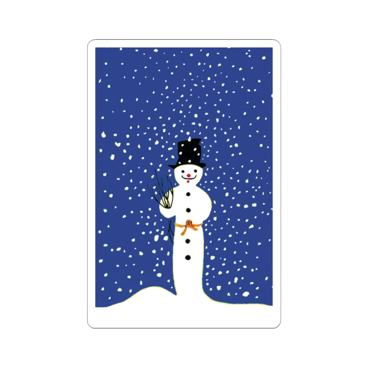 The artwork features a cheerful snowman in a black top hat with coal buttons, carrot nose, and a bright red smile, standing beneath a cobalt-blue sky as snowflakes fall. A twig bundle in his arm and an orange ribbon at his waist add playful detail, capturing the nostalgic joy of snowy winter nights.
