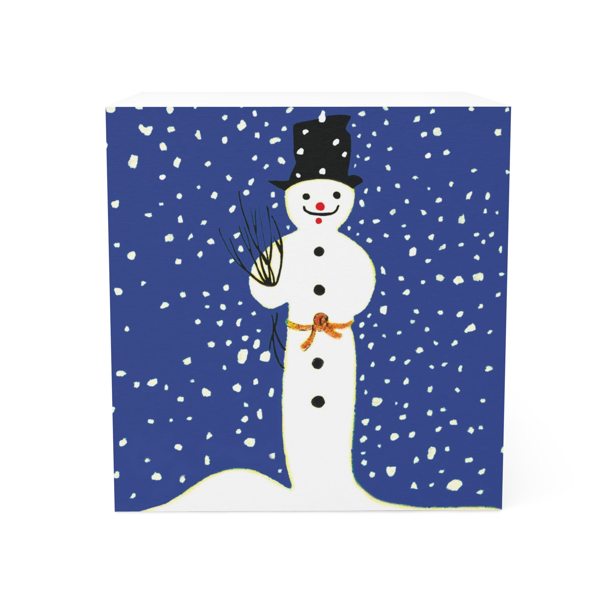 The design adds winter charm—a cheerful snowman in a black top hat with coal buttons, carrot nose, and bright red smile stands beneath a cobalt-blue sky as snowflakes fall. A bundle of twigs and a playful orange ribbon bring warmth to the frosty scene, capturing the nostalgic magic of snowy nights.
