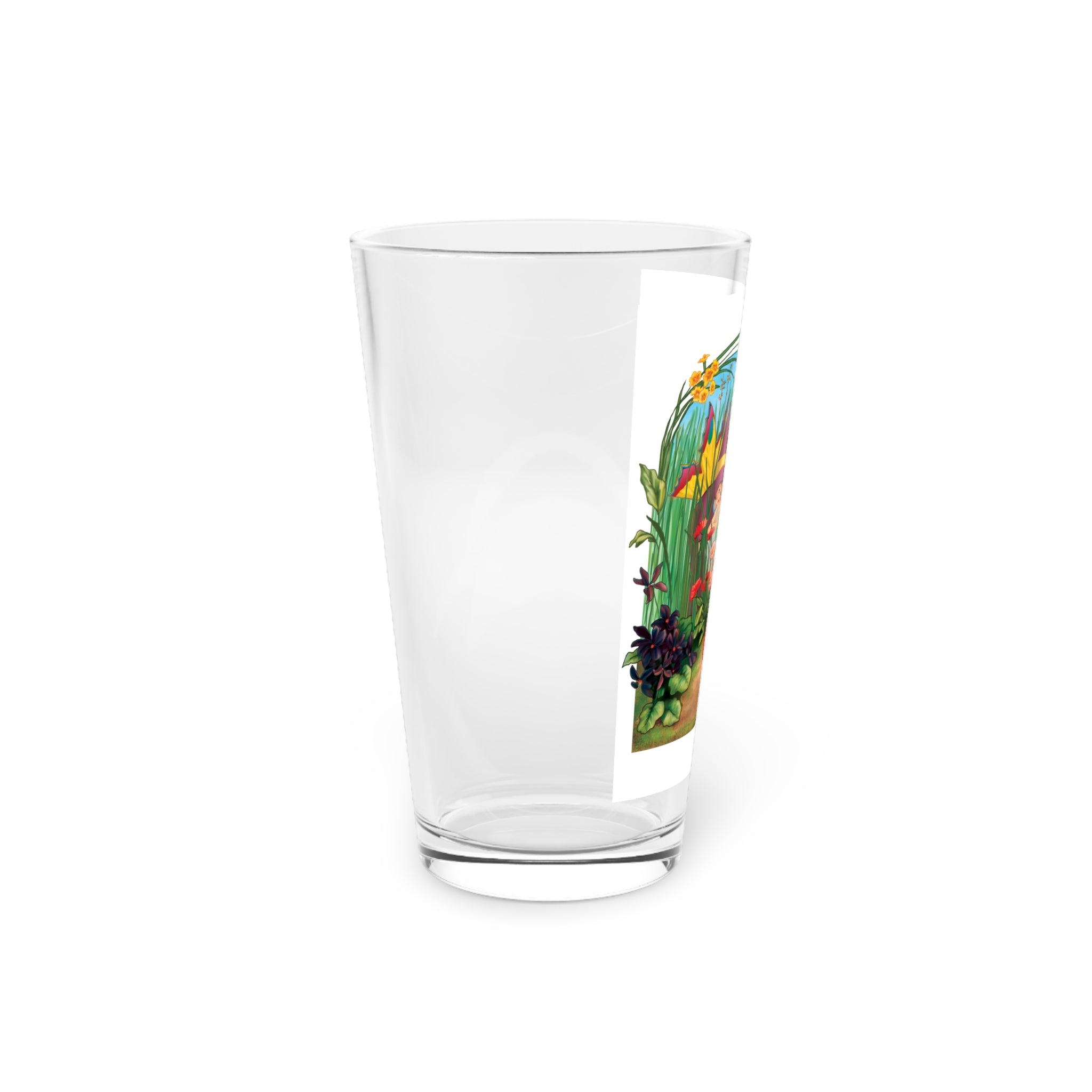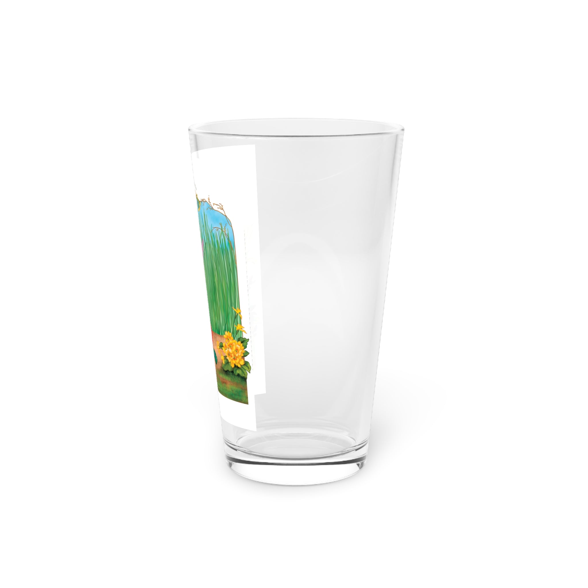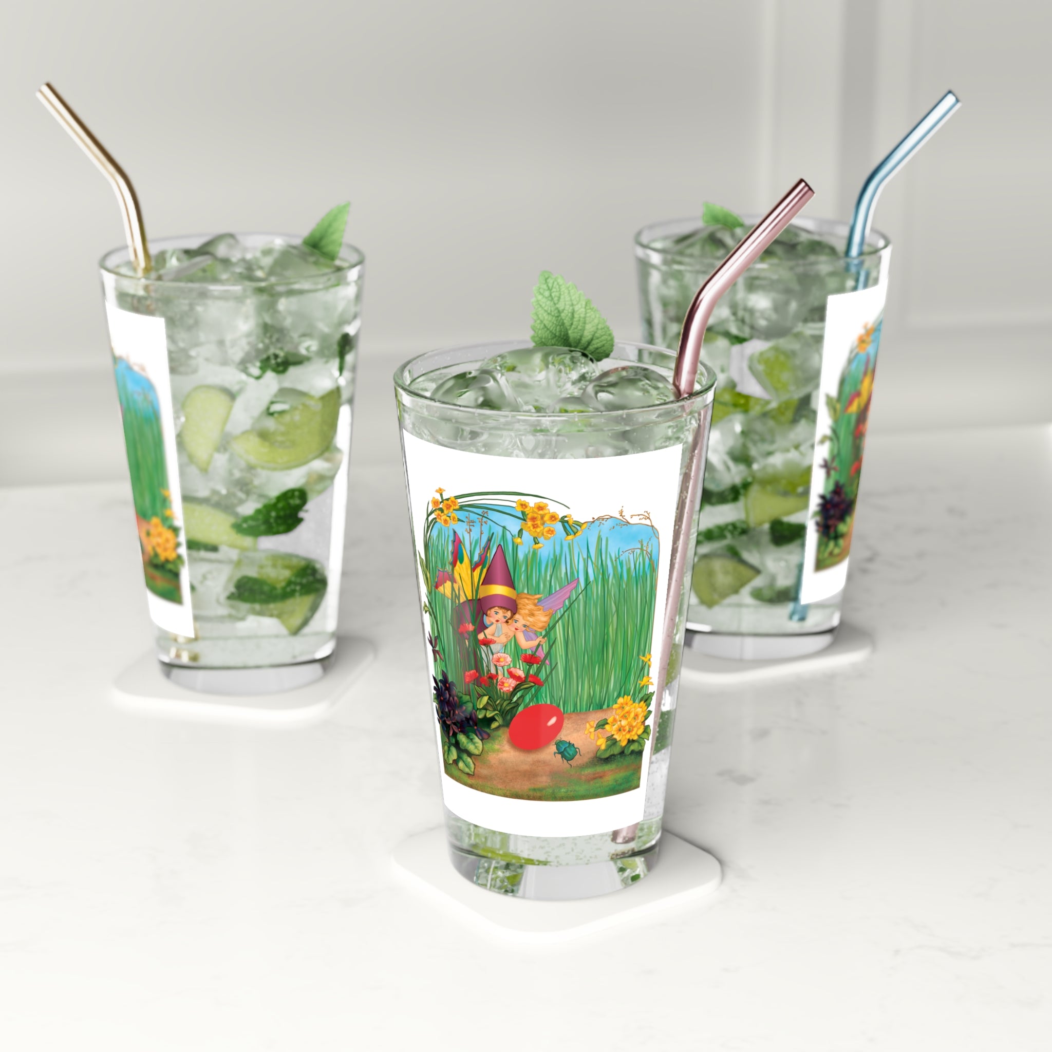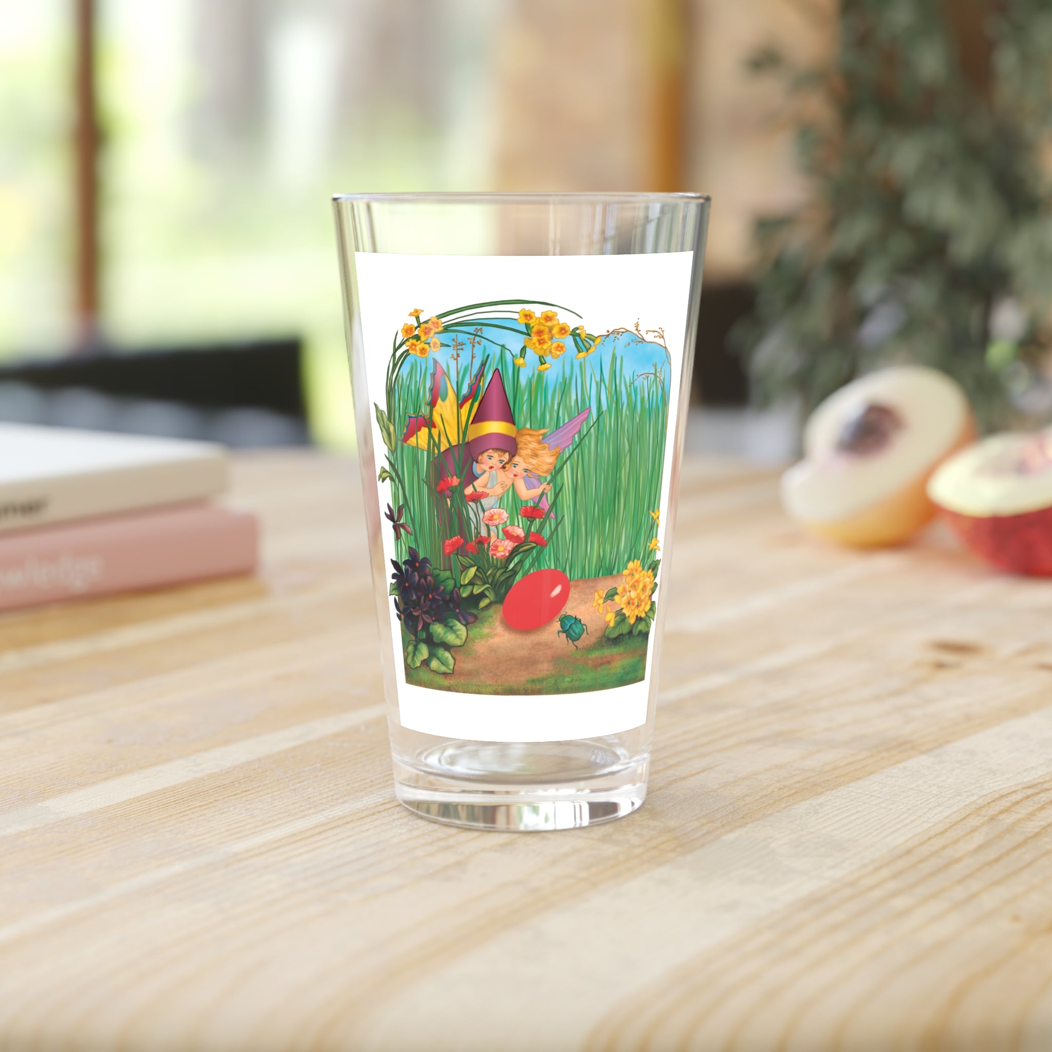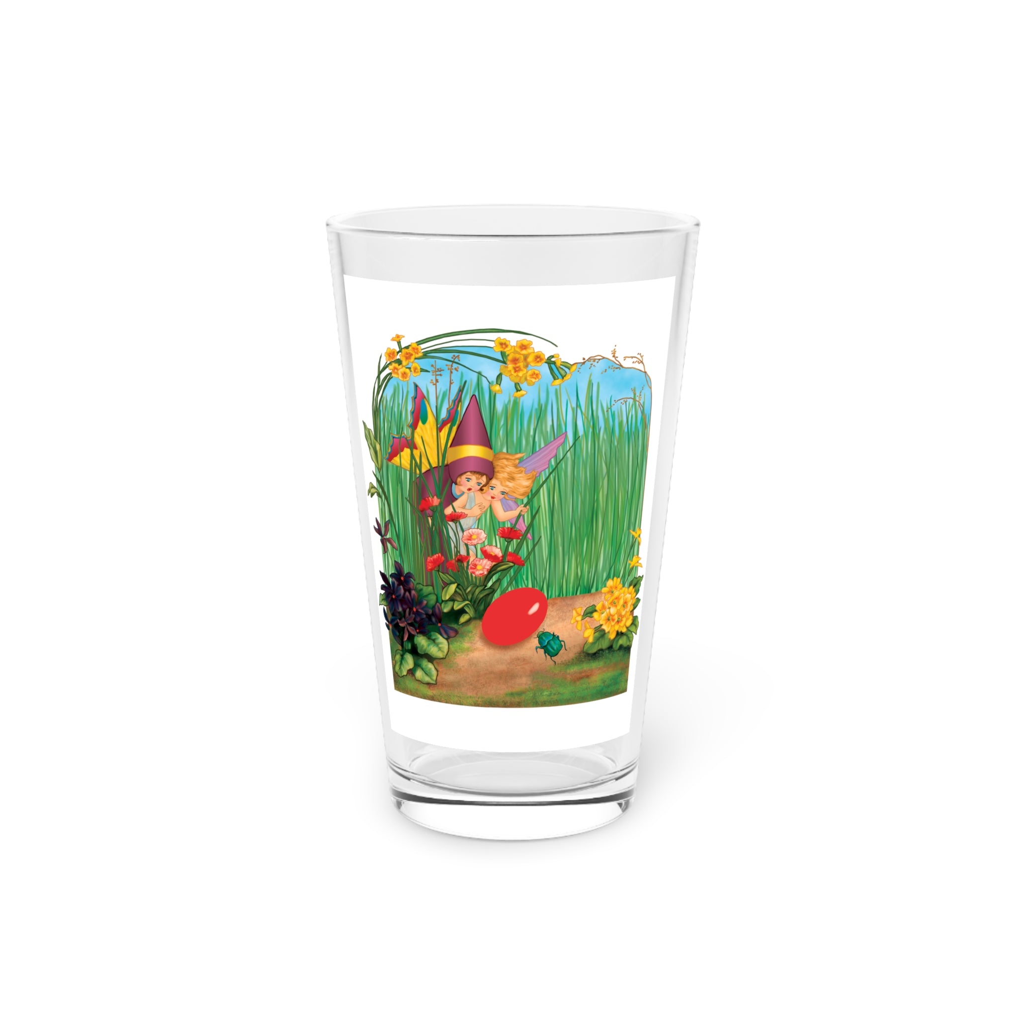 Celebrate the magic of spring with this beautifully designed 16oz pint glass, featuring an enchanting scene of two young fairies in vibrant hues. In a serene meadow filled with bright yellow and deep purple blossoms, they stumble upon a large red Easter egg and a lively green beetle, capturing the whimsy of the season. A perfect blend of artistry and functionality, this glass adds a touch of vintage charm to any gathering.