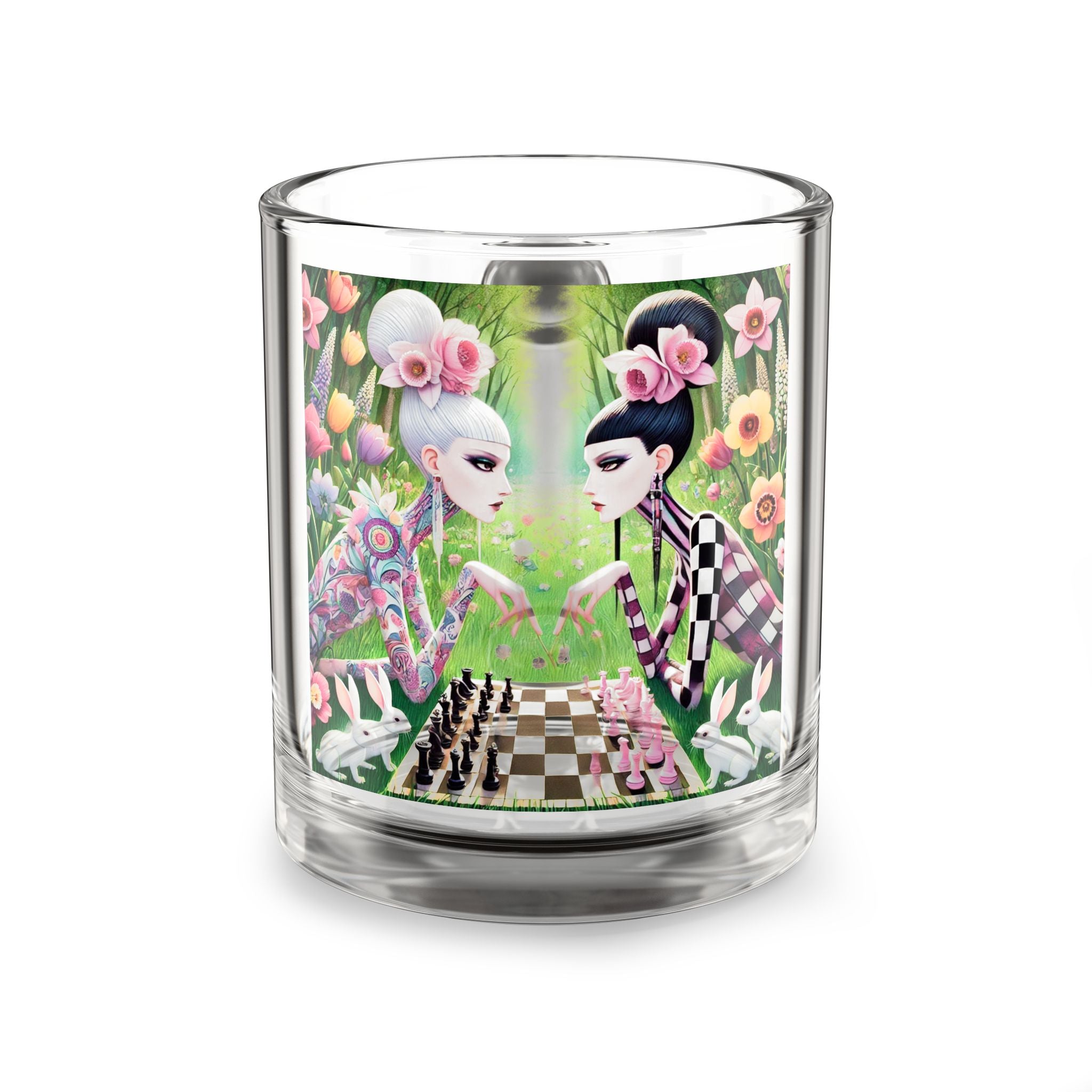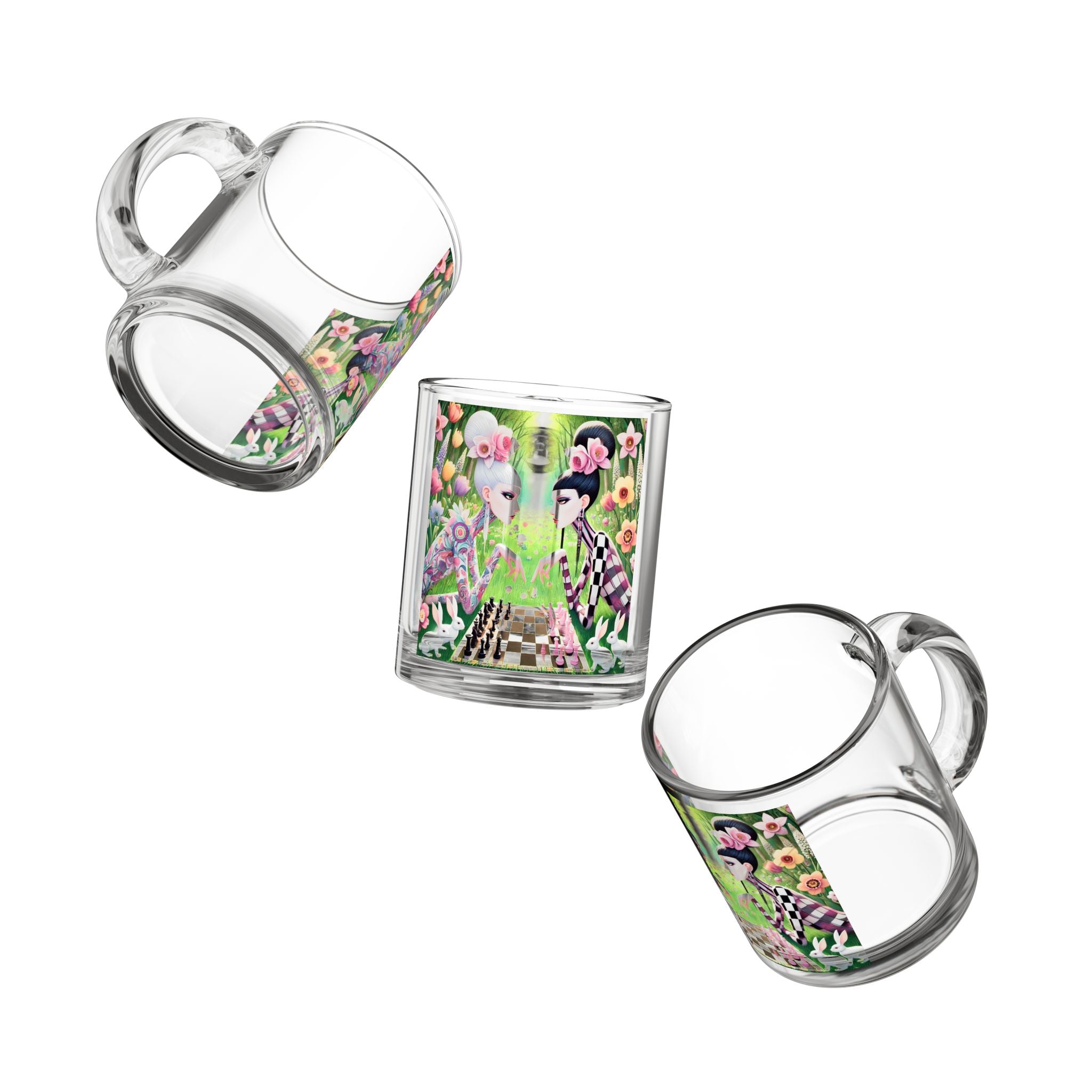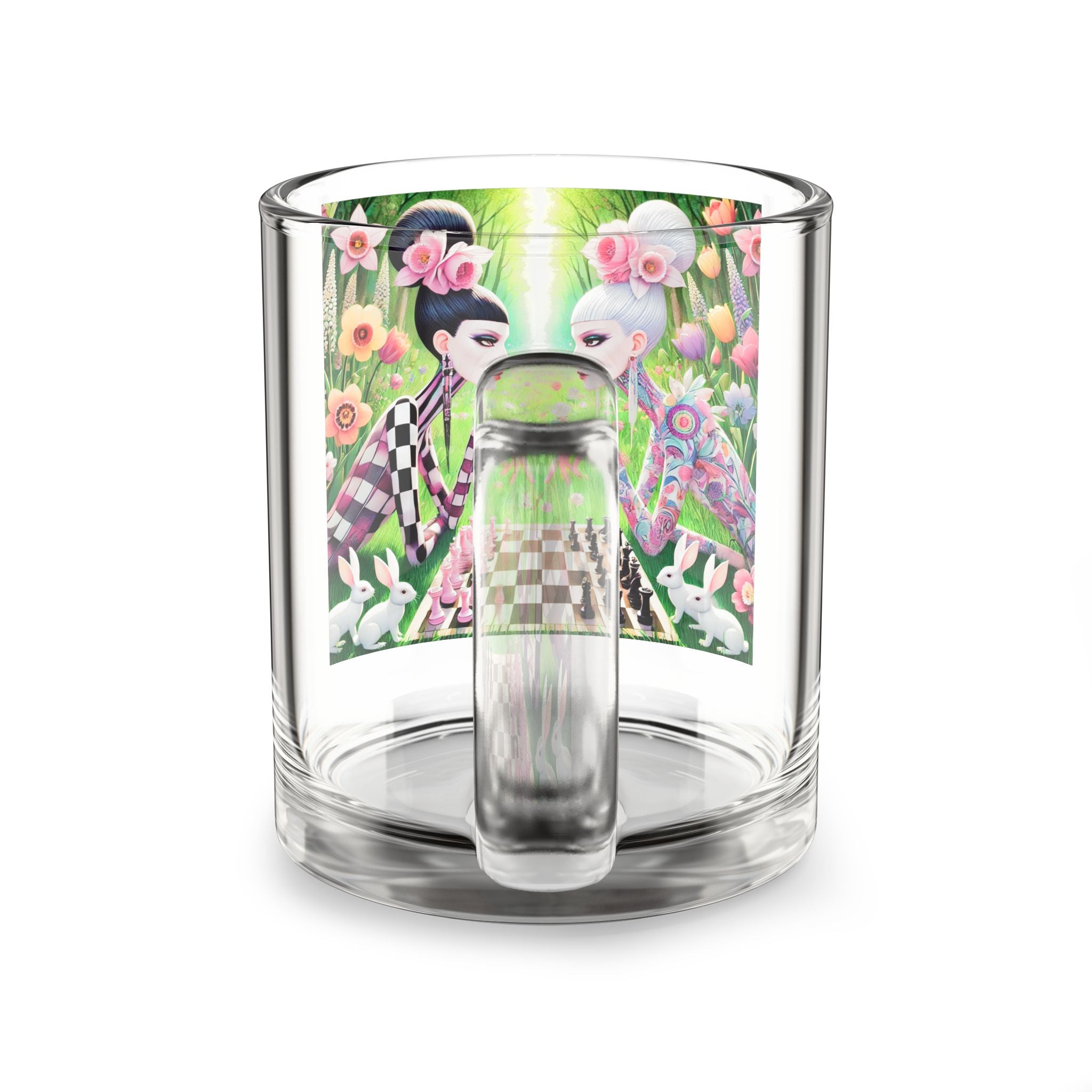Two edgy, stylish fairies face off in a whimsical chess match, surrounded by vibrant spring flowers and curious bunny rabbits—a playful scene where strategy meets the magic of spring, captured in vivid detail on this charming mug.