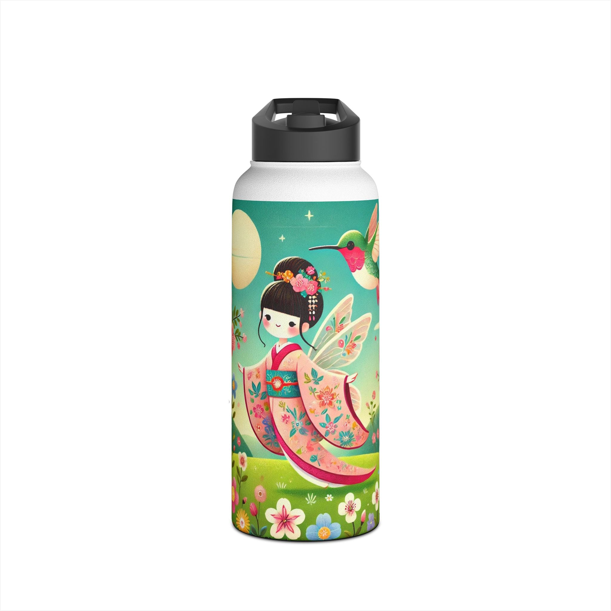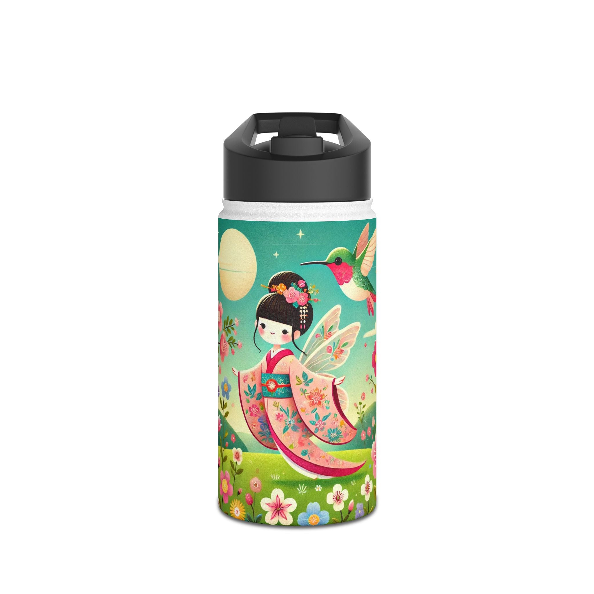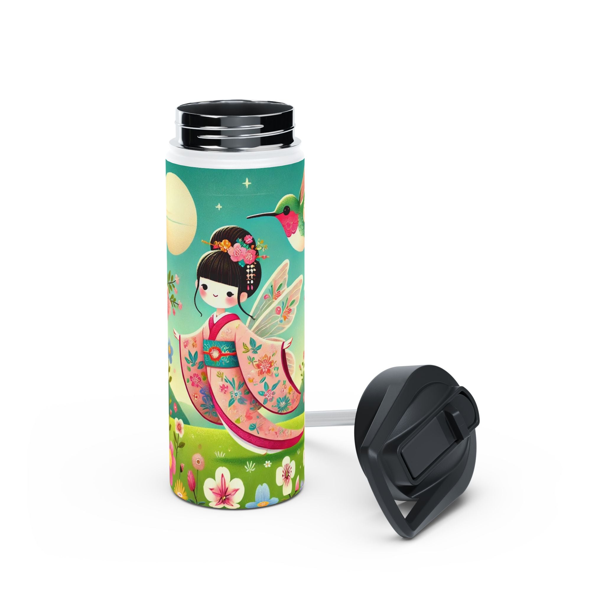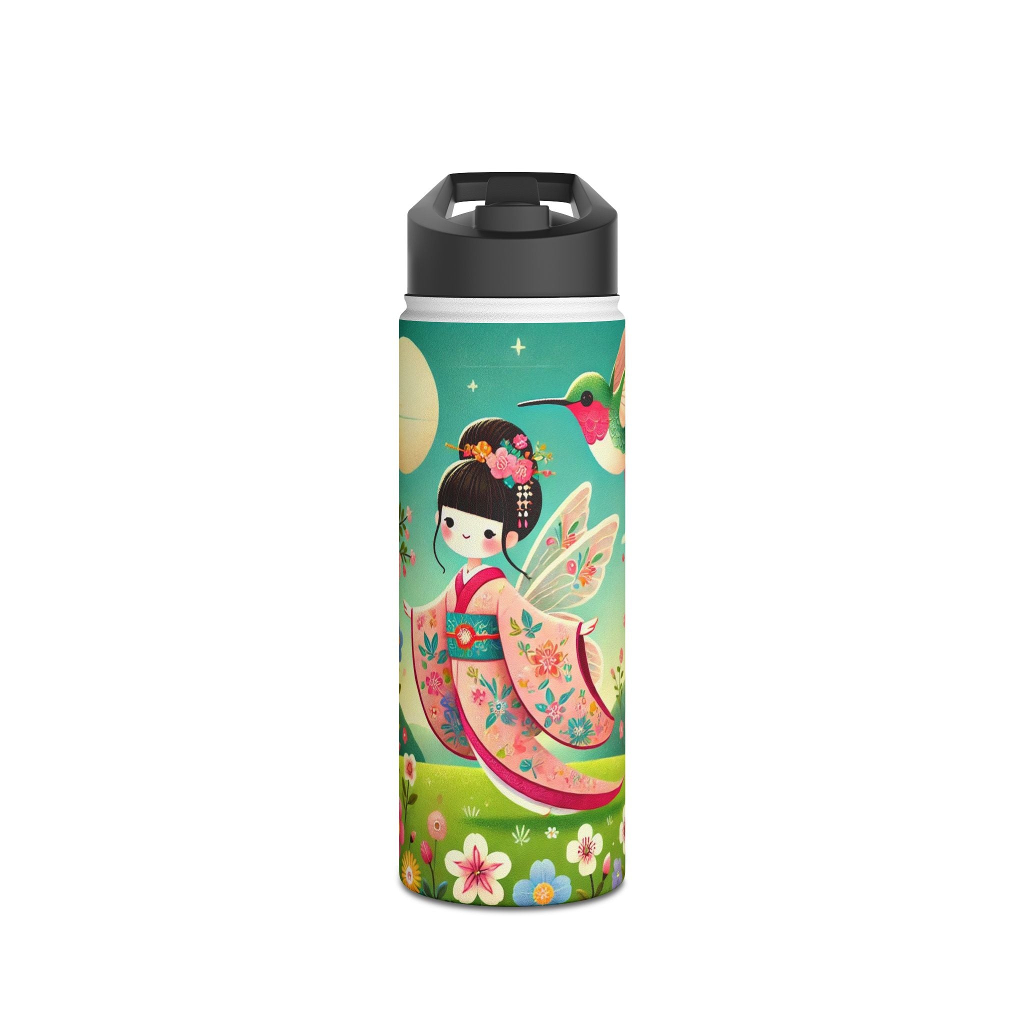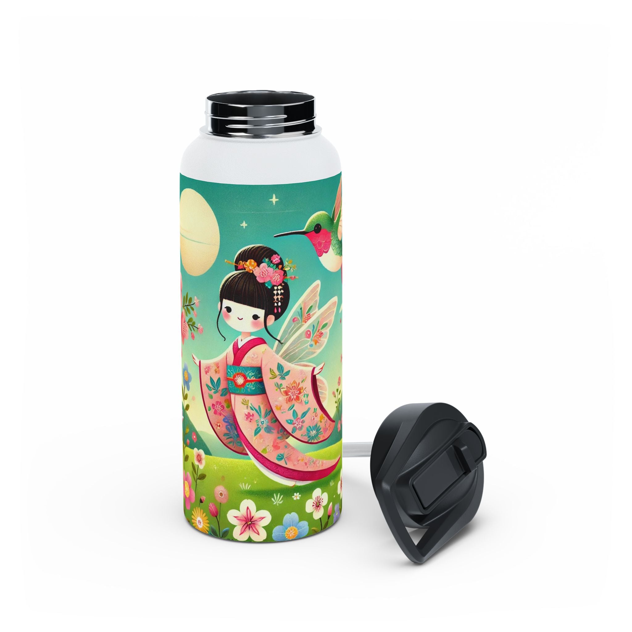 The enchanting Geisha Fairy and the Hummingbird Blossom design features a delicate geisha fairy whose flowing kimono is beautifully adorned with soft hummingbird motifs. A radiant hummingbird flutters nearby, completing this serene and poetic scene. The artwork’s gentle colors and ethereal composition merge Japanese elegance with fairy-tale magic, evoking harmony, beauty, and grace in motion. A perfect blend of function and artistry, this water bottle is as inspiring as it is practical.