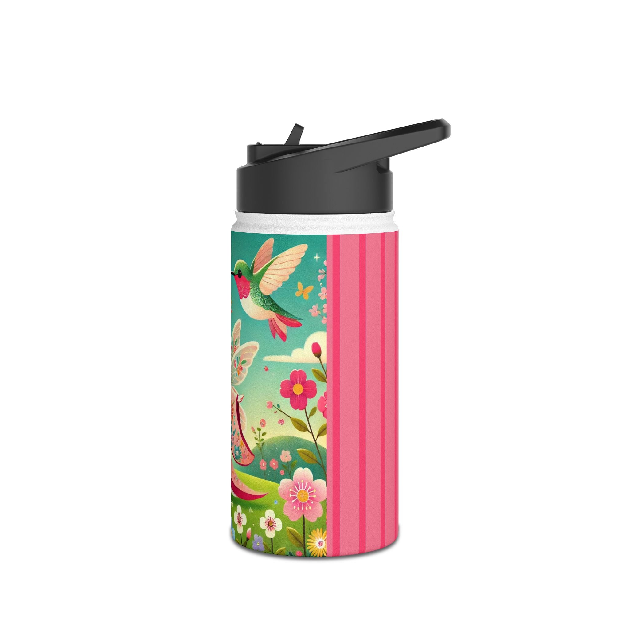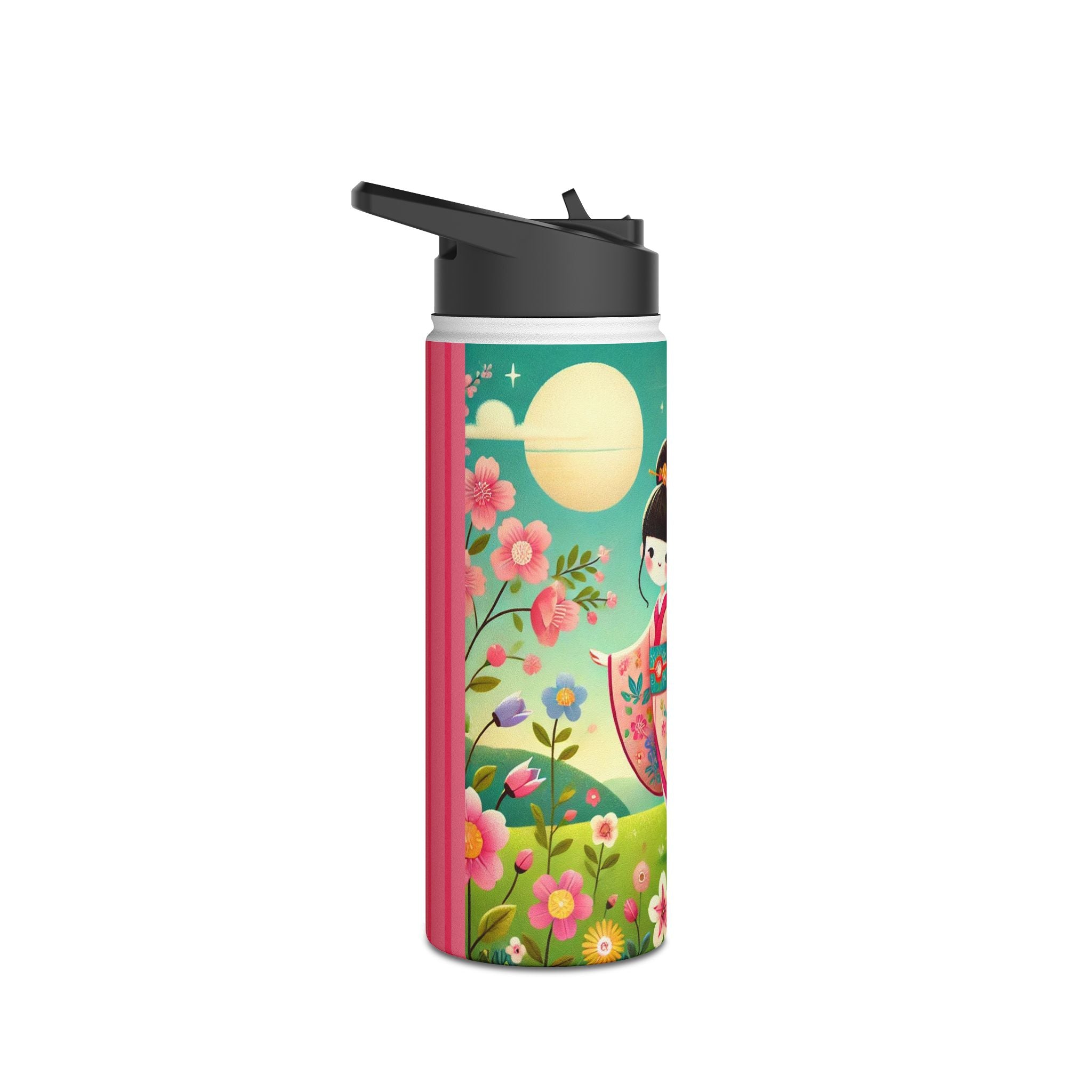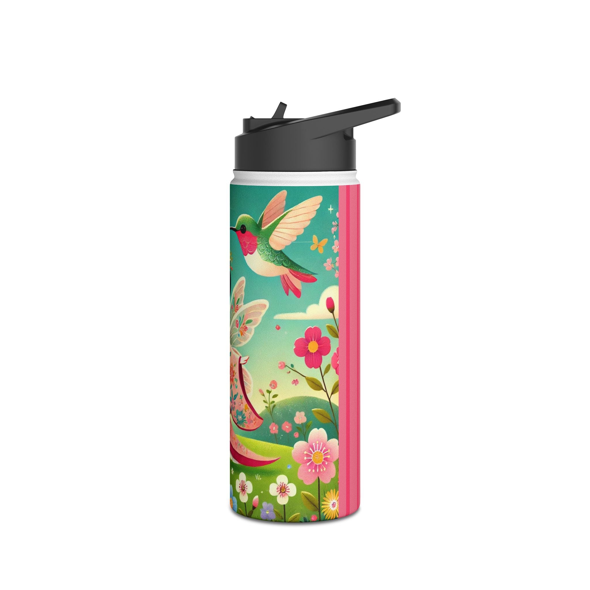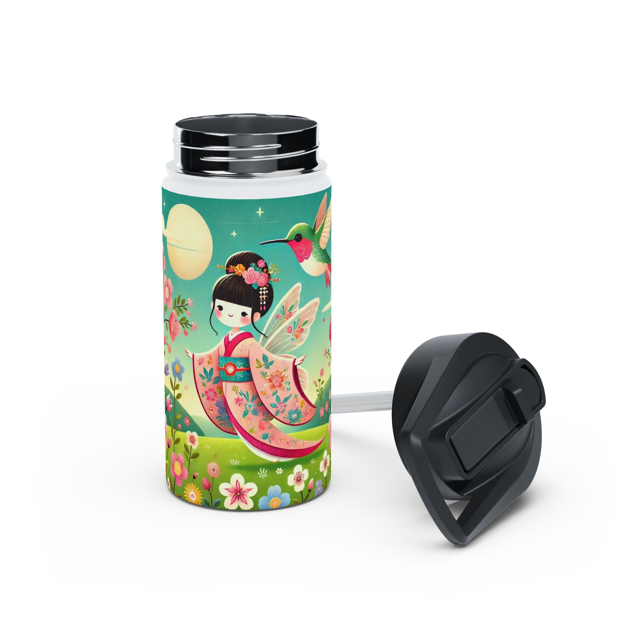 The enchanting Geisha Fairy and the Hummingbird Blossom design features a delicate geisha fairy whose flowing kimono is beautifully adorned with soft hummingbird motifs. A radiant hummingbird flutters nearby, completing this serene and poetic scene. The artwork’s gentle colors and ethereal composition merge Japanese elegance with fairy-tale magic, evoking harmony, beauty, and grace in motion. A perfect blend of function and artistry, this water bottle is as inspiring as it is practical.