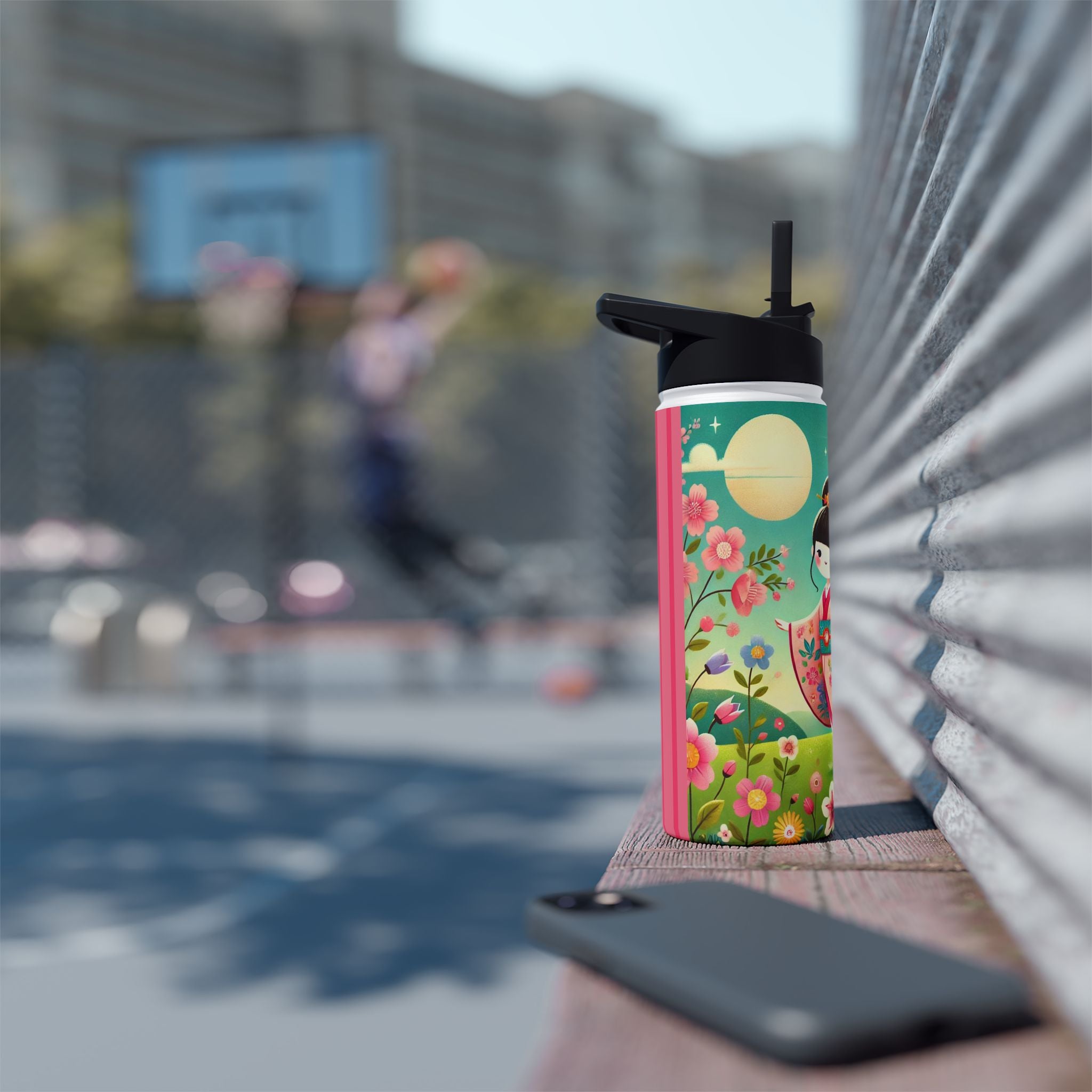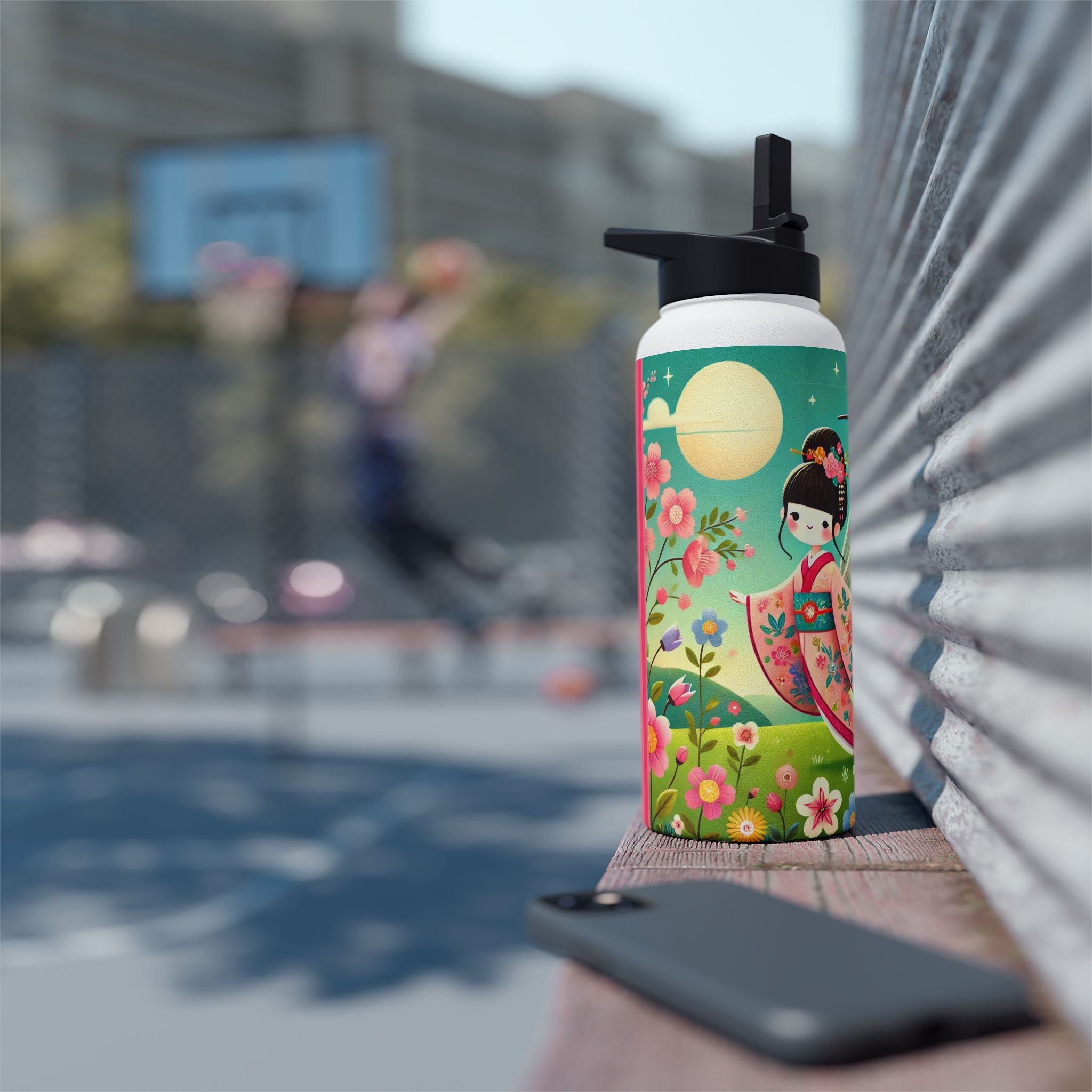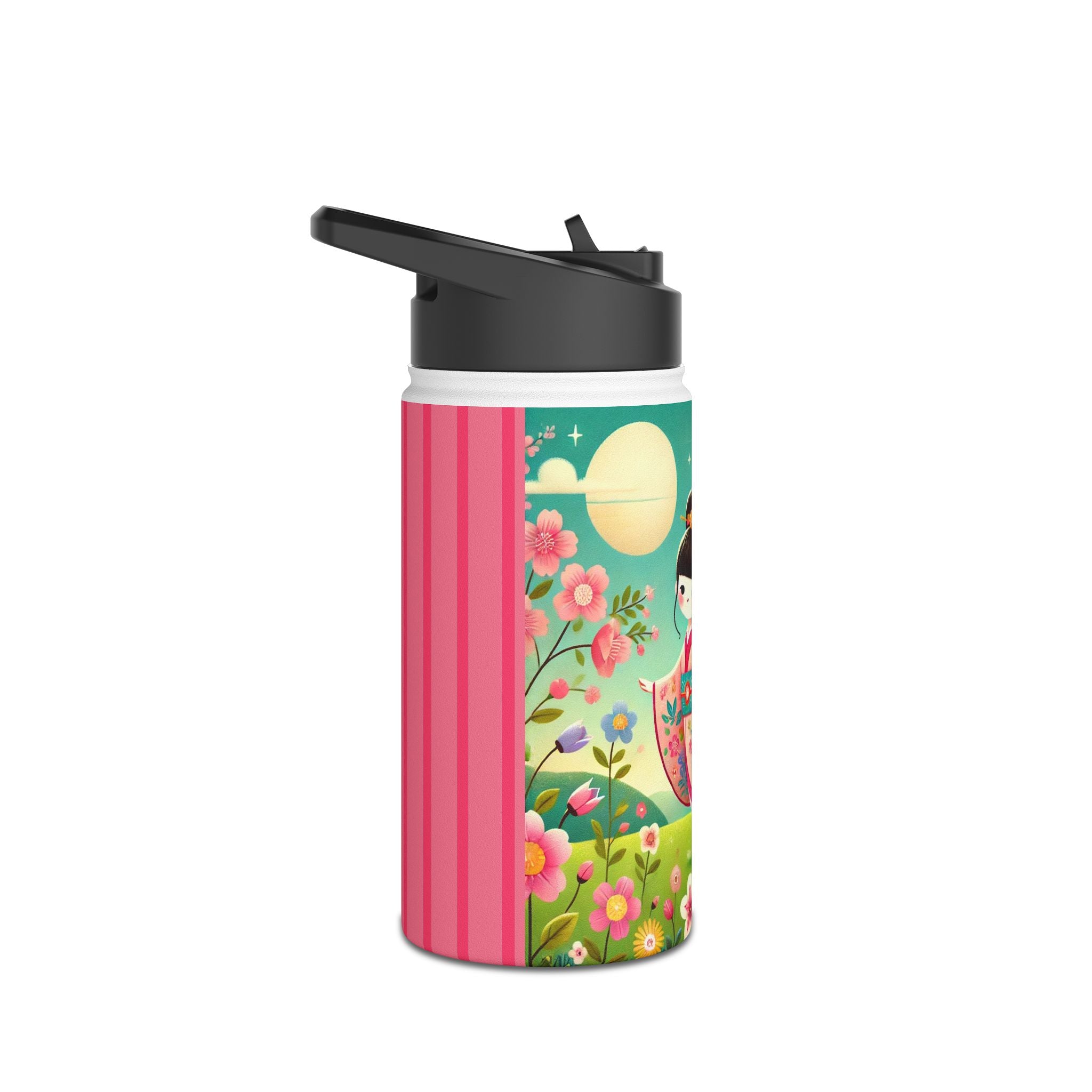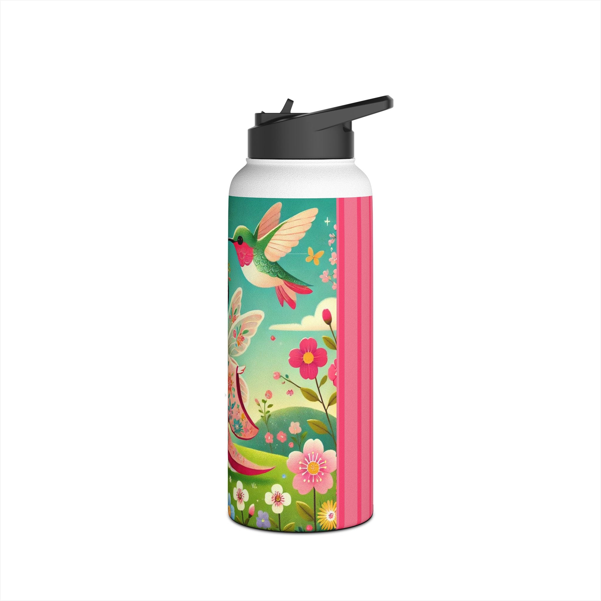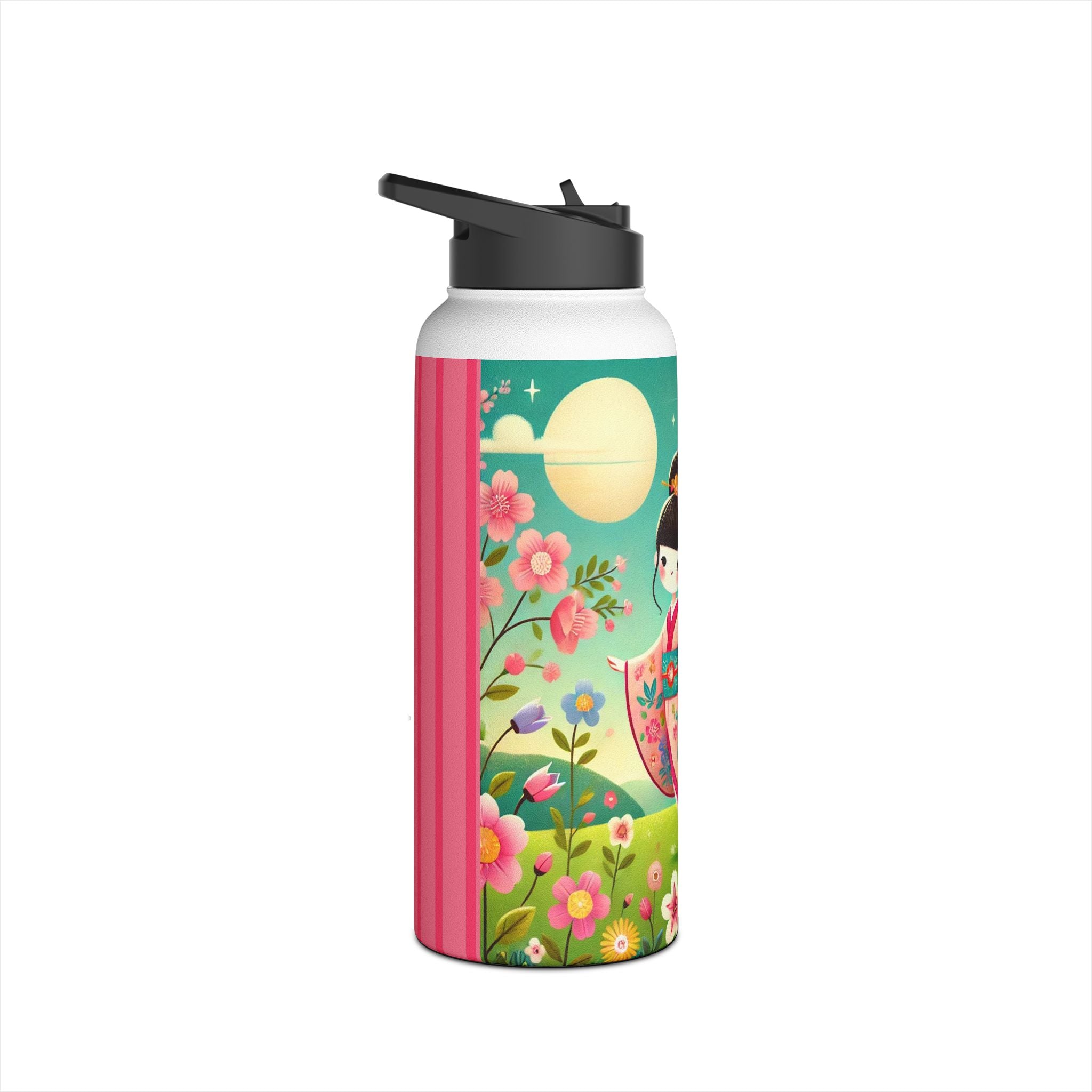 The enchanting Geisha Fairy and the Hummingbird Blossom design features a delicate geisha fairy whose flowing kimono is beautifully adorned with soft hummingbird motifs. A radiant hummingbird flutters nearby, completing this serene and poetic scene. The artwork’s gentle colors and ethereal composition merge Japanese elegance with fairy-tale magic, evoking harmony, beauty, and grace in motion. A perfect blend of function and artistry, this water bottle is as inspiring as it is practical.