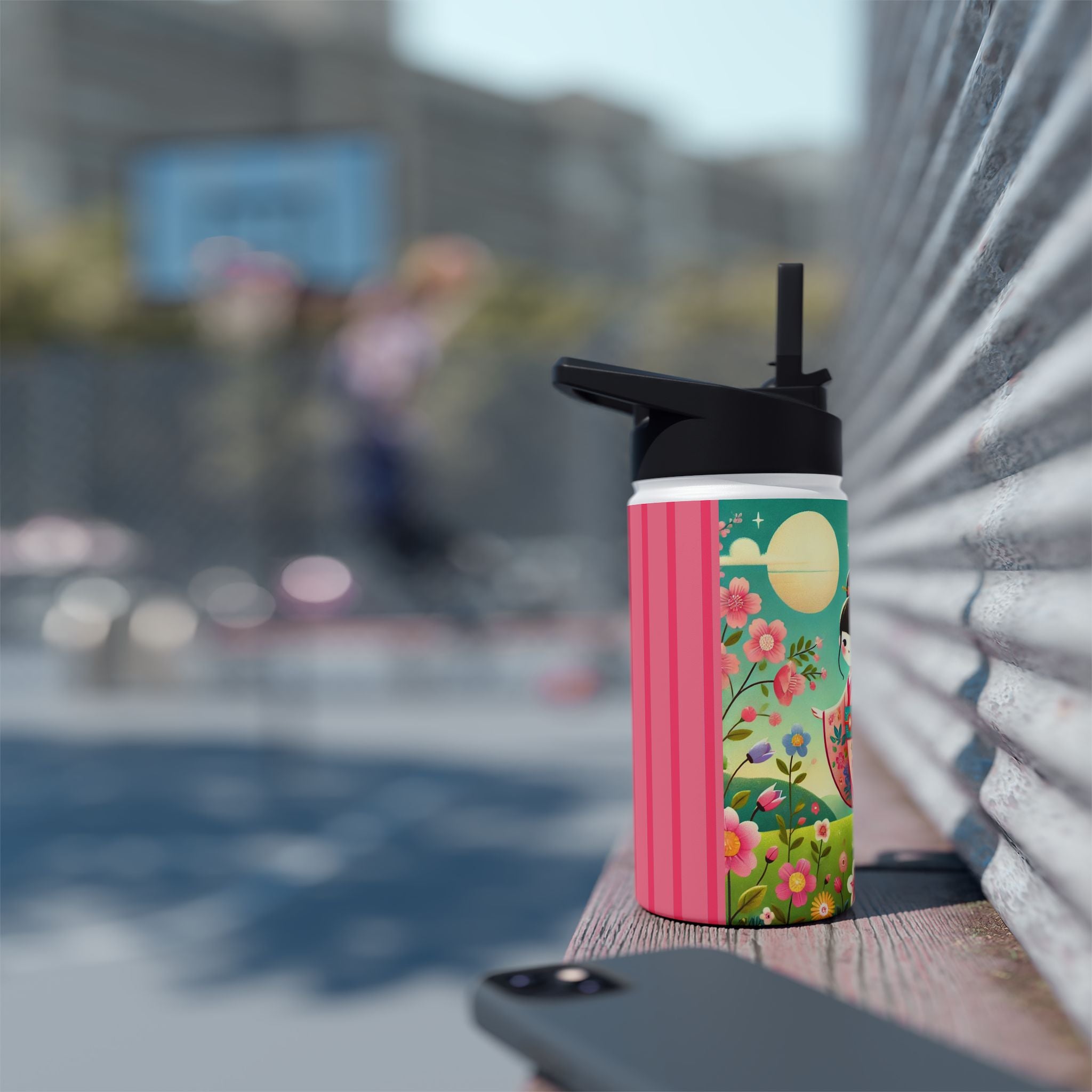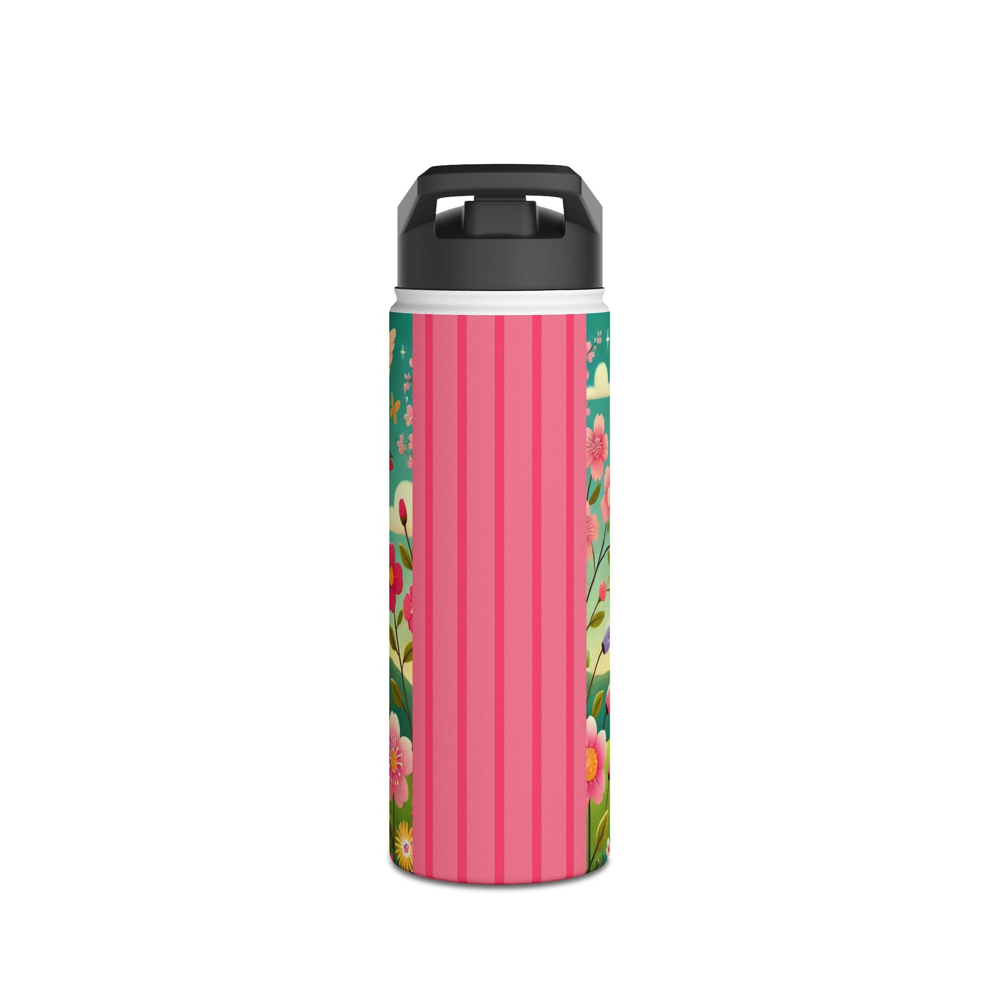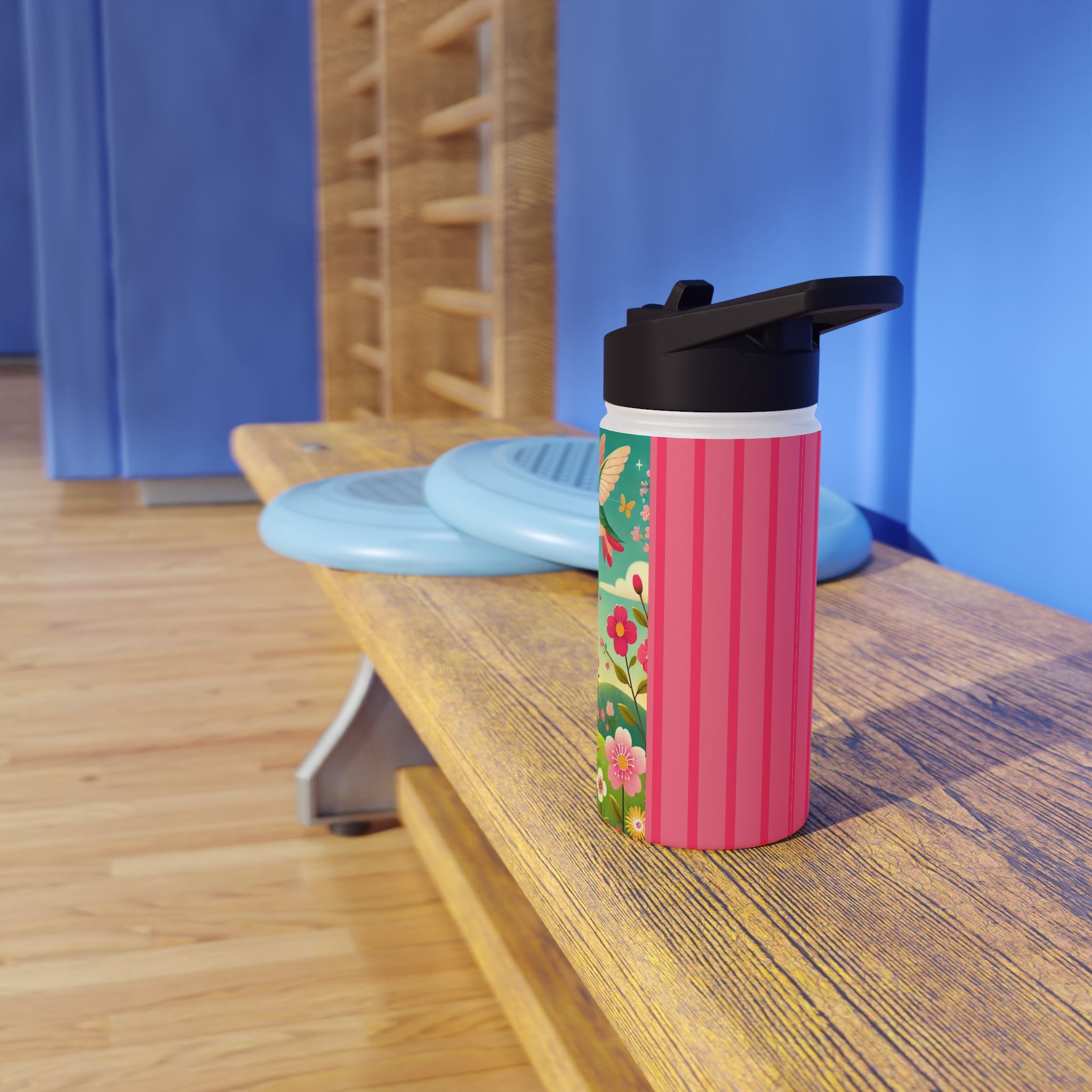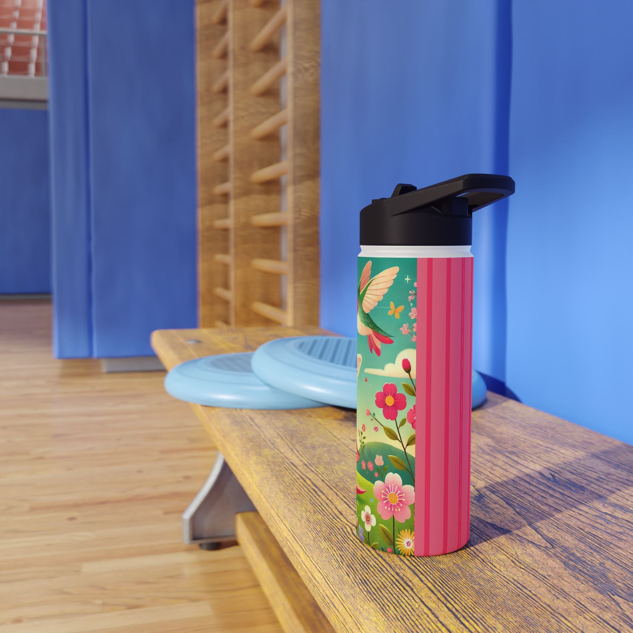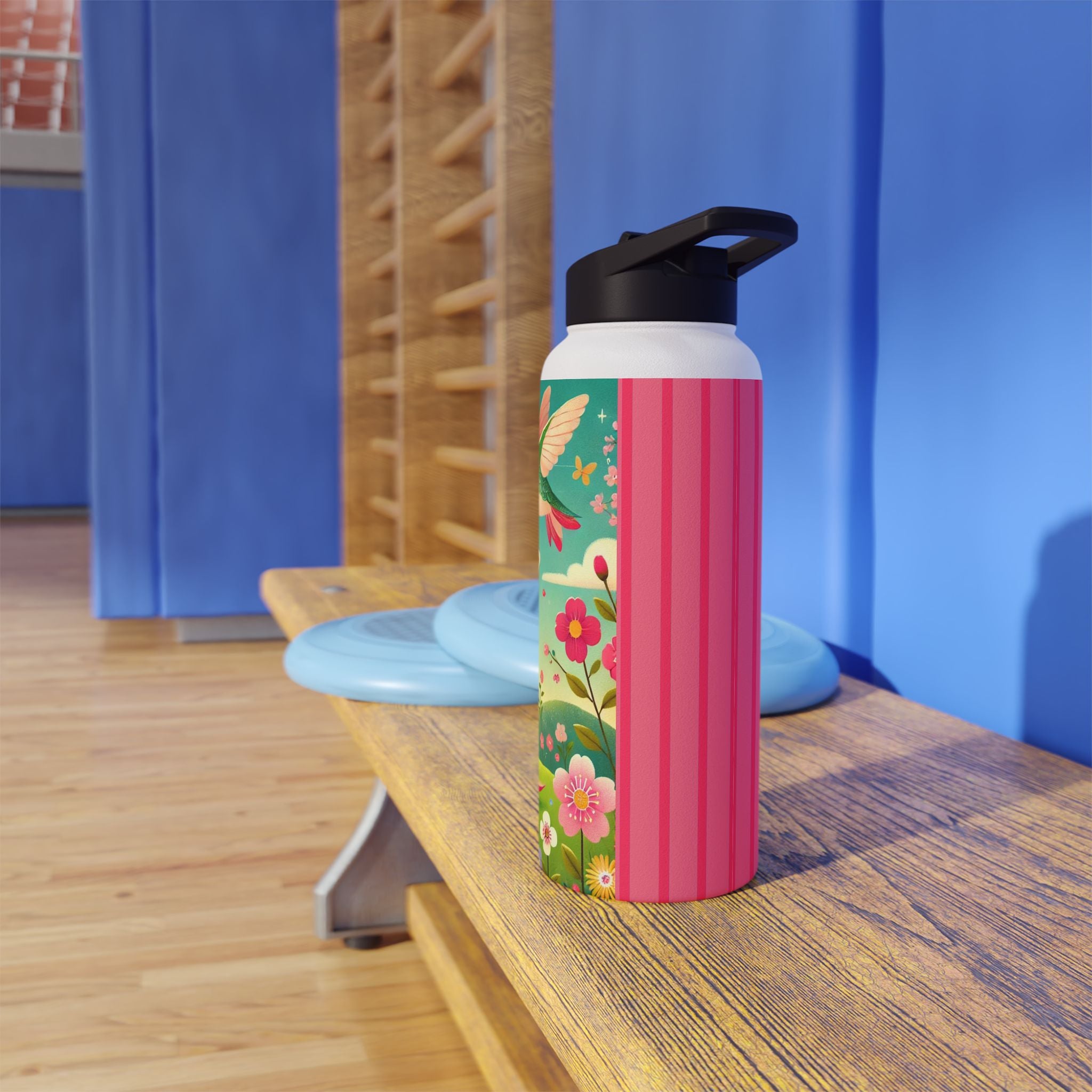 The enchanting Geisha Fairy and the Hummingbird Blossom design features a delicate geisha fairy whose flowing kimono is beautifully adorned with soft hummingbird motifs. A radiant hummingbird flutters nearby, completing this serene and poetic scene. The artwork’s gentle colors and ethereal composition merge Japanese elegance with fairy-tale magic, evoking harmony, beauty, and grace in motion. A perfect blend of function and artistry, this water bottle is as inspiring as it is practical.