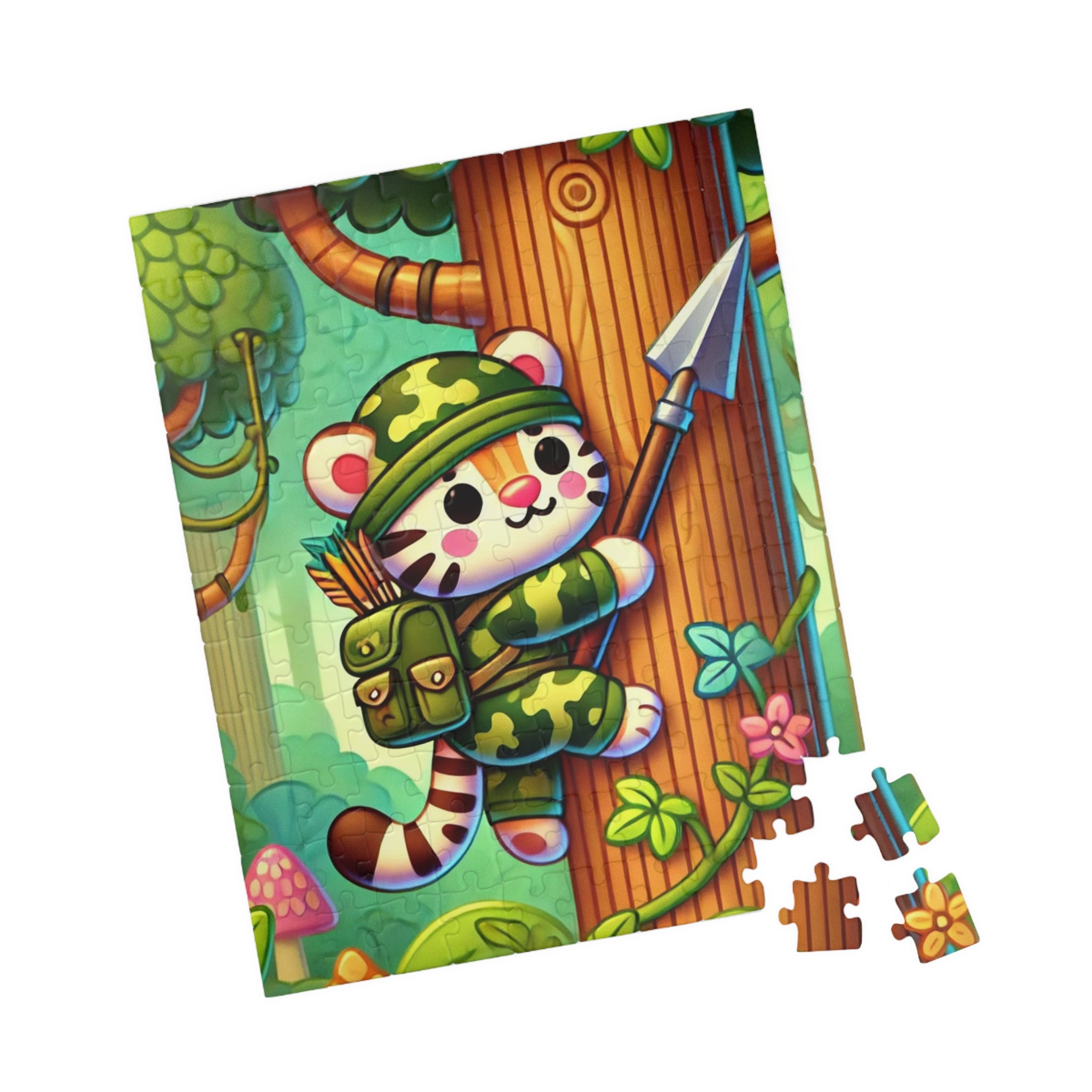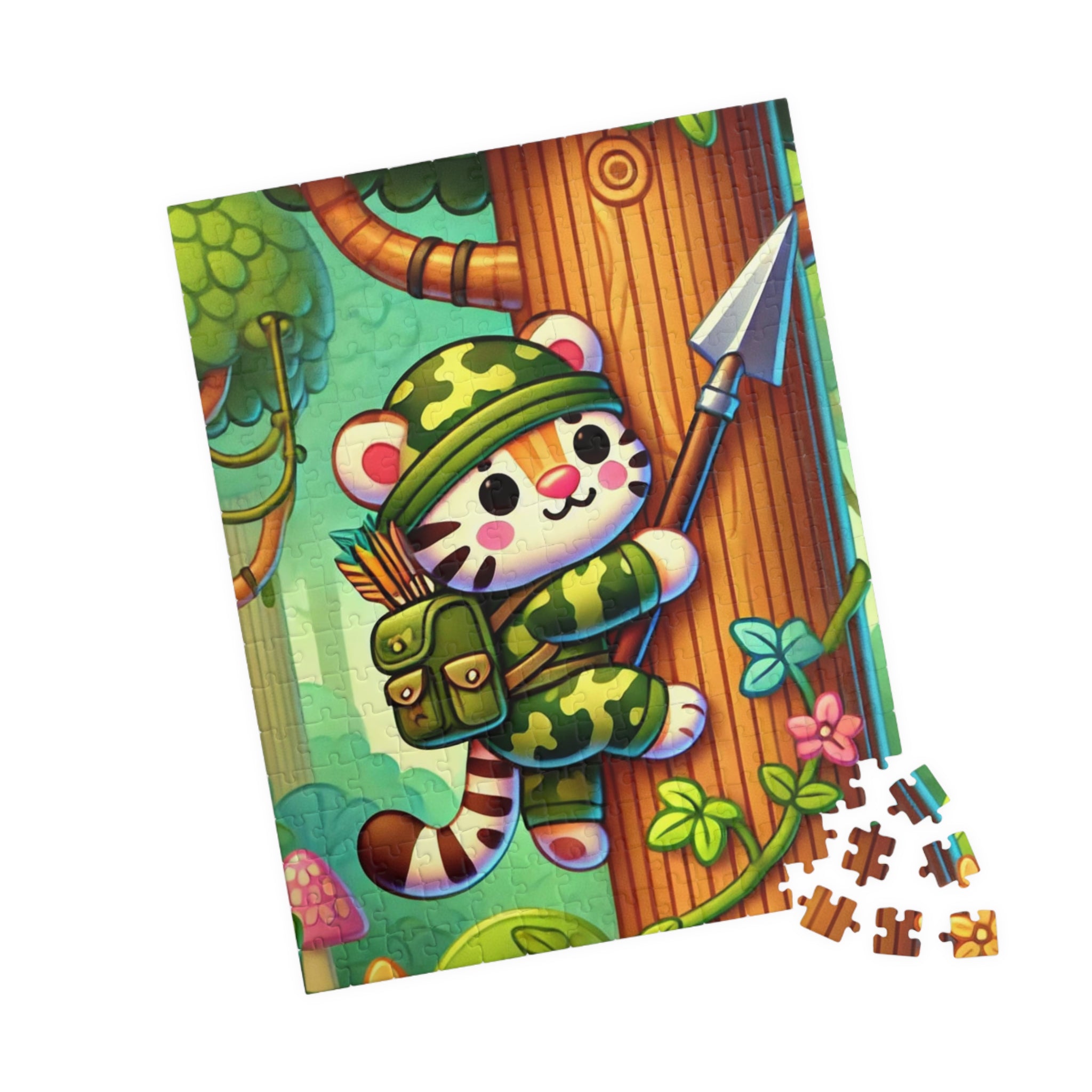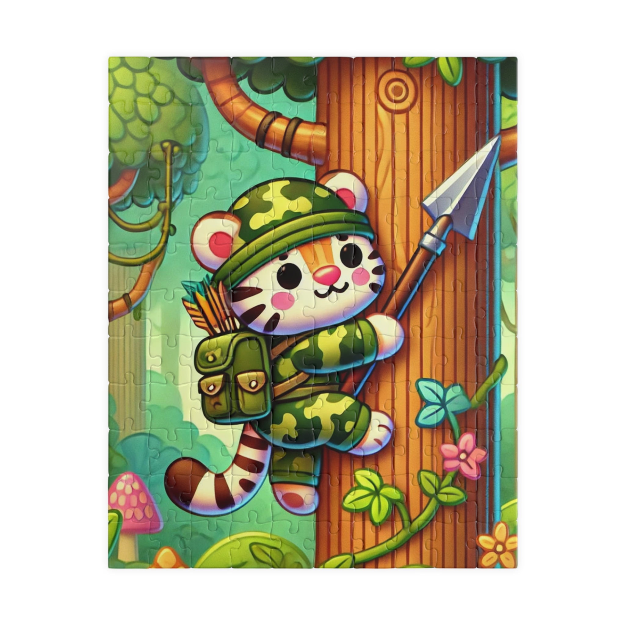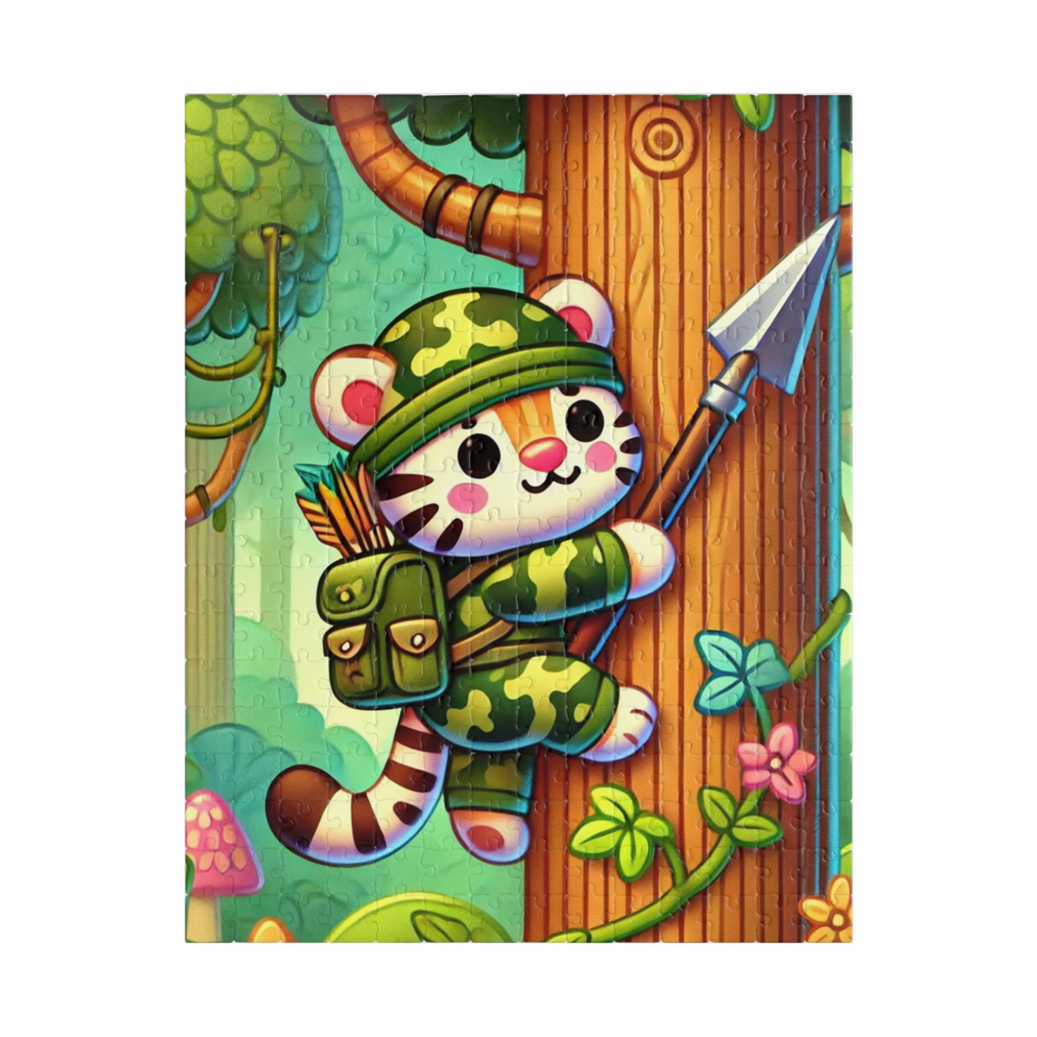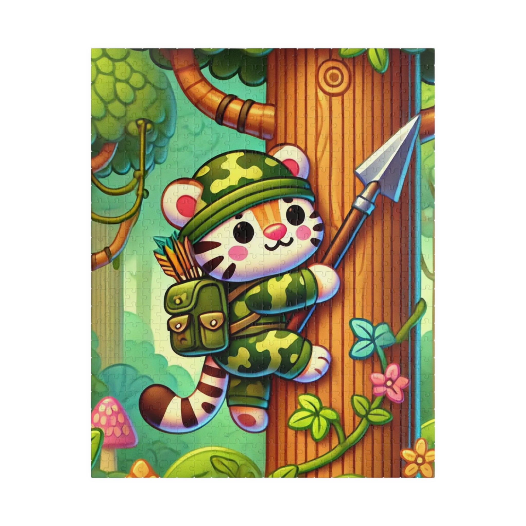 The Stealthy Stripes artwork features a stealthy tiger in jungle camouflage, climbing a towering tree with a spear strapped to its back. The scene is alive with motion and energy, as soft sunlight filters through the dense canopy. The tiger’s bold stripes and determined gaze capture a spirit of daring exploration, while the lush greenery and whimsical style bring the jungle to life. This vibrant and imaginative illustration blends playful charm with adventurous spirit — a perfect balance of art and storytelling.