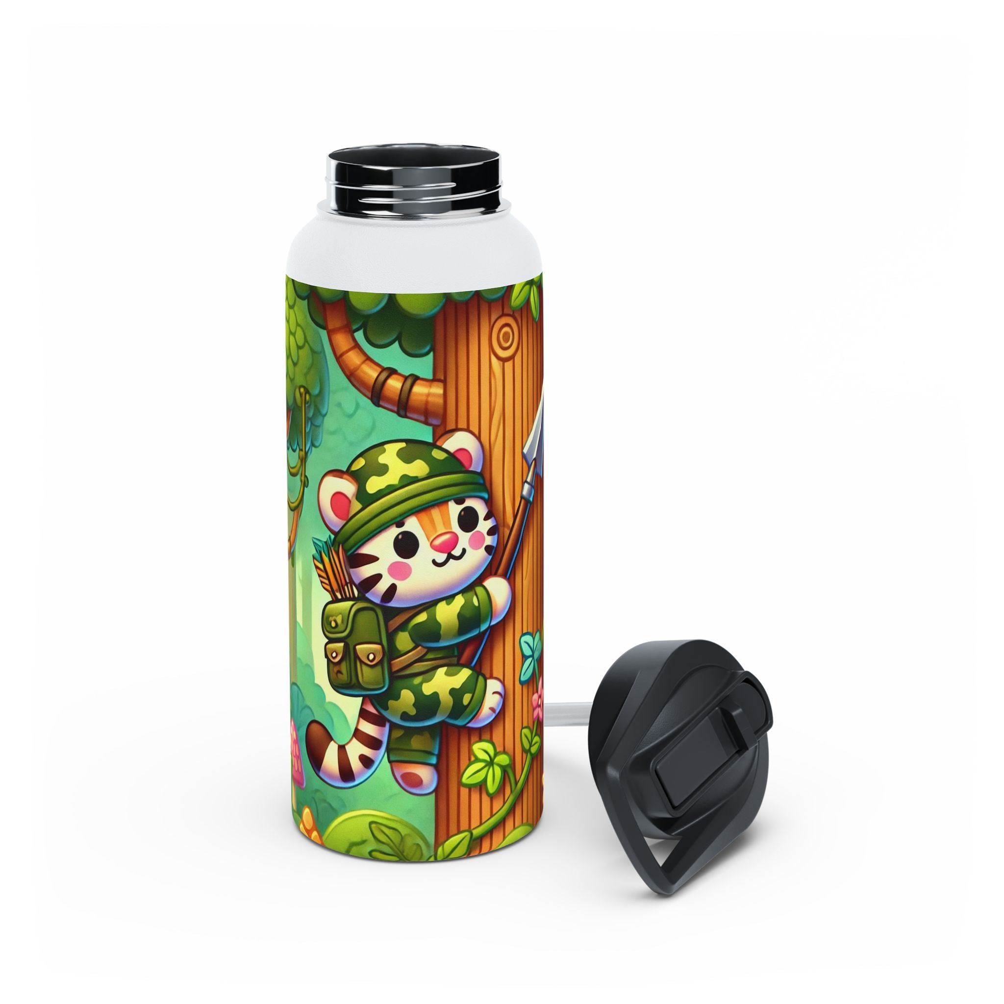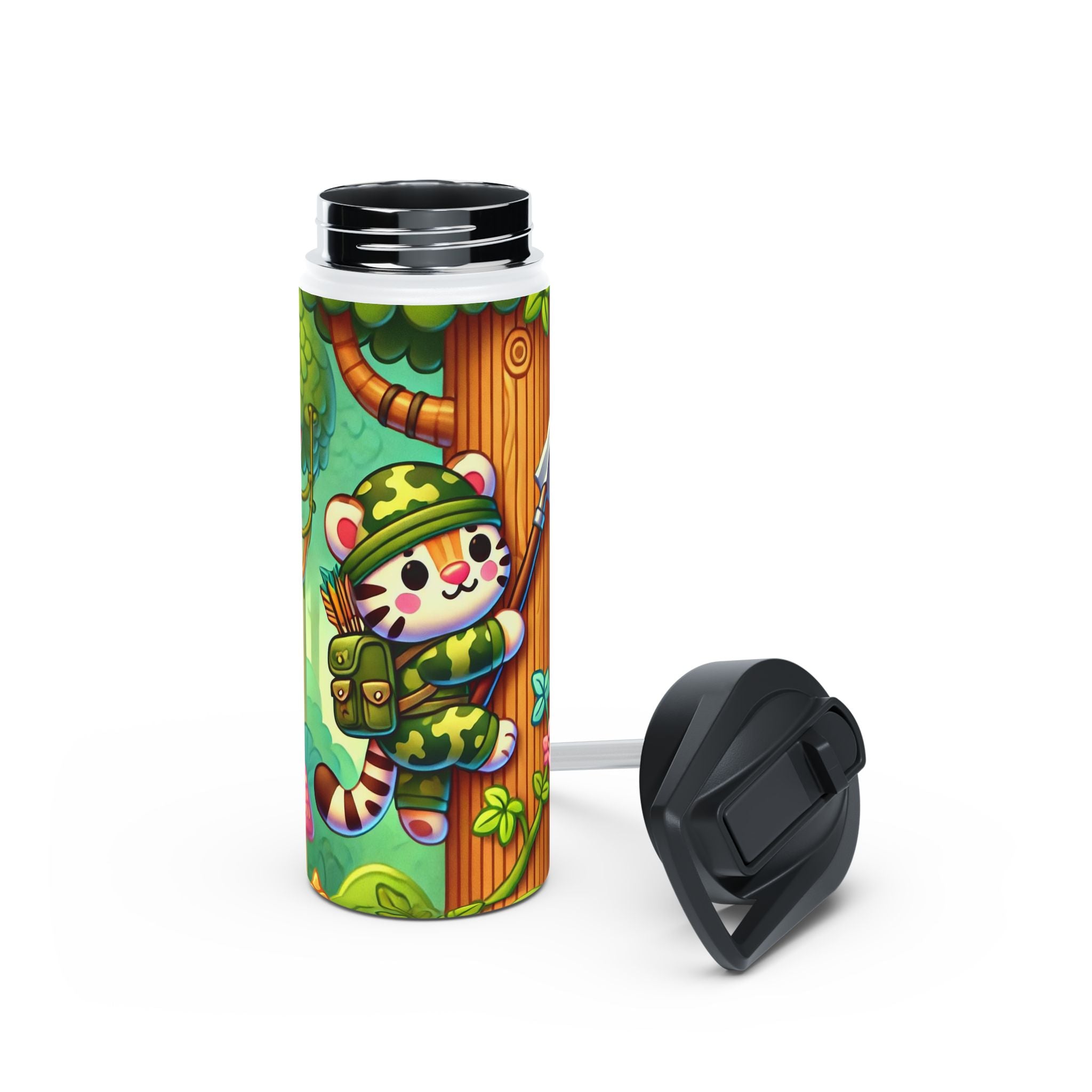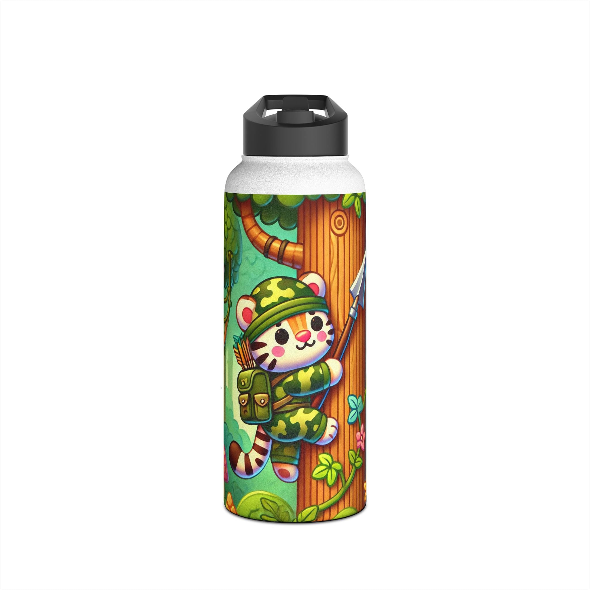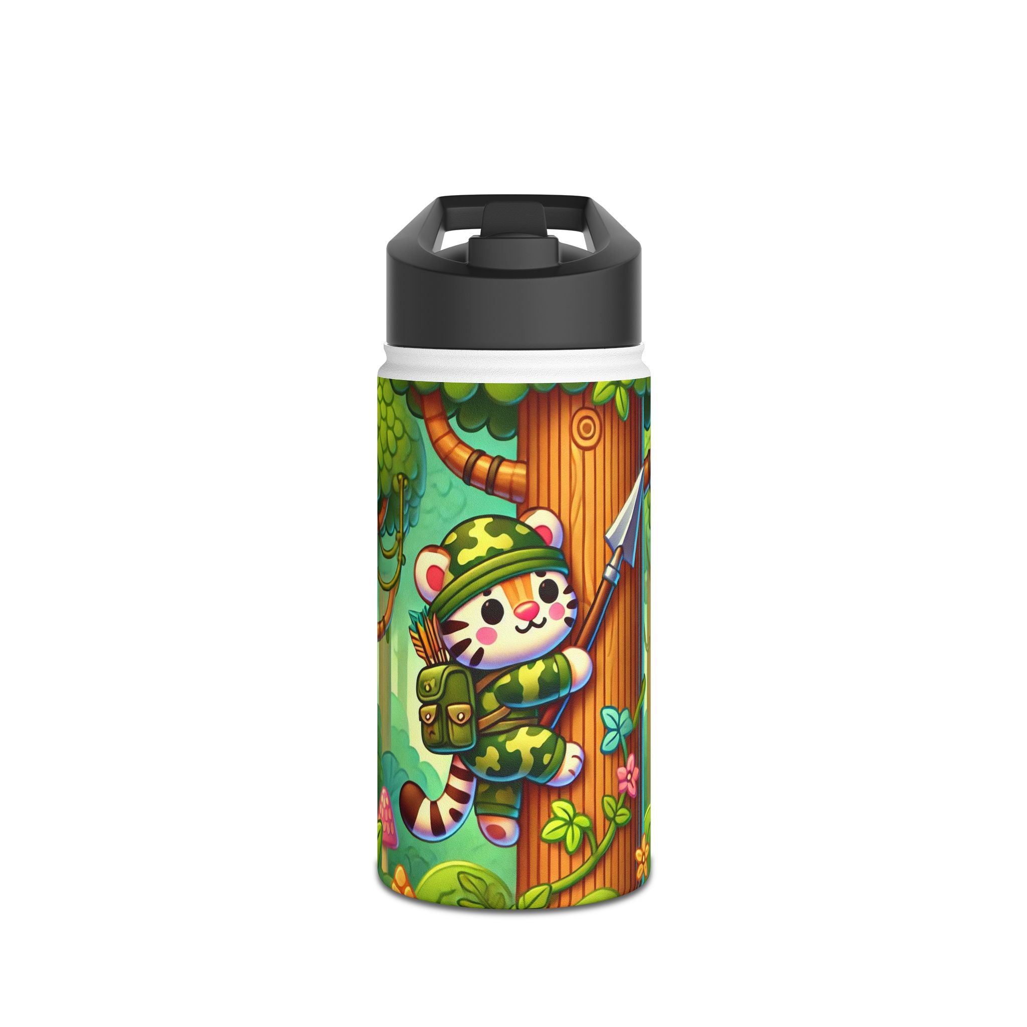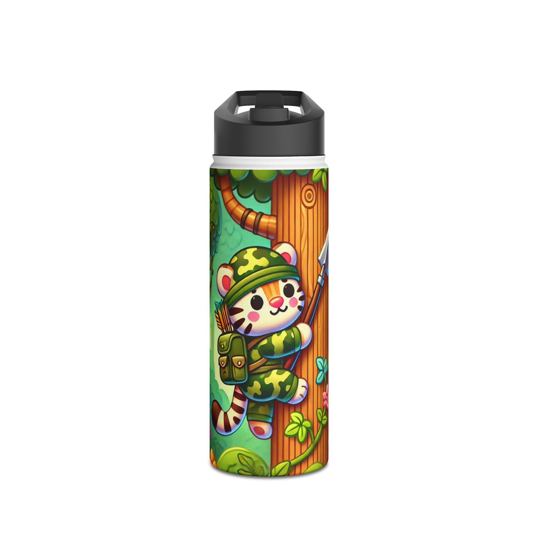 The playful Stealthy Stripes artwork captures a tiger masterfully camouflaged within a lush jungle canopy, climbing a towering tree with a spear secured to its back. Every detail—from the vibrant foliage to the tiger’s determined gaze—infuses the scene with movement, humor, and wonder. This design celebrates curiosity, stealth, and courage in a vivid, storybook-inspired way, turning a practical water bottle into a small piece of wild adventure.