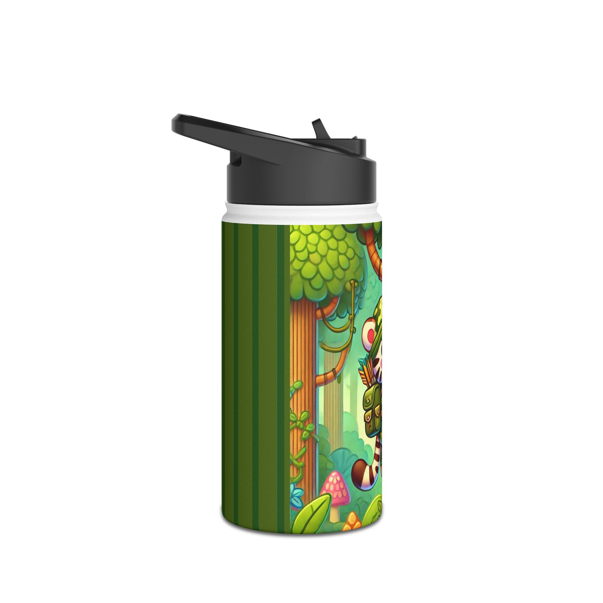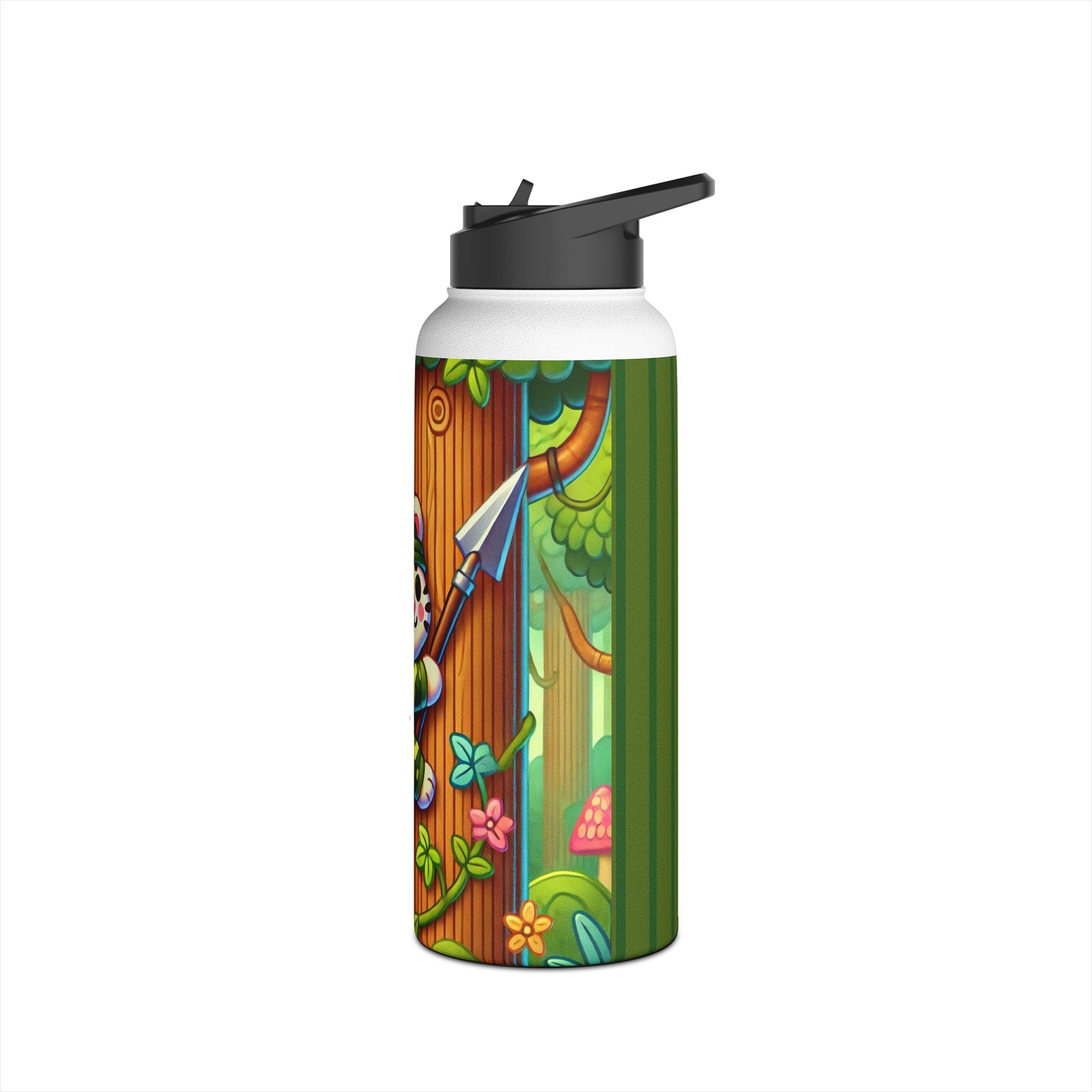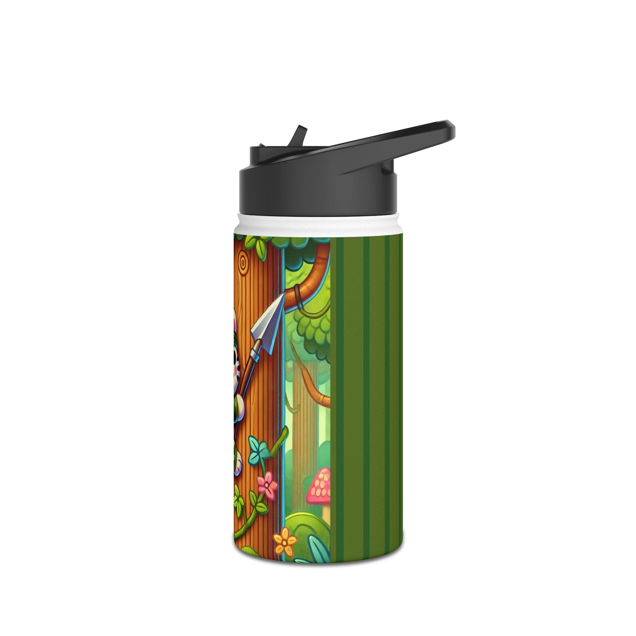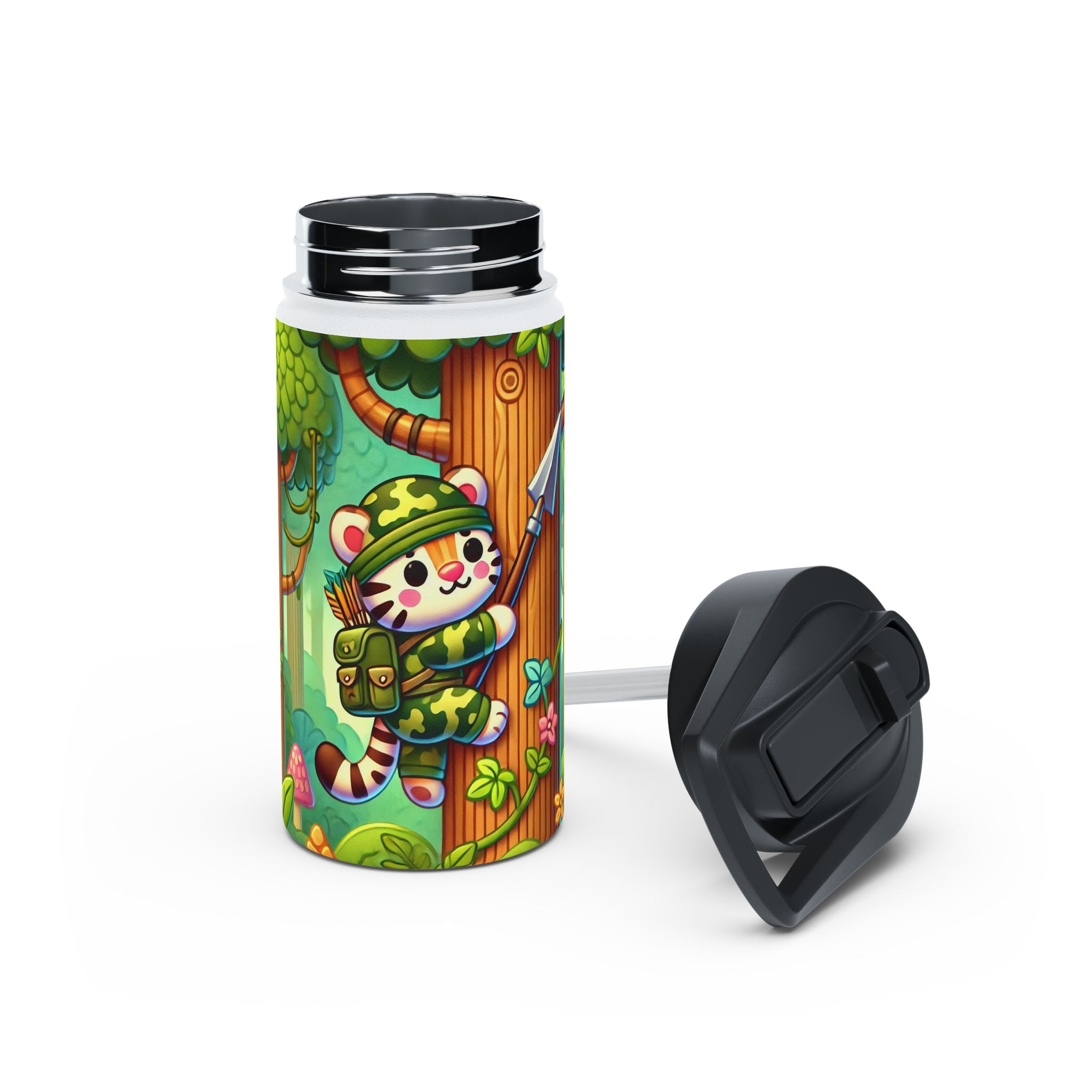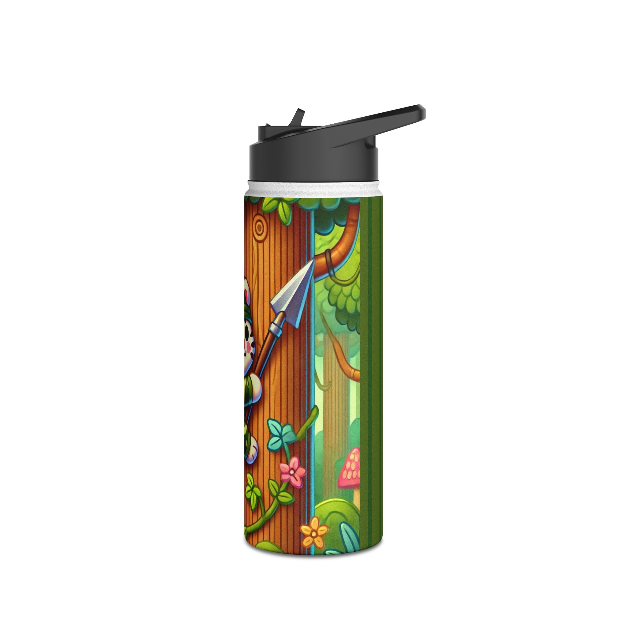 The playful Stealthy Stripes artwork captures a tiger masterfully camouflaged within a lush jungle canopy, climbing a towering tree with a spear secured to its back. Every detail—from the vibrant foliage to the tiger’s determined gaze—infuses the scene with movement, humor, and wonder. This design celebrates curiosity, stealth, and courage in a vivid, storybook-inspired way, turning a practical water bottle into a small piece of wild adventure.