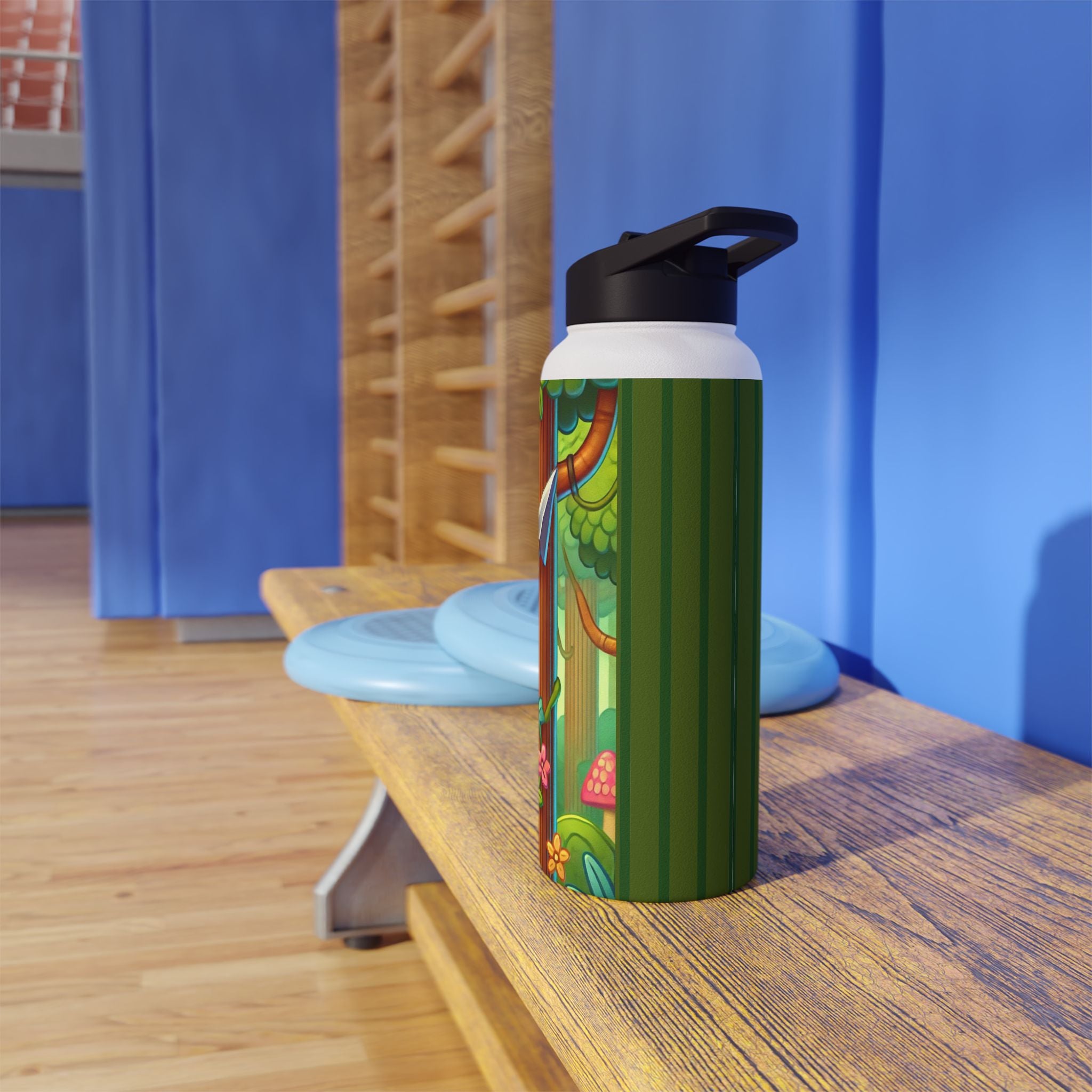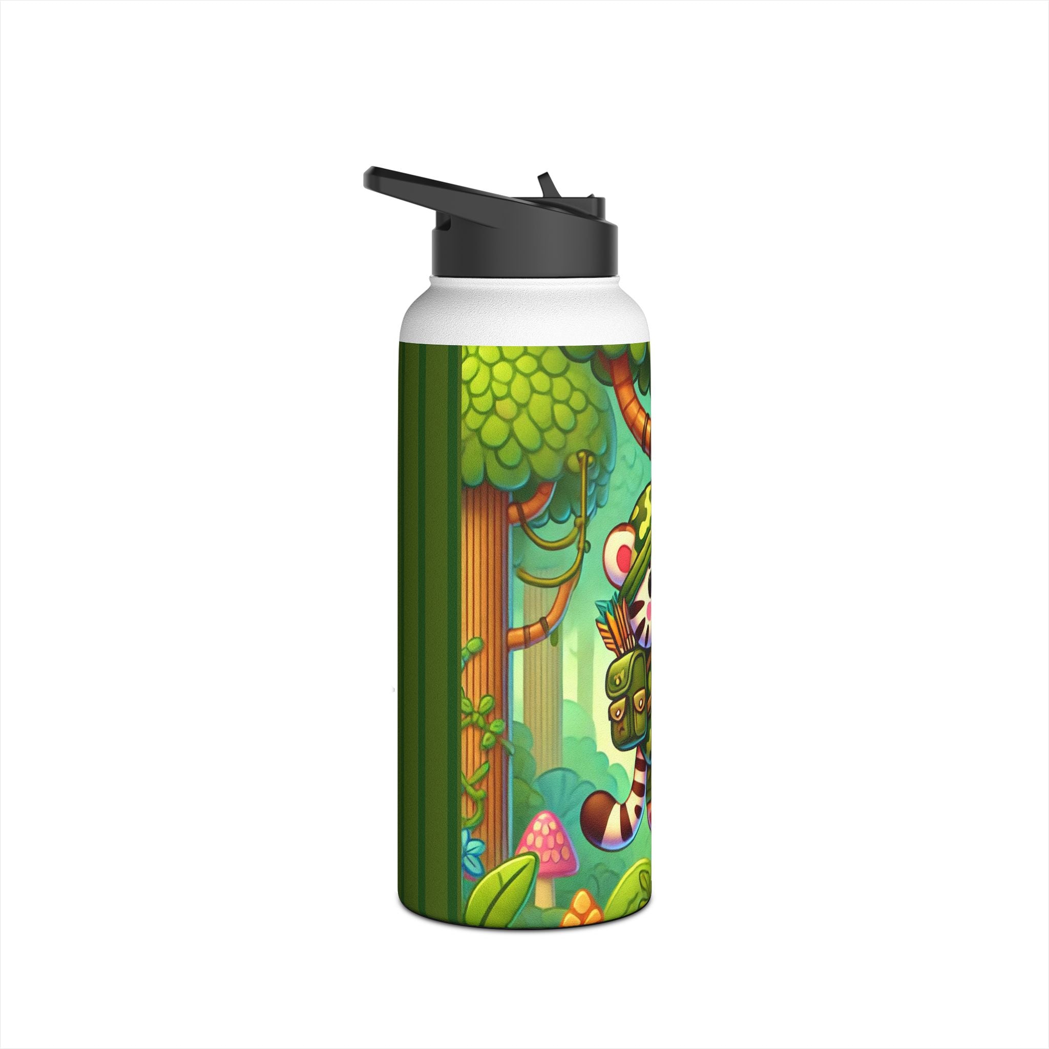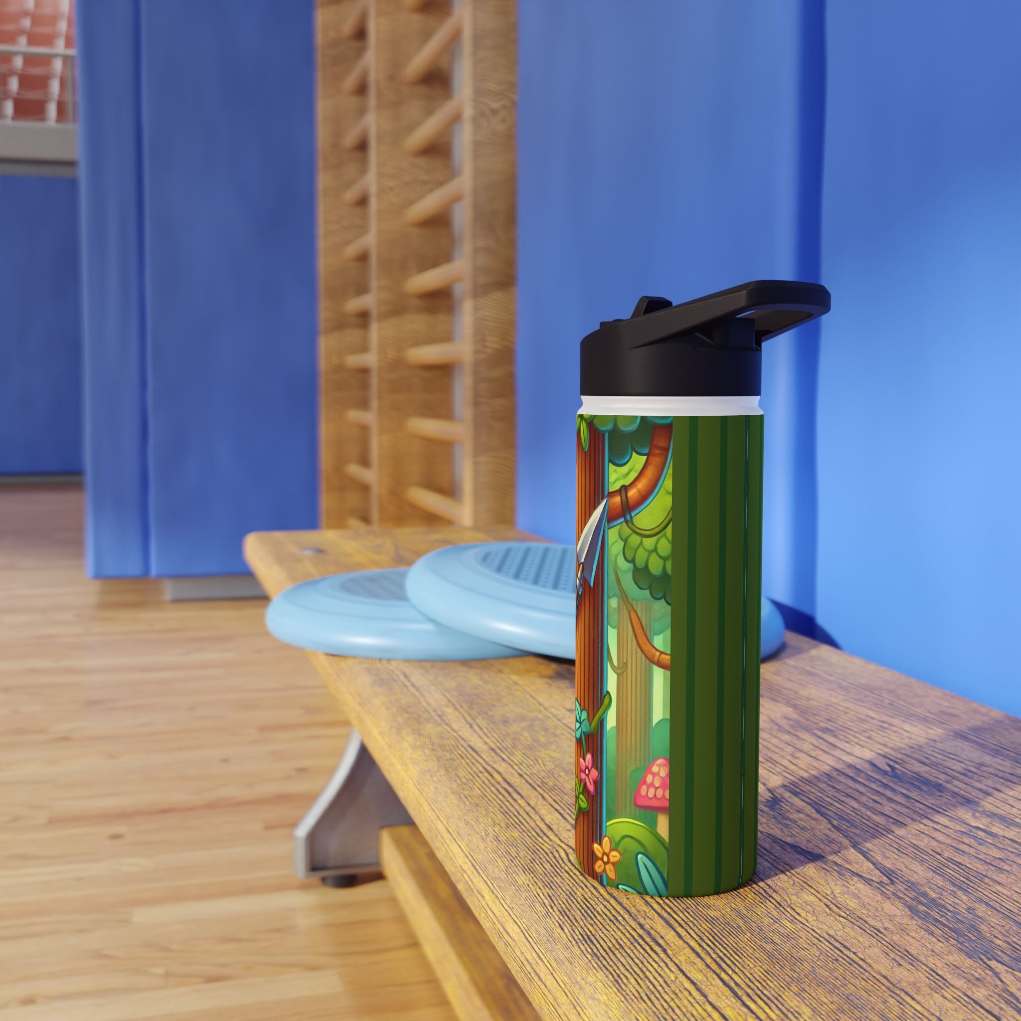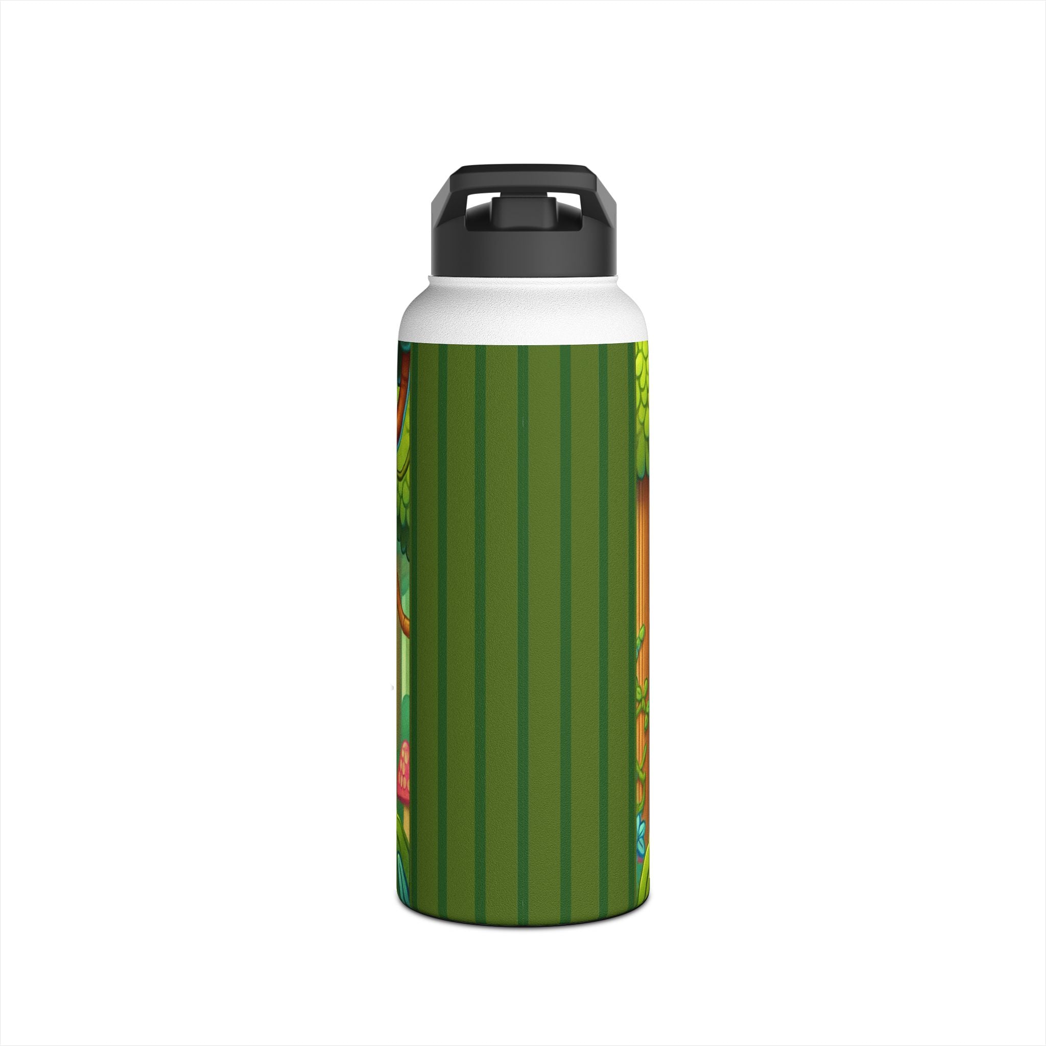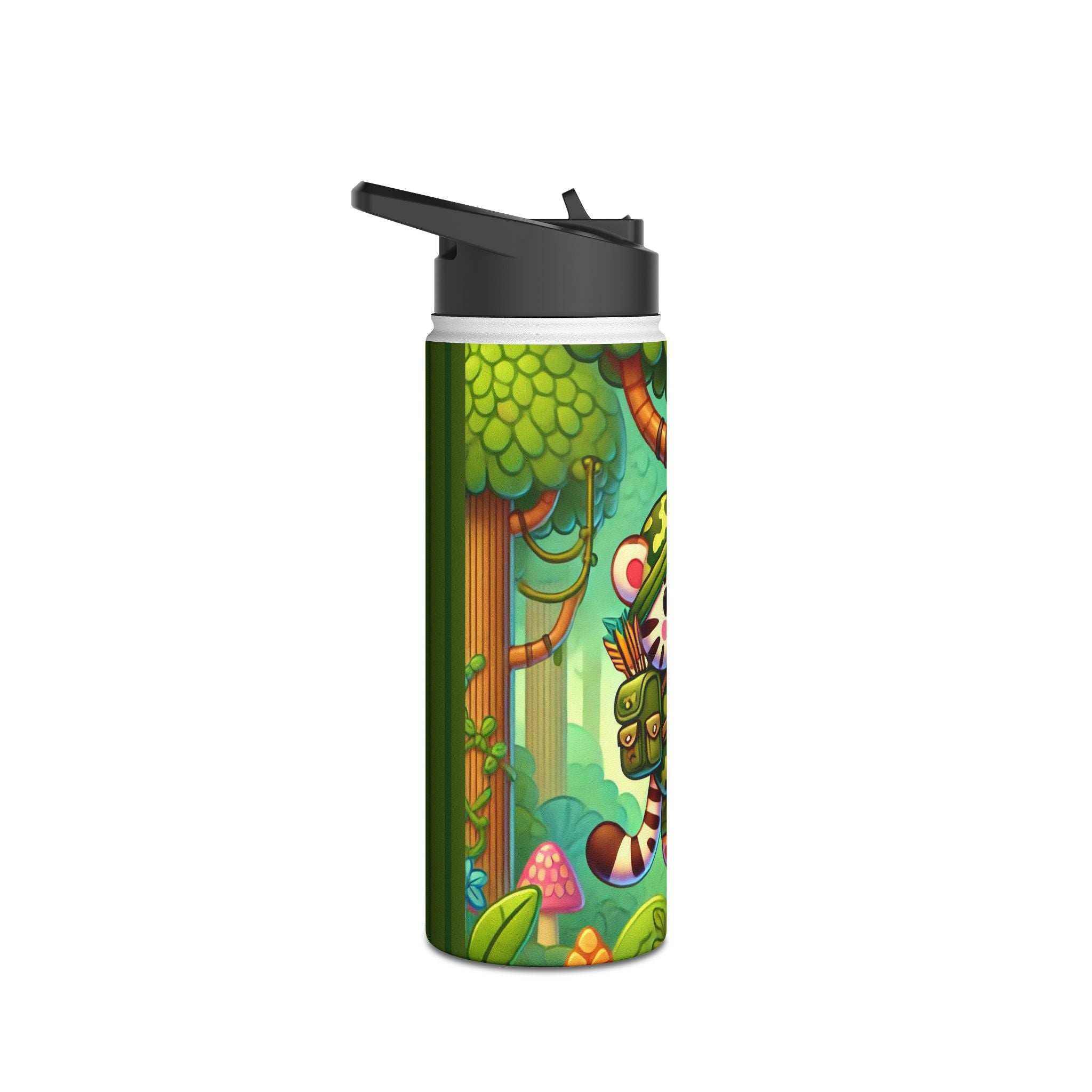 The playful Stealthy Stripes artwork captures a tiger masterfully camouflaged within a lush jungle canopy, climbing a towering tree with a spear secured to its back. Every detail—from the vibrant foliage to the tiger’s determined gaze—infuses the scene with movement, humor, and wonder. This design celebrates curiosity, stealth, and courage in a vivid, storybook-inspired way, turning a practical water bottle into a small piece of wild adventure.