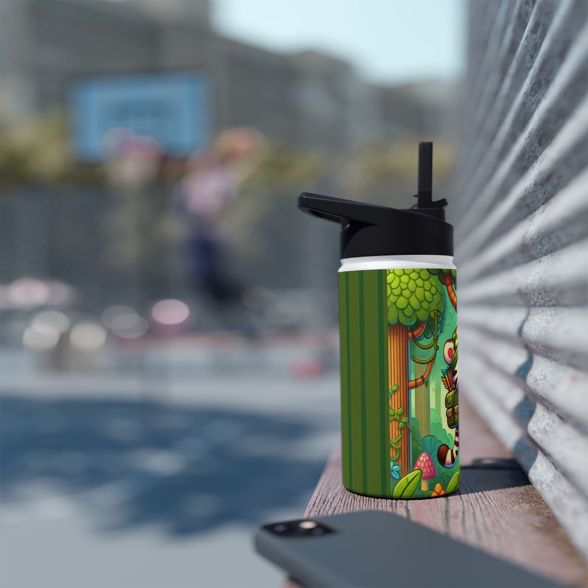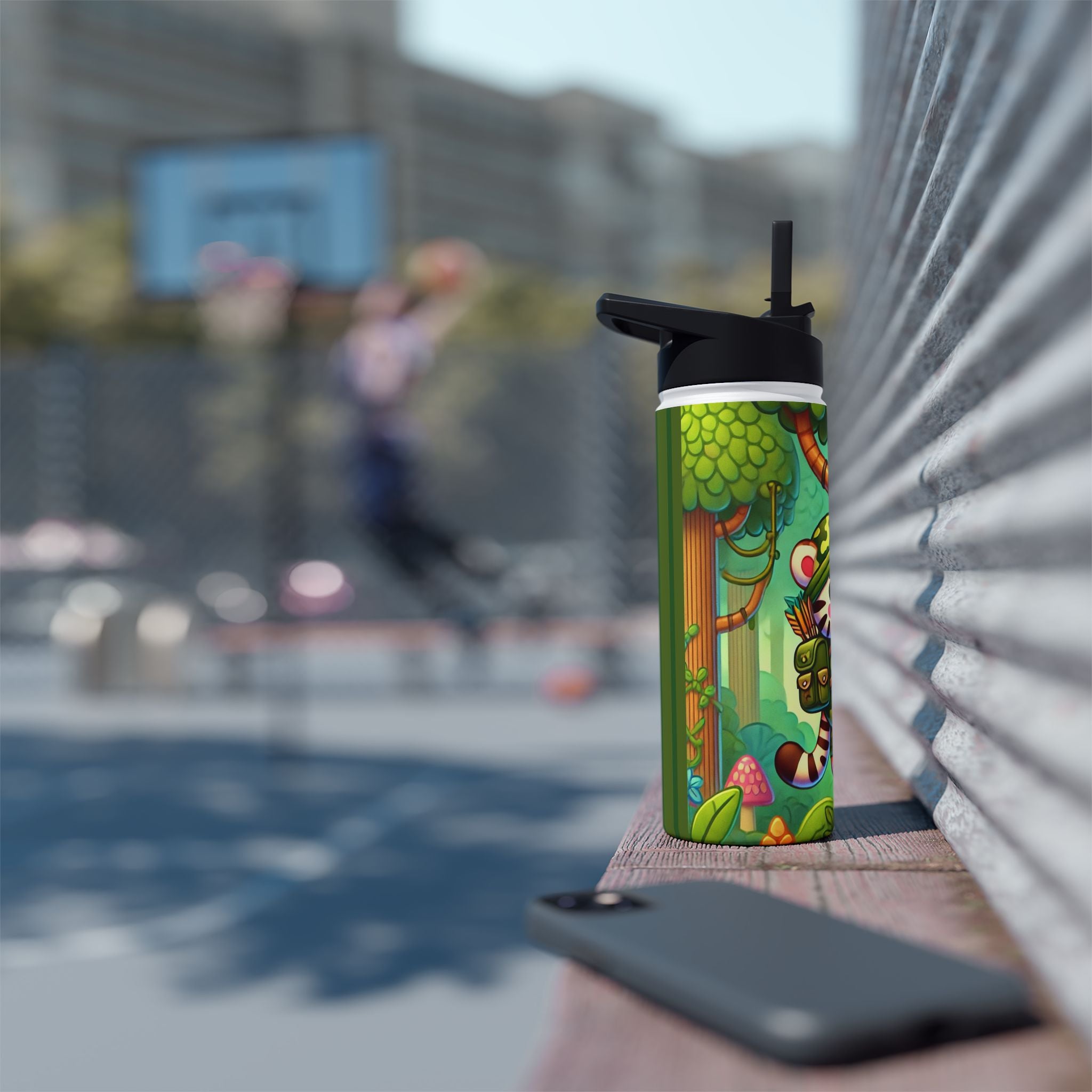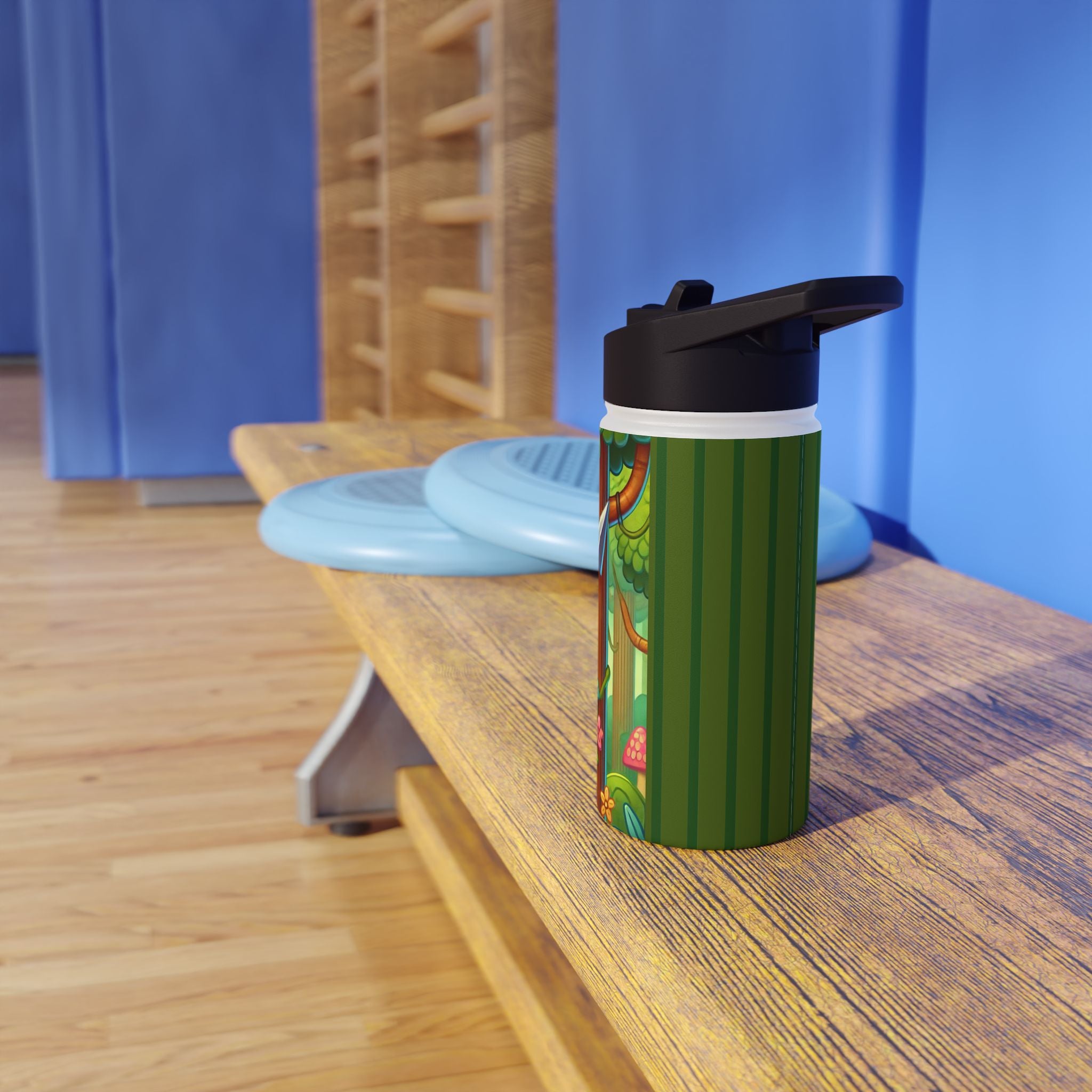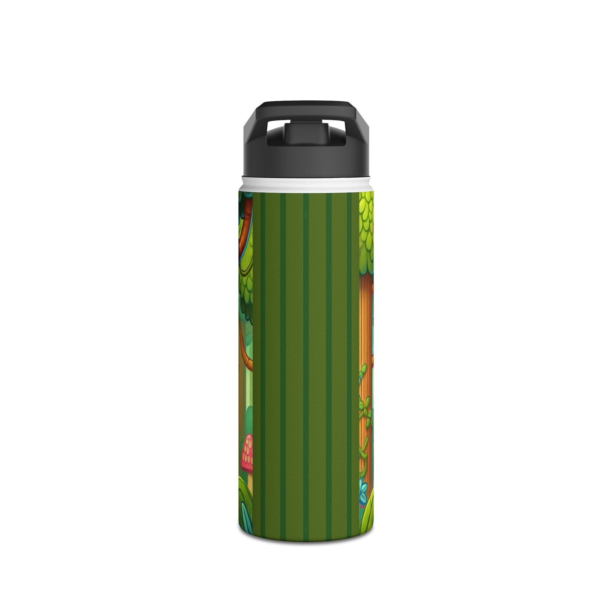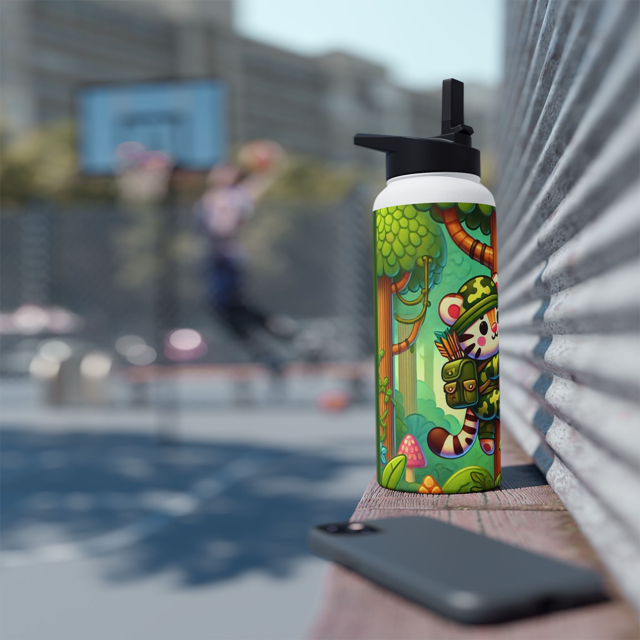 The playful Stealthy Stripes artwork captures a tiger masterfully camouflaged within a lush jungle canopy, climbing a towering tree with a spear secured to its back. Every detail—from the vibrant foliage to the tiger’s determined gaze—infuses the scene with movement, humor, and wonder. This design celebrates curiosity, stealth, and courage in a vivid, storybook-inspired way, turning a practical water bottle into a small piece of wild adventure.
