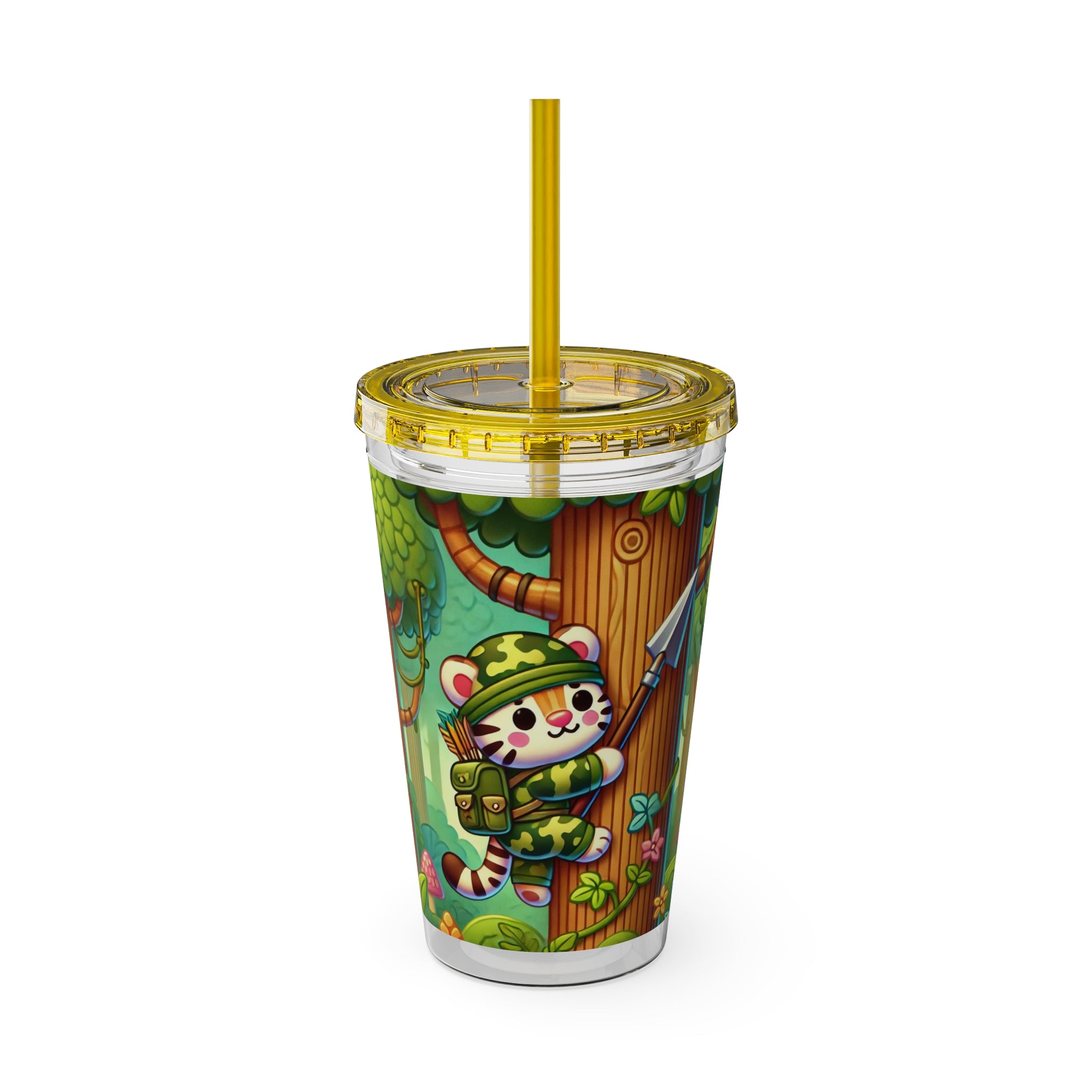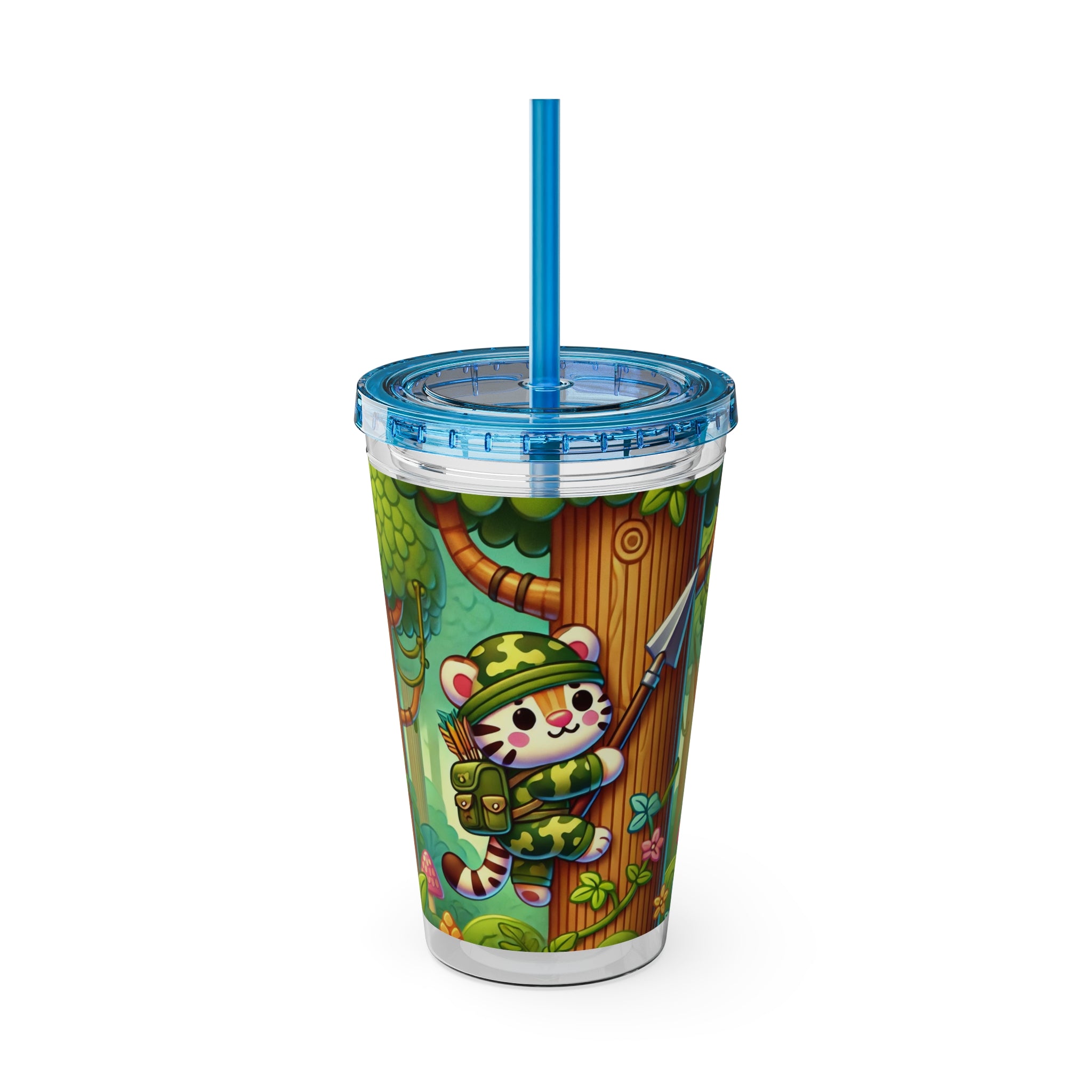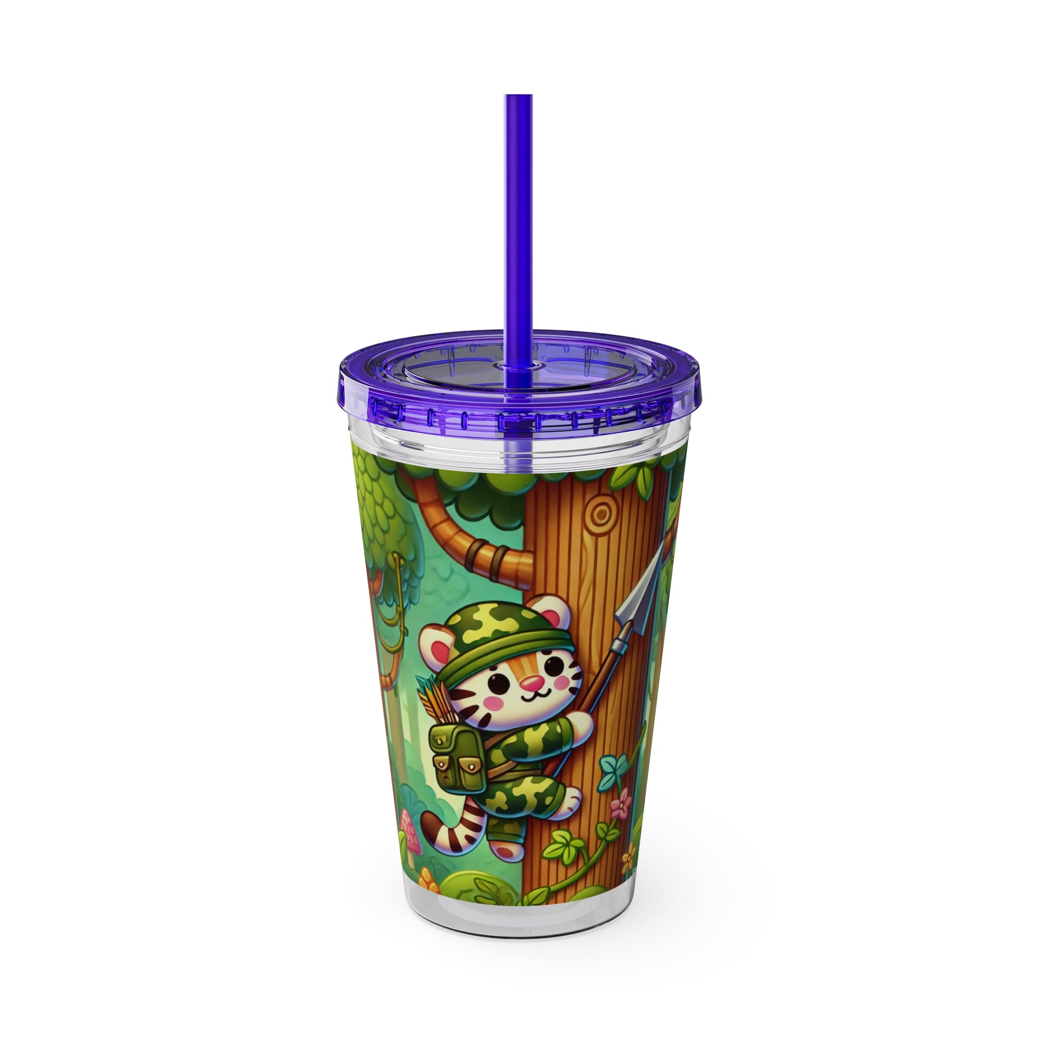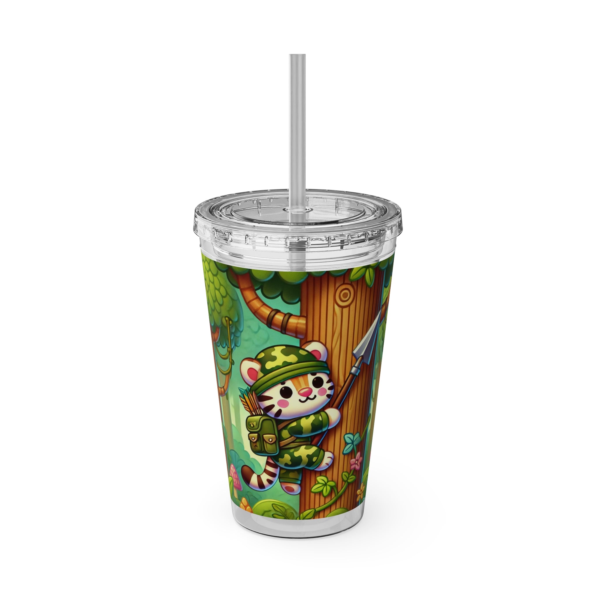 Created, designed, and digitally remastered by Sarasvati Designs, this super cute and whimsical illustration features a stealthy tiger in jungle camouflage, climbing a towering tree with a spear strapped to its back. The vibrant scene blends playful charm with an adventurous spirit, bringing the jungle to life in a fun and enchanting way.