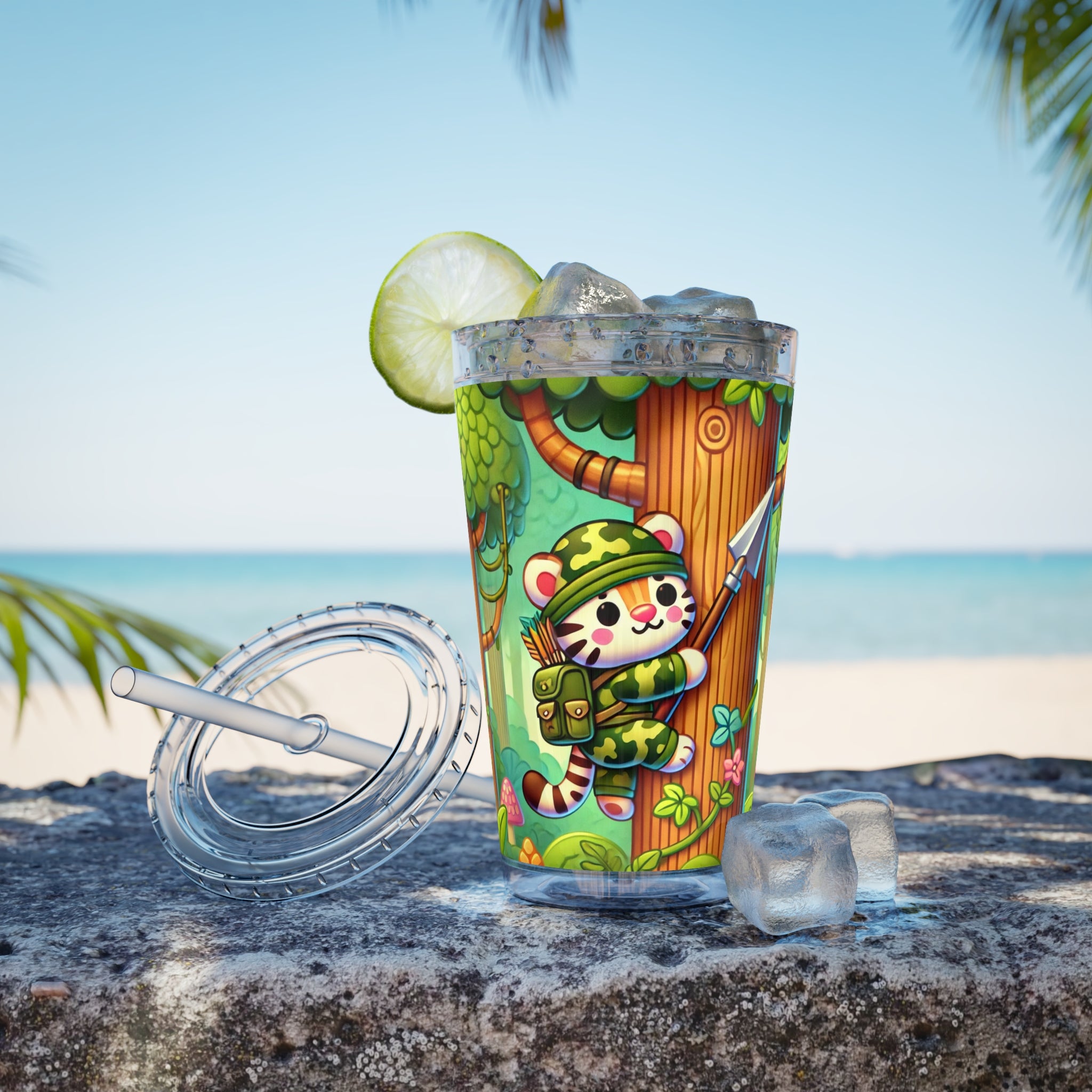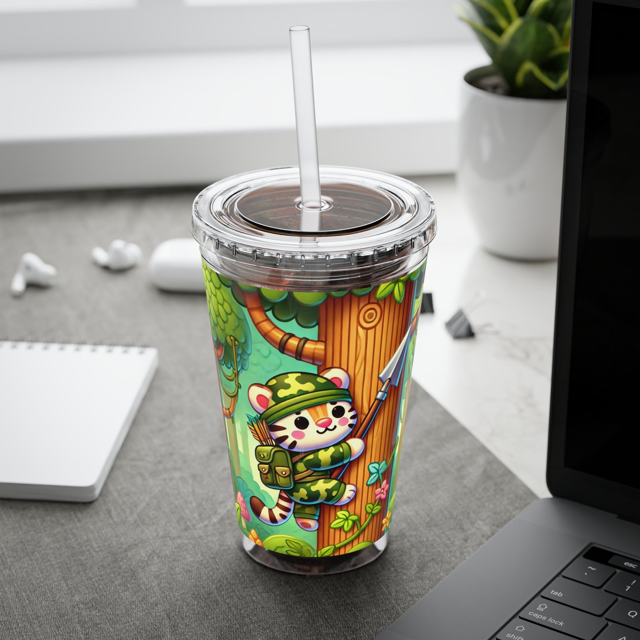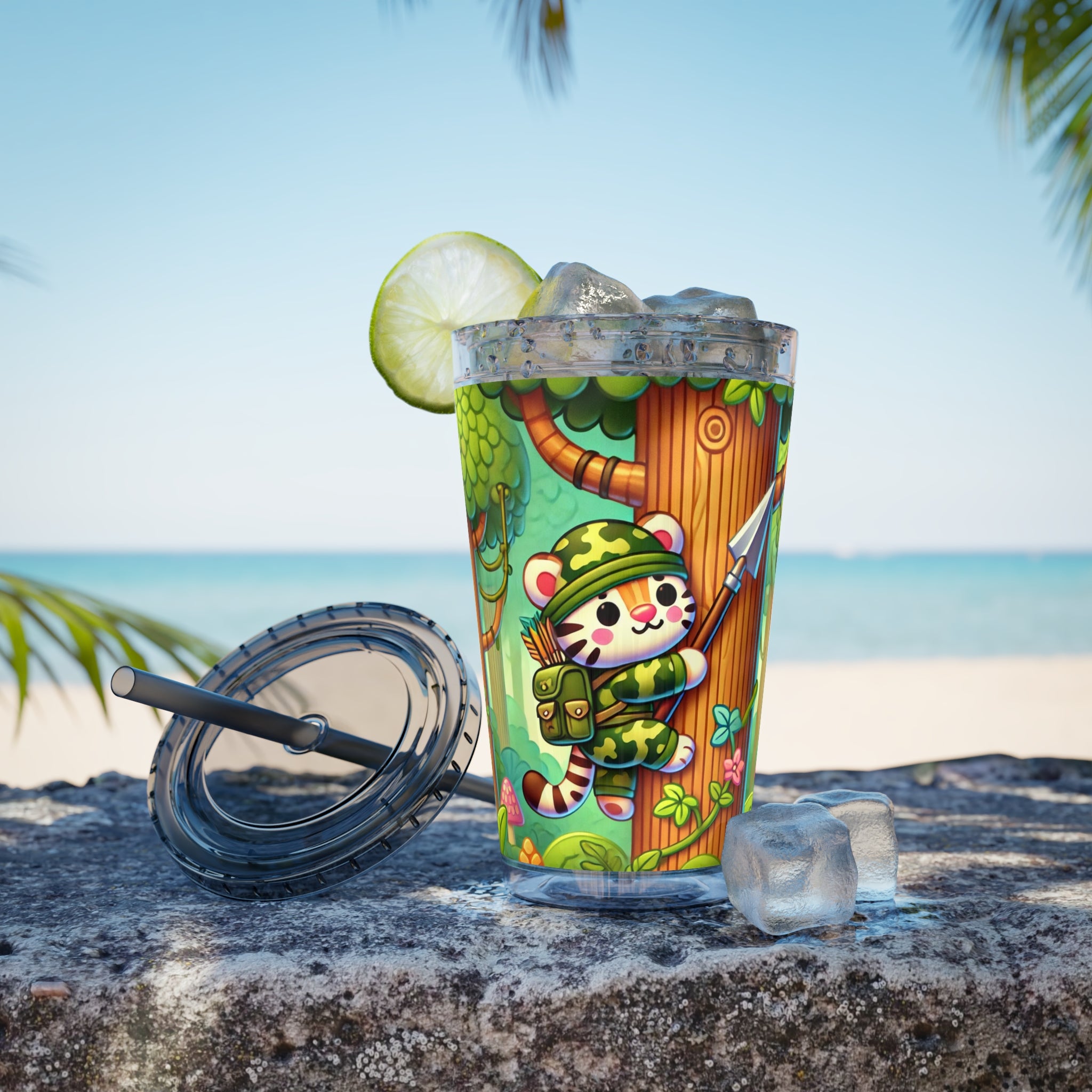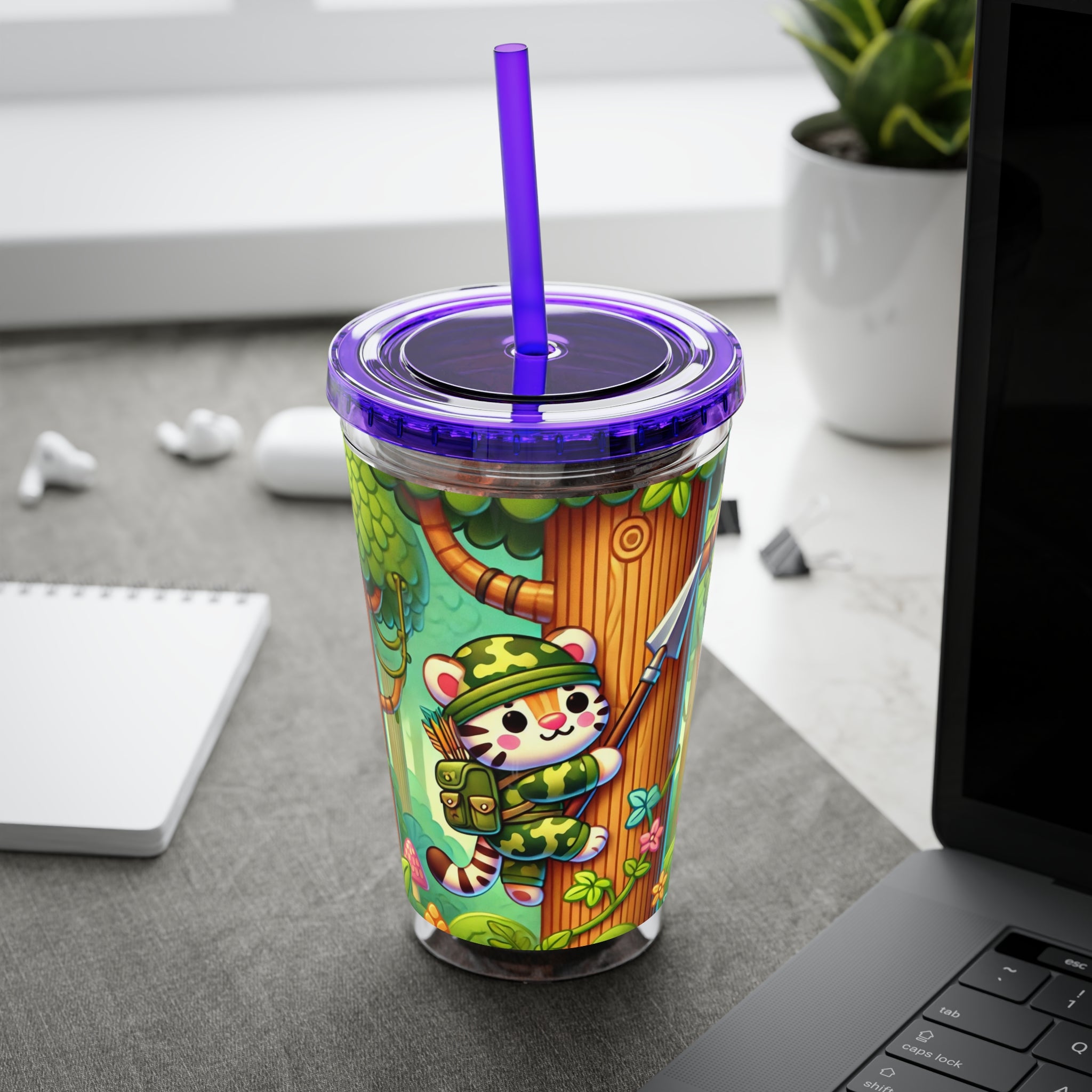 Created, designed, and digitally remastered by Sarasvati Designs, this super cute and whimsical illustration features a stealthy tiger in jungle camouflage, climbing a towering tree with a spear strapped to its back. The vibrant scene blends playful charm with an adventurous spirit, bringing the jungle to life in a fun and enchanting way.